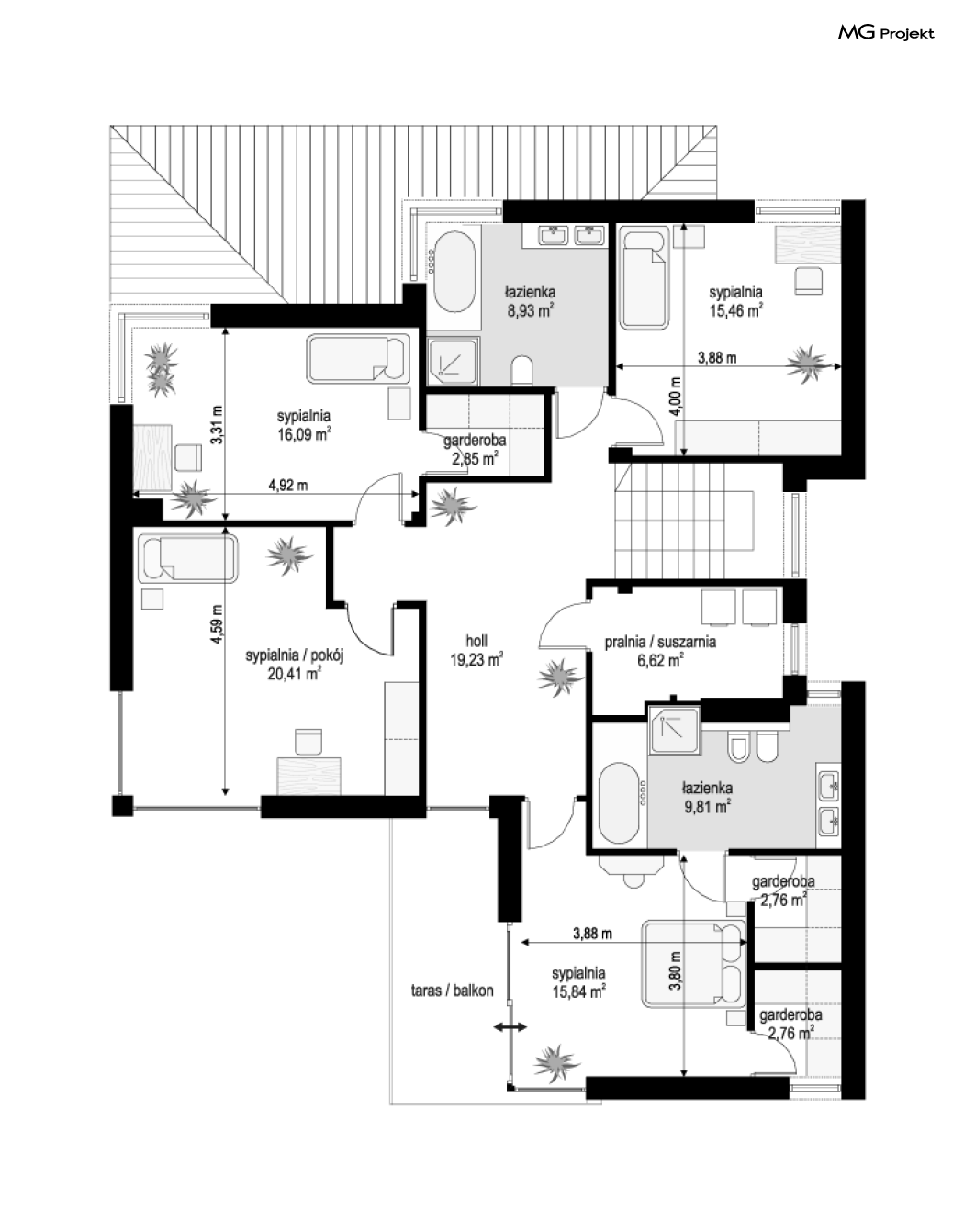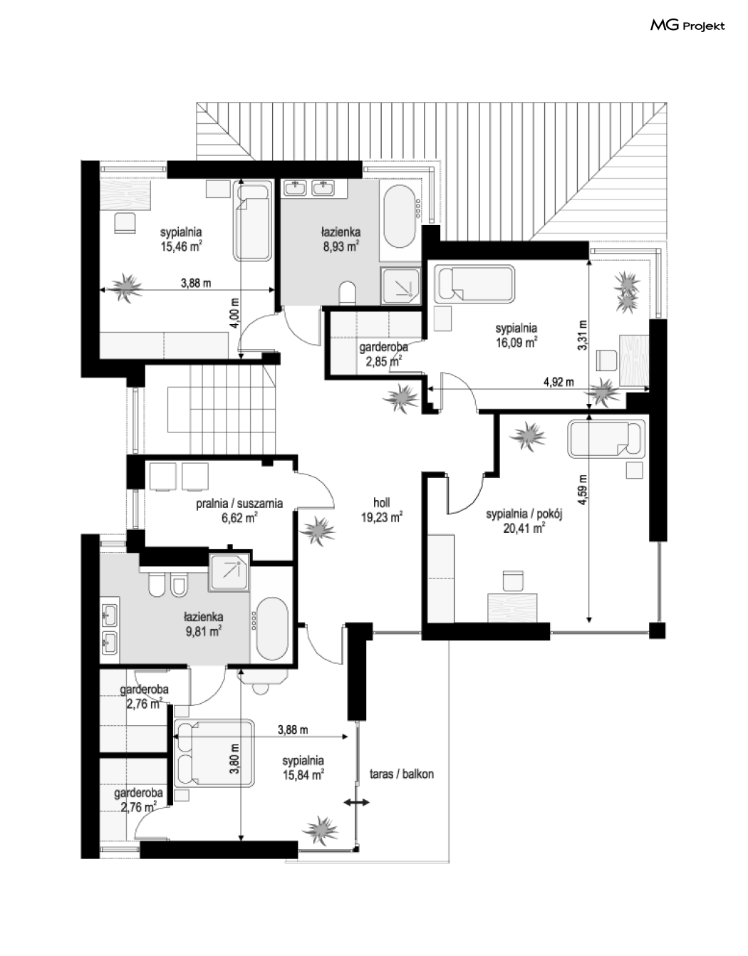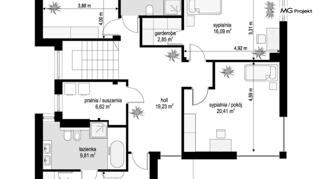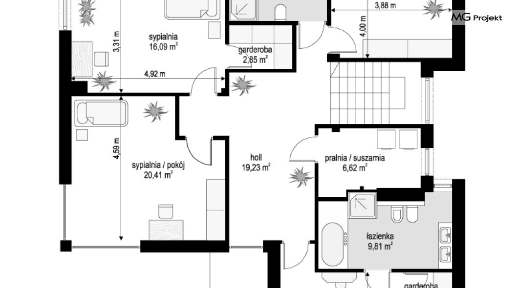Wariant projektu bez antresoli. Zmiana układu pomieszczeń na piętrze.