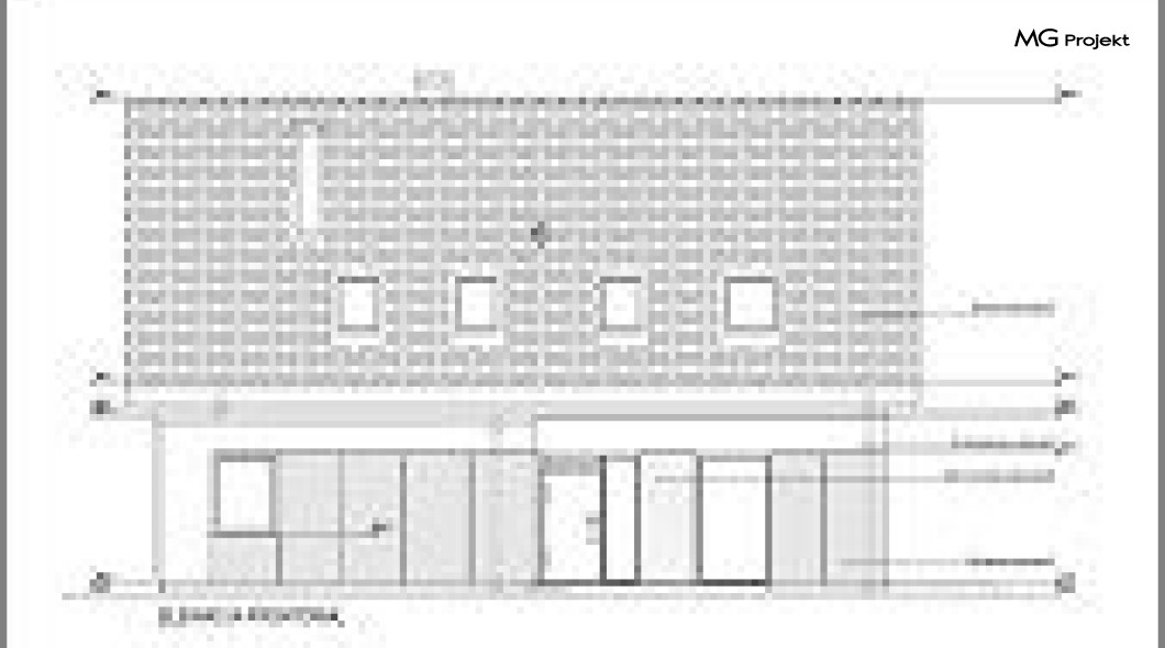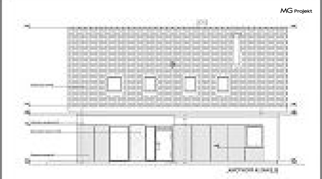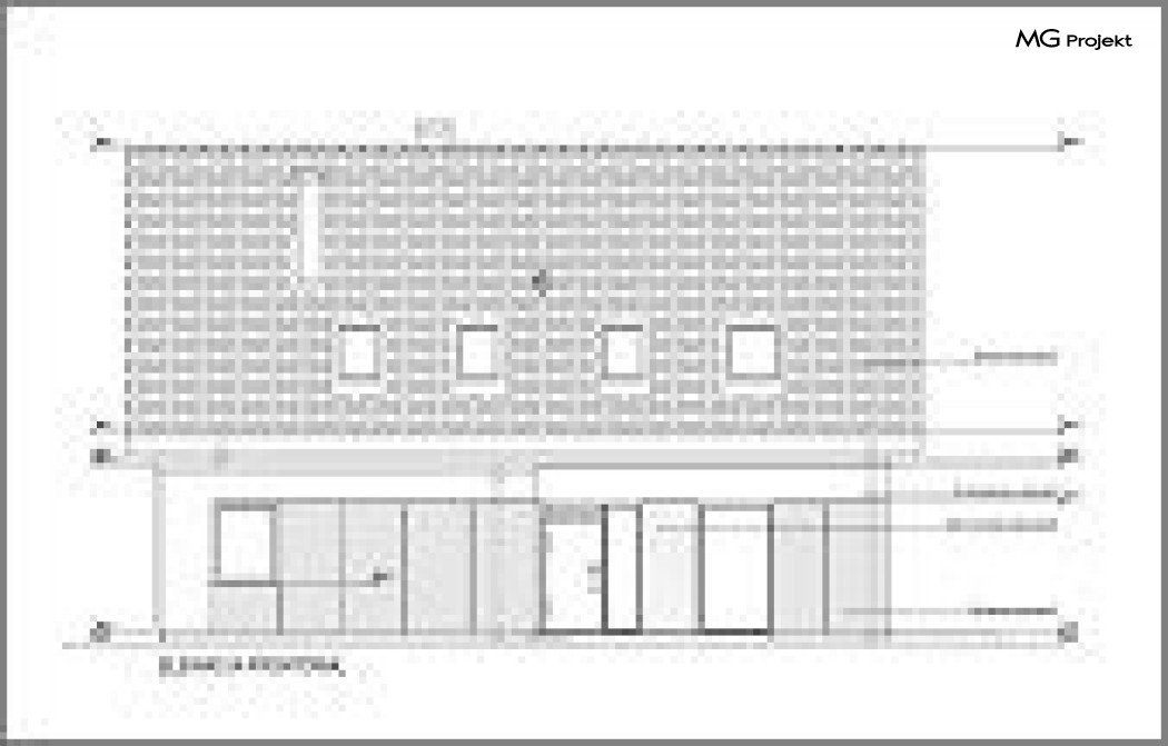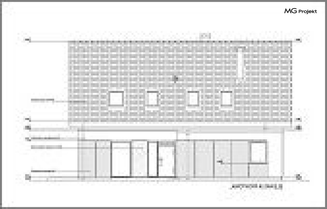 Wariant domu ze zlikwidowanym garażem, który zamieniono na pomieszczenie gospodarcze, rolety w oknach, dostosowany do NF40.