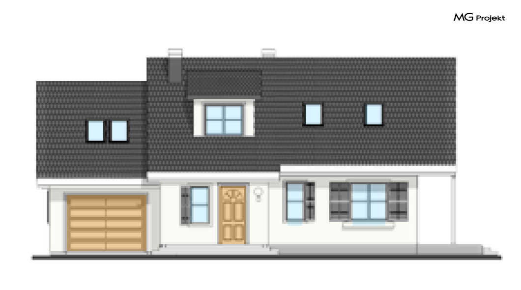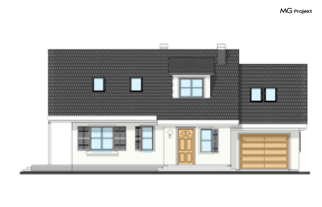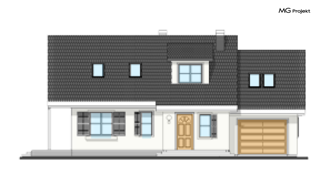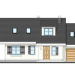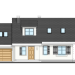 Wariant projektu ze zwężonym garażem. Taras drewniany. Zmiana układu okien oraz wyglądu elewacji.