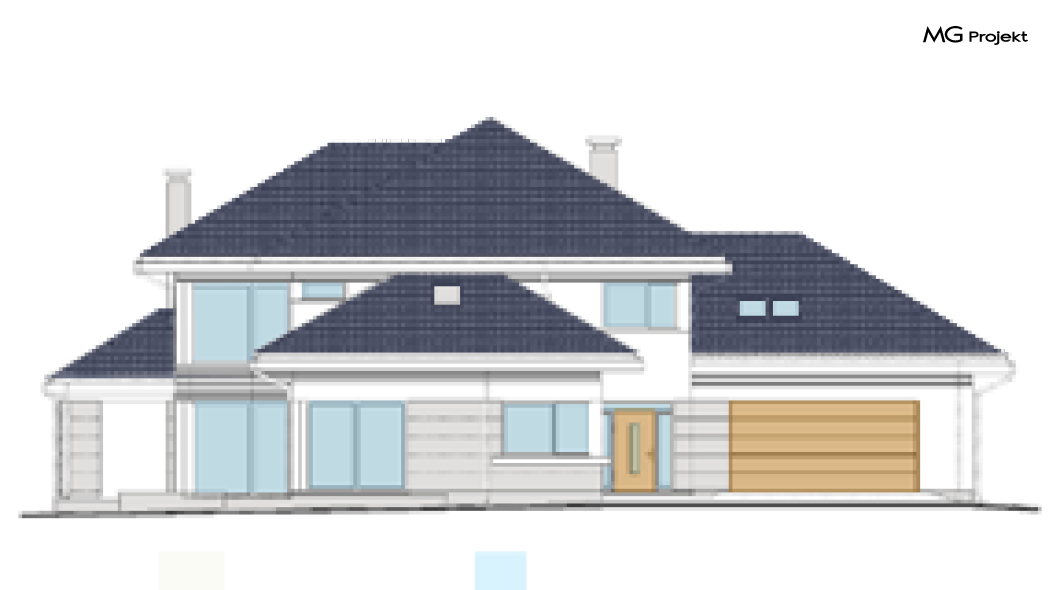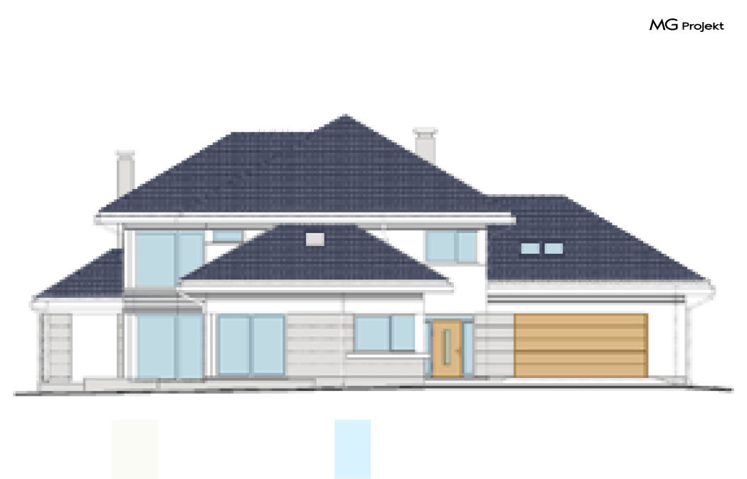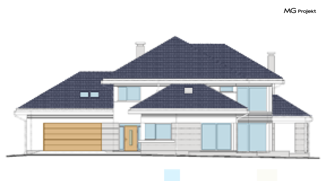 Wariant projektu z podniesionym dachem nad garażem ze zmienionym kątem nachylenia dachu, z sauną za garażem, pralnią nad garażem, zlikwidowaną antresolą .