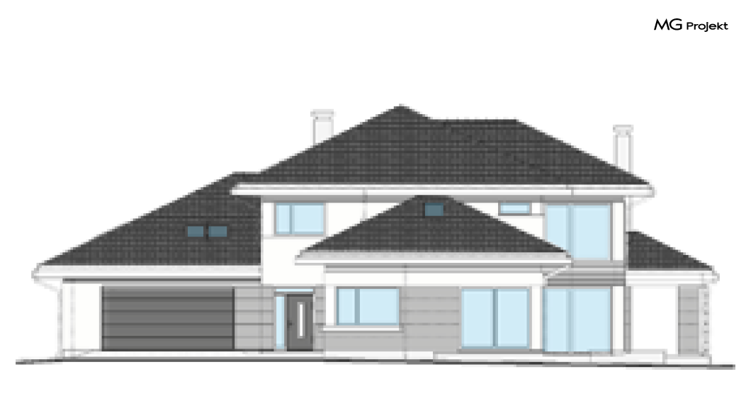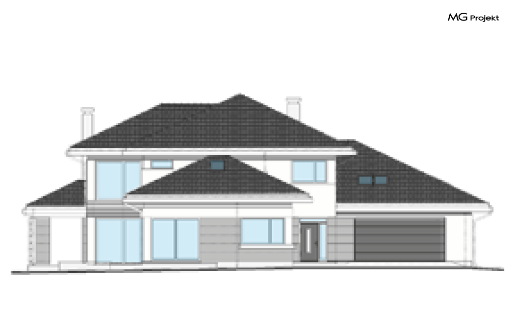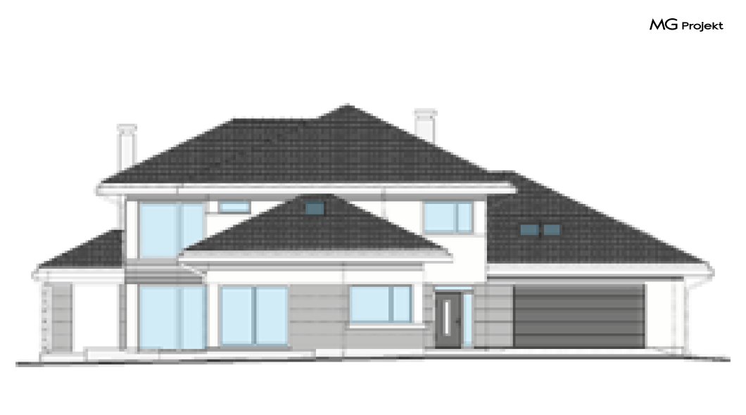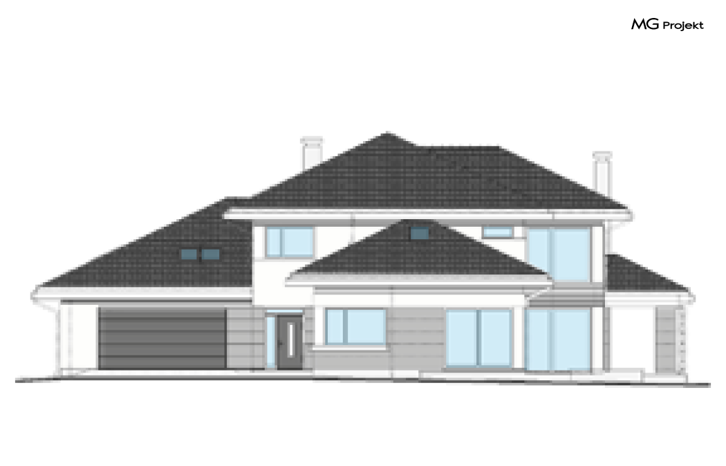 Wariant projektu z większym garażem, doprojektowaną piwnicą pod garażem, zmieniony układ pomieszczeń oraz słupki w oknach.