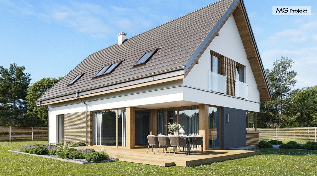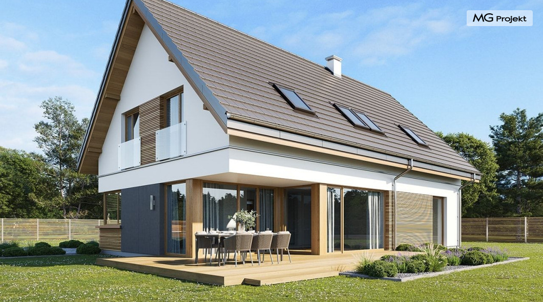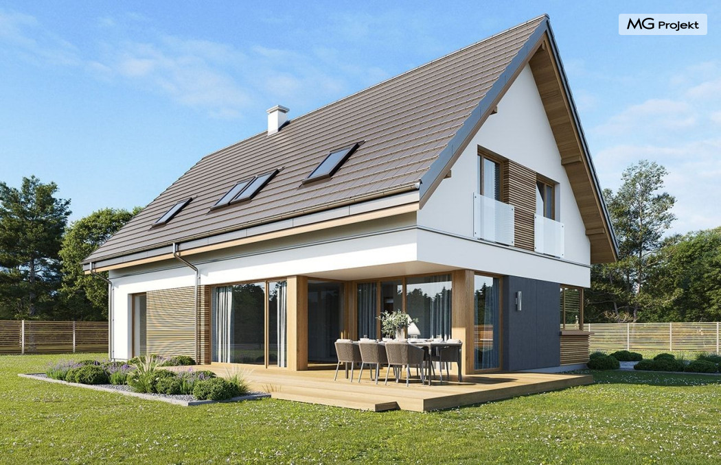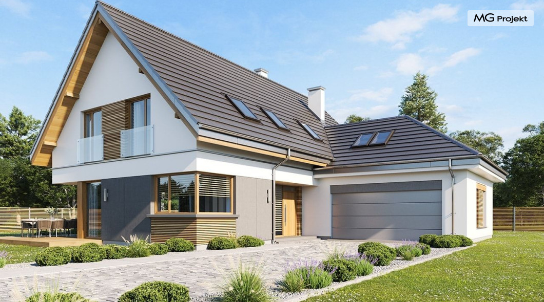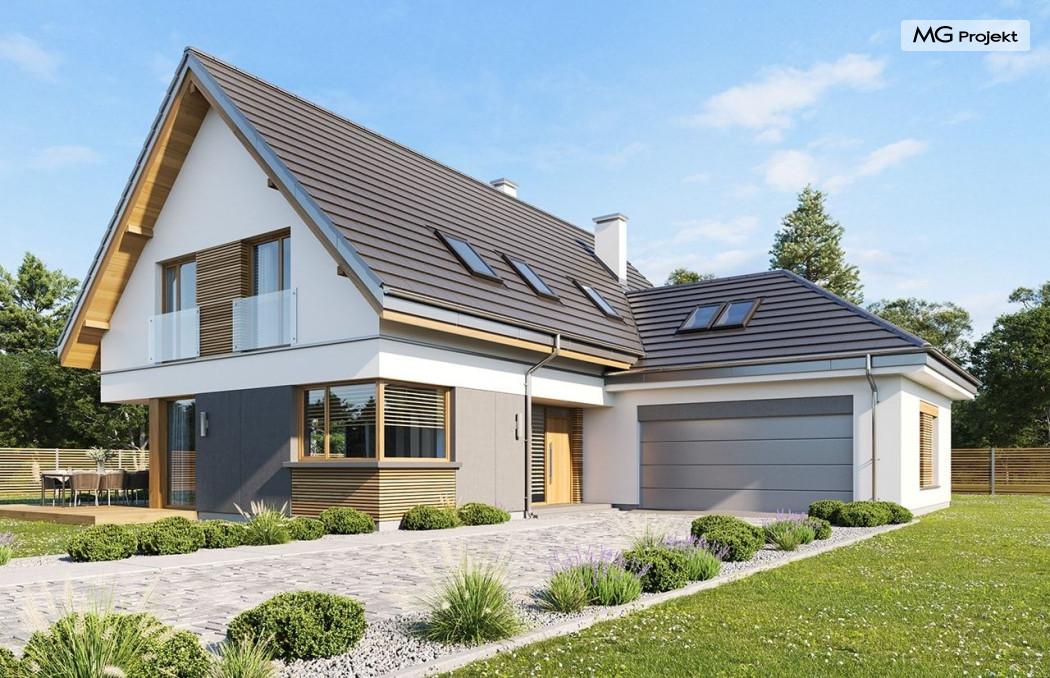 Wariant domu z doprojektowanym dachem nad garażem, zmiana lokalizacji stolarki okiennej.
