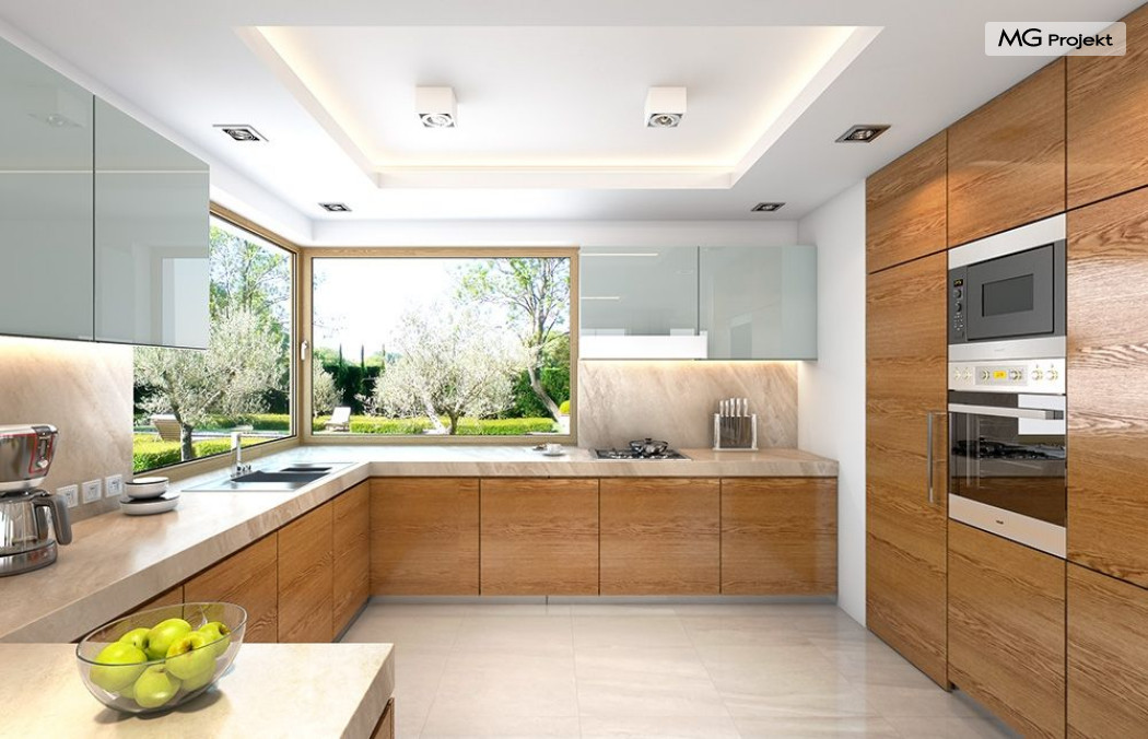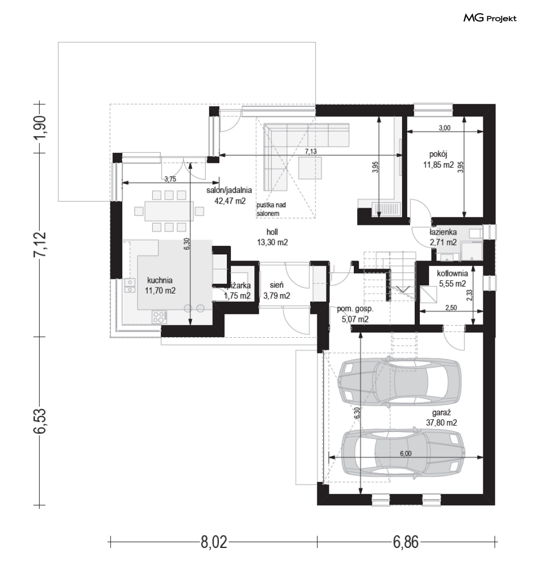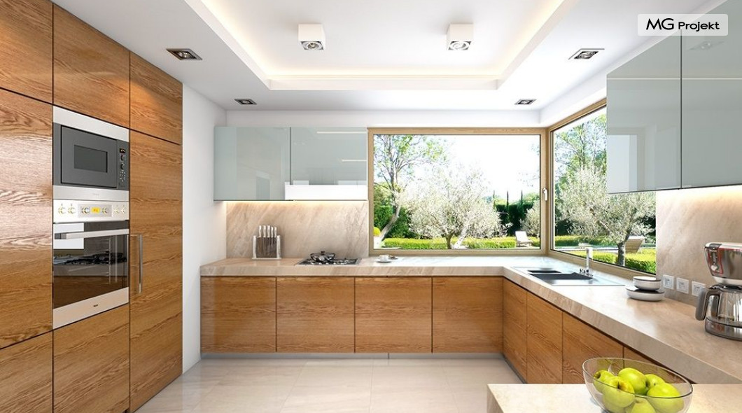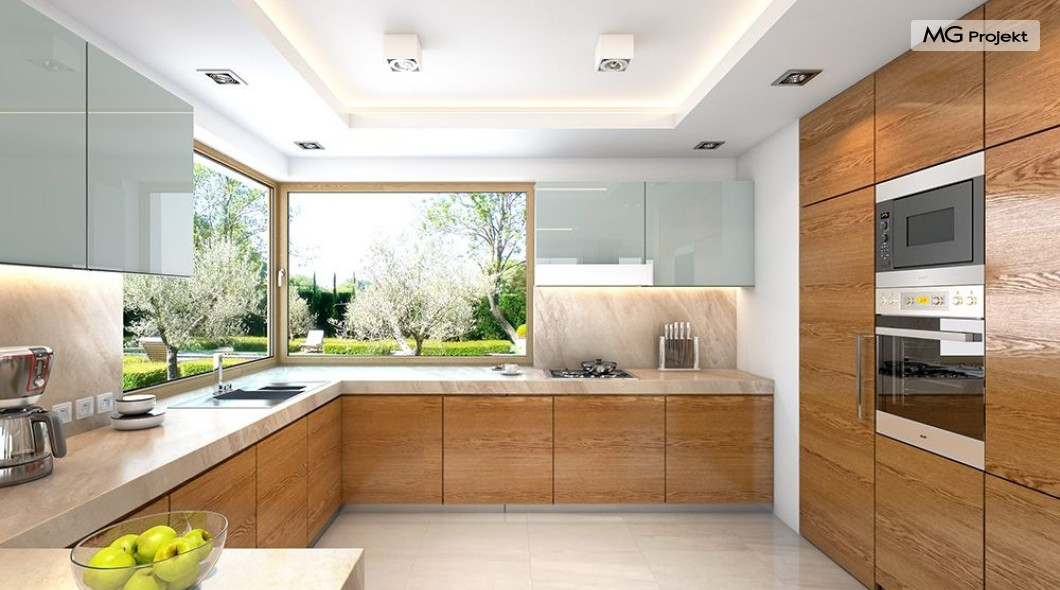 Wariant domu z doprojektowanym dachem nad garażem, zmiana lokalizacji stolarki okiennej.