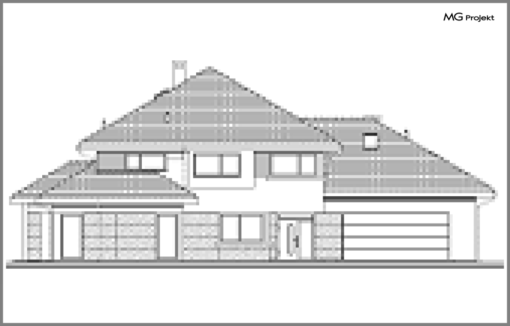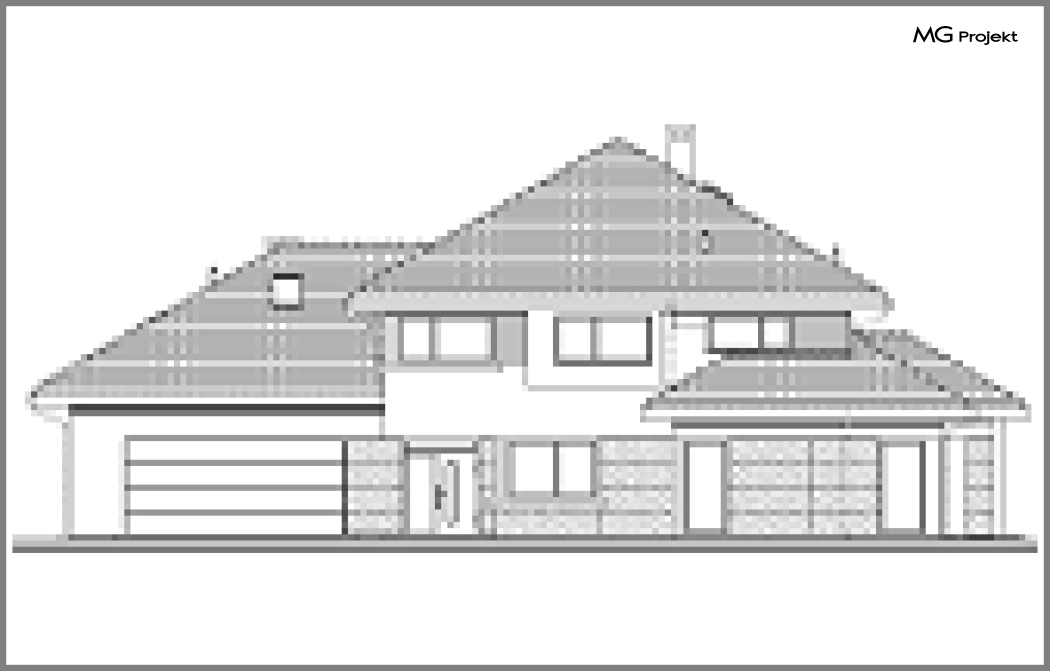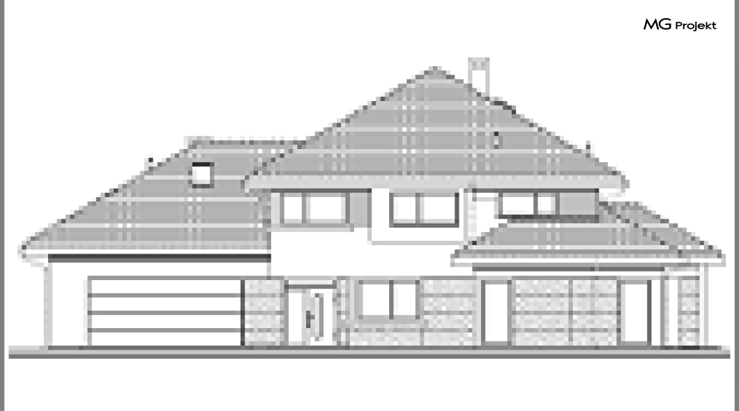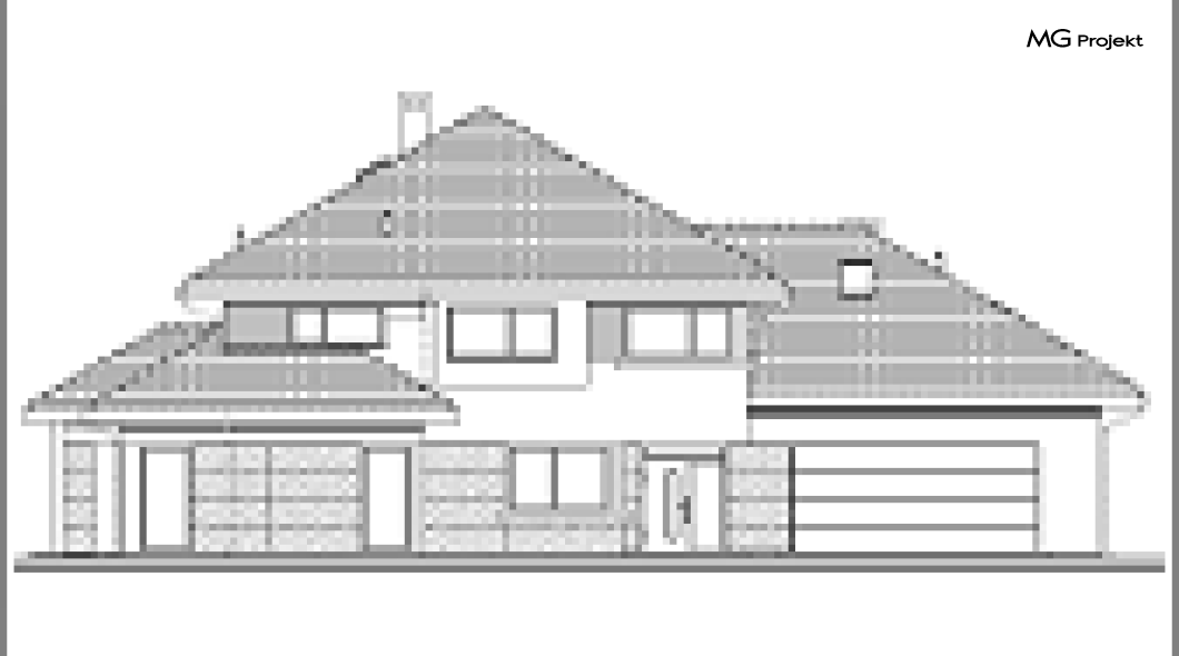 Wariant z podniesionym kątem nachylenia dachu do 30 stopni, obniżonym głównym dachem o 24 cm, pomniejszonym pokojem rekreacyjnym na parterze o 91 cm, zwiększonym zadaszeniem nad tarasem.
