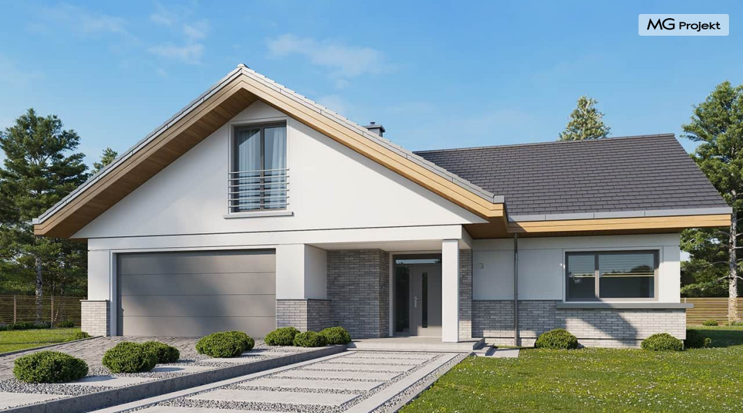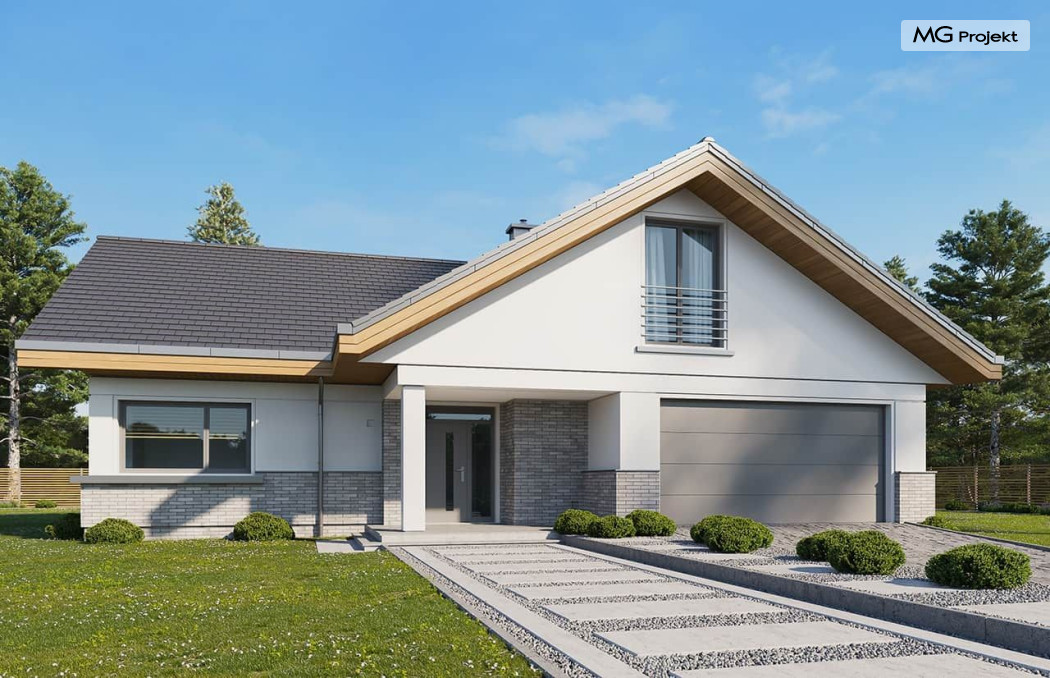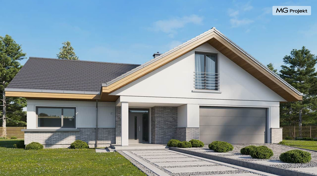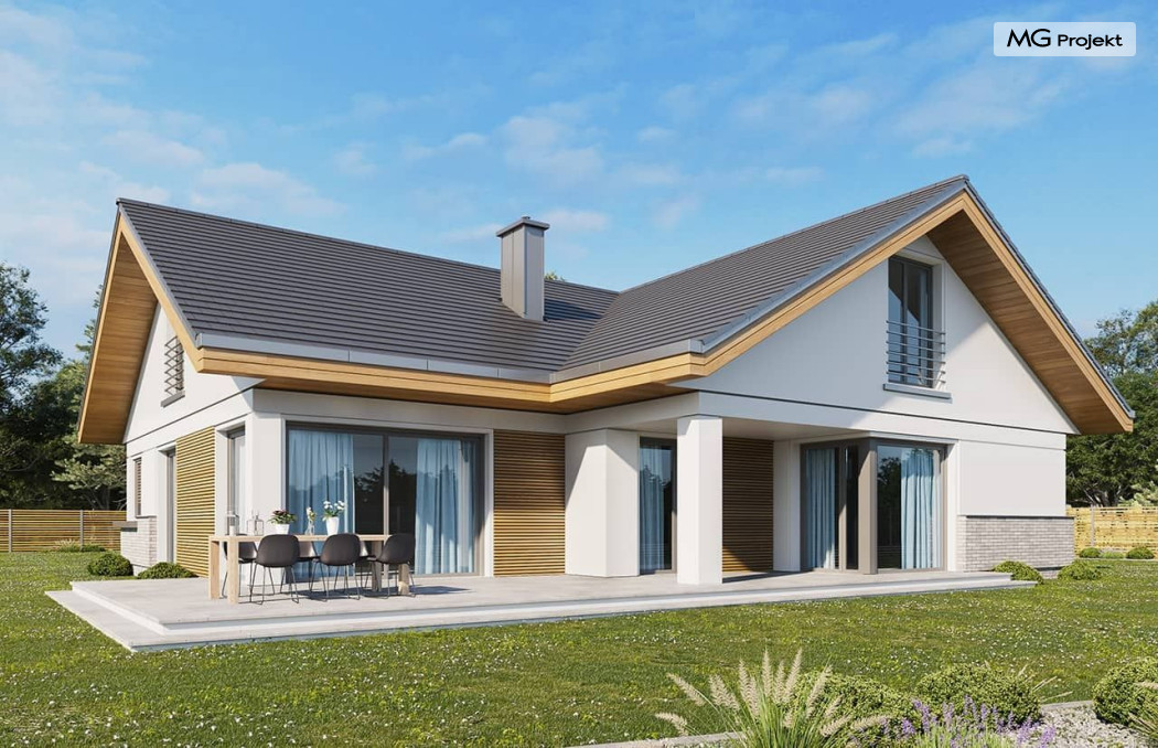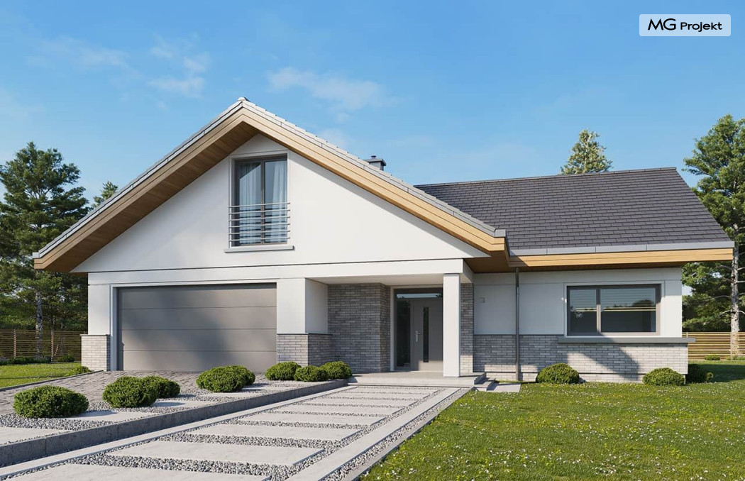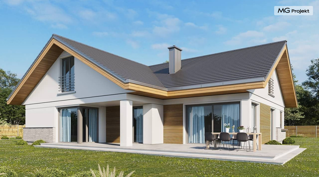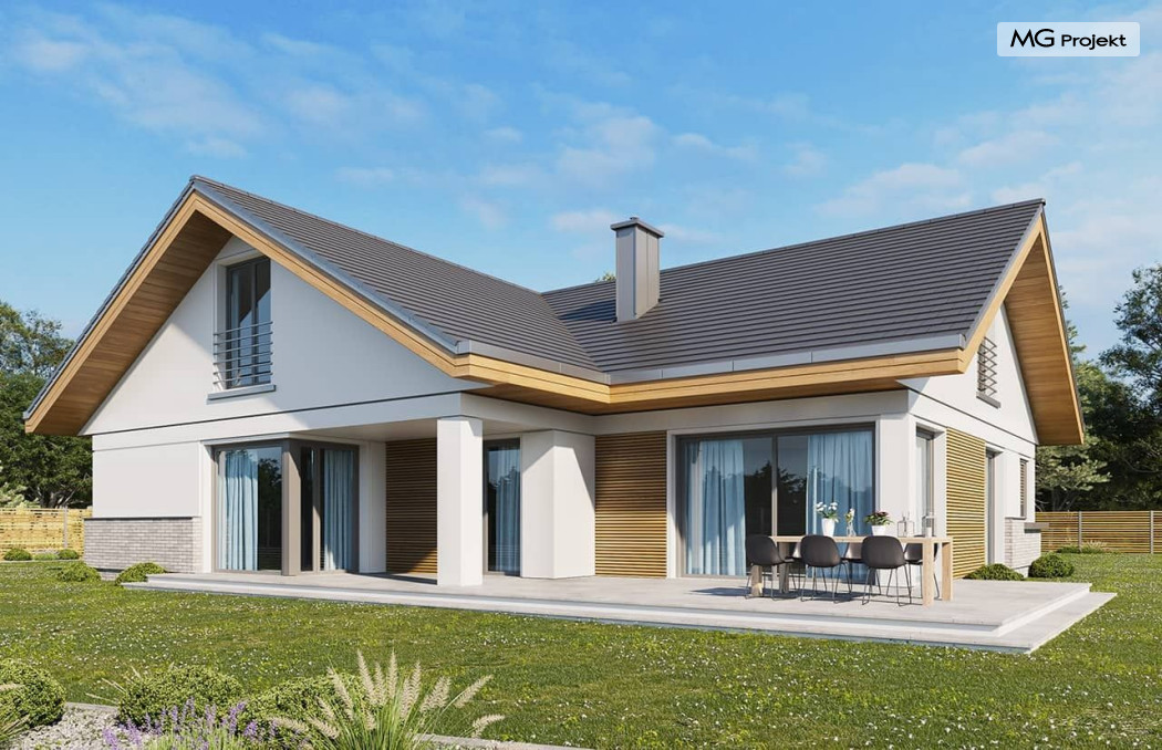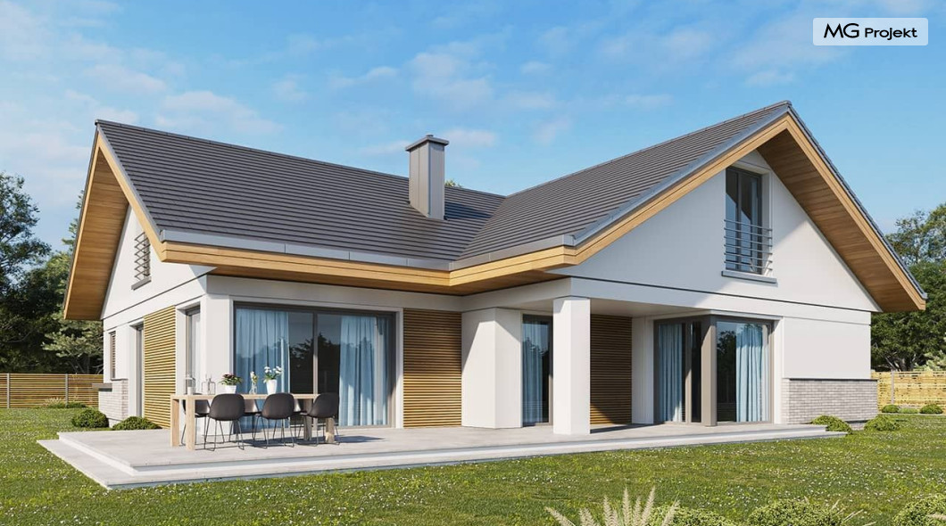 Wariant projektu ze zmienionym dachem na dwuspadowy i dodanymi oknami w ścianach szczytowych.