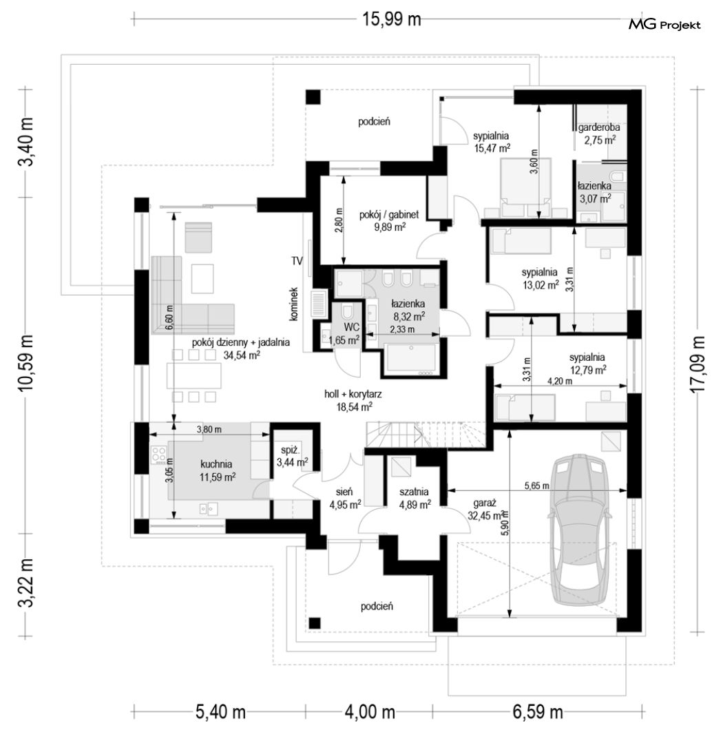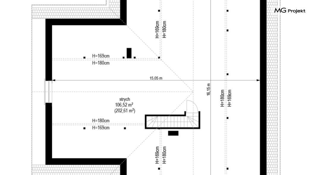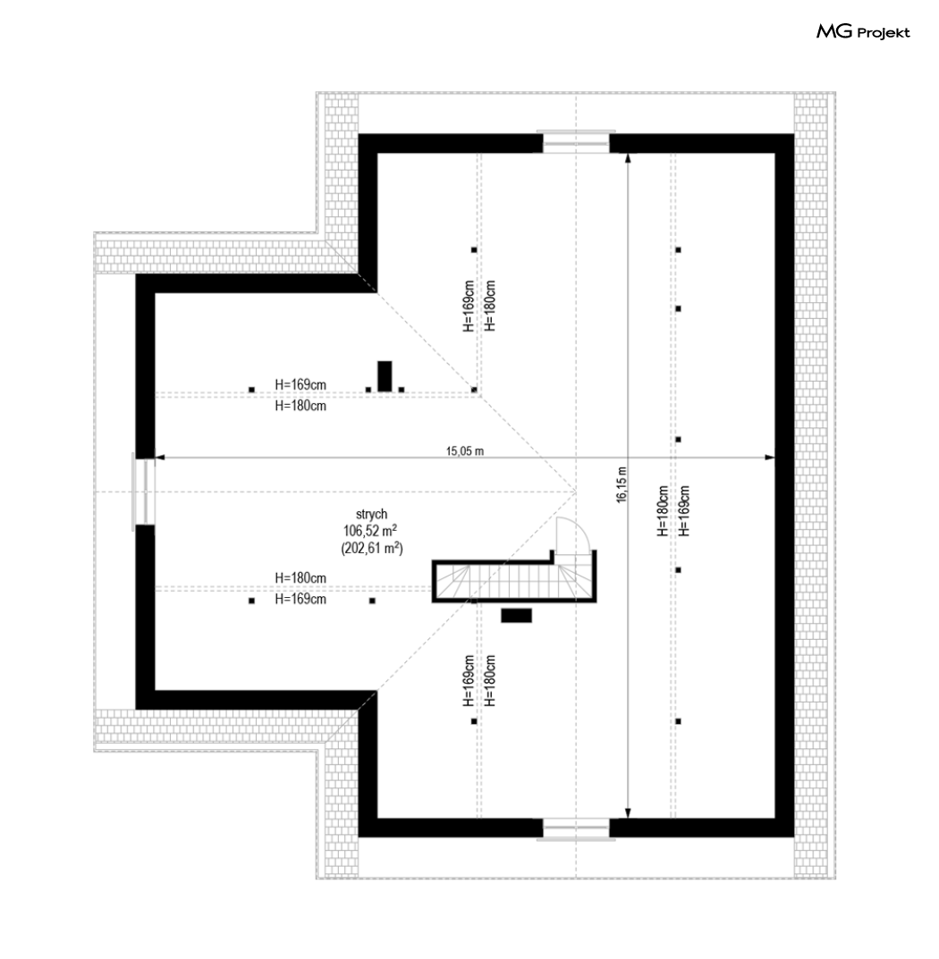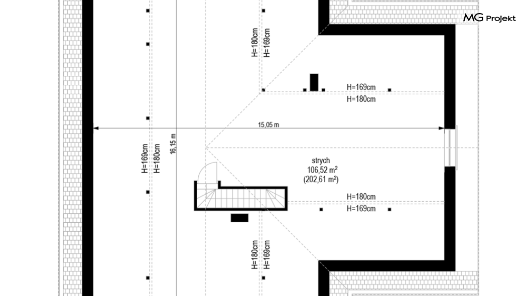 Wysokość wyznaczona od poziomu terenu do najwyżej położonej części dachu (np. kalenicy), zwykle bez uwzględnienia kominów.