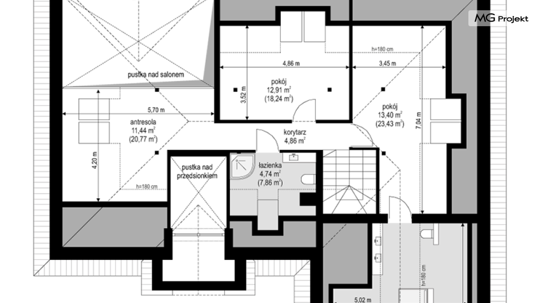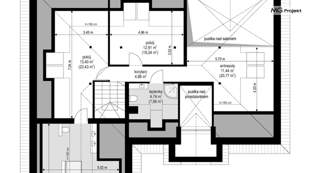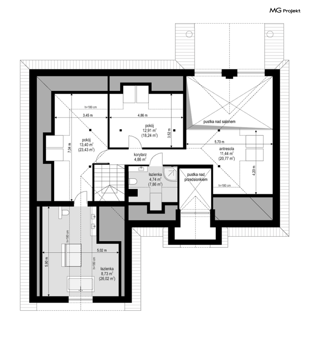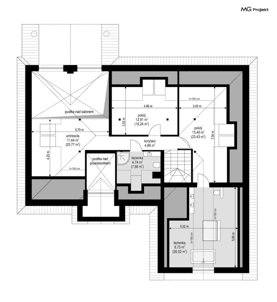 Wariant projektu z dodatkową łazienką na poddaszu. Zmienione powierzchnie.