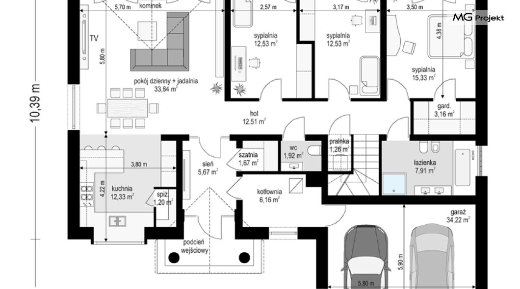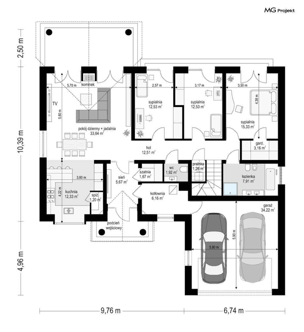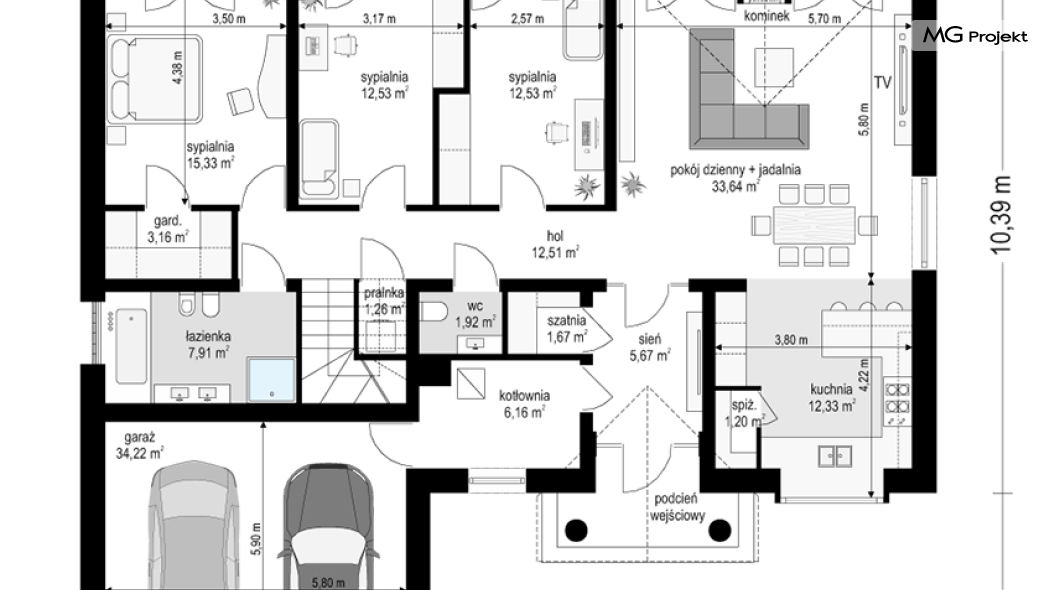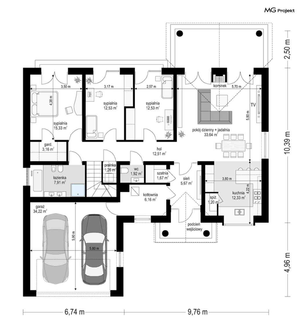 Wariant projektu z dodatkową łazienką na poddaszu. Zmienione powierzchnie.
