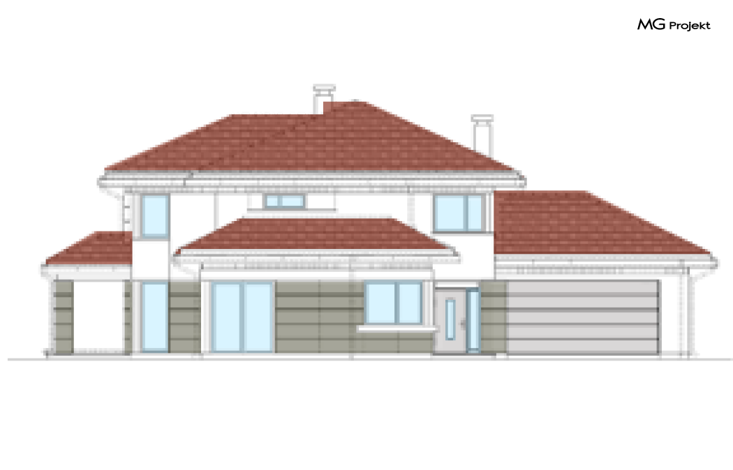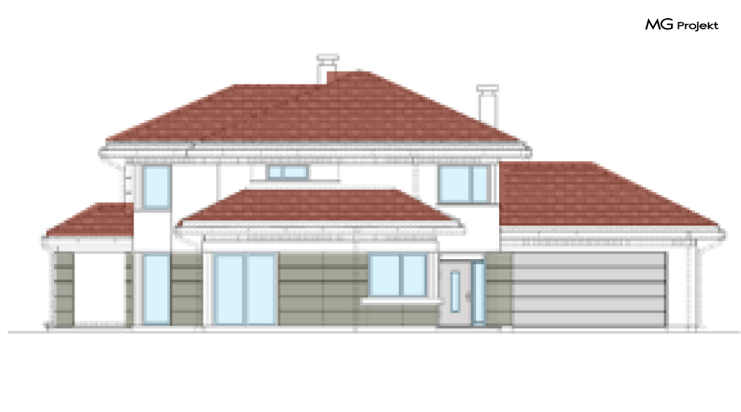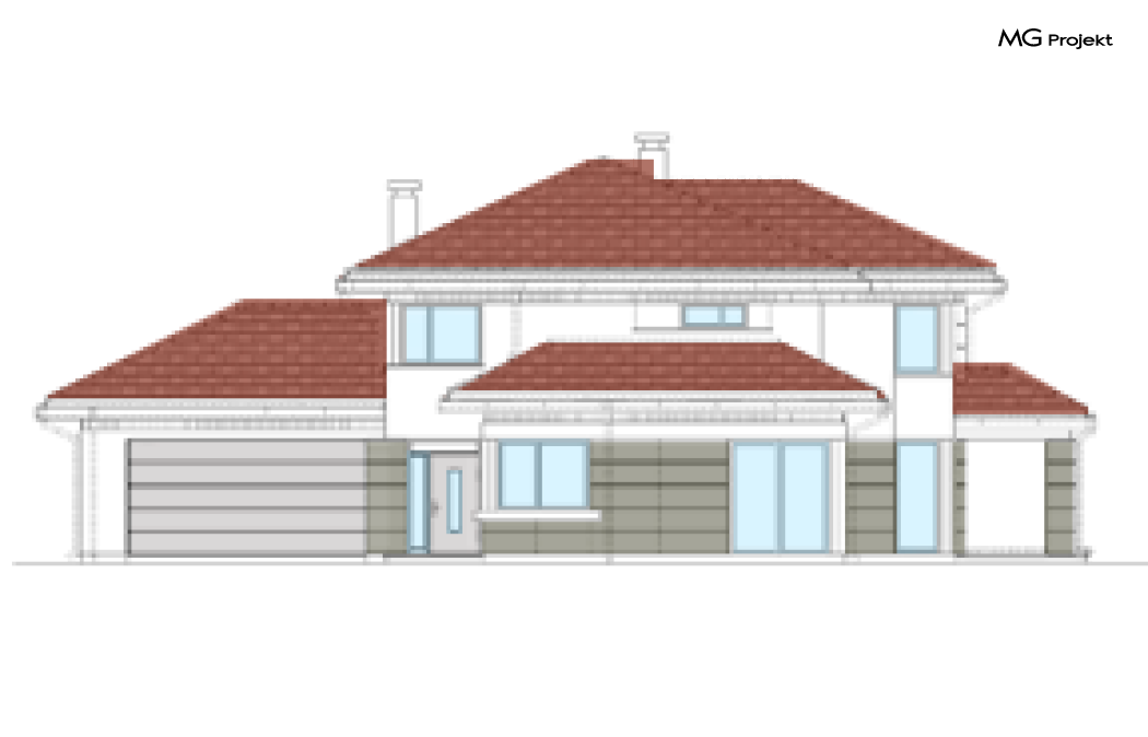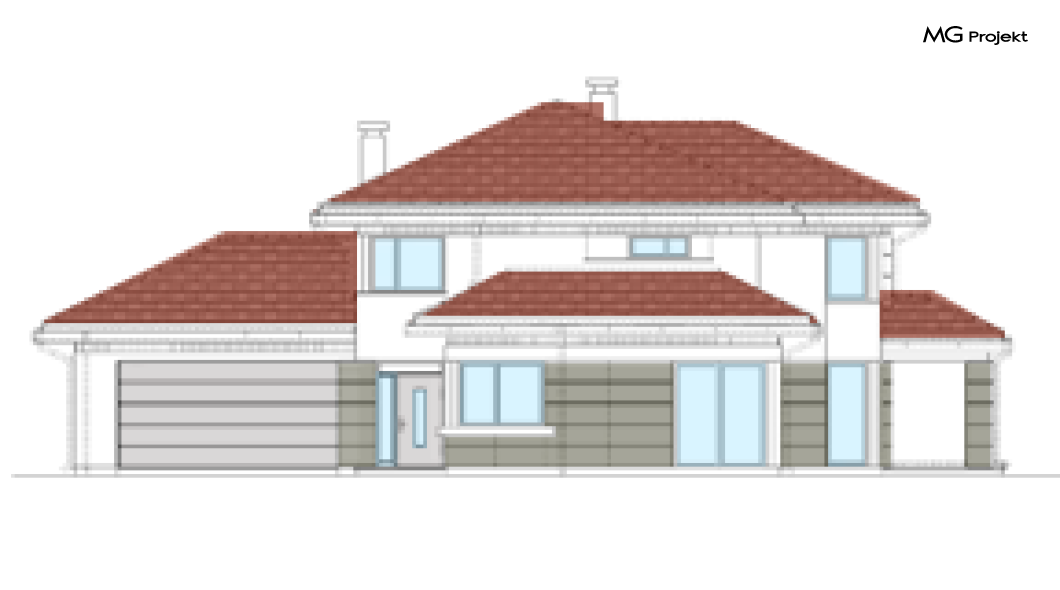Wariant projektu z powiększony garażem i częściowym podpiwniczeniem.