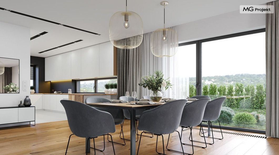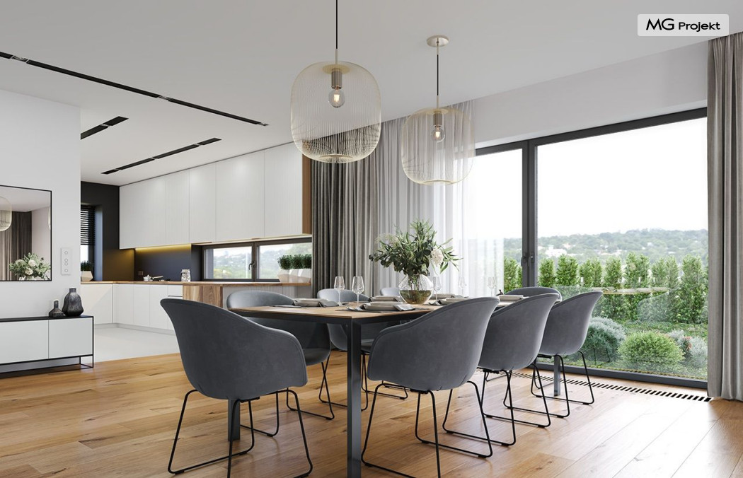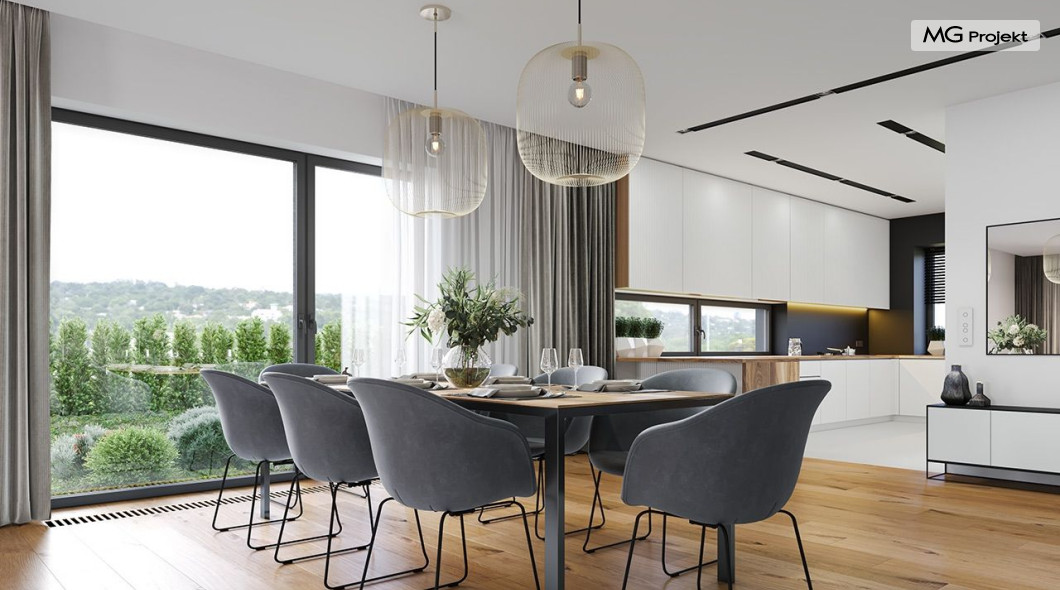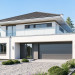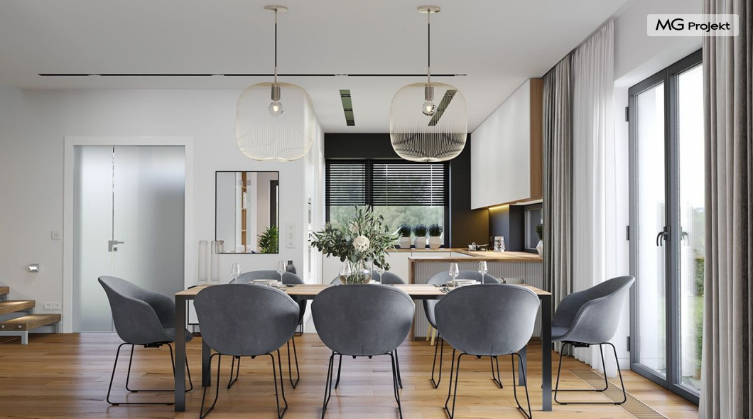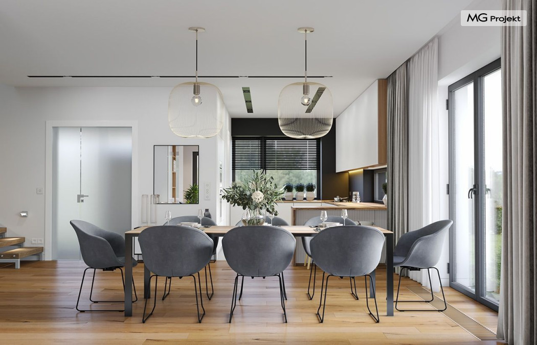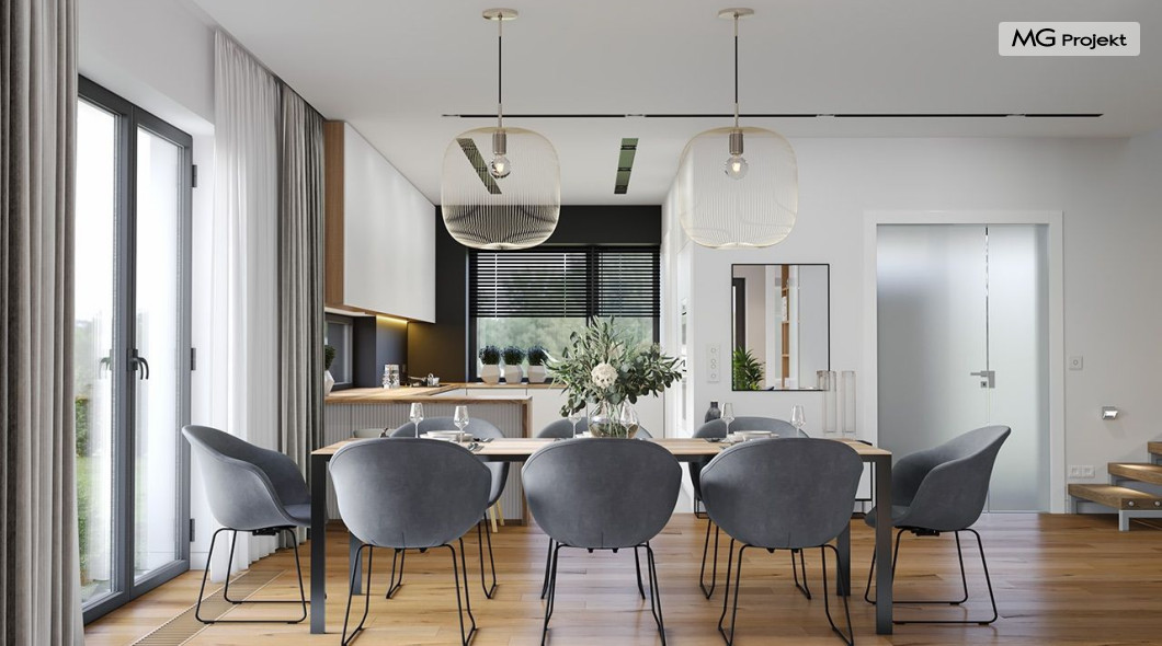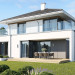 Wariant projektu ze zlikwidowaną pustką nad jadalnią i stworzonym nowym pomieszczeniem w tym miejscu. Dodane nowe okna. Zmieniony dach płaski na taras.