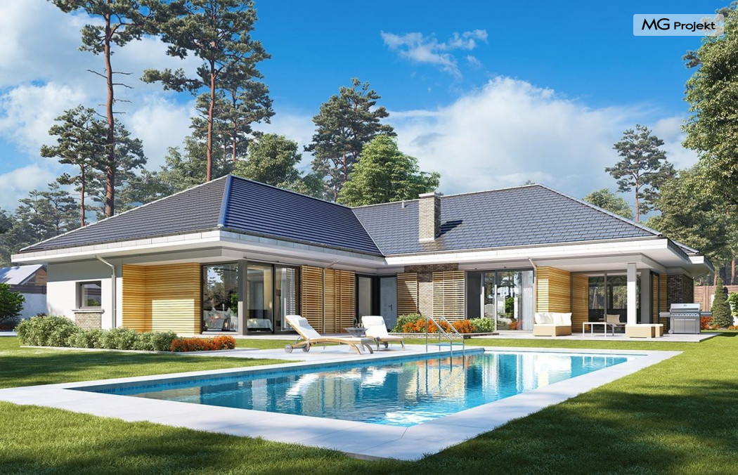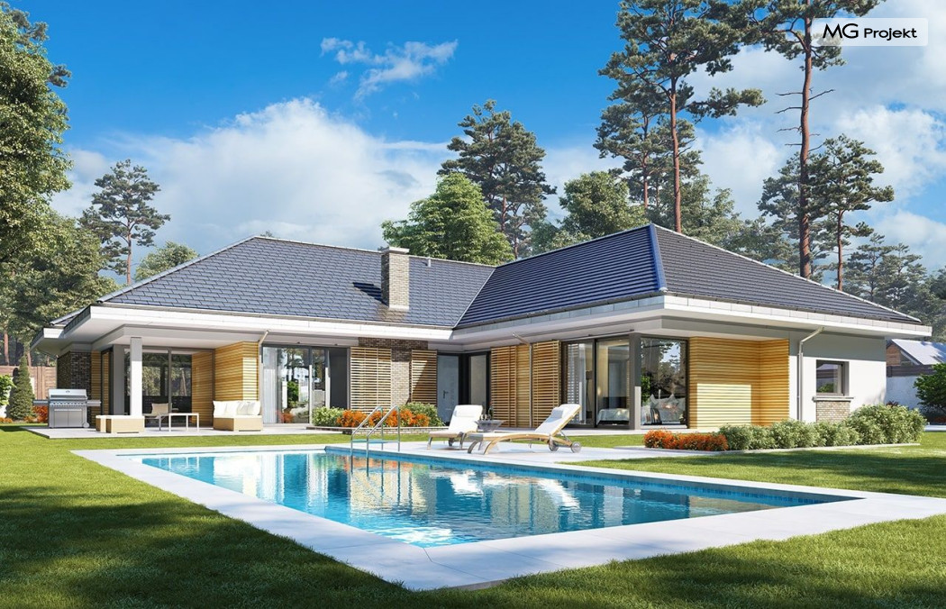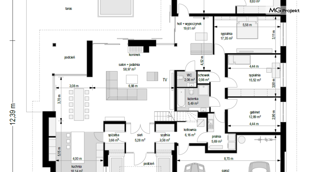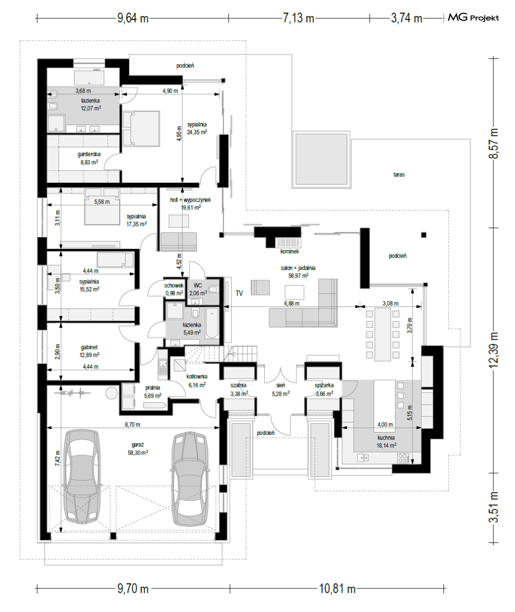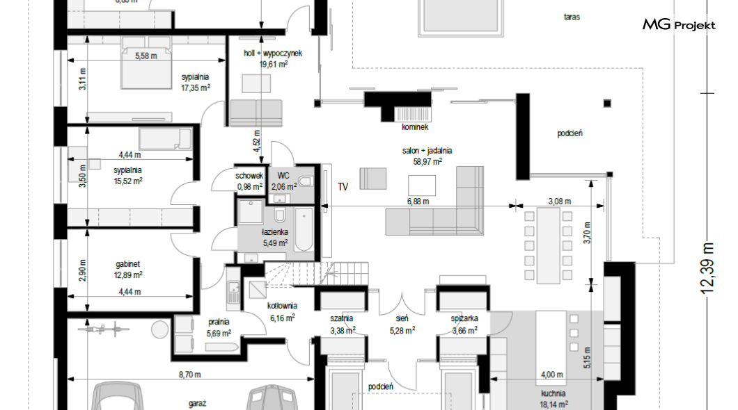 Wariant projektu z poszerzonym garażem i sypialnią rodziców.