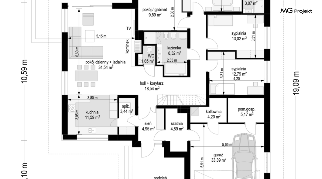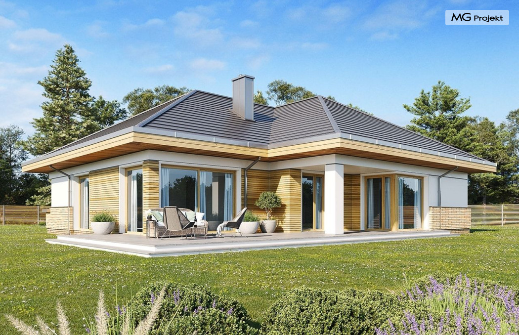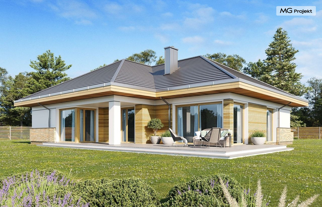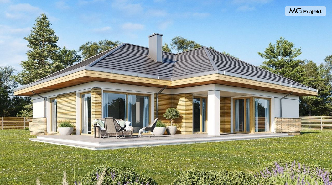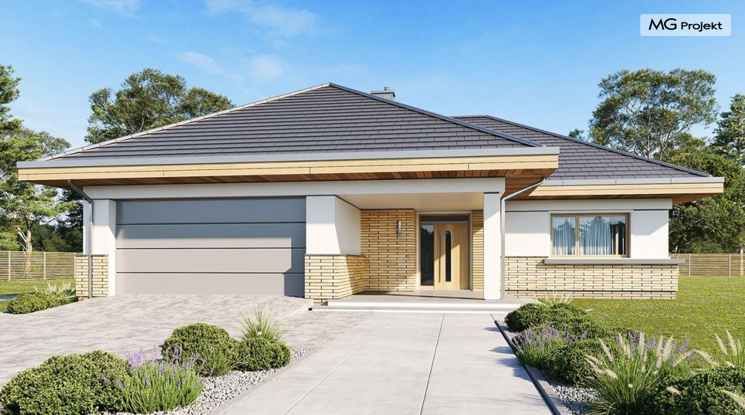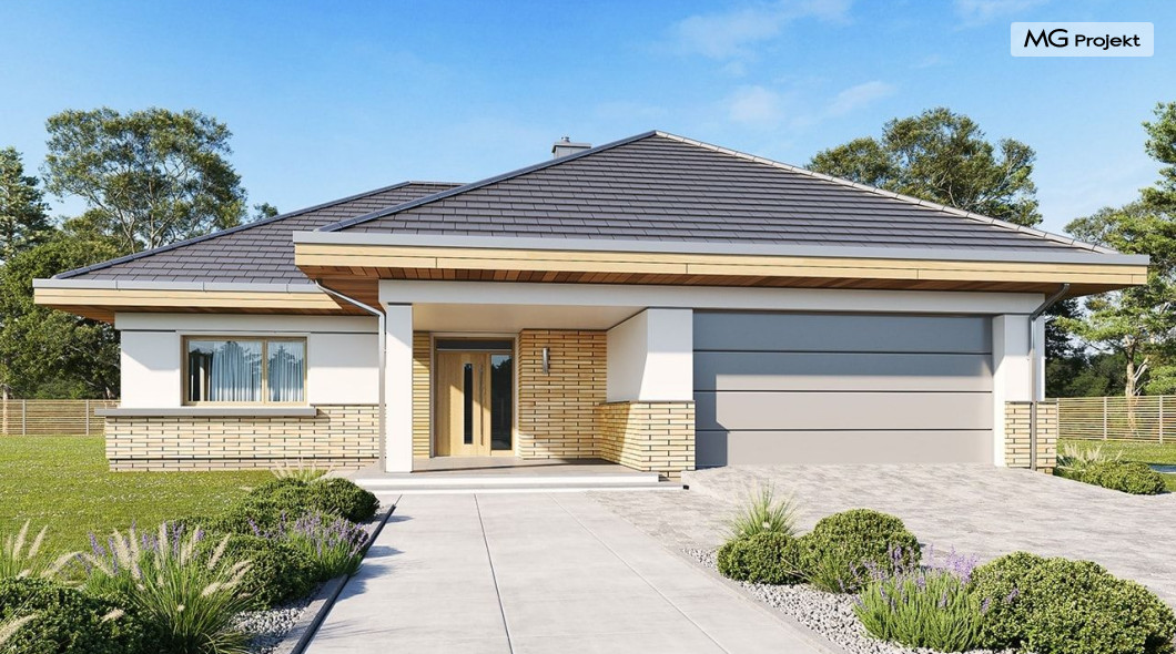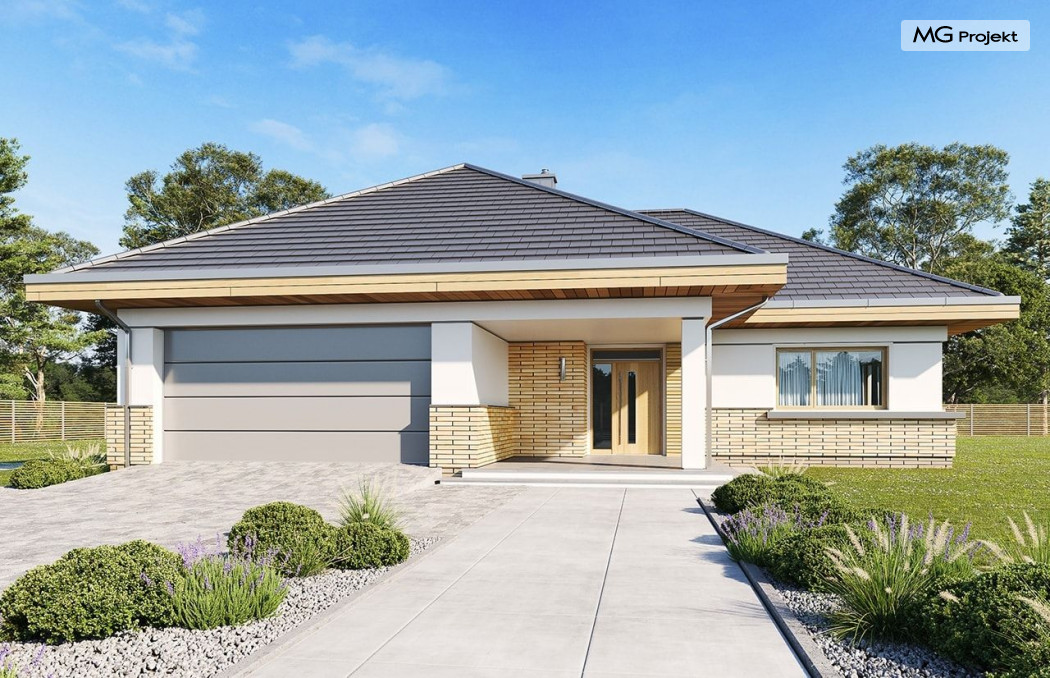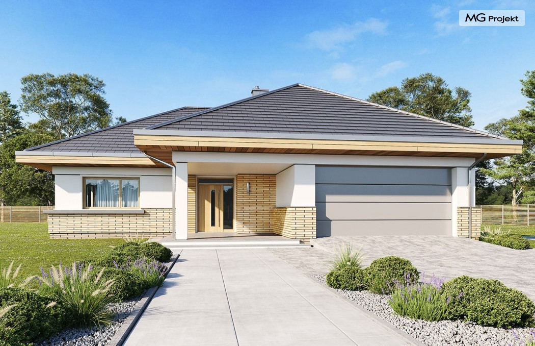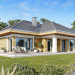 Wariant projektu z wysuniętym garażem o 2 m, z pomieszczeniem gospodarczym i kotłownią w garażu, ze zmienionym układem okien w kuchni, z szatnią w lokalizacji dawnej kotłowni.
