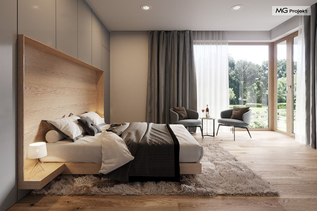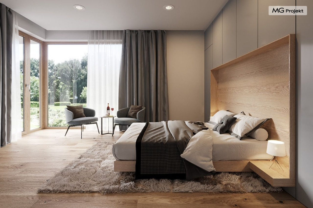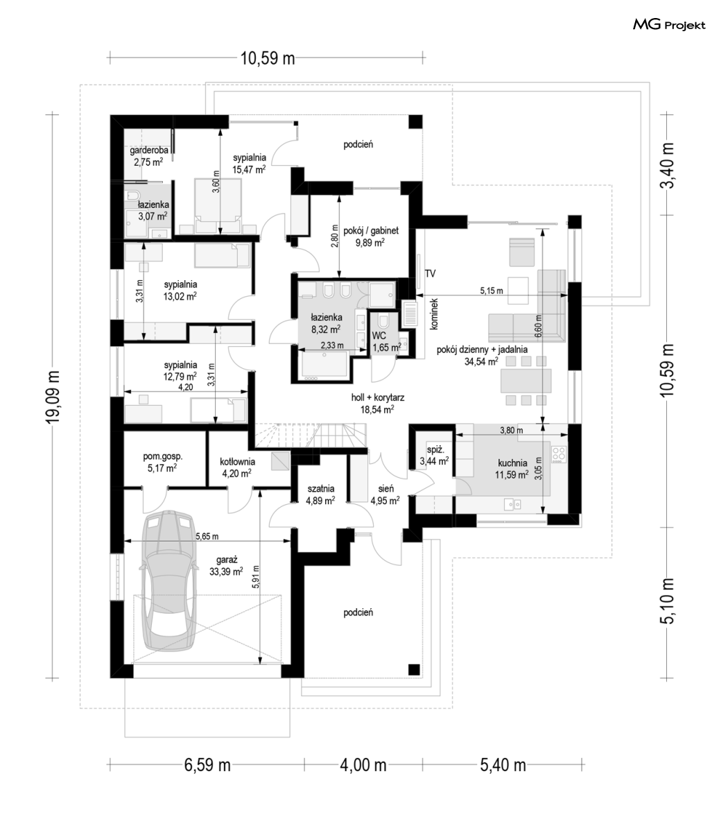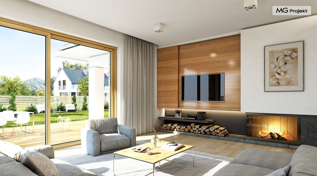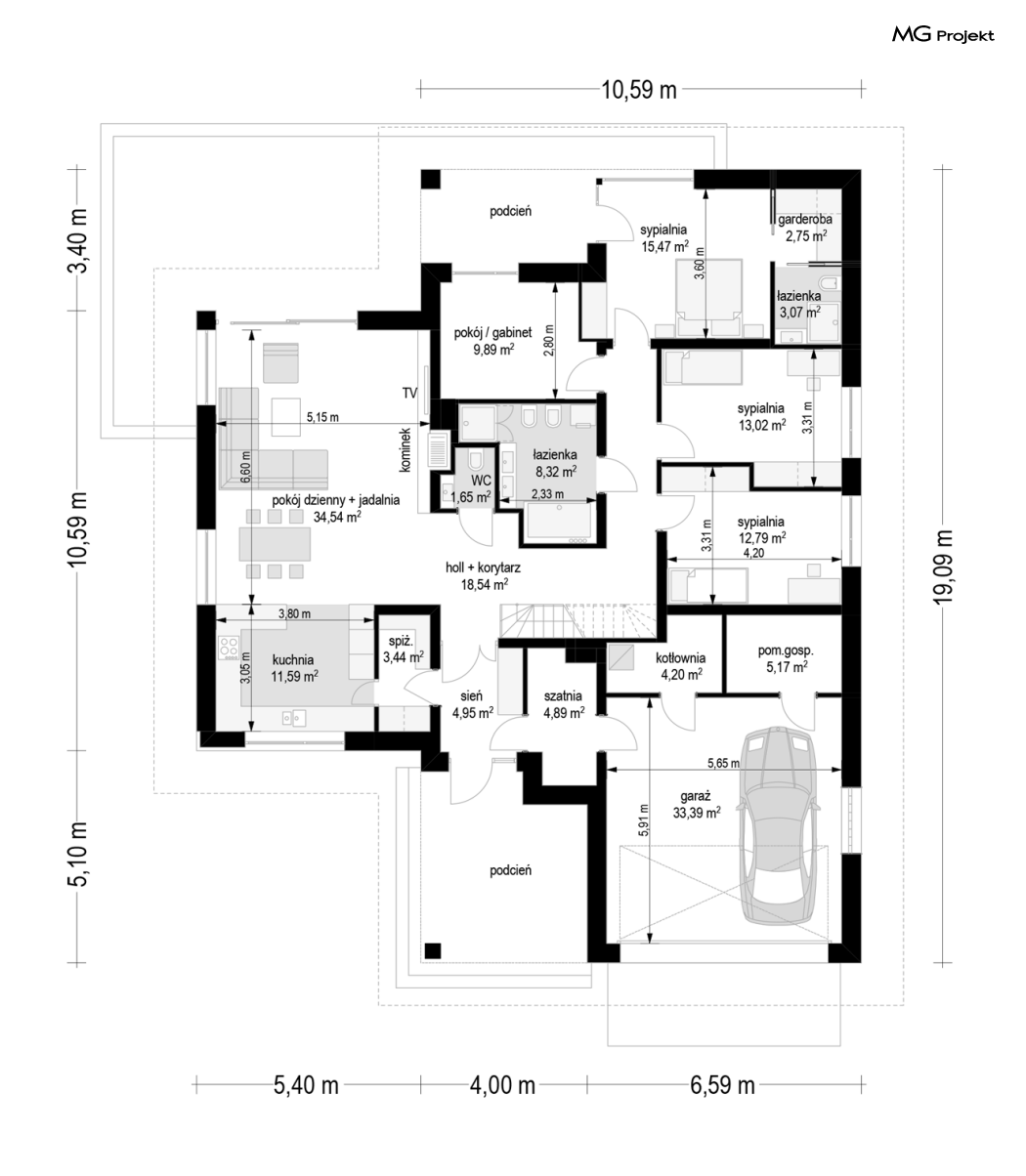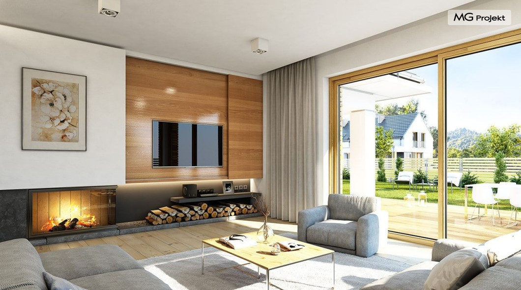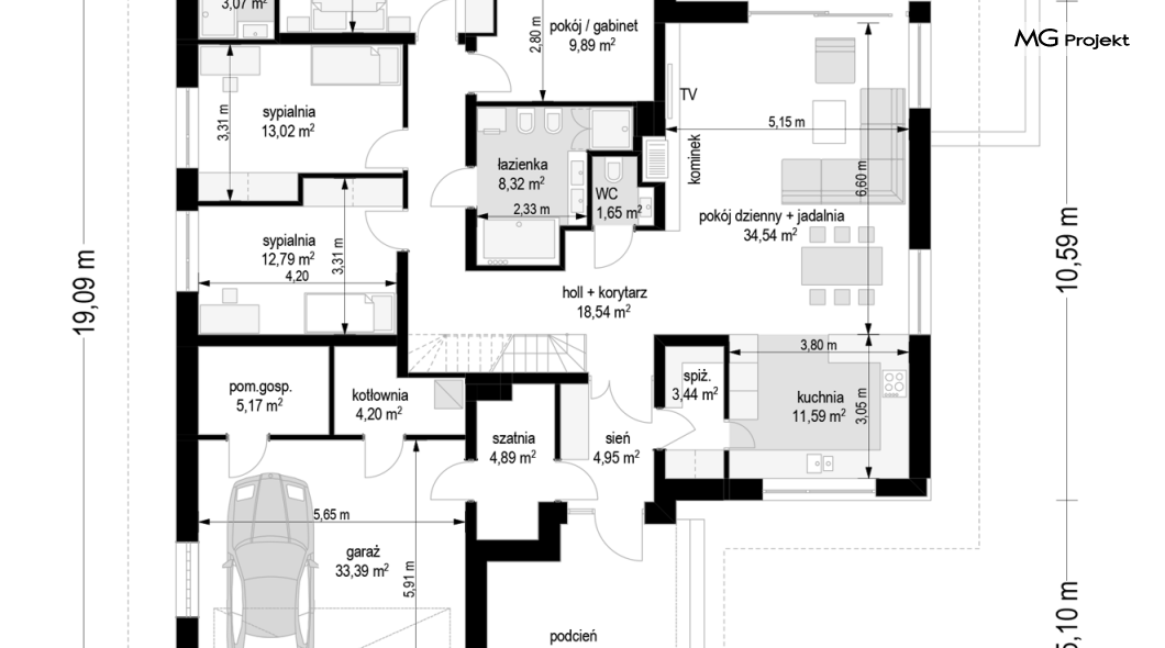 Wariant projektu z wysuniętym garażem o 2 m, z pomieszczeniem gospodarczym i kotłownią w garażu, ze zmienionym układem okien w kuchni, z szatnią w lokalizacji dawnej kotłowni.