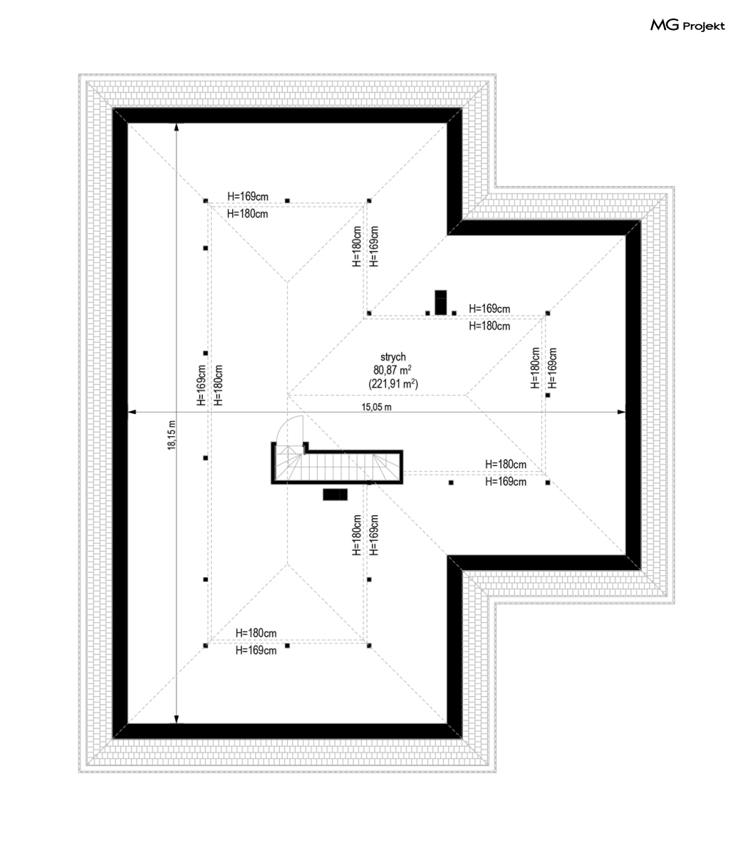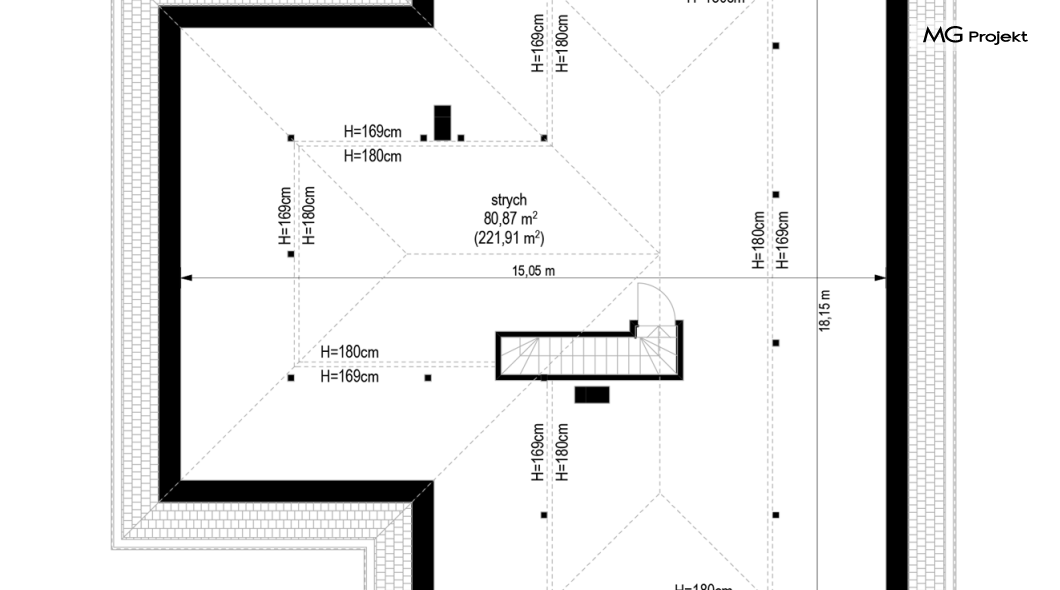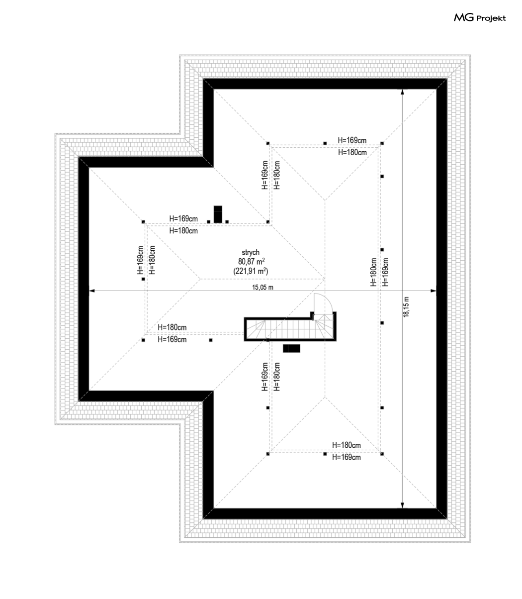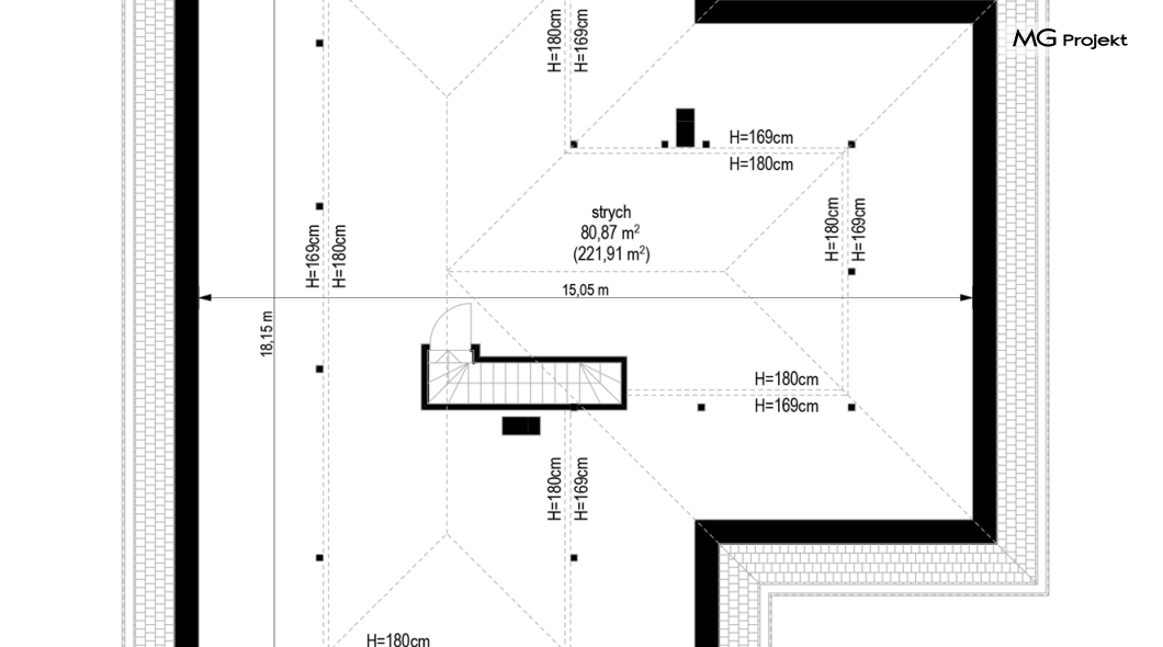 Wysokość wyznaczona od poziomu terenu do najwyżej położonej części dachu (np. kalenicy), zwykle bez uwzględnienia kominów.