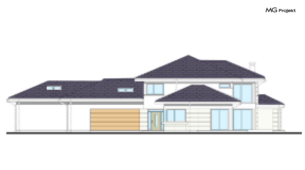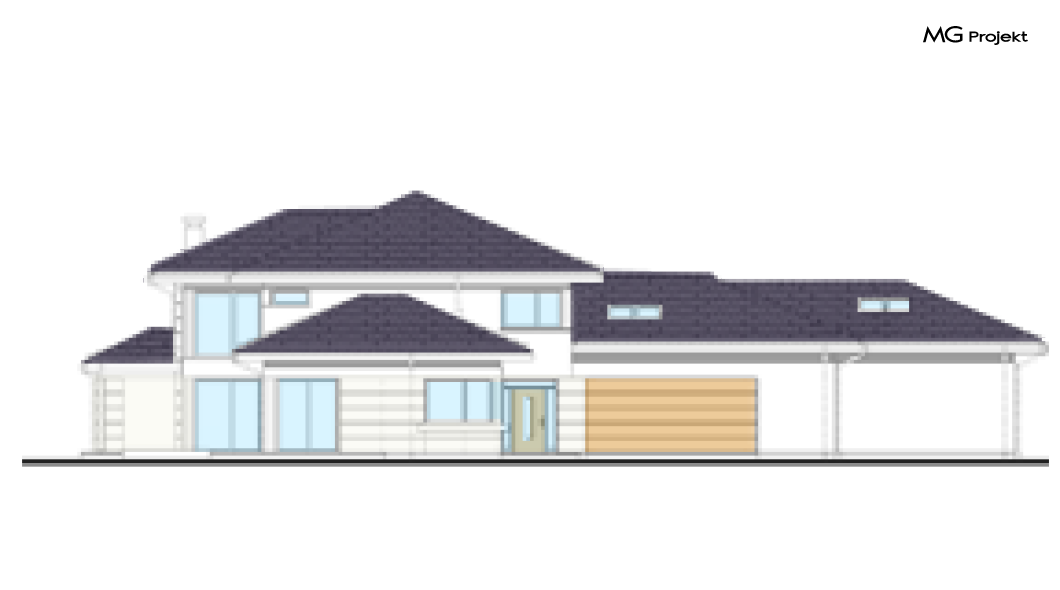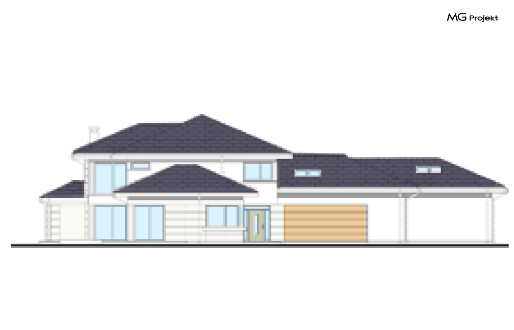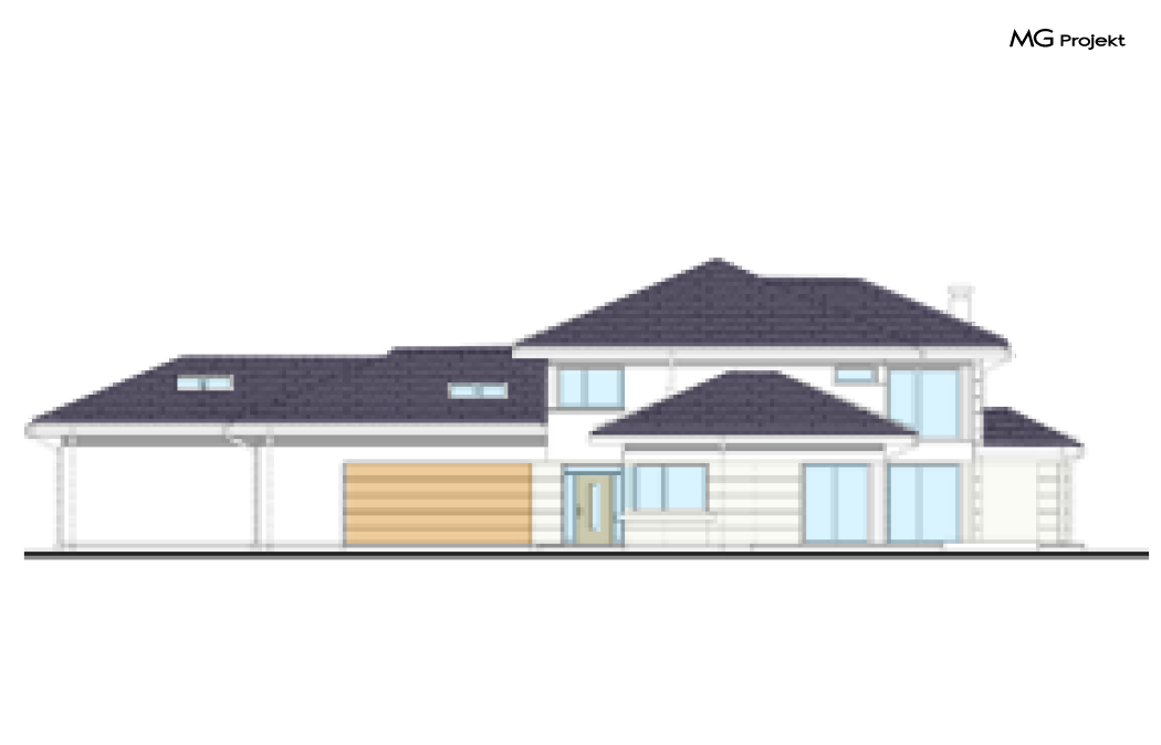 Wariant projektu Dom z widokiem 3 M, ze zmienionym kątem nachylenia dachu i wysokością budynku, doprojektowanym basenem, zmienioną lokalizacją kotłowni, poszerzonym garażem i szerszą bramą garażową.