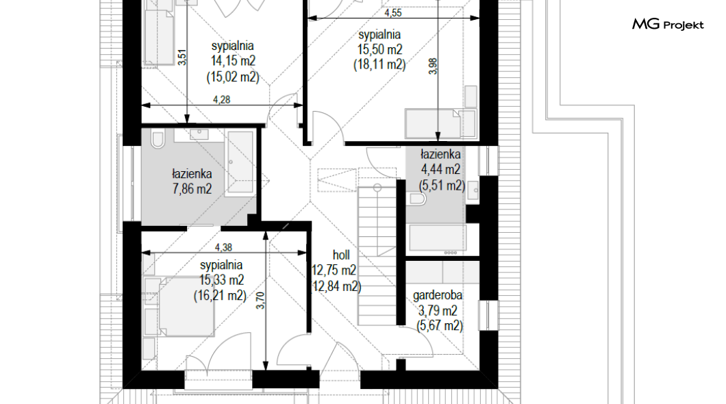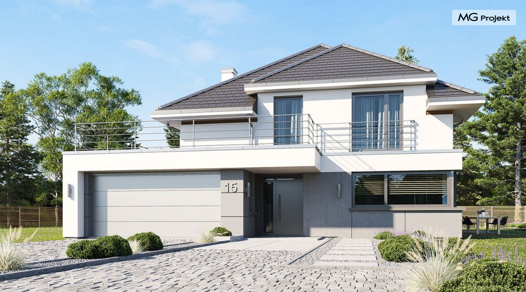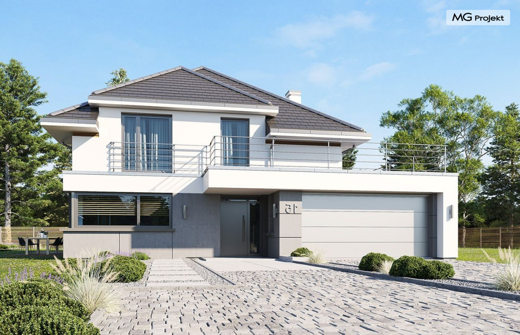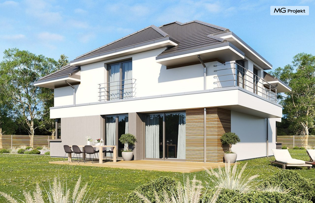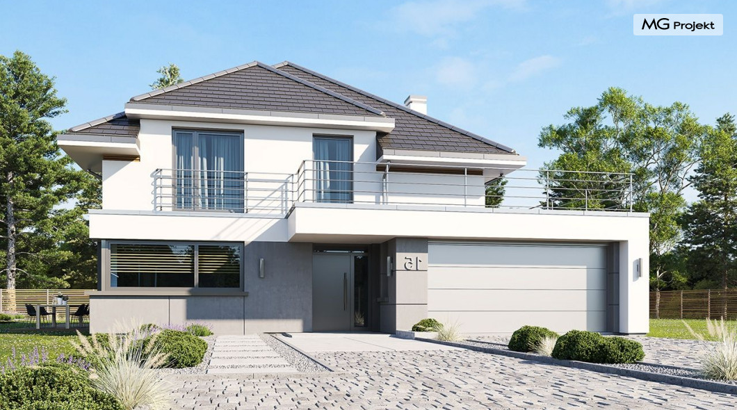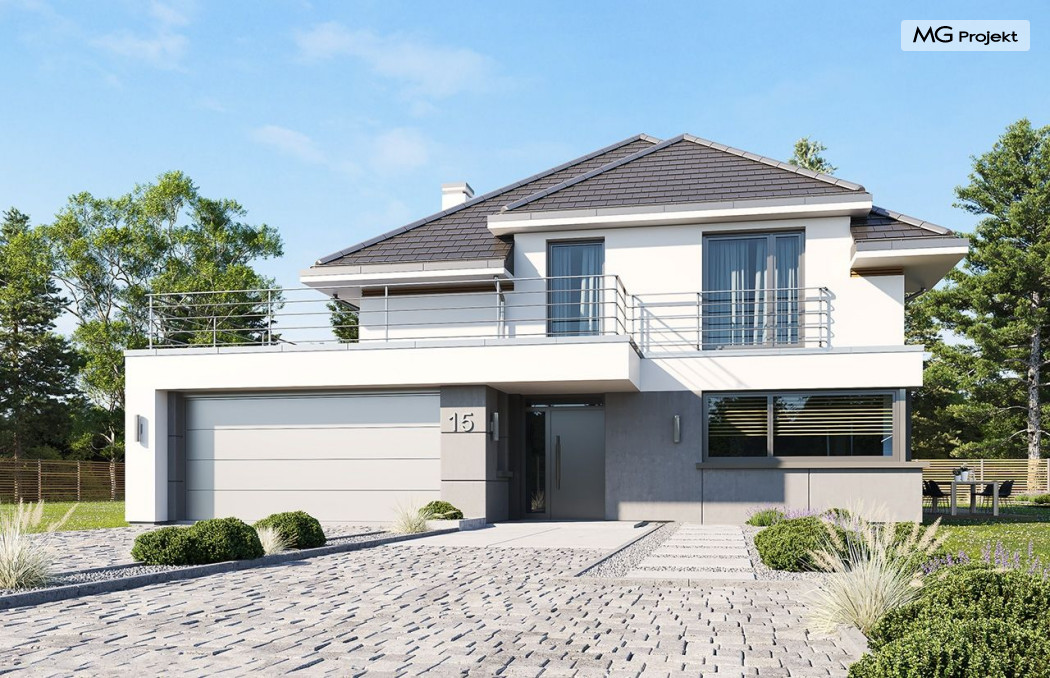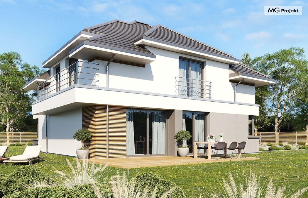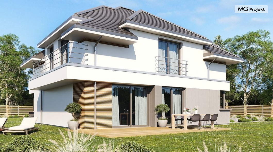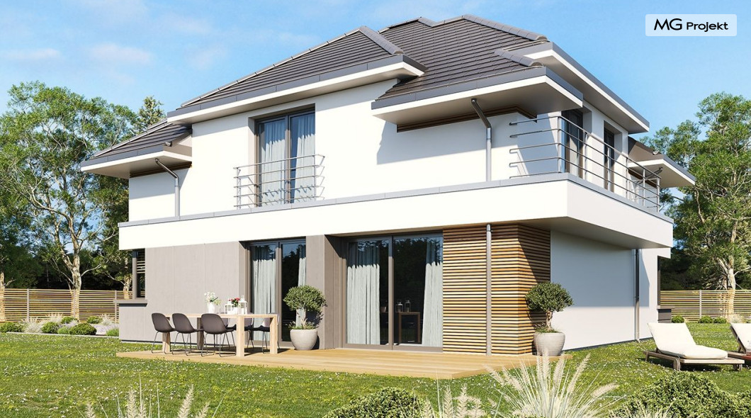Wariant projektu powiększony o 75 cm od frontu i z boku budynku, przeniesioną klatką schodową, zmienionym układem pomieszczeń na parterze i piętrze, z kominkiem gazowym w salonie. Zapraszamy do zapoznania się z pełną ofertą pracowni MG Projekt: https://www.mgprojekt.com.pl/oszust, https://www.mgprojekt.com.pl/oszust-wariant-b, https://www.mgprojekt.com.pl/oszust-2.