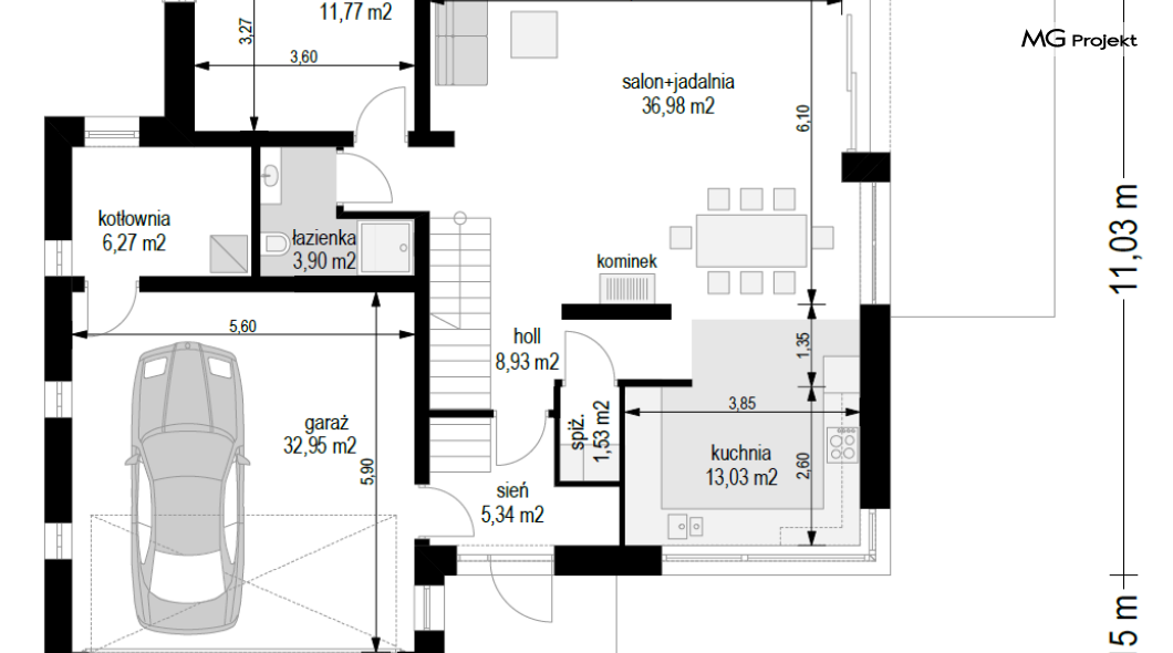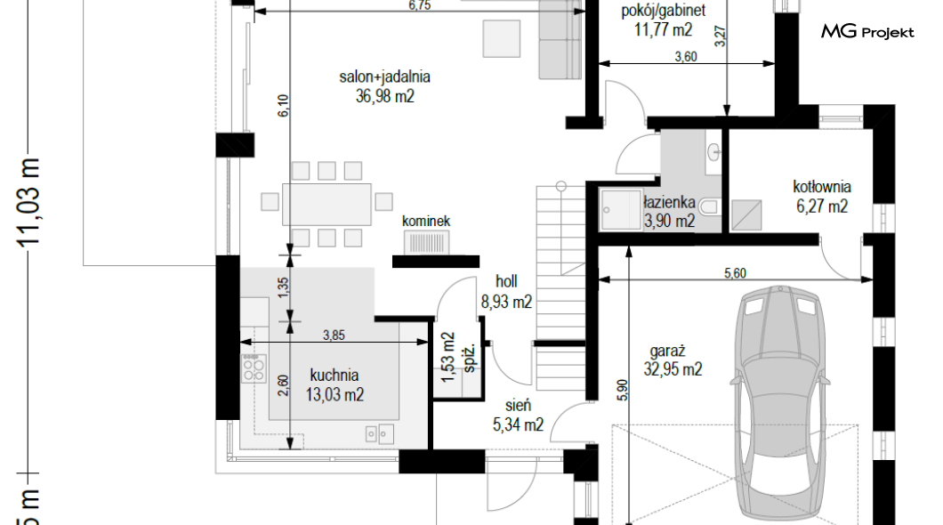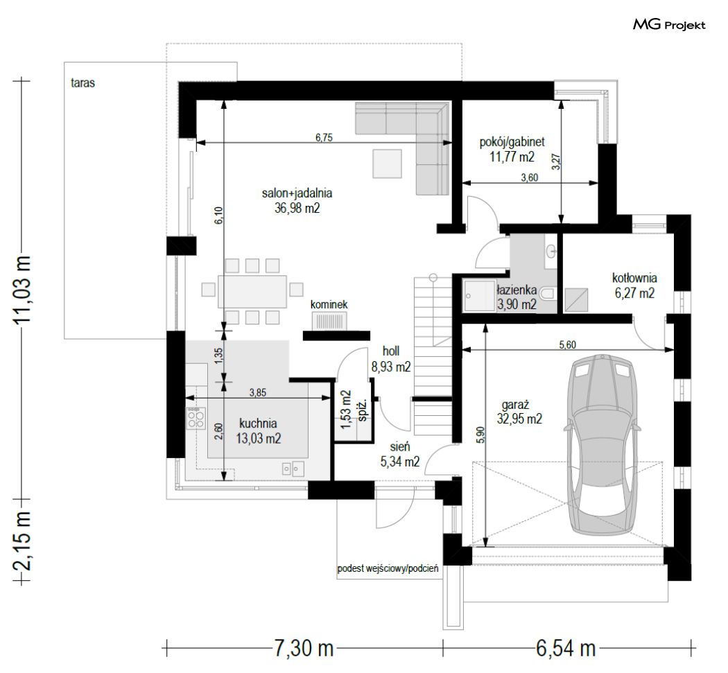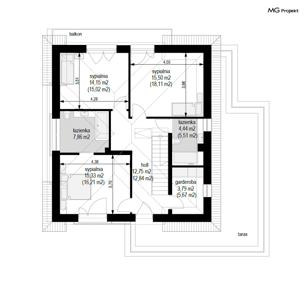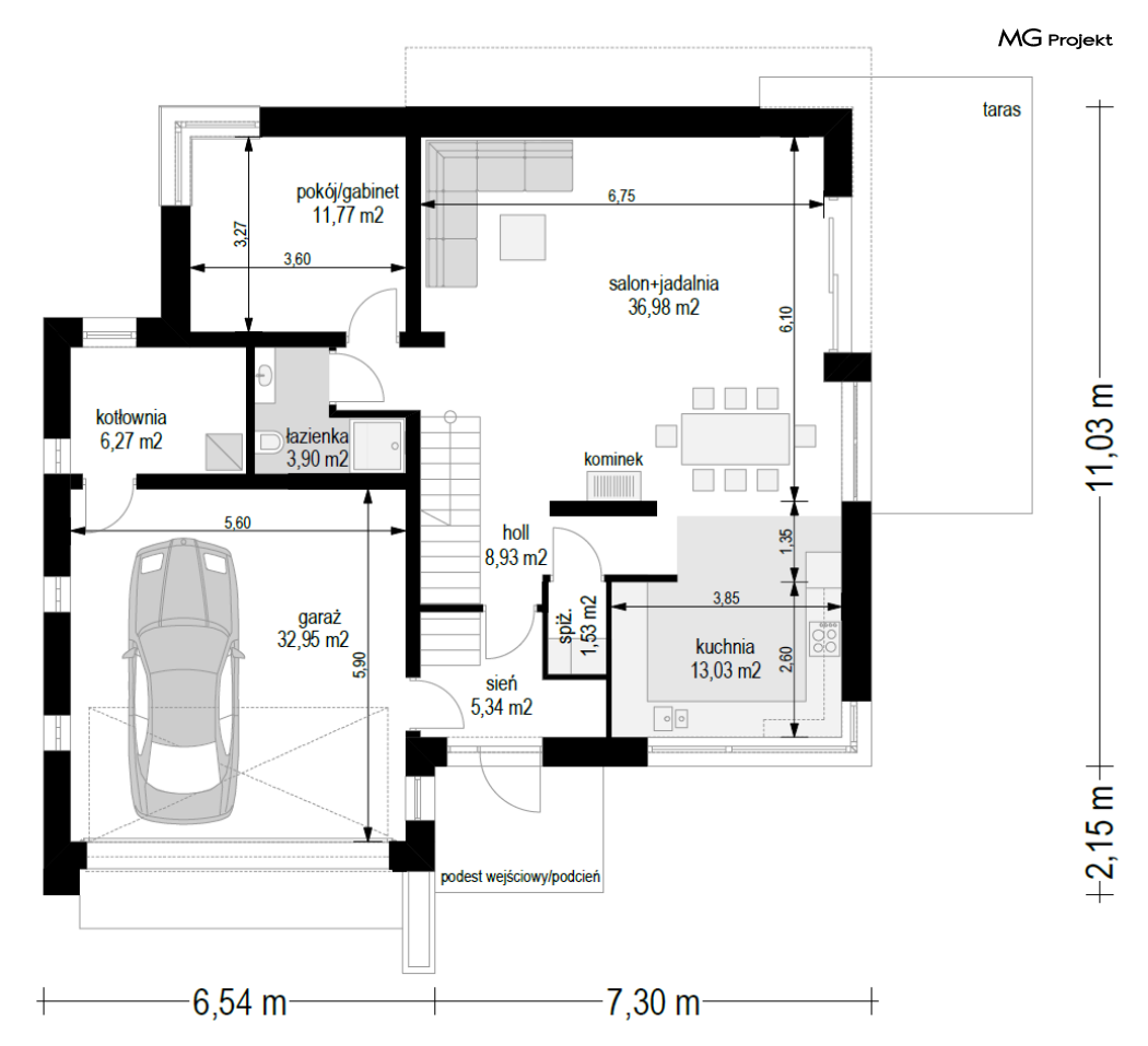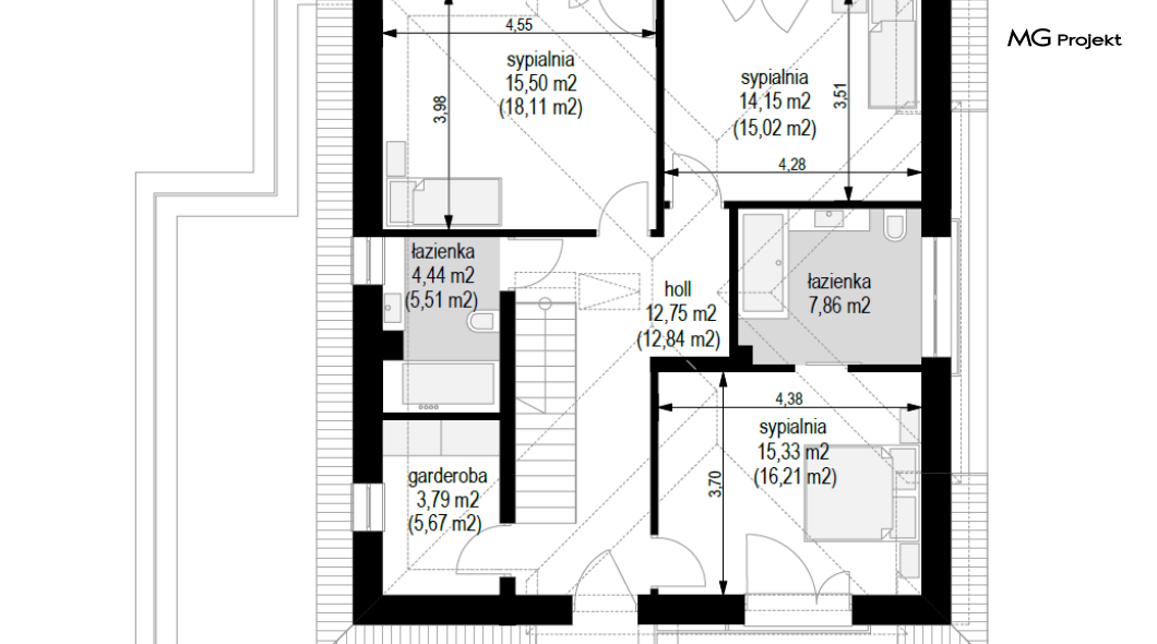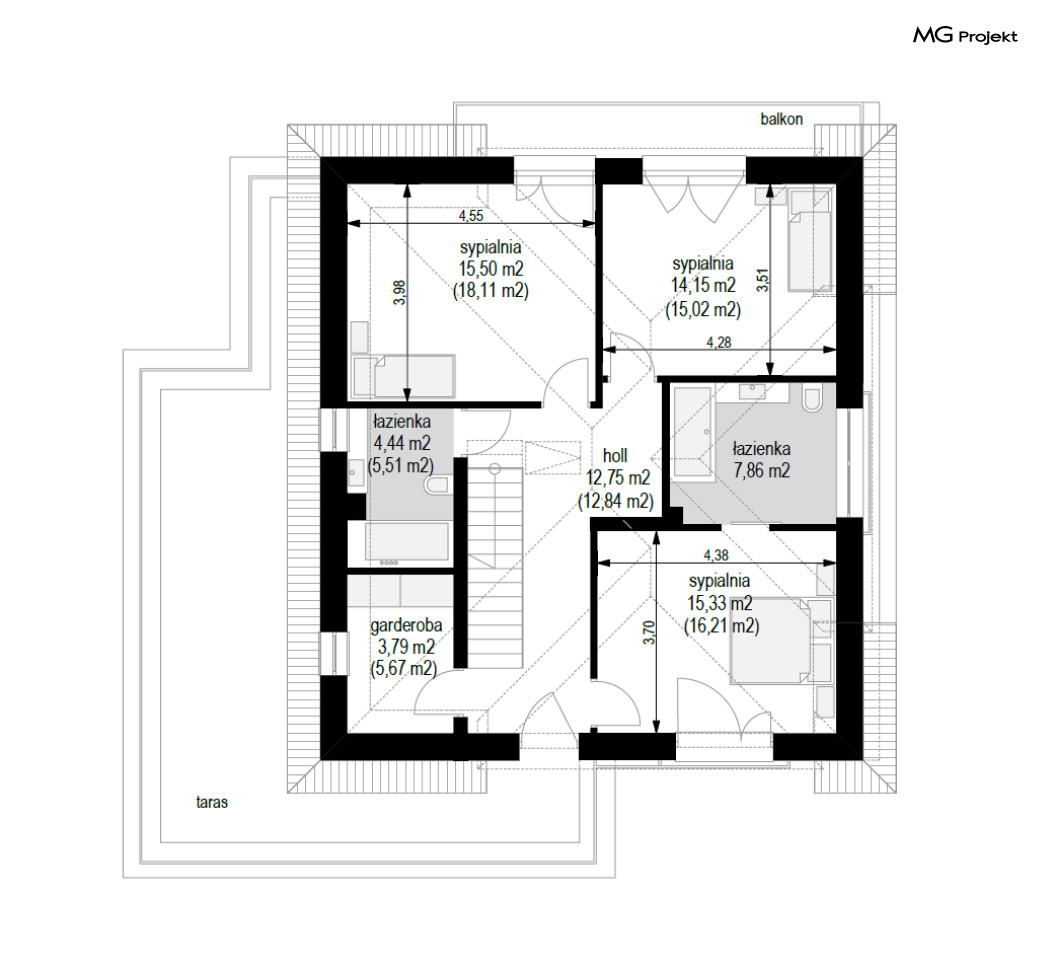 Wariant projektu powiększony o 75 cm od frontu i z boku budynku, przeniesioną klatką schodową, zmienionym układem pomieszczeń na parterze i piętrze, z kominkiem gazowym w salonie. Zapraszamy do zapoznania się z pełną ofertą pracowni MG Projekt: https://www.mgprojekt.com.pl/oszust, https://www.mgprojekt.com.pl/oszust-wariant-b, https://www.mgprojekt.com.pl/oszust-2.