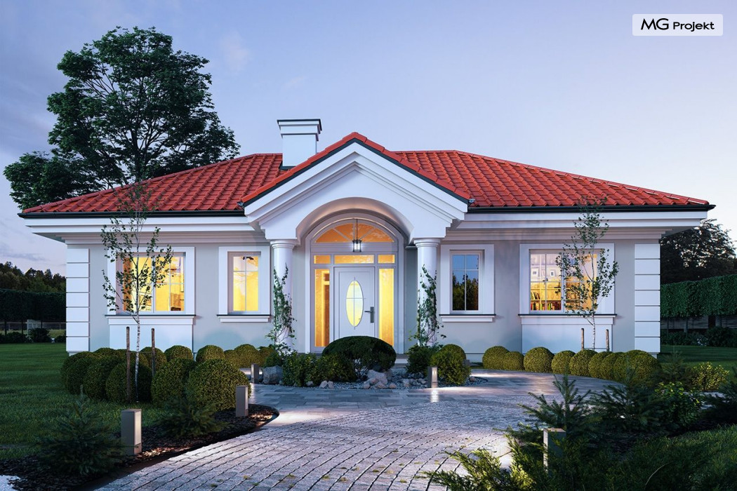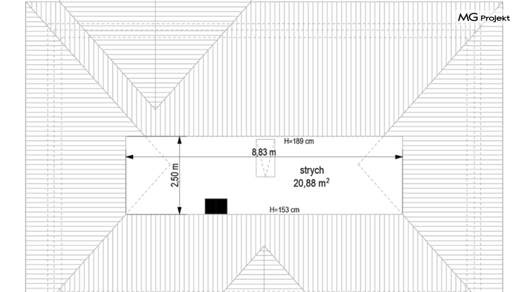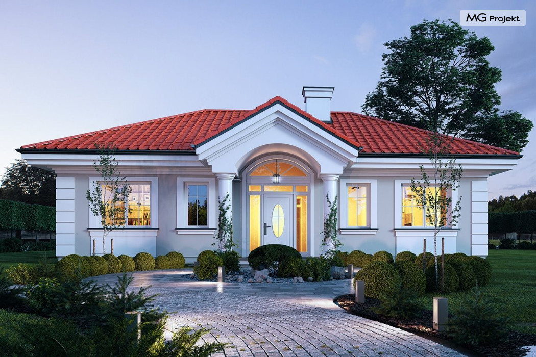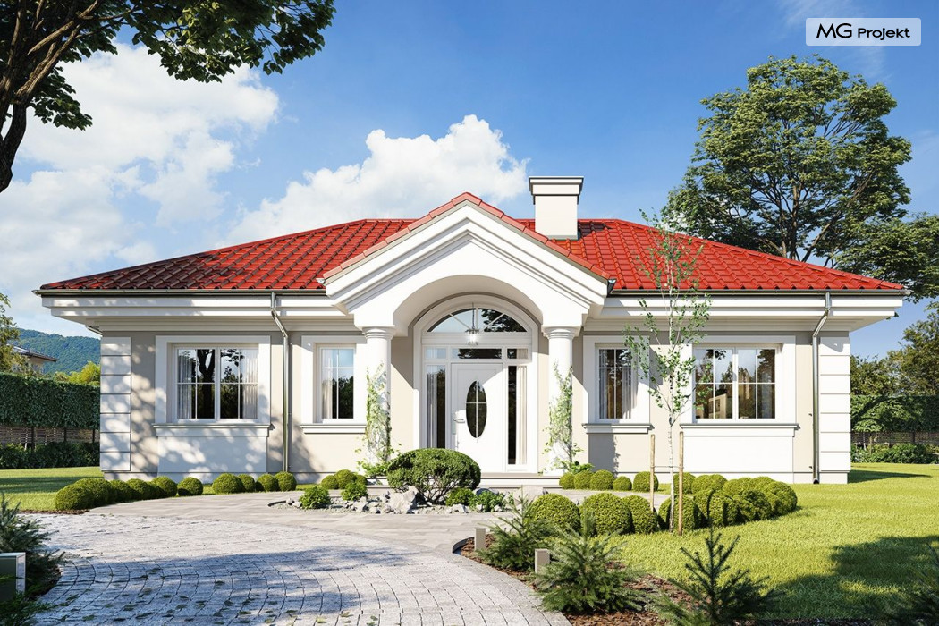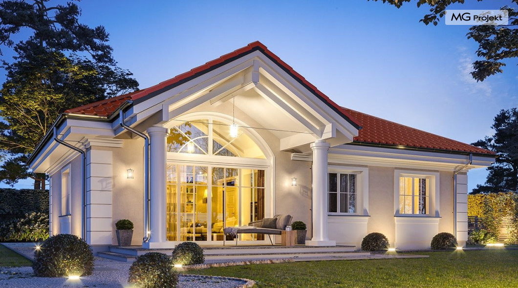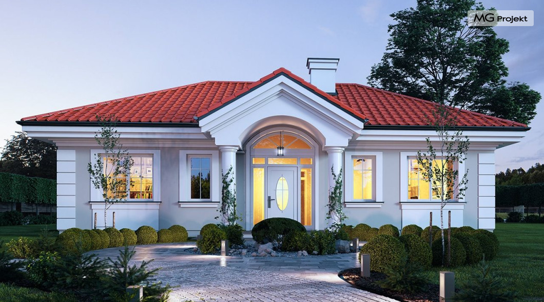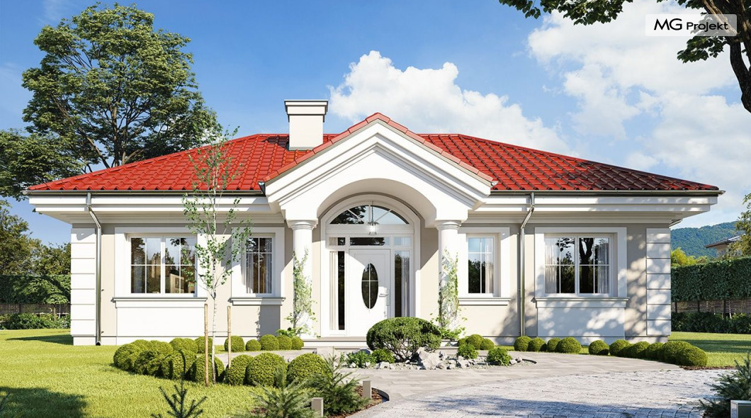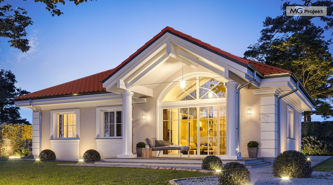 Wariant projektu z wiązarami (wersja ekonomiczna) zamiast tradycyjnej więźby ciesielskiej ze stropem żelbetowym.