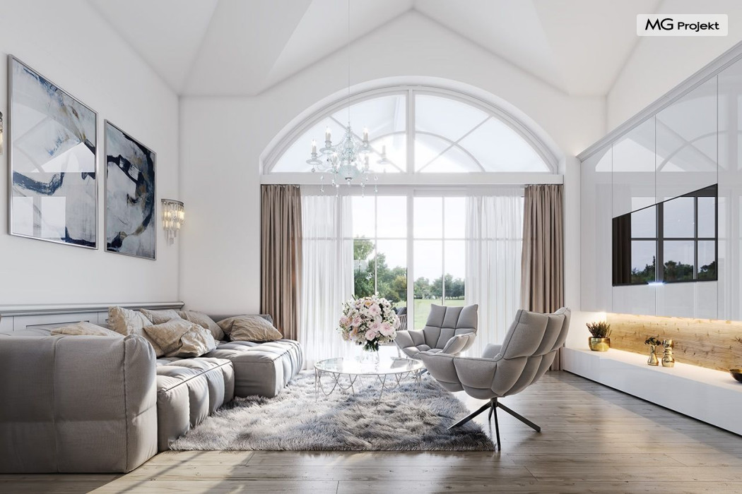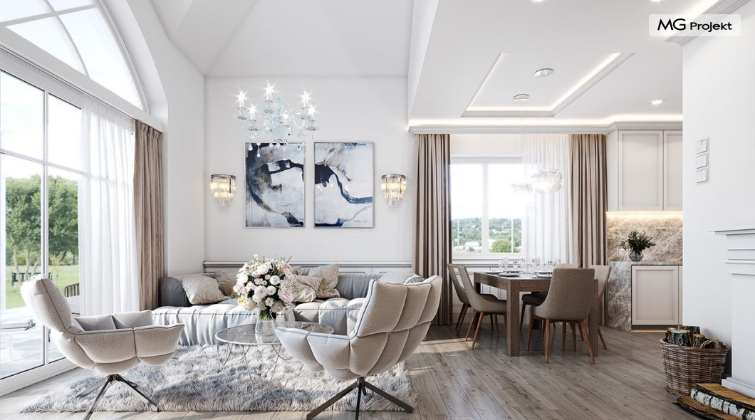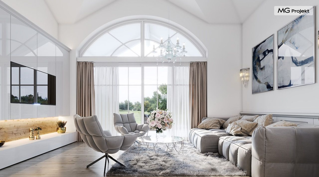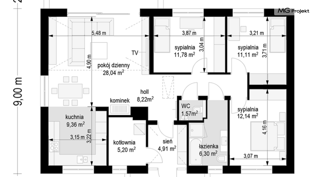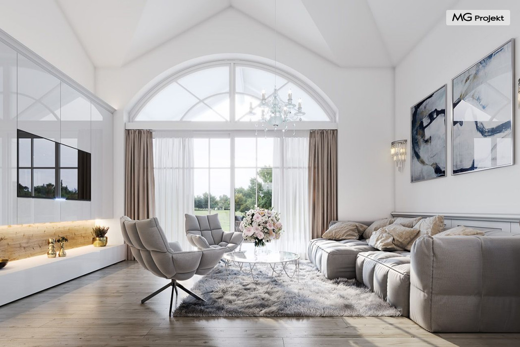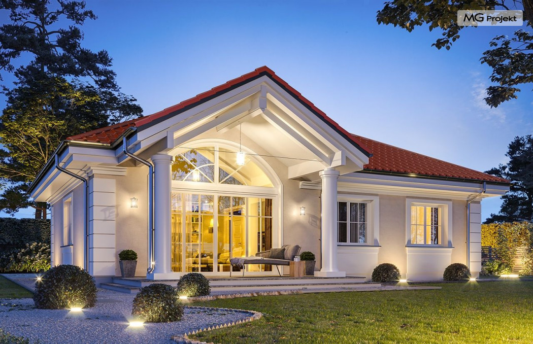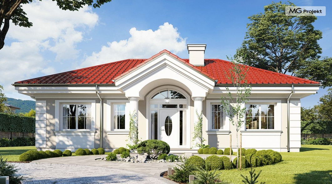 Wariant projektu z wiązarami (wersja ekonomiczna) zamiast tradycyjnej więźby ciesielskiej ze stropem żelbetowym.