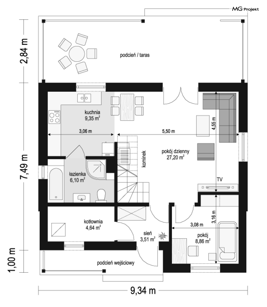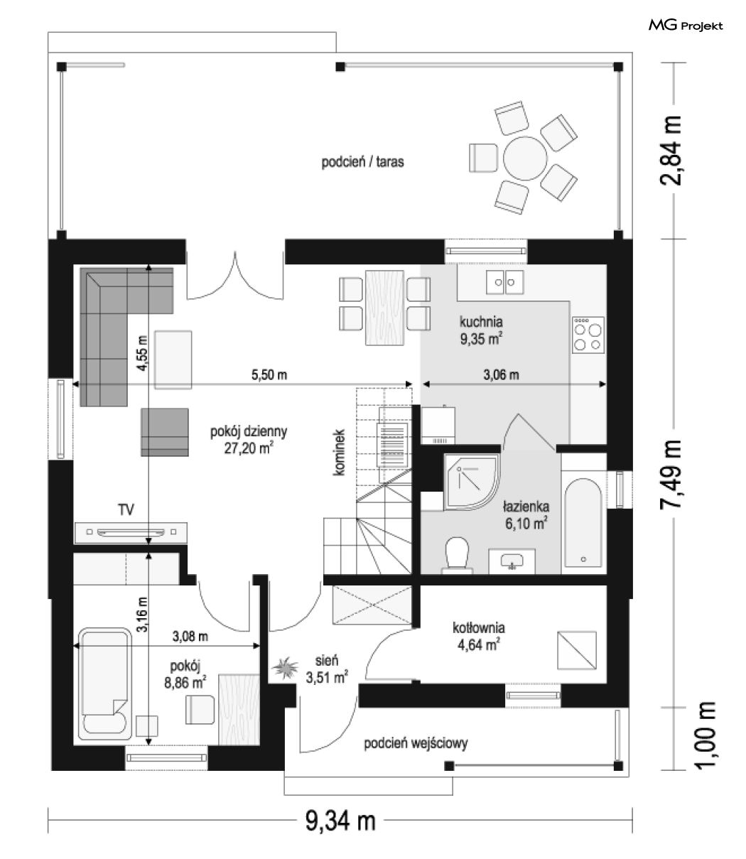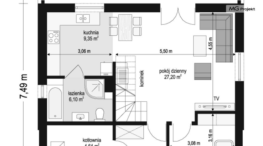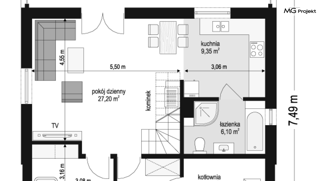Budynek w technologii szkieletowej z powiększoną łazienką i pomniejszoną kotłownią.