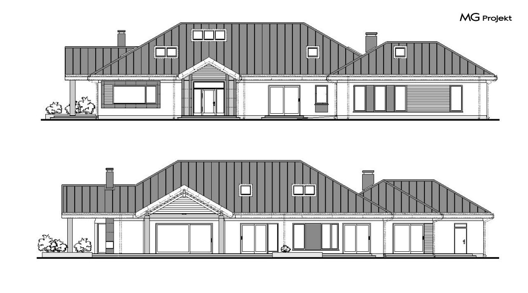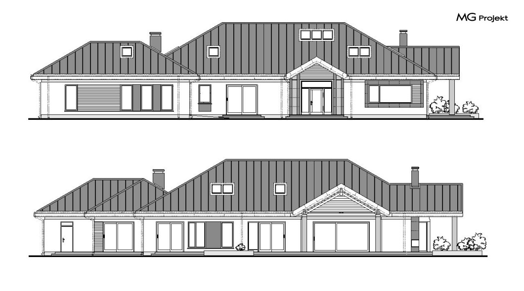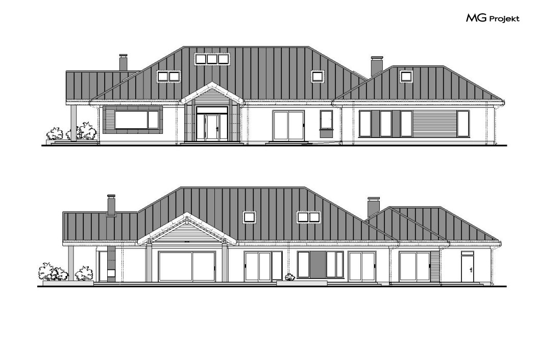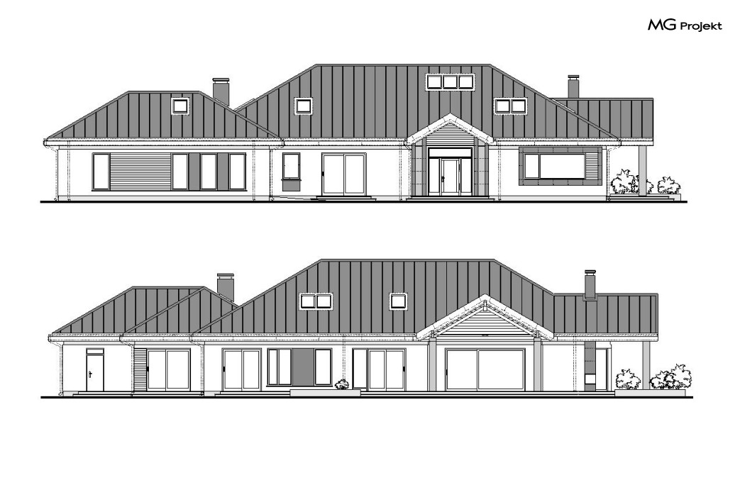 Wariant projektu ze zmienionym układem pomieszczeń, zagospodarowanym poddaszem, powiększonym garażem, dodaną strefą relaksu oraz kuchni letniej w piwnicy oraz unowocześnienie i uproszczenie elewacji.