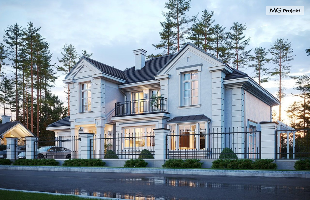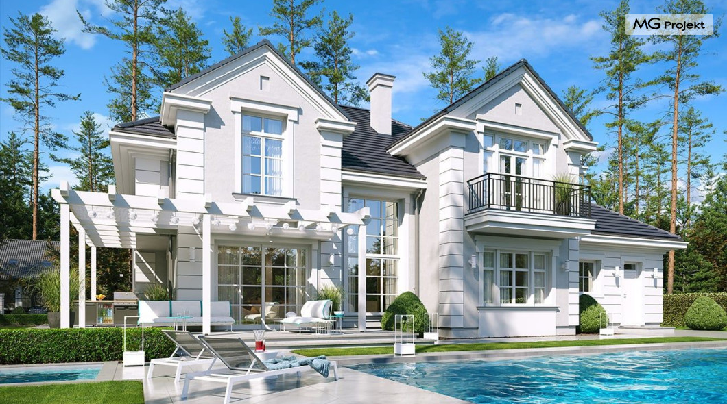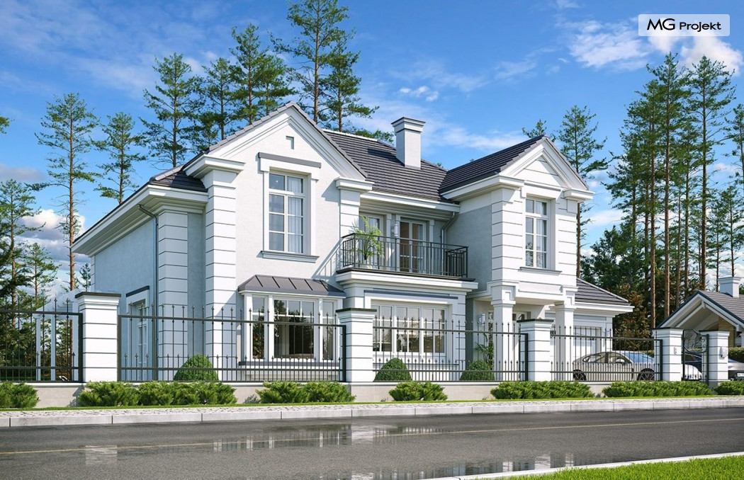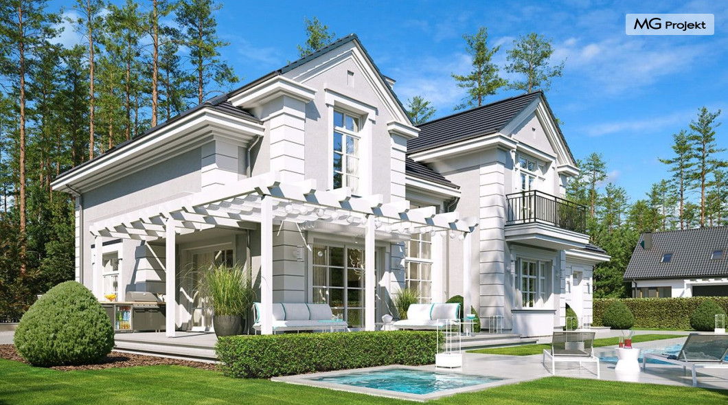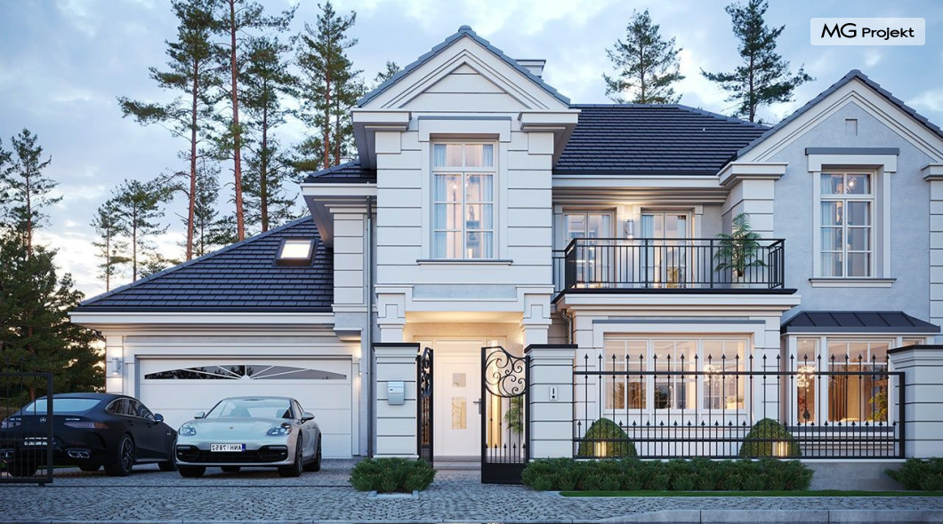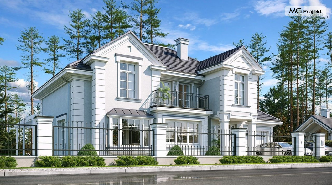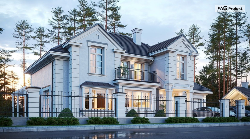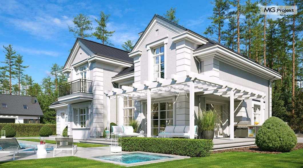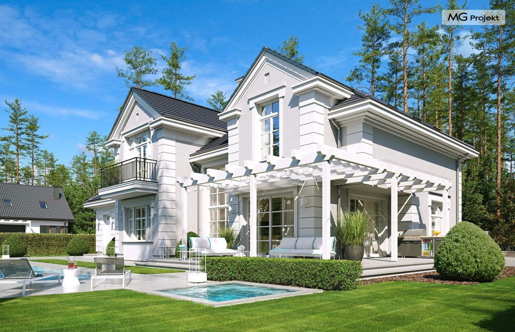 Projekt domu Willa Siedziba 3 to nowa odsłona cieszącego się uznaniem projektu Willa Siedziba. Nowy wariant to zmniejszony o 50 m2 dom, ze zwężoną o 5 metrów szerokością bryły, dzięki czemu budynek zmieści się na węższej 26-metrowej działce. Willa Siedziba 3 to reprezentacyjna miejska willa, nawiązująca swoją formą i stylistyką do wczesno dwudziestowiecznych rezydencji, jakie możemy spotkać do dziś w prestiżowych willowych dzielnicach większych miast. Dom ma powierzchnię użytkową wynoszącą ca 240 m2 i jest przeznaczony dla 4-6cioosobowej rodziny. Bryłę budynku zaprojektowano na prostokątnym planie i składa się z dwóch części - wyżej mieszkalnej, przykrytej czterospadowym dachem, oraz niższej bryły garażu. Dach budynku został osadzony na wysokości umożliwiającej interpretację tego budynku jako dom z poddaszem użytkowym. Główna bryła urozmaicona została czterema masywnymi lukarnami, skrywającymi w swojej szerokości pokoje górnej kondygnacji. Od strony elewacji fontowej willi mamy reprezentacyjne wejście z szerokimi drzwiami z naświetlami. Następnie dwa wykusze - kuchenny i jadalni - oba o innej formie, ale harmonizujące ze sobą. Dalej balkon z ozdobną balustradą, dostępny z holu-saloniku piętra, oraz wspomniane dwie lukarny pokoi piętra spinające całą kompozycję bryły. Trochę wycofany garaż nie narzuca się i pozwala znaleźć miejsce na swobodne parkowanie aut przed drzwiami garażowymi. Strona ogrodowa to jeszcze bardziej urozmaicona fasada. Mamy tutaj wystające lukarny pięter, między nimi dwupiętrowe okno salonu, balkon sypialni master, oraz przepiękną pergolę przykrywającą częściowo taras. Wnętrze domu na parterze to przede wszystkim duża przestrzeń dzienna połączonych pomieszczeń salonu, kuchni i jadalni, tworząca razem ponad 80-metrową powierzchnię. Dodatkowym urozmaiceniem jest tutaj otwarcie przestrzenne - pustka nad salonem, połączona z antresolą piętra, gdzie znajduje się hol-salonik. Do domu wchodzimy przez wygodny przedsionek z szatnią, do holu z reprezentacyjnymi schodami, a dalej do przestrzeni dziennej. Dodatkowe pomieszczenia na parterze to oczywiście duży garaż z pomieszczeniem technicznym, oraz oddzielony akustycznie gabinet. Na piętrze zaprojektowano 4 pokoje sypialne, w tym apartament master z oddzielną łazienką i garderobami. Willa Siedziba 3 została zaprojektowana jako dom energooszczędny, z dobrej jakości materiałów, z dobrą izolacją termiczną i z nowoczesnymi instalacjami. Budynek mimo skomplikowanej formy wykonano w tradycyjnej technologii, z rozwiązaniami spotykanymi na każdej budowie. Budowa budynku nie powinna być problematyczna dla fachowego wykonawcy. Willa Siedziba 3 to propozycja dla Inwestorów marzących o budowie prawdziwego pełnokrwistego domu o odpowiedniej skali, dającego przestrzeń do komfortowego życia, marzących o realizacji projektu nietuzinkowego o ponadczasowej stylistyce. Zapraszamy !