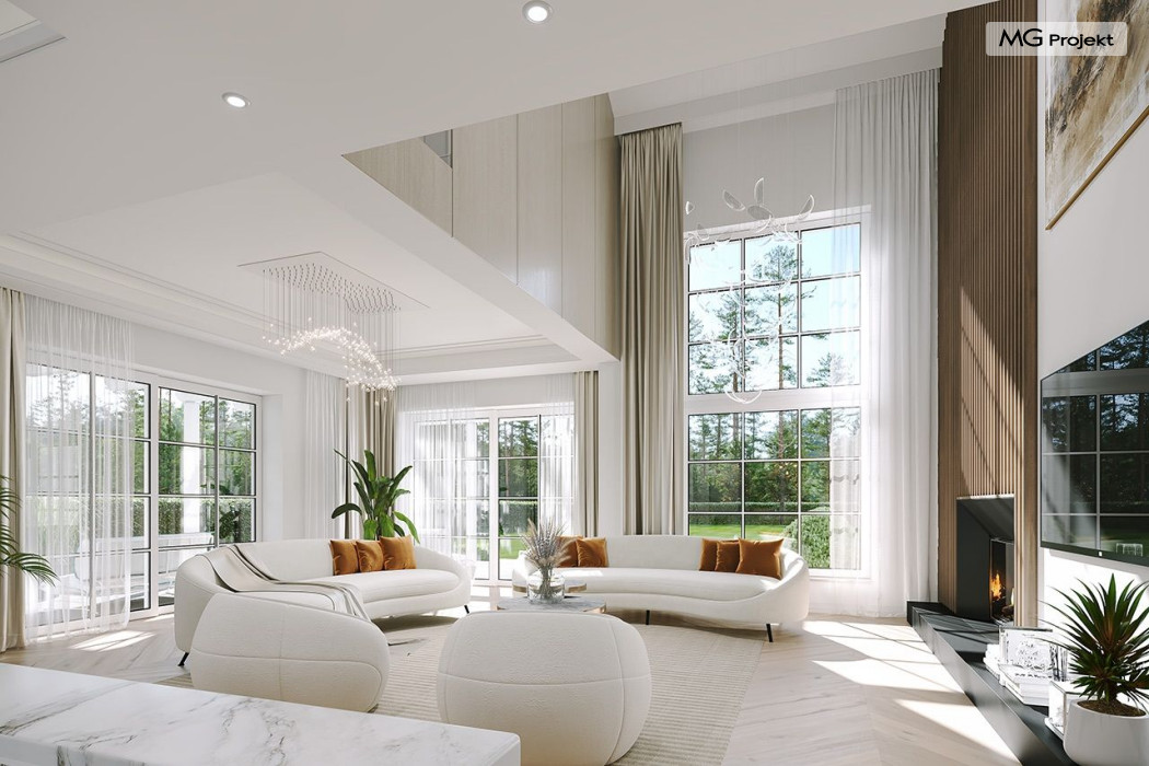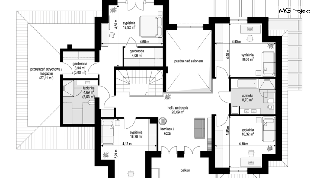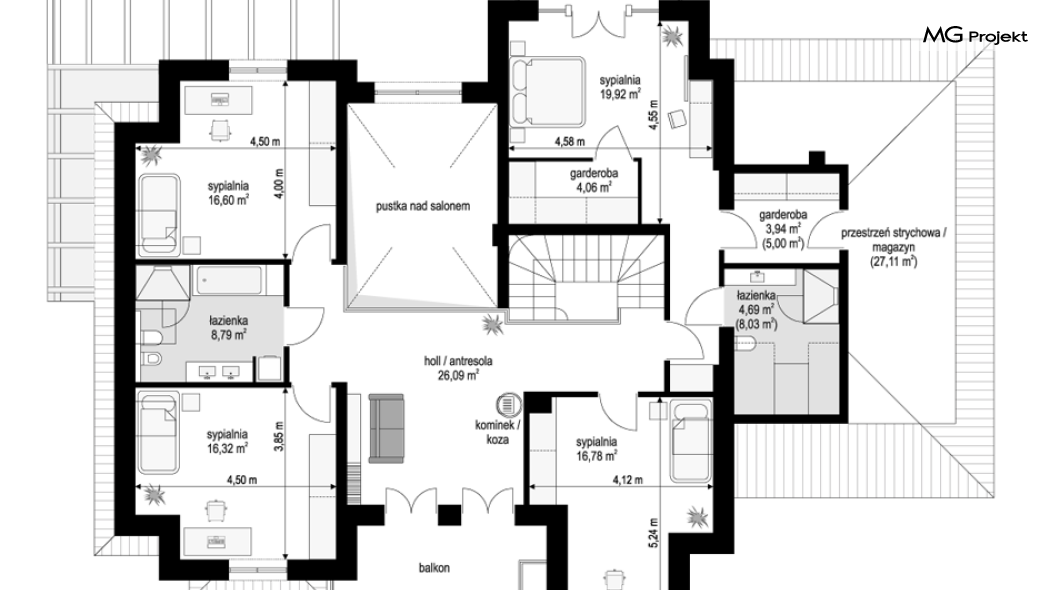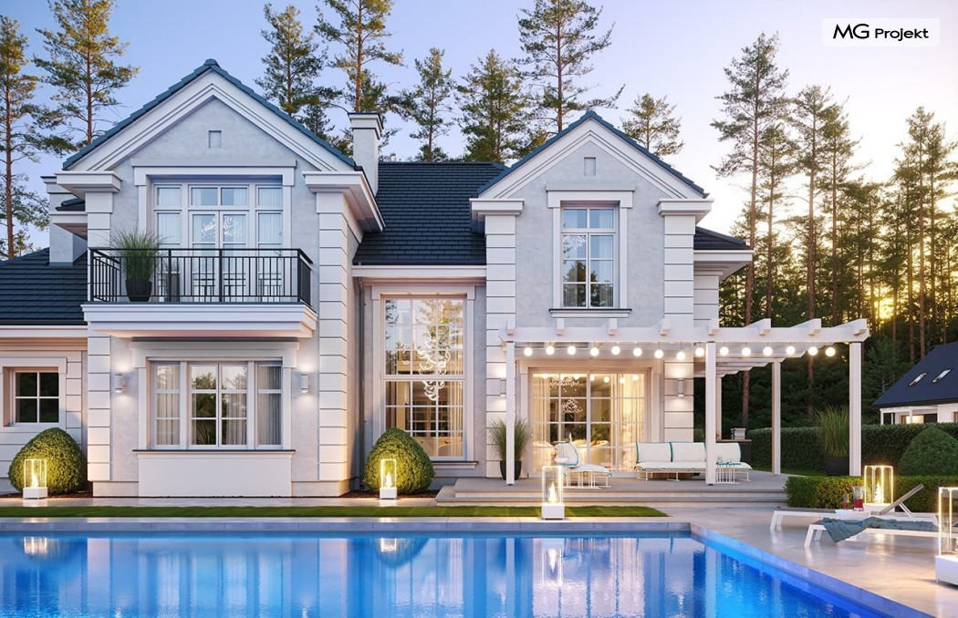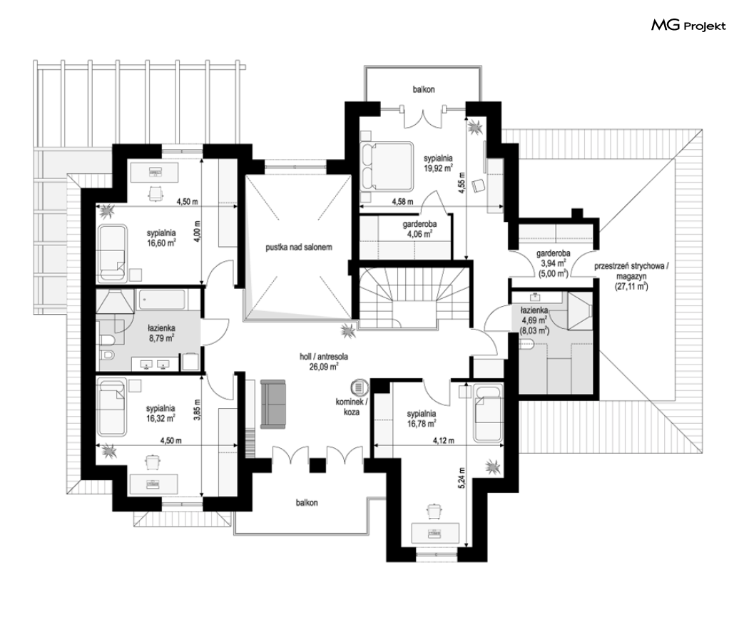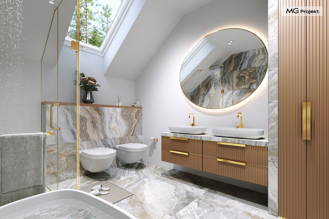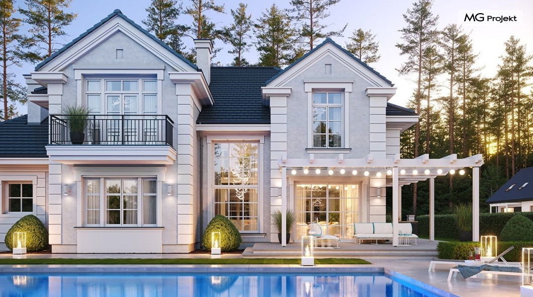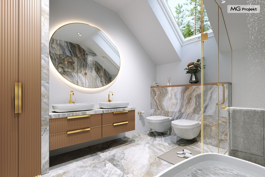 Projekt domu Willa Siedziba 3 to nowa odsłona cieszącego się uznaniem projektu Willa Siedziba. Nowy wariant to zmniejszony o 50 m2 dom, ze zwężoną o 5 metrów szerokością bryły, dzięki czemu budynek zmieści się na węższej 26-metrowej działce. Willa Siedziba 3 to reprezentacyjna miejska willa, nawiązująca swoją formą i stylistyką do wczesno dwudziestowiecznych rezydencji, jakie możemy spotkać do dziś w prestiżowych willowych dzielnicach większych miast. Dom ma powierzchnię użytkową wynoszącą ca 240 m2 i jest przeznaczony dla 4-6cioosobowej rodziny. Bryłę budynku zaprojektowano na prostokątnym planie i składa się z dwóch części - wyżej mieszkalnej, przykrytej czterospadowym dachem, oraz niższej bryły garażu. Dach budynku został osadzony na wysokości umożliwiającej interpretację tego budynku jako dom z poddaszem użytkowym. Główna bryła urozmaicona została czterema masywnymi lukarnami, skrywającymi w swojej szerokości pokoje górnej kondygnacji. Od strony elewacji fontowej willi mamy reprezentacyjne wejście z szerokimi drzwiami z naświetlami. Następnie dwa wykusze - kuchenny i jadalni - oba o innej formie, ale harmonizujące ze sobą. Dalej balkon z ozdobną balustradą, dostępny z holu-saloniku piętra, oraz wspomniane dwie lukarny pokoi piętra spinające całą kompozycję bryły. Trochę wycofany garaż nie narzuca się i pozwala znaleźć miejsce na swobodne parkowanie aut przed drzwiami garażowymi. Strona ogrodowa to jeszcze bardziej urozmaicona fasada. Mamy tutaj wystające lukarny pięter, między nimi dwupiętrowe okno salonu, balkon sypialni master, oraz przepiękną pergolę przykrywającą częściowo taras. Wnętrze domu na parterze to przede wszystkim duża przestrzeń dzienna połączonych pomieszczeń salonu, kuchni i jadalni, tworząca razem ponad 80-metrową powierzchnię. Dodatkowym urozmaiceniem jest tutaj otwarcie przestrzenne - pustka nad salonem, połączona z antresolą piętra, gdzie znajduje się hol-salonik. Do domu wchodzimy przez wygodny przedsionek z szatnią, do holu z reprezentacyjnymi schodami, a dalej do przestrzeni dziennej. Dodatkowe pomieszczenia na parterze to oczywiście duży garaż z pomieszczeniem technicznym, oraz oddzielony akustycznie gabinet. Na piętrze zaprojektowano 4 pokoje sypialne, w tym apartament master z oddzielną łazienką i garderobami. Willa Siedziba 3 została zaprojektowana jako dom energooszczędny, z dobrej jakości materiałów, z dobrą izolacją termiczną i z nowoczesnymi instalacjami. Budynek mimo skomplikowanej formy wykonano w tradycyjnej technologii, z rozwiązaniami spotykanymi na każdej budowie. Budowa budynku nie powinna być problematyczna dla fachowego wykonawcy. Willa Siedziba 3 to propozycja dla Inwestorów marzących o budowie prawdziwego pełnokrwistego domu o odpowiedniej skali, dającego przestrzeń do komfortowego życia, marzących o realizacji projektu nietuzinkowego o ponadczasowej stylistyce. Zapraszamy !