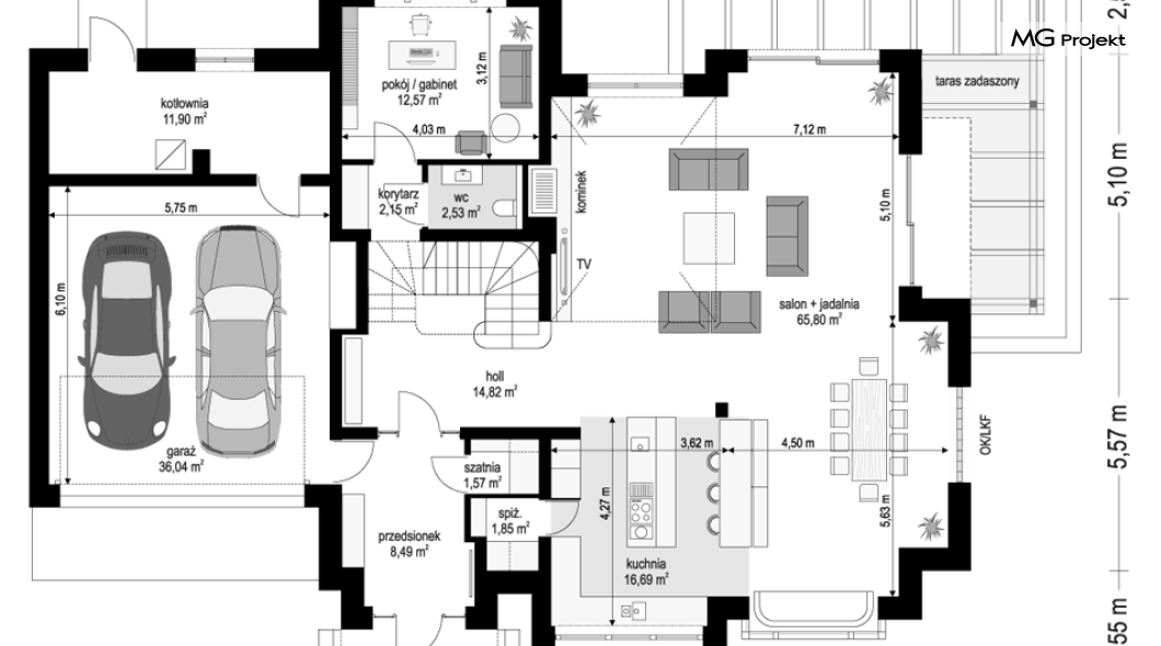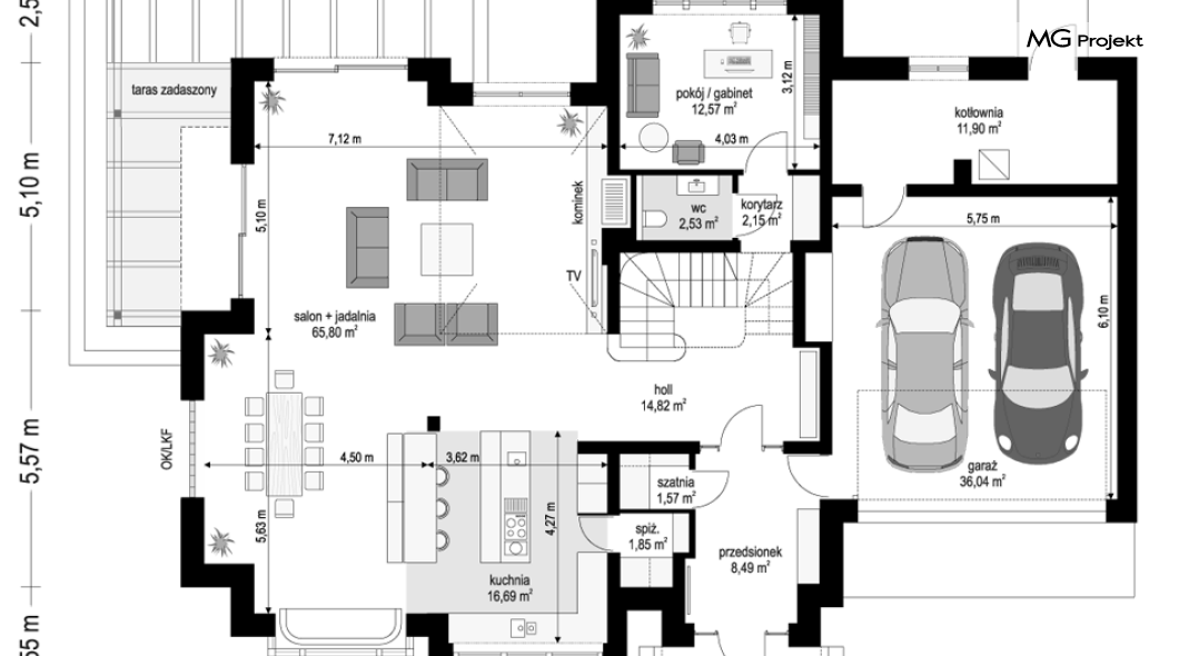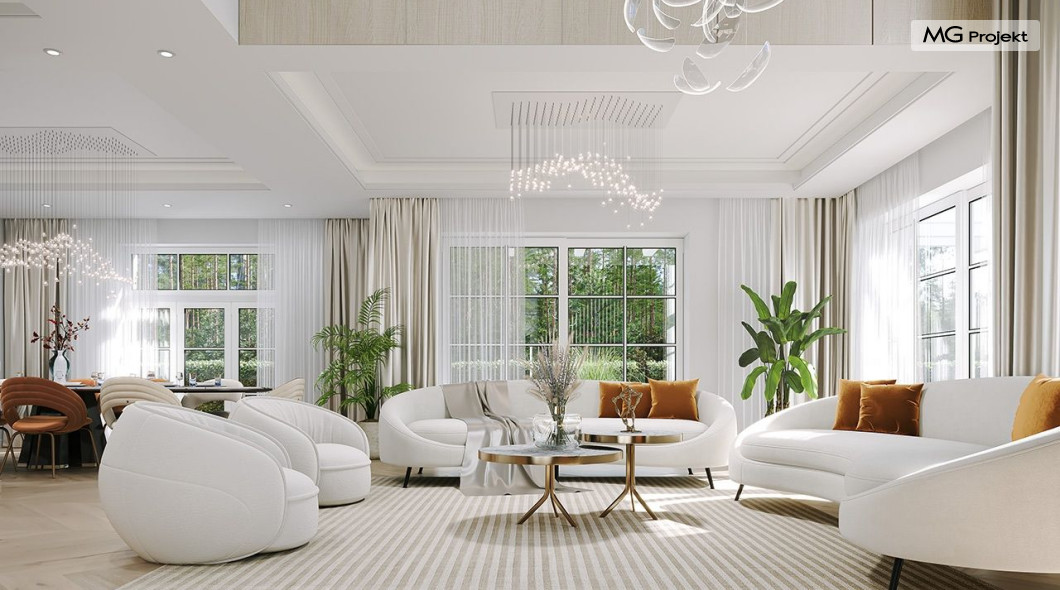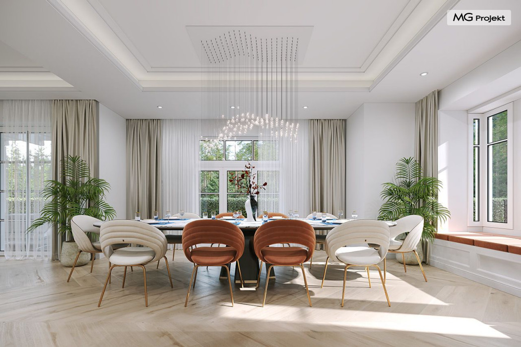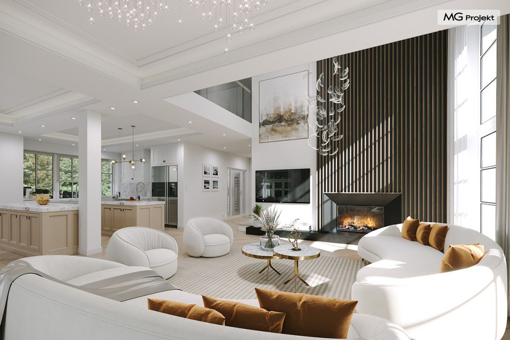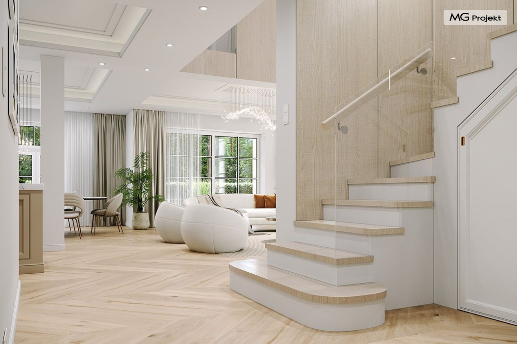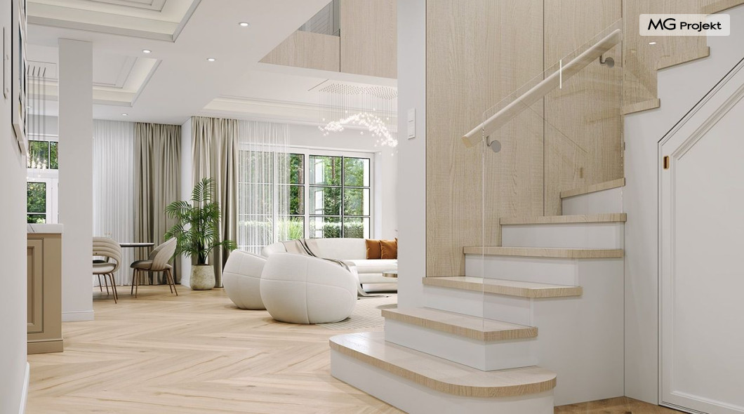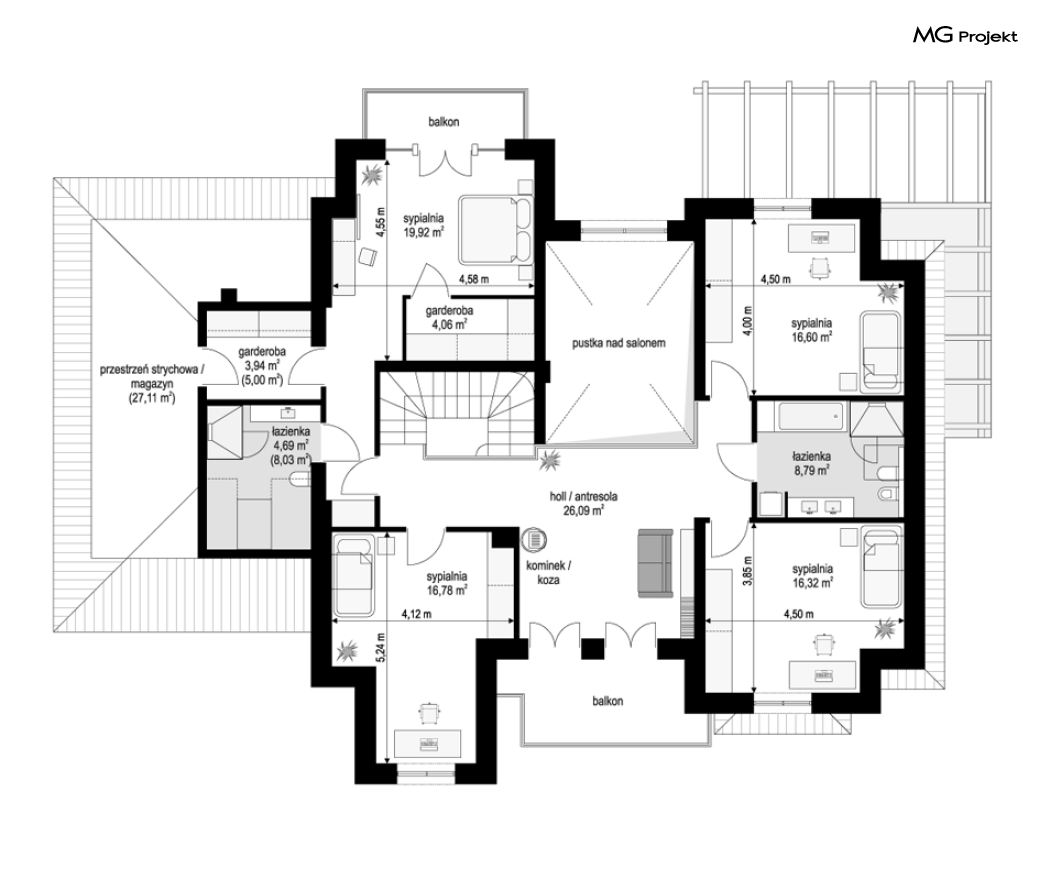 Projekt domu Willa Siedziba 3 to nowa odsłona cieszącego się uznaniem projektu Willa Siedziba. Nowy wariant to zmniejszony o 50 m2 dom, ze zwężoną o 5 metrów szerokością bryły, dzięki czemu budynek zmieści się na węższej 26-metrowej działce. Willa Siedziba 3 to reprezentacyjna miejska willa, nawiązująca swoją formą i stylistyką do wczesno dwudziestowiecznych rezydencji, jakie możemy spotkać do dziś w prestiżowych willowych dzielnicach większych miast. Dom ma powierzchnię użytkową wynoszącą ca 240 m2 i jest przeznaczony dla 4-6cioosobowej rodziny. Bryłę budynku zaprojektowano na prostokątnym planie i składa się z dwóch części - wyżej mieszkalnej, przykrytej czterospadowym dachem, oraz niższej bryły garażu. Dach budynku został osadzony na wysokości umożliwiającej interpretację tego budynku jako dom z poddaszem użytkowym. Główna bryła urozmaicona została czterema masywnymi lukarnami, skrywającymi w swojej szerokości pokoje górnej kondygnacji. Od strony elewacji fontowej willi mamy reprezentacyjne wejście z szerokimi drzwiami z naświetlami. Następnie dwa wykusze - kuchenny i jadalni - oba o innej formie, ale harmonizujące ze sobą. Dalej balkon z ozdobną balustradą, dostępny z holu-saloniku piętra, oraz wspomniane dwie lukarny pokoi piętra spinające całą kompozycję bryły. Trochę wycofany garaż nie narzuca się i pozwala znaleźć miejsce na swobodne parkowanie aut przed drzwiami garażowymi. Strona ogrodowa to jeszcze bardziej urozmaicona fasada. Mamy tutaj wystające lukarny pięter, między nimi dwupiętrowe okno salonu, balkon sypialni master, oraz przepiękną pergolę przykrywającą częściowo taras. Wnętrze domu na parterze to przede wszystkim duża przestrzeń dzienna połączonych pomieszczeń salonu, kuchni i jadalni, tworząca razem ponad 80-metrową powierzchnię. Dodatkowym urozmaiceniem jest tutaj otwarcie przestrzenne - pustka nad salonem, połączona z antresolą piętra, gdzie znajduje się hol-salonik. Do domu wchodzimy przez wygodny przedsionek z szatnią, do holu z reprezentacyjnymi schodami, a dalej do przestrzeni dziennej. Dodatkowe pomieszczenia na parterze to oczywiście duży garaż z pomieszczeniem technicznym, oraz oddzielony akustycznie gabinet. Na piętrze zaprojektowano 4 pokoje sypialne, w tym apartament master z oddzielną łazienką i garderobami. Willa Siedziba 3 została zaprojektowana jako dom energooszczędny, z dobrej jakości materiałów, z dobrą izolacją termiczną i z nowoczesnymi instalacjami. Budynek mimo skomplikowanej formy wykonano w tradycyjnej technologii, z rozwiązaniami spotykanymi na każdej budowie. Budowa budynku nie powinna być problematyczna dla fachowego wykonawcy. Willa Siedziba 3 to propozycja dla Inwestorów marzących o budowie prawdziwego pełnokrwistego domu o odpowiedniej skali, dającego przestrzeń do komfortowego życia, marzących o realizacji projektu nietuzinkowego o ponadczasowej stylistyce. Zapraszamy !