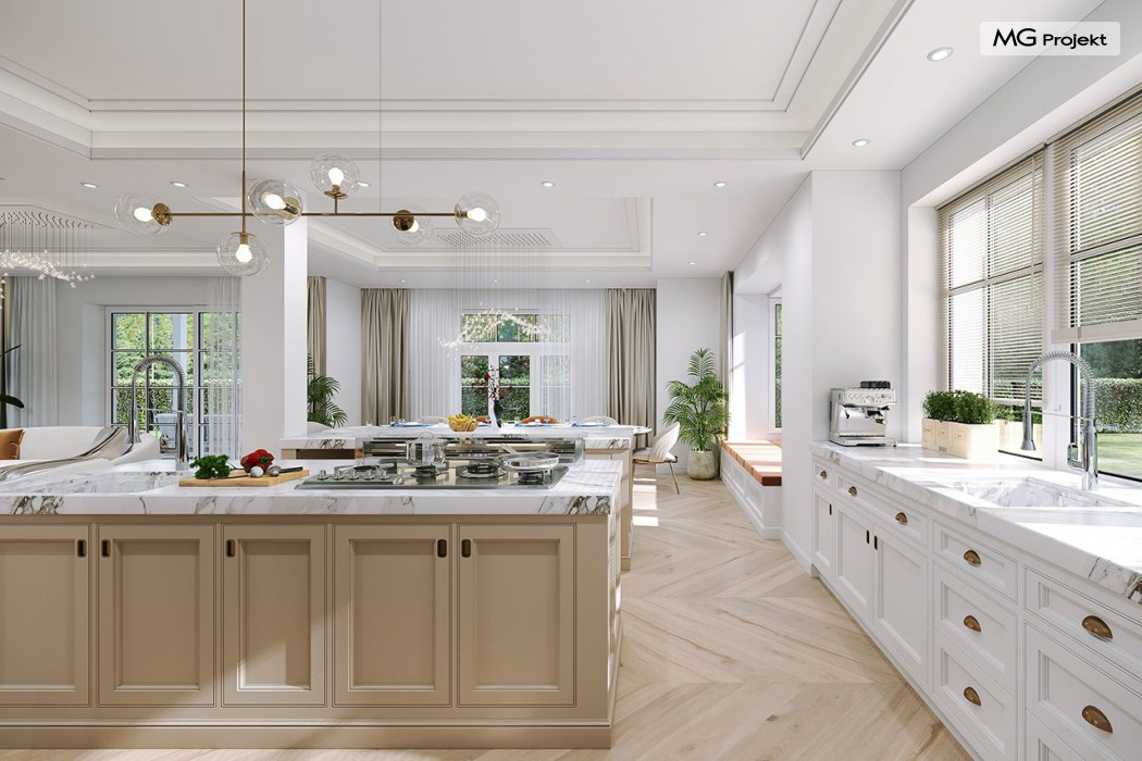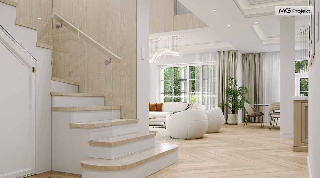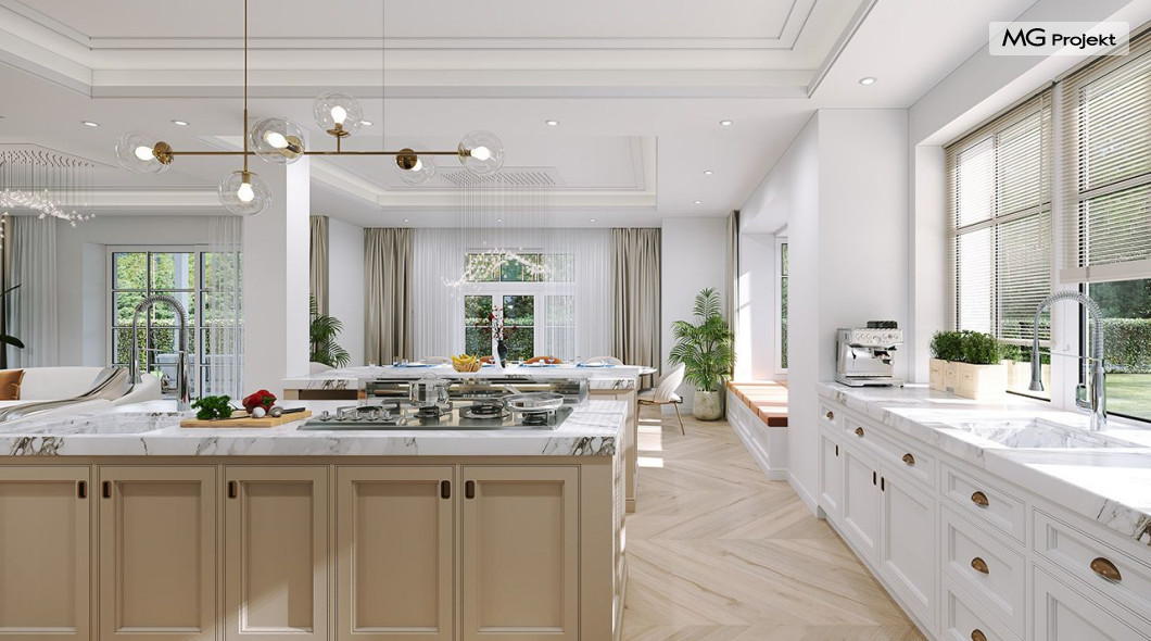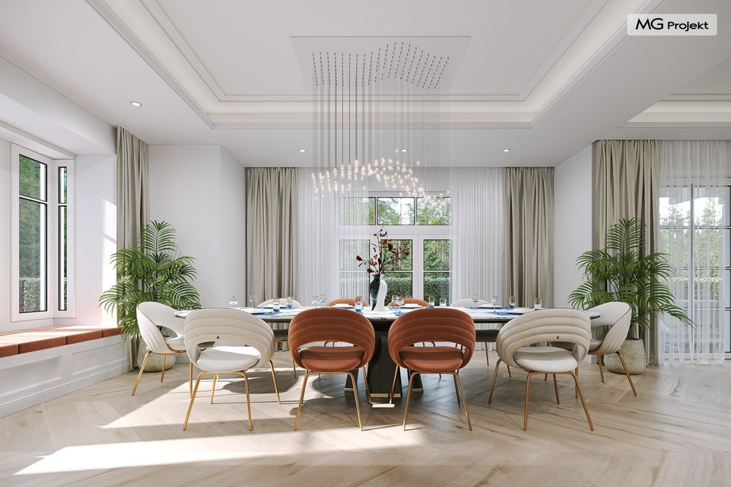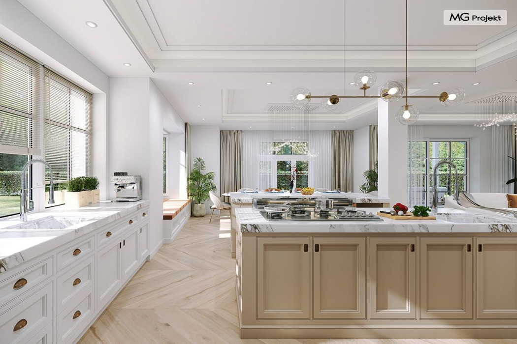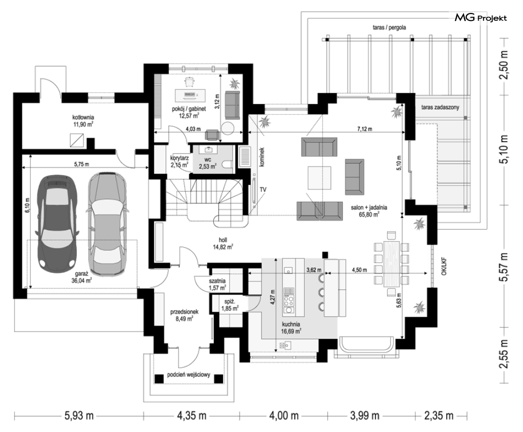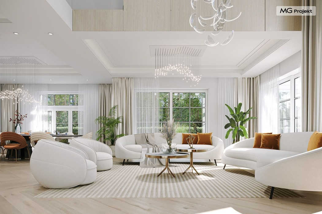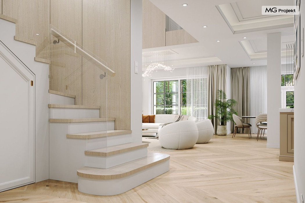 Projekt domu Willa Siedziba 3 to nowa odsłona cieszącego się uznaniem projektu Willa Siedziba. Nowy wariant to zmniejszony o 50 m2 dom, ze zwężoną o 5 metrów szerokością bryły, dzięki czemu budynek zmieści się na węższej 26-metrowej działce. Willa Siedziba 3 to reprezentacyjna miejska willa, nawiązująca swoją formą i stylistyką do wczesno dwudziestowiecznych rezydencji, jakie możemy spotkać do dziś w prestiżowych willowych dzielnicach większych miast. Dom ma powierzchnię użytkową wynoszącą ca 240 m2 i jest przeznaczony dla 4-6cioosobowej rodziny. Bryłę budynku zaprojektowano na prostokątnym planie i składa się z dwóch części - wyżej mieszkalnej, przykrytej czterospadowym dachem, oraz niższej bryły garażu. Dach budynku został osadzony na wysokości umożliwiającej interpretację tego budynku jako dom z poddaszem użytkowym. Główna bryła urozmaicona została czterema masywnymi lukarnami, skrywającymi w swojej szerokości pokoje górnej kondygnacji. Od strony elewacji fontowej willi mamy reprezentacyjne wejście z szerokimi drzwiami z naświetlami. Następnie dwa wykusze - kuchenny i jadalni - oba o innej formie, ale harmonizujące ze sobą. Dalej balkon z ozdobną balustradą, dostępny z holu-saloniku piętra, oraz wspomniane dwie lukarny pokoi piętra spinające całą kompozycję bryły. Trochę wycofany garaż nie narzuca się i pozwala znaleźć miejsce na swobodne parkowanie aut przed drzwiami garażowymi. Strona ogrodowa to jeszcze bardziej urozmaicona fasada. Mamy tutaj wystające lukarny pięter, między nimi dwupiętrowe okno salonu, balkon sypialni master, oraz przepiękną pergolę przykrywającą częściowo taras. Wnętrze domu na parterze to przede wszystkim duża przestrzeń dzienna połączonych pomieszczeń salonu, kuchni i jadalni, tworząca razem ponad 80-metrową powierzchnię. Dodatkowym urozmaiceniem jest tutaj otwarcie przestrzenne - pustka nad salonem, połączona z antresolą piętra, gdzie znajduje się hol-salonik. Do domu wchodzimy przez wygodny przedsionek z szatnią, do holu z reprezentacyjnymi schodami, a dalej do przestrzeni dziennej. Dodatkowe pomieszczenia na parterze to oczywiście duży garaż z pomieszczeniem technicznym, oraz oddzielony akustycznie gabinet. Na piętrze zaprojektowano 4 pokoje sypialne, w tym apartament master z oddzielną łazienką i garderobami. Willa Siedziba 3 została zaprojektowana jako dom energooszczędny, z dobrej jakości materiałów, z dobrą izolacją termiczną i z nowoczesnymi instalacjami. Budynek mimo skomplikowanej formy wykonano w tradycyjnej technologii, z rozwiązaniami spotykanymi na każdej budowie. Budowa budynku nie powinna być problematyczna dla fachowego wykonawcy. Willa Siedziba 3 to propozycja dla Inwestorów marzących o budowie prawdziwego pełnokrwistego domu o odpowiedniej skali, dającego przestrzeń do komfortowego życia, marzących o realizacji projektu nietuzinkowego o ponadczasowej stylistyce. Zapraszamy !