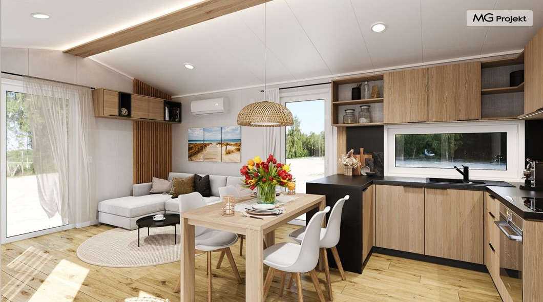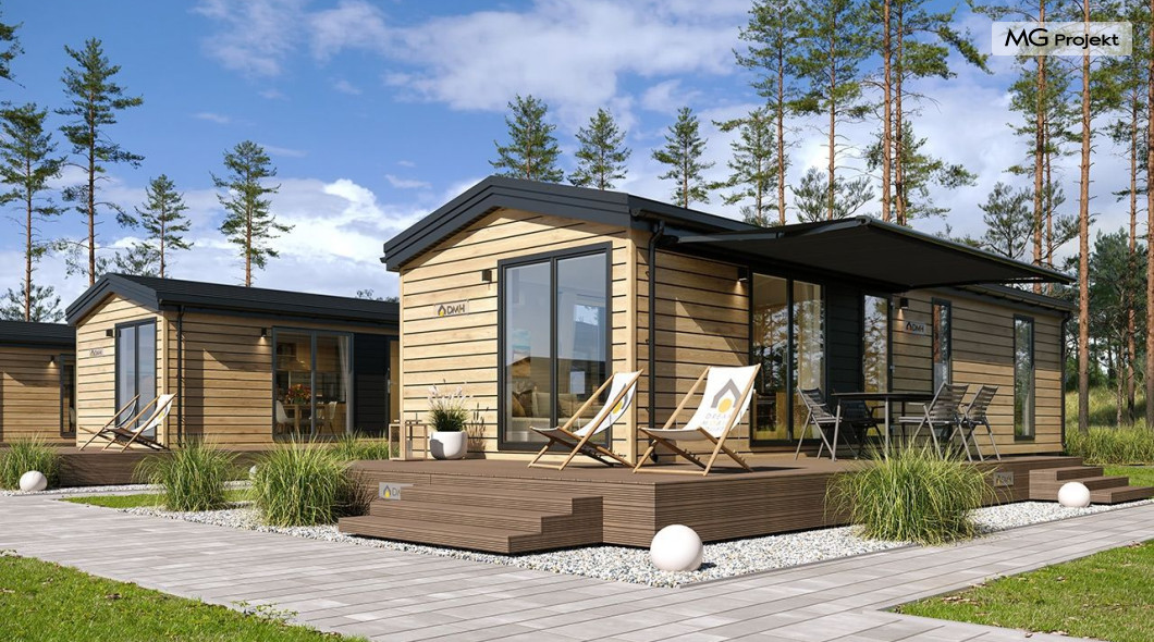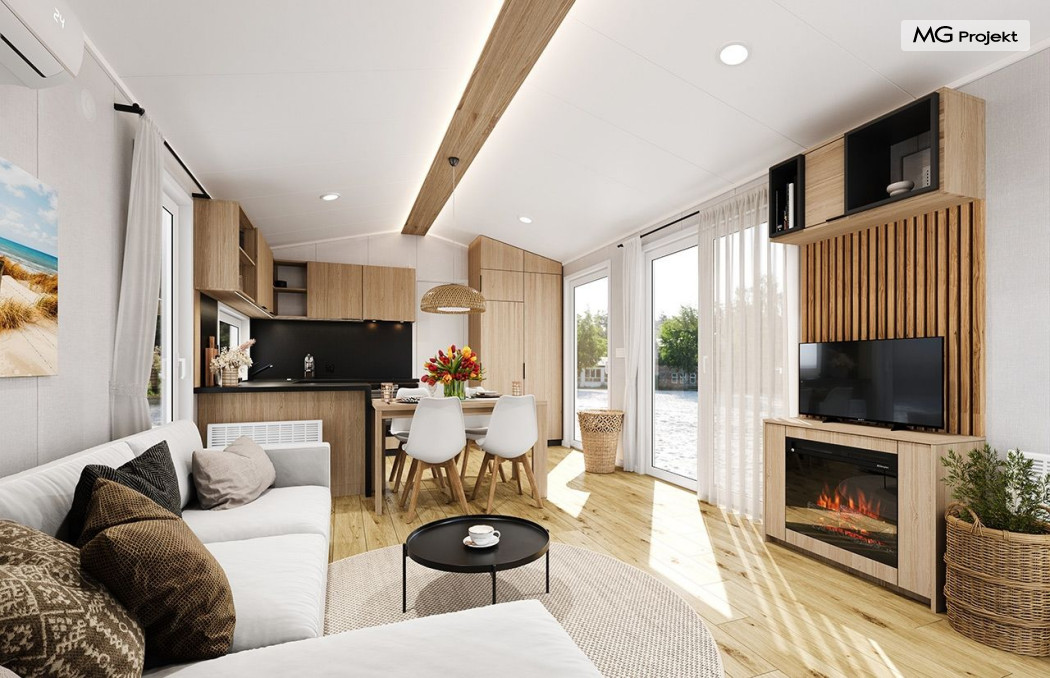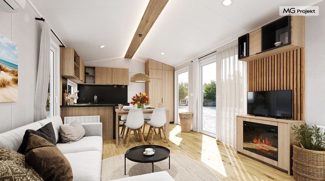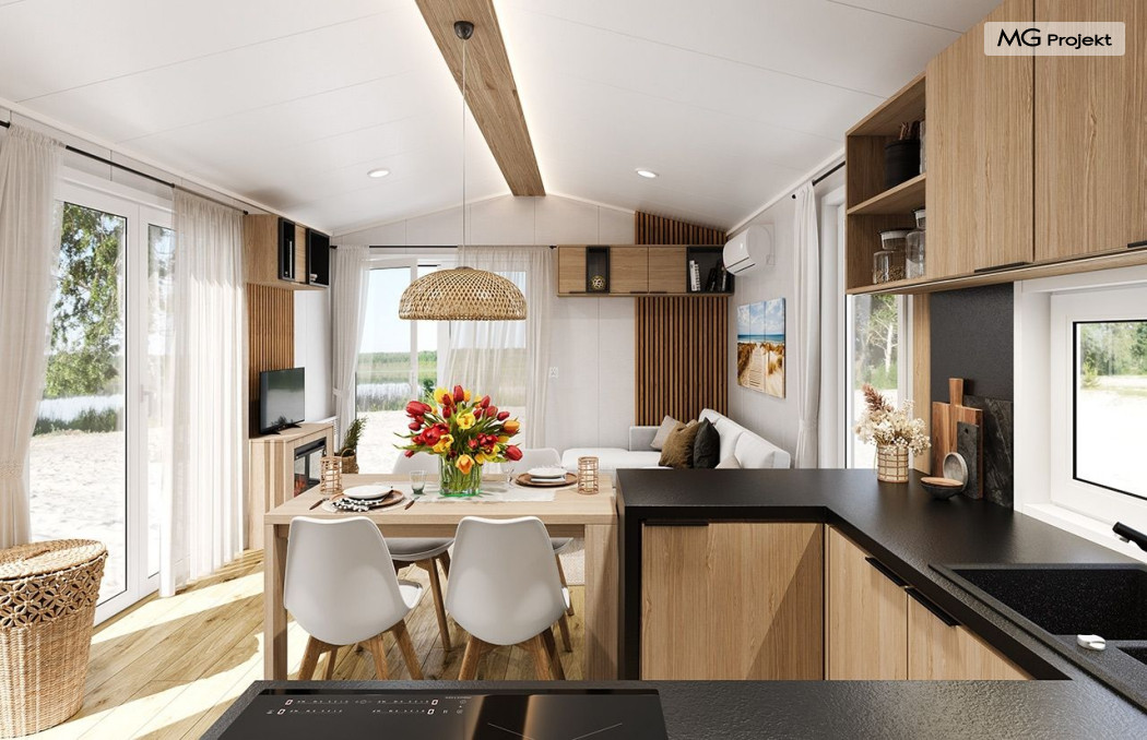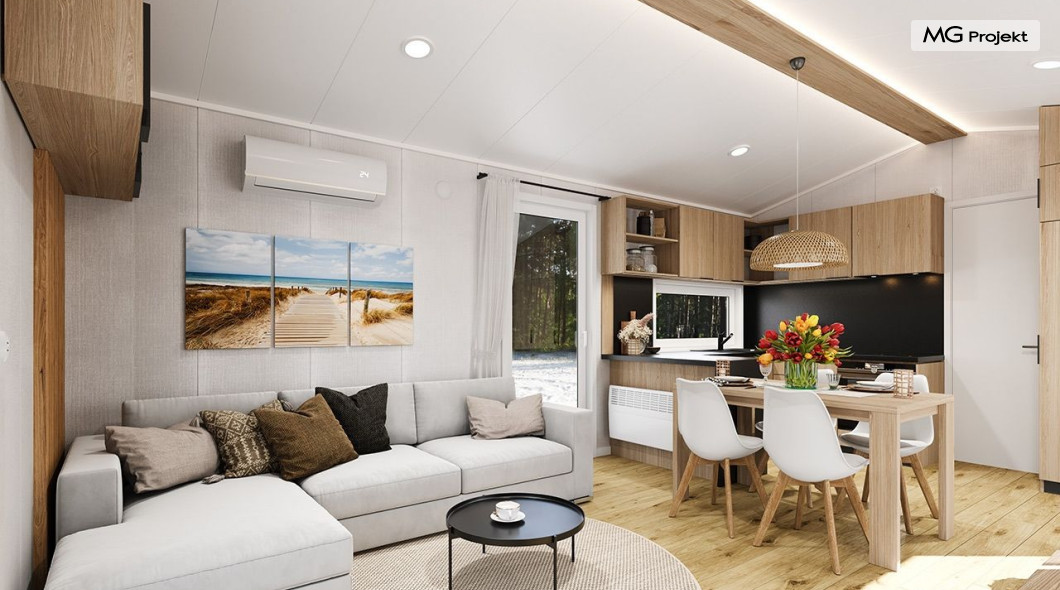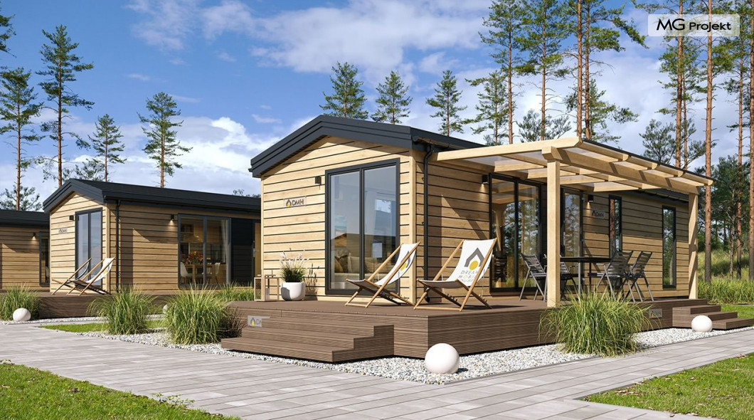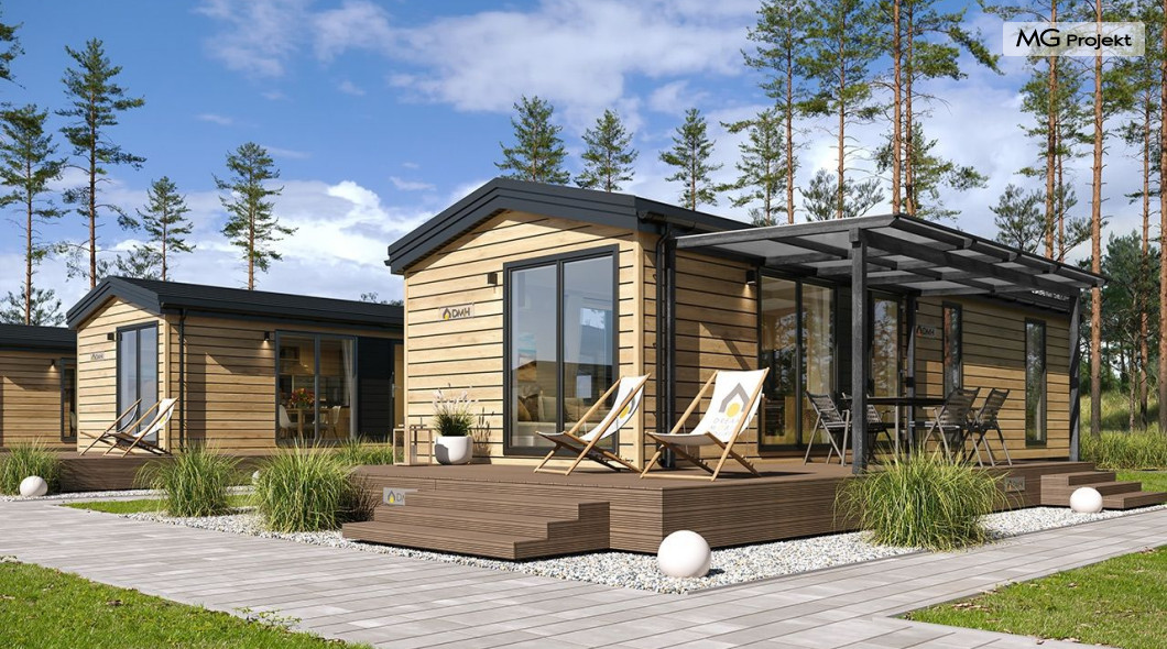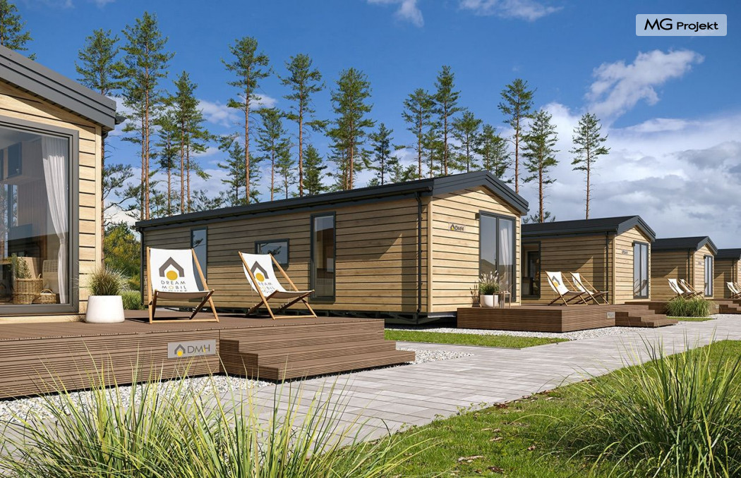 Dom mobilny A o wymiarach zewnętrznych: 12 x 4 m, oraz mniejszym 10,5 x 4 m, występuje w wielu wariantach funkcjonalnych wnętrza oraz wygląd zewnętrzny dostosowany do wymagań klienta