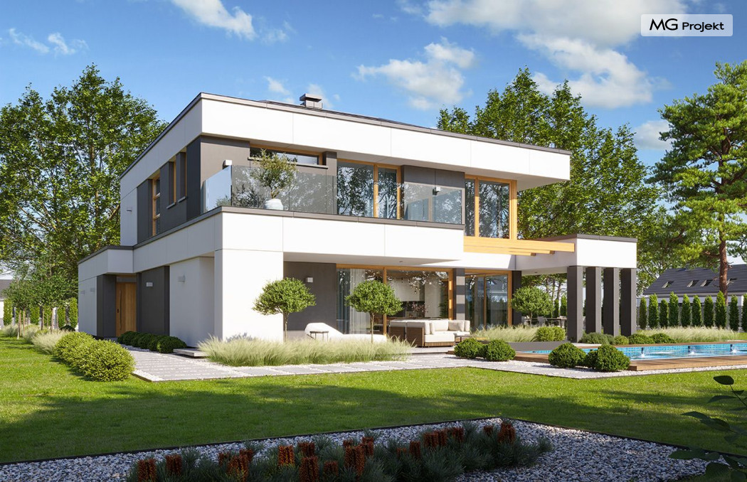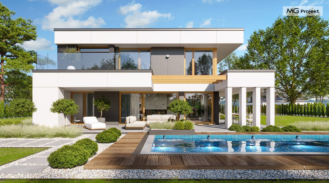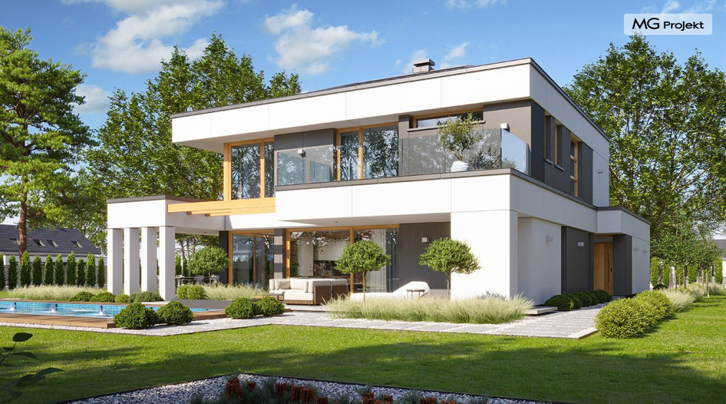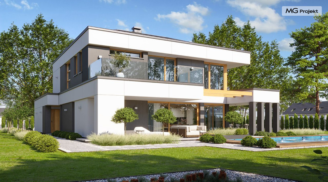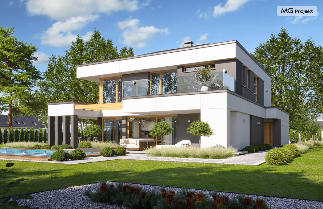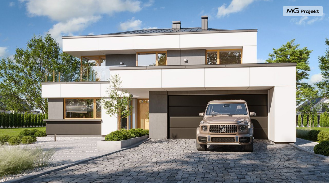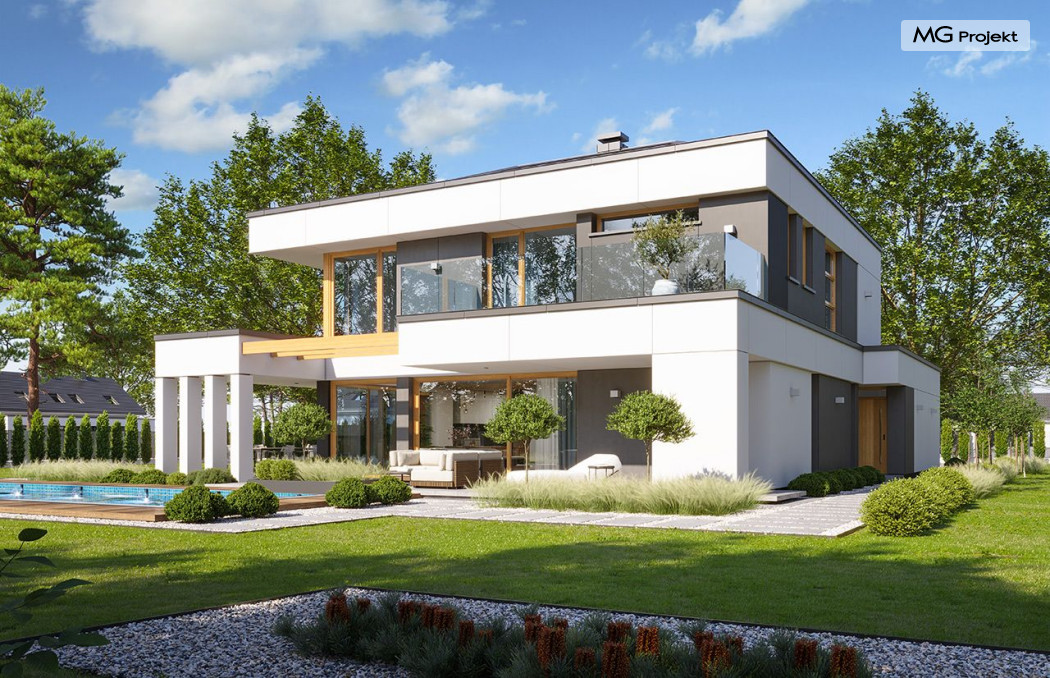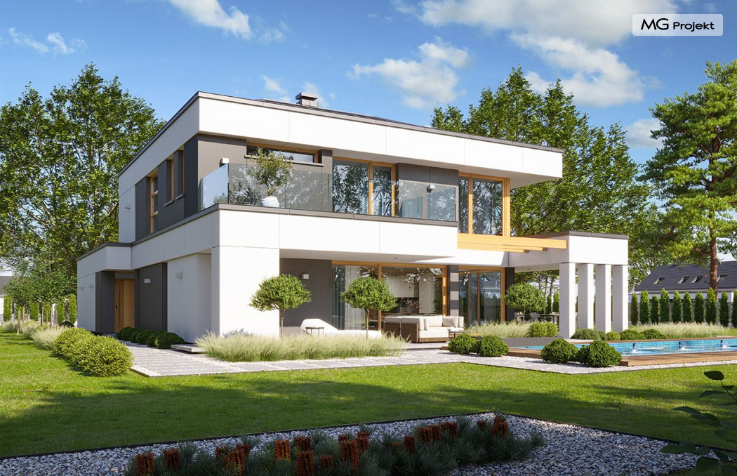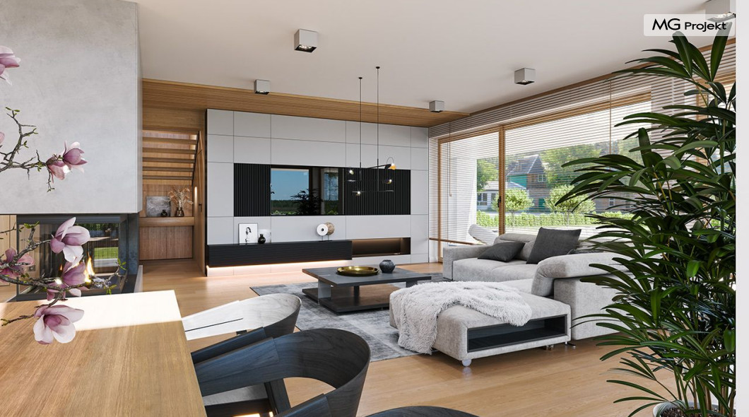 Projekt domu Willa Floryda 8 to kolejny projekt reprezentacyjnego domu piętrowego z serii „Willa Floryda”. Dom został zaprojektowany jako przestronna miejska willa, zbudowana na planie zbliżonym do kwadratu, z wystającą do przodu częścią garażową, dzięki czemu zmieści na węższej parceli - nawet o szerokości 21 metrów. Budynek łączy w sobie zwartą prostopadłościenną bryłę, komfortowe, reprezentacyjne wnętrze, oraz nowoczesną atrakcyjną architekturę z ciekawymi detalami. Willa Floryda 8 jest mniejszym budynkiem od podstawowych wariantów „Floryd”. Ma mniejszą powierzchnię, mniej rozciągnięty rzut, dzięki czemu budynek jest też mniej kosztowny. Układ funkcjonalny domu zbliżony jest do cieszącego się popularnością domu Willa Floryda 3, jednak zaproponowaliśmy tutaj zupełnie inną formę architektoniczną budynku. Podstawowy język detali został zachowany, jak podział fasad na poziome pasy, duże ilości przeszkleń, balkony i tarasy piętra, czy zwieńczenie budynku czterospadowym dachem z szerokim gzymsowaniem. Dodatkowo wprowadziliśmy kolejne architektoniczne smaczki. Przede wszystkim od strony ogrodu dodane zostały piękne zadaszenia części salonu, z przerwą tworzącą półzamknięte wewnętrzne patio, dające mieszkańcom przytulność i intymność. Przedłużenie sufitów parteru w podcieniach okalających tarasy, oraz szerokie przeszklenia między częścią dzienną, a tarasem wywołują efekt zatarcia granicy między wnętrzem domu a przestrzenią na zewnątrz. Wnętrze domu zaaranżowano łącząc poszczególne fragmenty przestrzeni dziennej ze sobą w taki sposób, aby pomieszczenia były duże, a równocześnie przytulne i odpowiednio wyskalowane. Pod względem układu funkcjonalnego wnętrza, dom podzielono na cześć dzienną i techniczno-garażową na parterze, oraz cześć z sypialniami na piętrze. Do budynku wchodzimy szerokim wejściem, z drzwiami z bocznym naświetlem, do wygodnego przedsionka z szatnią. Następnie przechodzimy do otwartego holu, oddzielonego od salonu dwustronnym ozdobnym kominkiem będącym centralnym akcentem całej przestrzeni dziennej. Na część dzienną składają się pomieszczenia salonu – z szeroką ścianą tv i dużym oknem, jadalnia z pustką sufitu i antresolą, oraz obszerna kuchnia z wyspą i spiżarnią. Dodatkowe pomieszczenia parteru to pokój-gabinet, łazienka, oraz garaż z kotłownią. Na piętrze znalazły się 4 sypialnie, w tym apartament master łazienką,garderobą i tarasem, oraz dwie dodatkowe łazienki. Wnętrze można oczywiście dowolnie modelować dostosowując do potrzeb konkretnej rodziny. Budynek zaprojektowano jako energooszczędny, z dobrymi izolacjami i nowoczesnymi instalacjami. Dom łączy w sobie nowoczesny wygląd z prostą konstrukcją i zwartą bryłą, dzięki czemu nie będzie trudny w budowie i powinien być niedrogi w późniejszej eksploatacji. Willa Floryda 8 to propozycja dla Inwestorów planujących budowę wyjątkowego domu dla siebie - wygodnej reprezentacyjnej willi o nowoczesnym stylu. Budynek będzie atrakcyjną oprawą i scenografią codziennego życia, podkreślającą dobry gust jego użytkowników. Dom stawiając Inwestorom wysoko poprzeczkę podczas budowy, odwdzięczy się ciesząc oko i karmiąc codziennie zmysły właścicieli, przyciągając jednocześnie spojrzenia sąsiadów i przechodniów. Willa Floryda 8 do dom dla Inwestorów chcących wyrazić siebie i zaznaczyć swoje przywiązanie do dobrego smaku i jakościowej architektury. Zapraszamy !