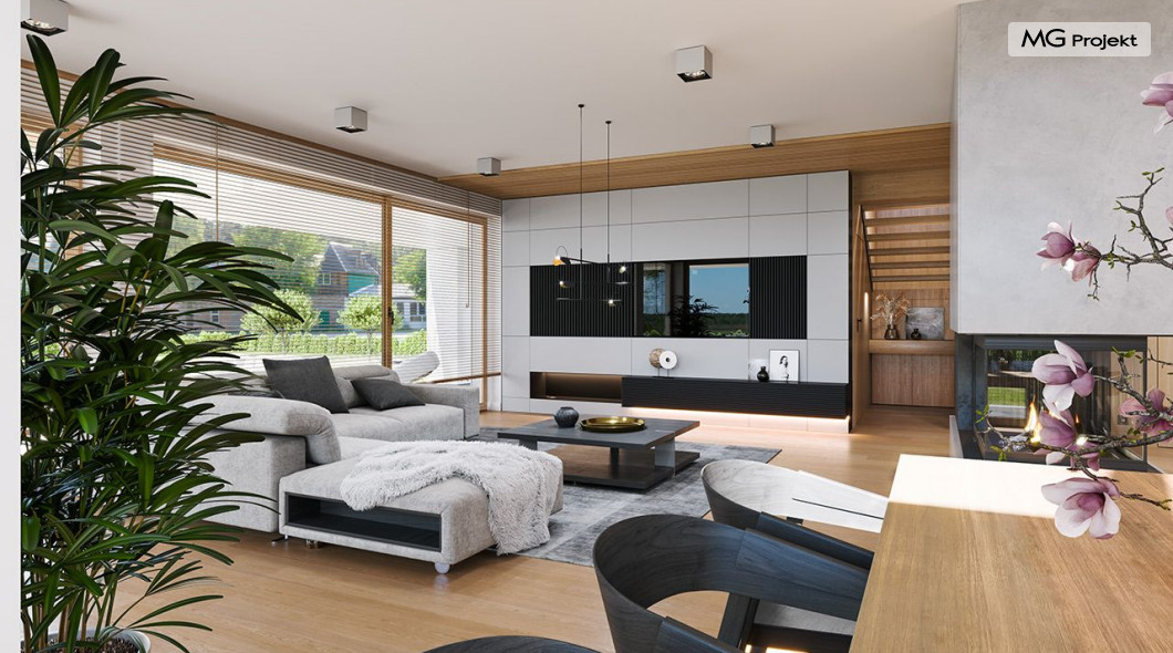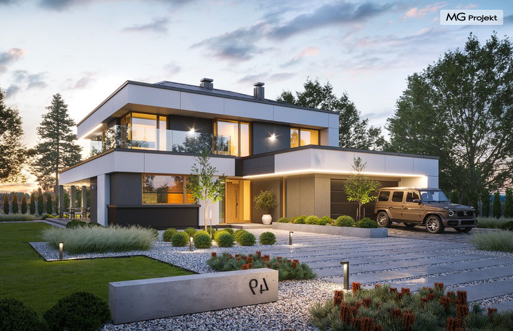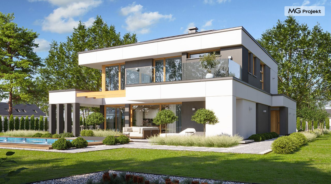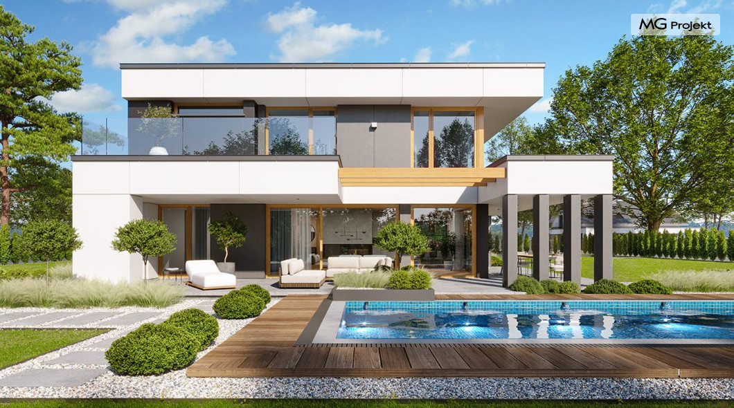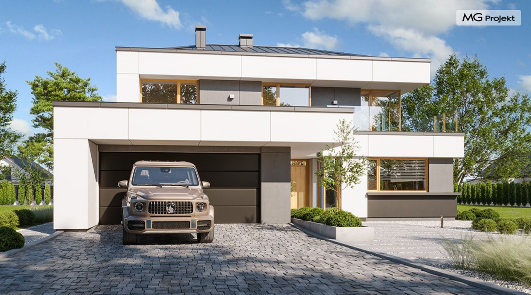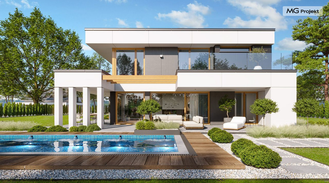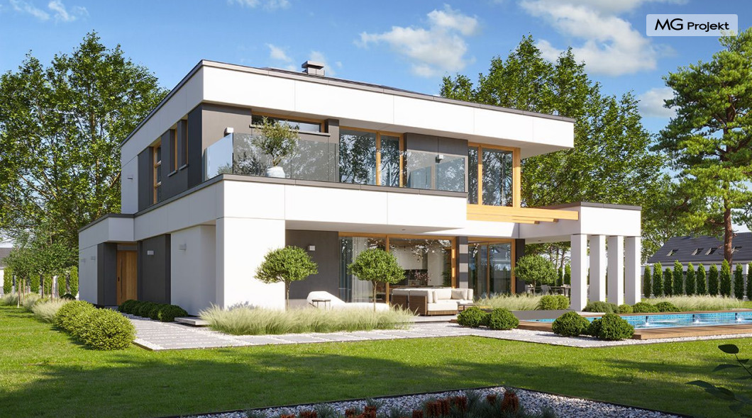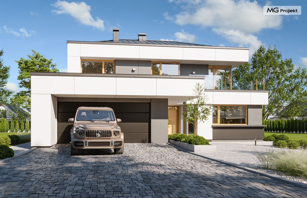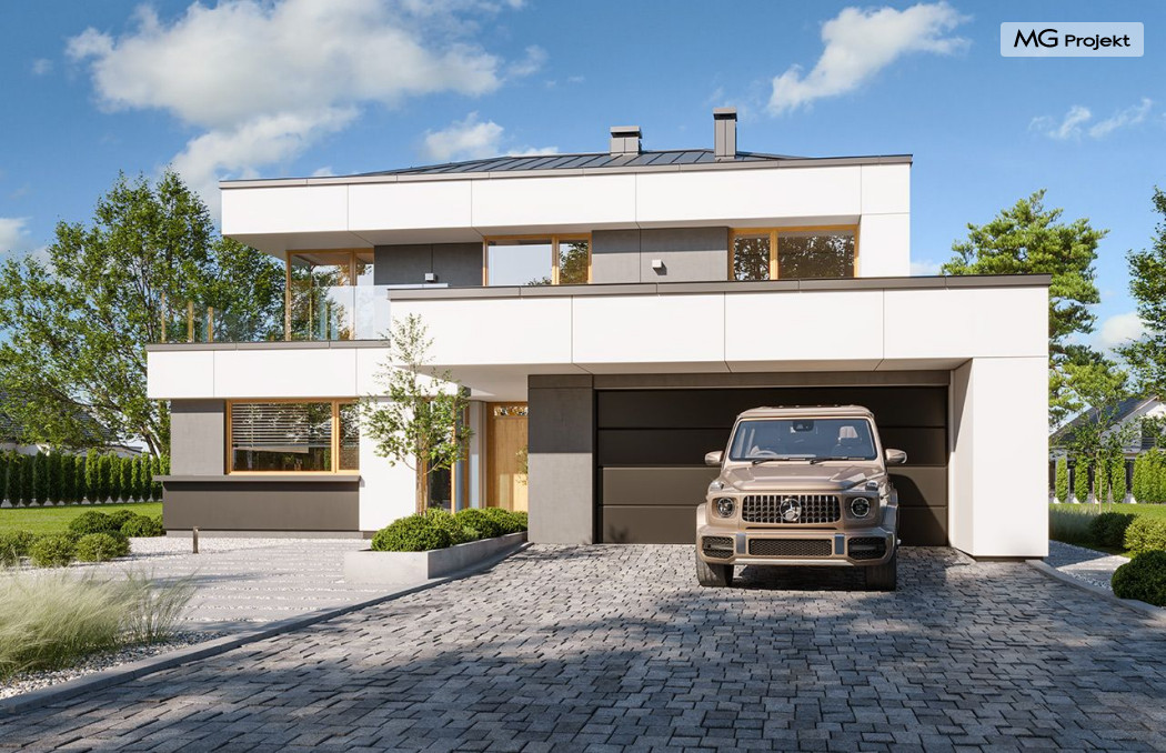Projekt domu Willa Floryda 8 to kolejny projekt reprezentacyjnego domu piętrowego z serii „Willa Floryda”. Dom został zaprojektowany jako przestronna miejska willa, zbudowana na planie zbliżonym do kwadratu, z wystającą do przodu częścią garażową, dzięki czemu zmieści na węższej parceli - nawet o szerokości 21 metrów. Budynek łączy w sobie zwartą prostopadłościenną bryłę, komfortowe, reprezentacyjne wnętrze, oraz nowoczesną atrakcyjną architekturę z ciekawymi detalami. Willa Floryda 8 jest mniejszym budynkiem od podstawowych wariantów „Floryd”. Ma mniejszą powierzchnię, mniej rozciągnięty rzut, dzięki czemu budynek jest też mniej kosztowny. Układ funkcjonalny domu zbliżony jest do cieszącego się popularnością domu Willa Floryda 3, jednak zaproponowaliśmy tutaj zupełnie inną formę architektoniczną budynku. Podstawowy język detali został zachowany, jak podział fasad na poziome pasy, duże ilości przeszkleń, balkony i tarasy piętra, czy zwieńczenie budynku czterospadowym dachem z szerokim gzymsowaniem. Dodatkowo wprowadziliśmy kolejne architektoniczne smaczki. Przede wszystkim od strony ogrodu dodane zostały piękne zadaszenia części salonu, z przerwą tworzącą półzamknięte wewnętrzne patio, dające mieszkańcom przytulność i intymność. Przedłużenie sufitów parteru w podcieniach okalających tarasy, oraz szerokie przeszklenia między częścią dzienną, a tarasem wywołują efekt zatarcia granicy między wnętrzem domu a przestrzenią na zewnątrz. Wnętrze domu zaaranżowano łącząc poszczególne fragmenty przestrzeni dziennej ze sobą w taki sposób, aby pomieszczenia były duże, a równocześnie przytulne i odpowiednio wyskalowane. Pod względem układu funkcjonalnego wnętrza, dom podzielono na cześć dzienną i techniczno-garażową na parterze, oraz cześć z sypialniami na piętrze. Do budynku wchodzimy szerokim wejściem, z drzwiami z bocznym naświetlem, do wygodnego przedsionka z szatnią. Następnie przechodzimy do otwartego holu, oddzielonego od salonu dwustronnym ozdobnym kominkiem będącym centralnym akcentem całej przestrzeni dziennej. Na część dzienną składają się pomieszczenia salonu – z szeroką ścianą tv i dużym oknem, jadalnia z pustką sufitu i antresolą, oraz obszerna kuchnia z wyspą i spiżarnią. Dodatkowe pomieszczenia parteru to pokój-gabinet, łazienka, oraz garaż z kotłownią. Na piętrze znalazły się 4 sypialnie, w tym apartament master łazienką,garderobą i tarasem, oraz dwie dodatkowe łazienki. Wnętrze można oczywiście dowolnie modelować dostosowując do potrzeb konkretnej rodziny. Budynek zaprojektowano jako energooszczędny, z dobrymi izolacjami i nowoczesnymi instalacjami. Dom łączy w sobie nowoczesny wygląd z prostą konstrukcją i zwartą bryłą, dzięki czemu nie będzie trudny w budowie i powinien być niedrogi w późniejszej eksploatacji. Willa Floryda 8 to propozycja dla Inwestorów planujących budowę wyjątkowego domu dla siebie - wygodnej reprezentacyjnej willi o nowoczesnym stylu. Budynek będzie atrakcyjną oprawą i scenografią codziennego życia, podkreślającą dobry gust jego użytkowników. Dom stawiając Inwestorom wysoko poprzeczkę podczas budowy, odwdzięczy się ciesząc oko i karmiąc codziennie zmysły właścicieli, przyciągając jednocześnie spojrzenia sąsiadów i przechodniów. Willa Floryda 8 do dom dla Inwestorów chcących wyrazić siebie i zaznaczyć swoje przywiązanie do dobrego smaku i jakościowej architektury. Zapraszamy !