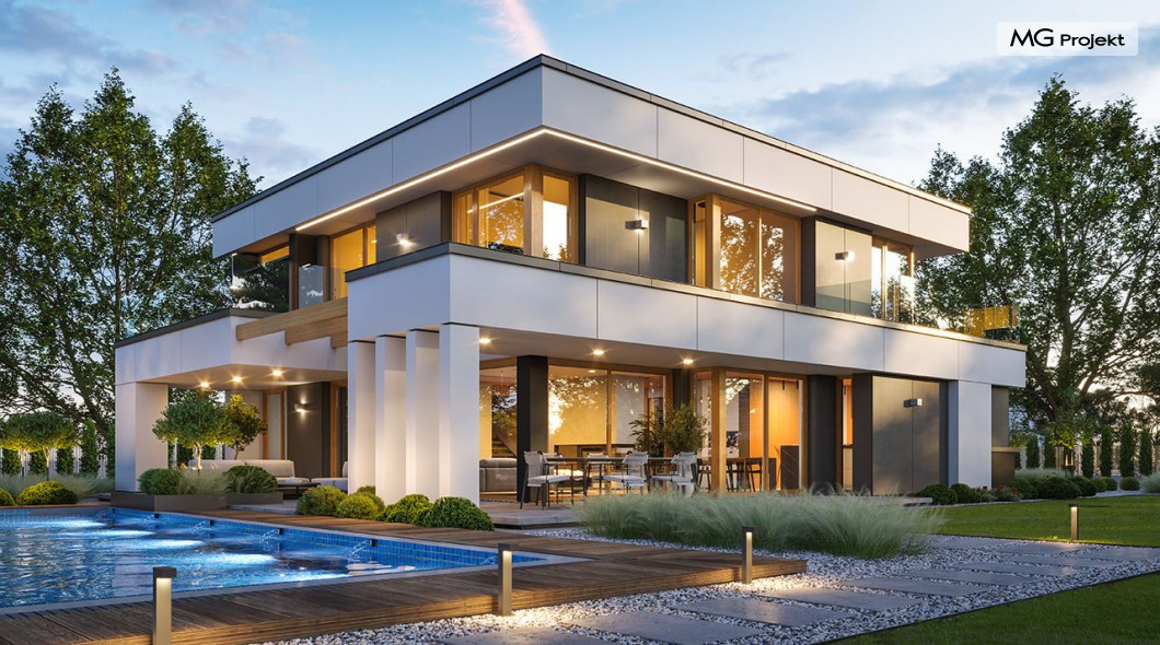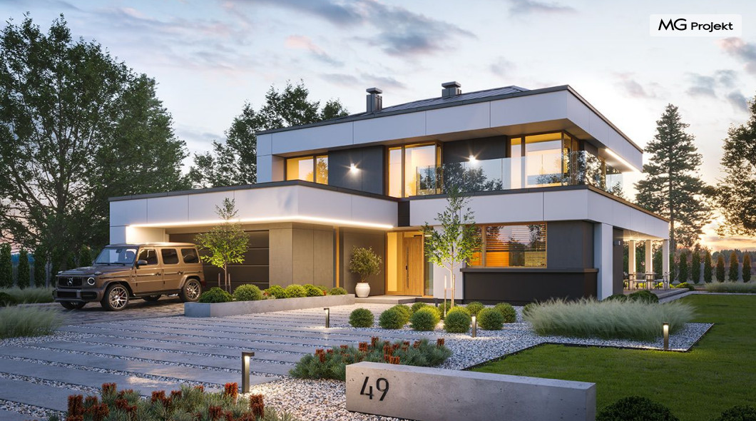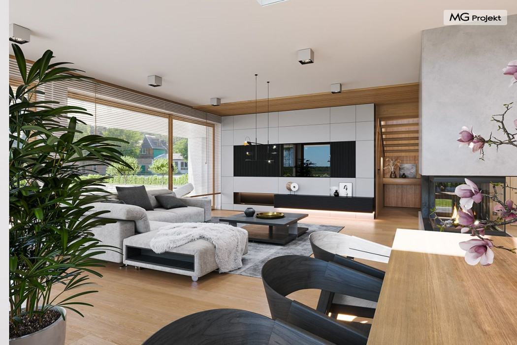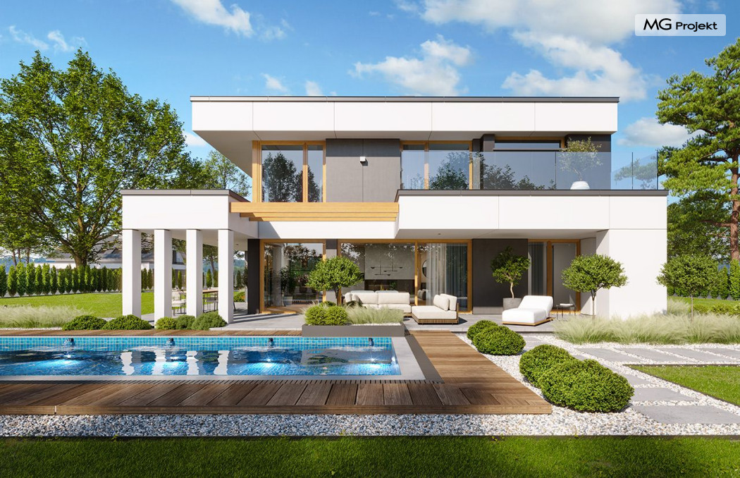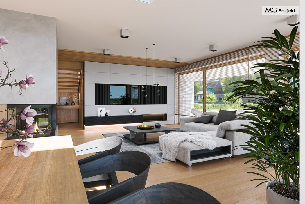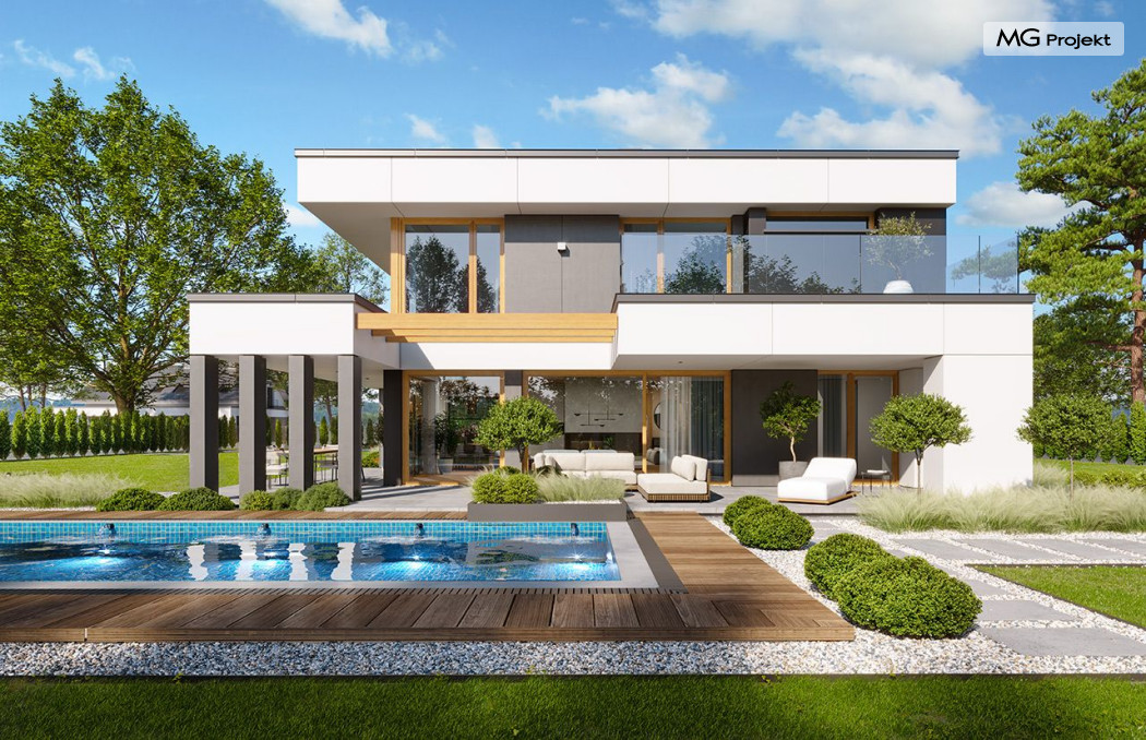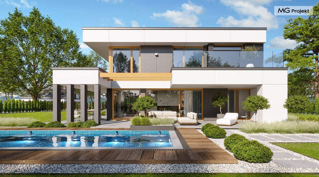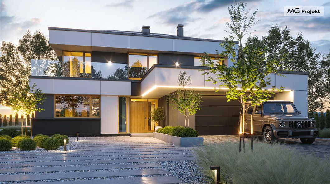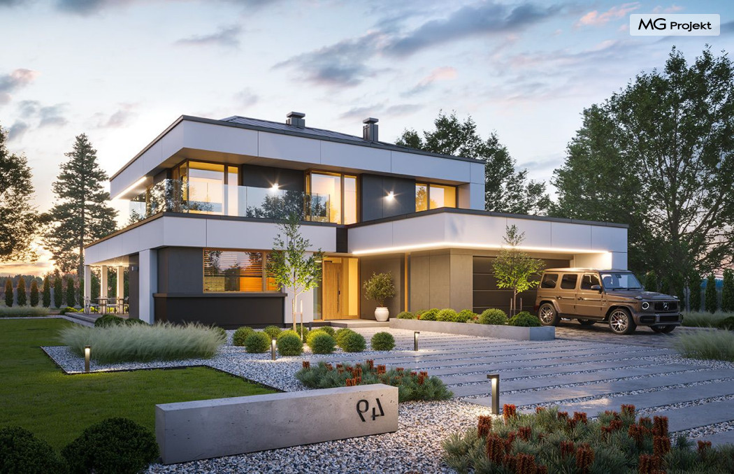 Projekt domu Willa Floryda 8 to kolejny projekt reprezentacyjnego domu piętrowego z serii „Willa Floryda”. Dom został zaprojektowany jako przestronna miejska willa, zbudowana na planie zbliżonym do kwadratu, z wystającą do przodu częścią garażową, dzięki czemu zmieści na węższej parceli - nawet o szerokości 21 metrów. Budynek łączy w sobie zwartą prostopadłościenną bryłę, komfortowe, reprezentacyjne wnętrze, oraz nowoczesną atrakcyjną architekturę z ciekawymi detalami. Willa Floryda 8 jest mniejszym budynkiem od podstawowych wariantów „Floryd”. Ma mniejszą powierzchnię, mniej rozciągnięty rzut, dzięki czemu budynek jest też mniej kosztowny. Układ funkcjonalny domu zbliżony jest do cieszącego się popularnością domu Willa Floryda 3, jednak zaproponowaliśmy tutaj zupełnie inną formę architektoniczną budynku. Podstawowy język detali został zachowany, jak podział fasad na poziome pasy, duże ilości przeszkleń, balkony i tarasy piętra, czy zwieńczenie budynku czterospadowym dachem z szerokim gzymsowaniem. Dodatkowo wprowadziliśmy kolejne architektoniczne smaczki. Przede wszystkim od strony ogrodu dodane zostały piękne zadaszenia części salonu, z przerwą tworzącą półzamknięte wewnętrzne patio, dające mieszkańcom przytulność i intymność. Przedłużenie sufitów parteru w podcieniach okalających tarasy, oraz szerokie przeszklenia między częścią dzienną, a tarasem wywołują efekt zatarcia granicy między wnętrzem domu a przestrzenią na zewnątrz. Wnętrze domu zaaranżowano łącząc poszczególne fragmenty przestrzeni dziennej ze sobą w taki sposób, aby pomieszczenia były duże, a równocześnie przytulne i odpowiednio wyskalowane. Pod względem układu funkcjonalnego wnętrza, dom podzielono na cześć dzienną i techniczno-garażową na parterze, oraz cześć z sypialniami na piętrze. Do budynku wchodzimy szerokim wejściem, z drzwiami z bocznym naświetlem, do wygodnego przedsionka z szatnią. Następnie przechodzimy do otwartego holu, oddzielonego od salonu dwustronnym ozdobnym kominkiem będącym centralnym akcentem całej przestrzeni dziennej. Na część dzienną składają się pomieszczenia salonu – z szeroką ścianą tv i dużym oknem, jadalnia z pustką sufitu i antresolą, oraz obszerna kuchnia z wyspą i spiżarnią. Dodatkowe pomieszczenia parteru to pokój-gabinet, łazienka, oraz garaż z kotłownią. Na piętrze znalazły się 4 sypialnie, w tym apartament master łazienką,garderobą i tarasem, oraz dwie dodatkowe łazienki. Wnętrze można oczywiście dowolnie modelować dostosowując do potrzeb konkretnej rodziny. Budynek zaprojektowano jako energooszczędny, z dobrymi izolacjami i nowoczesnymi instalacjami. Dom łączy w sobie nowoczesny wygląd z prostą konstrukcją i zwartą bryłą, dzięki czemu nie będzie trudny w budowie i powinien być niedrogi w późniejszej eksploatacji. Willa Floryda 8 to propozycja dla Inwestorów planujących budowę wyjątkowego domu dla siebie - wygodnej reprezentacyjnej willi o nowoczesnym stylu. Budynek będzie atrakcyjną oprawą i scenografią codziennego życia, podkreślającą dobry gust jego użytkowników. Dom stawiając Inwestorom wysoko poprzeczkę podczas budowy, odwdzięczy się ciesząc oko i karmiąc codziennie zmysły właścicieli, przyciągając jednocześnie spojrzenia sąsiadów i przechodniów. Willa Floryda 8 do dom dla Inwestorów chcących wyrazić siebie i zaznaczyć swoje przywiązanie do dobrego smaku i jakościowej architektury. Zapraszamy !