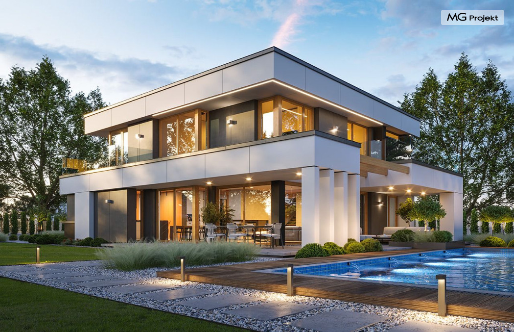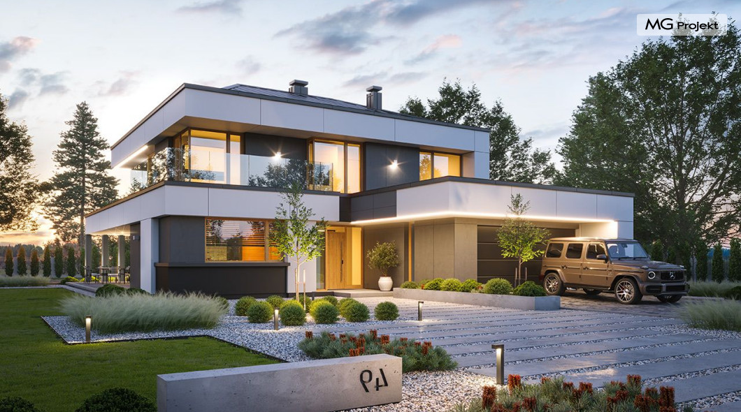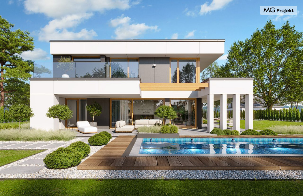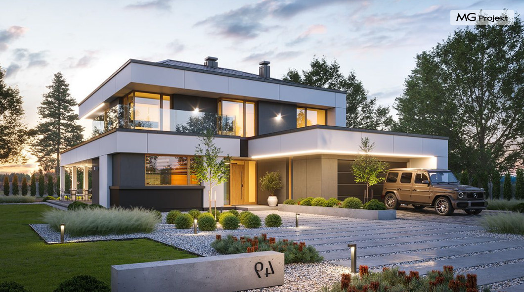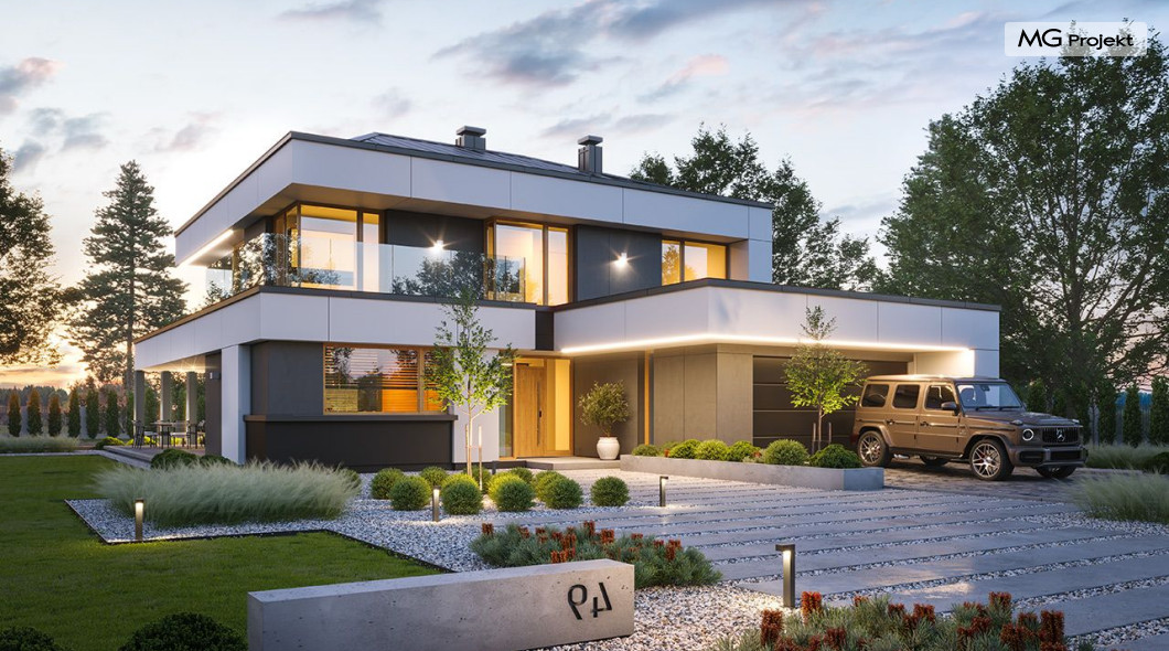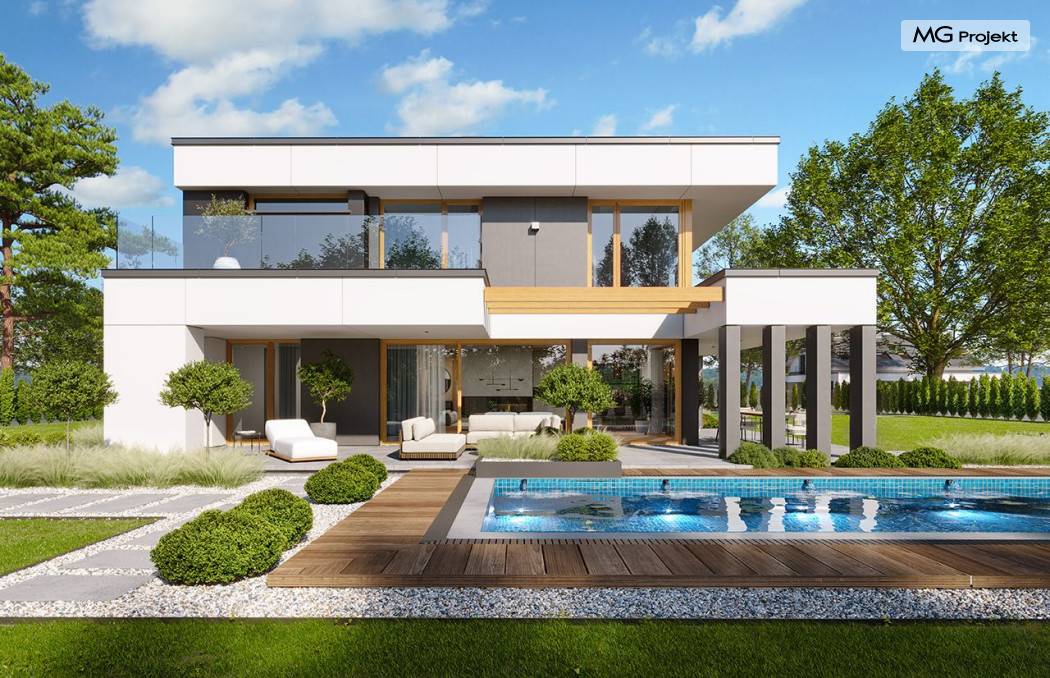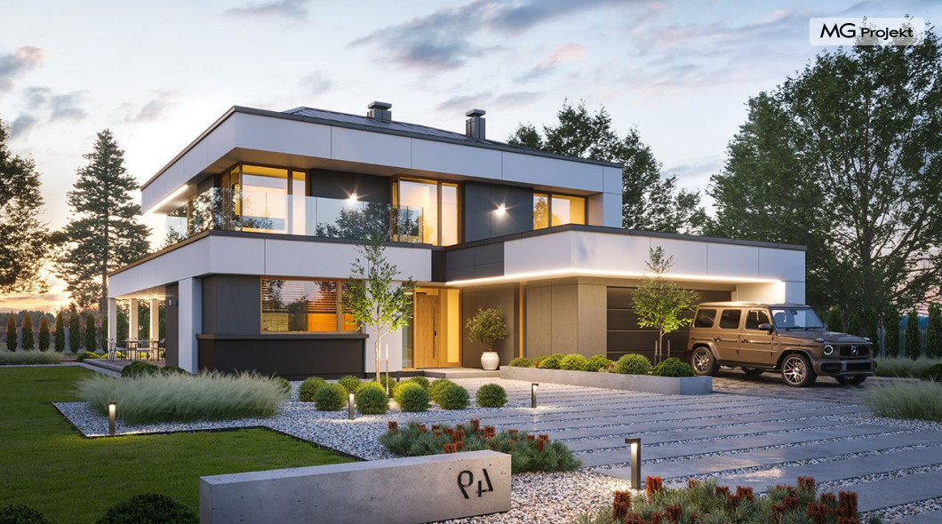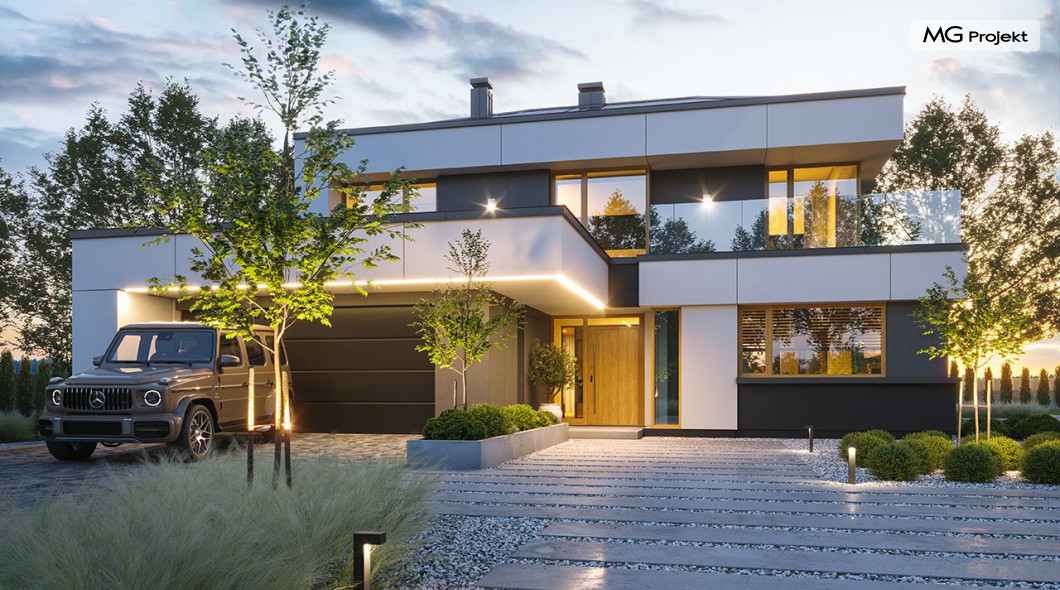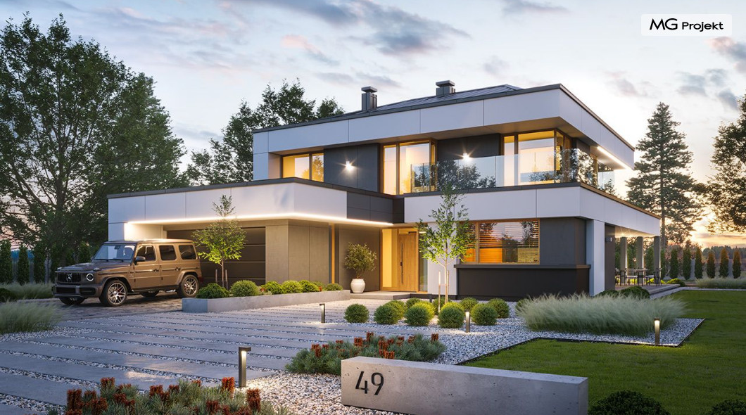 Projekt domu Willa Floryda 8 to kolejny projekt reprezentacyjnego domu piętrowego z serii „Willa Floryda”. Dom został zaprojektowany jako przestronna miejska willa, zbudowana na planie zbliżonym do kwadratu, z wystającą do przodu częścią garażową, dzięki czemu zmieści na węższej parceli - nawet o szerokości 21 metrów. Budynek łączy w sobie zwartą prostopadłościenną bryłę, komfortowe, reprezentacyjne wnętrze, oraz nowoczesną atrakcyjną architekturę z ciekawymi detalami. Willa Floryda 8 jest mniejszym budynkiem od podstawowych wariantów „Floryd”. Ma mniejszą powierzchnię, mniej rozciągnięty rzut, dzięki czemu budynek jest też mniej kosztowny. Układ funkcjonalny domu zbliżony jest do cieszącego się popularnością domu Willa Floryda 3, jednak zaproponowaliśmy tutaj zupełnie inną formę architektoniczną budynku. Podstawowy język detali został zachowany, jak podział fasad na poziome pasy, duże ilości przeszkleń, balkony i tarasy piętra, czy zwieńczenie budynku czterospadowym dachem z szerokim gzymsowaniem. Dodatkowo wprowadziliśmy kolejne architektoniczne smaczki. Przede wszystkim od strony ogrodu dodane zostały piękne zadaszenia części salonu, z przerwą tworzącą półzamknięte wewnętrzne patio, dające mieszkańcom przytulność i intymność. Przedłużenie sufitów parteru w podcieniach okalających tarasy, oraz szerokie przeszklenia między częścią dzienną, a tarasem wywołują efekt zatarcia granicy między wnętrzem domu a przestrzenią na zewnątrz. Wnętrze domu zaaranżowano łącząc poszczególne fragmenty przestrzeni dziennej ze sobą w taki sposób, aby pomieszczenia były duże, a równocześnie przytulne i odpowiednio wyskalowane. Pod względem układu funkcjonalnego wnętrza, dom podzielono na cześć dzienną i techniczno-garażową na parterze, oraz cześć z sypialniami na piętrze. Do budynku wchodzimy szerokim wejściem, z drzwiami z bocznym naświetlem, do wygodnego przedsionka z szatnią. Następnie przechodzimy do otwartego holu, oddzielonego od salonu dwustronnym ozdobnym kominkiem będącym centralnym akcentem całej przestrzeni dziennej. Na część dzienną składają się pomieszczenia salonu – z szeroką ścianą tv i dużym oknem, jadalnia z pustką sufitu i antresolą, oraz obszerna kuchnia z wyspą i spiżarnią. Dodatkowe pomieszczenia parteru to pokój-gabinet, łazienka, oraz garaż z kotłownią. Na piętrze znalazły się 4 sypialnie, w tym apartament master łazienką,garderobą i tarasem, oraz dwie dodatkowe łazienki. Wnętrze można oczywiście dowolnie modelować dostosowując do potrzeb konkretnej rodziny. Budynek zaprojektowano jako energooszczędny, z dobrymi izolacjami i nowoczesnymi instalacjami. Dom łączy w sobie nowoczesny wygląd z prostą konstrukcją i zwartą bryłą, dzięki czemu nie będzie trudny w budowie i powinien być niedrogi w późniejszej eksploatacji. Willa Floryda 8 to propozycja dla Inwestorów planujących budowę wyjątkowego domu dla siebie - wygodnej reprezentacyjnej willi o nowoczesnym stylu. Budynek będzie atrakcyjną oprawą i scenografią codziennego życia, podkreślającą dobry gust jego użytkowników. Dom stawiając Inwestorom wysoko poprzeczkę podczas budowy, odwdzięczy się ciesząc oko i karmiąc codziennie zmysły właścicieli, przyciągając jednocześnie spojrzenia sąsiadów i przechodniów. Willa Floryda 8 do dom dla Inwestorów chcących wyrazić siebie i zaznaczyć swoje przywiązanie do dobrego smaku i jakościowej architektury. Zapraszamy !