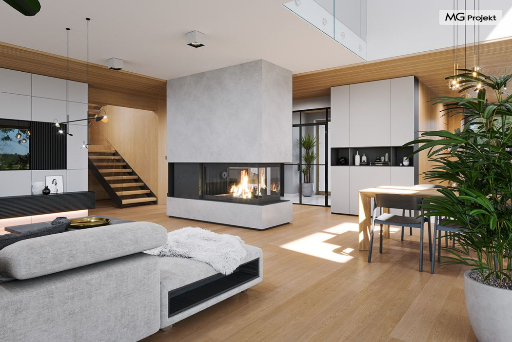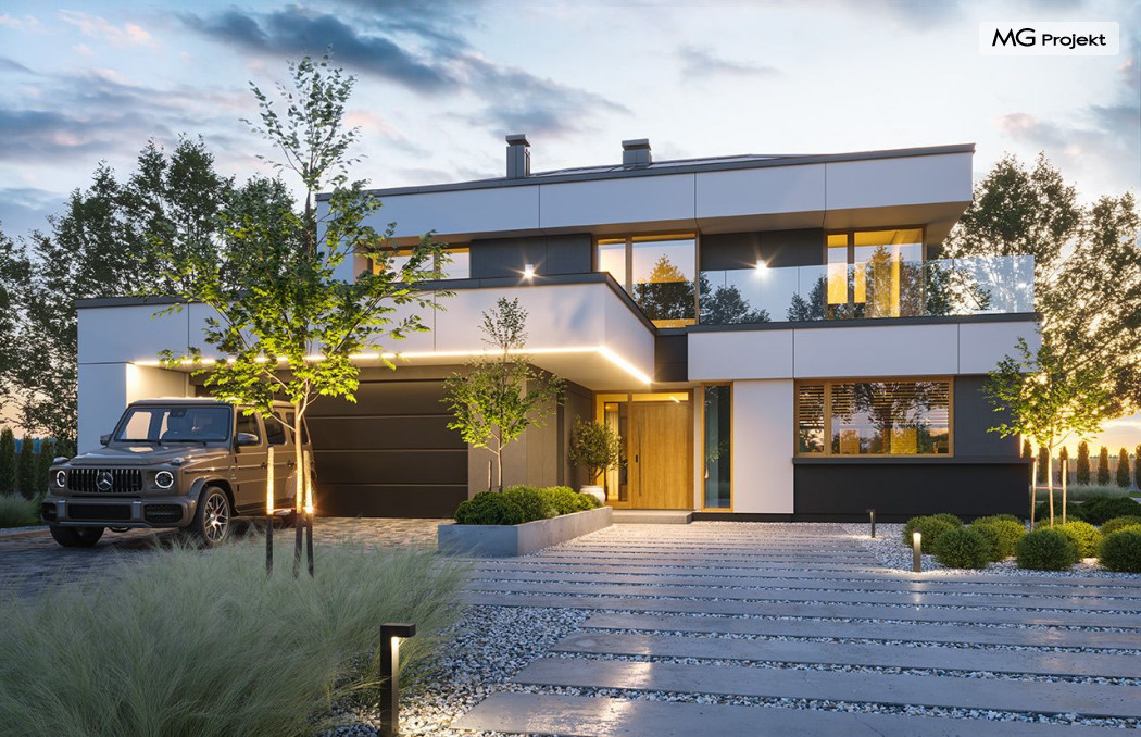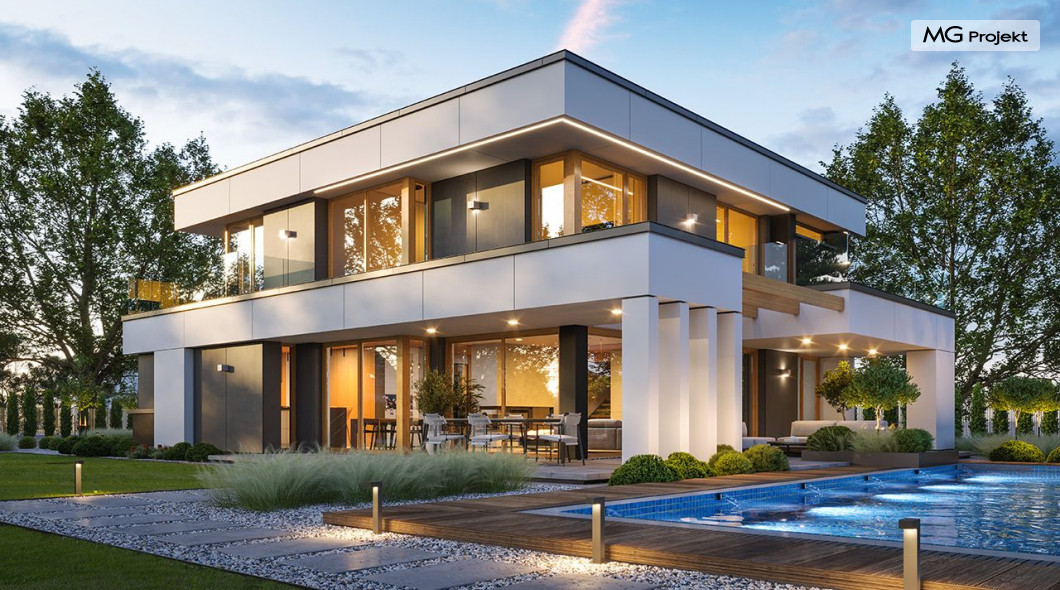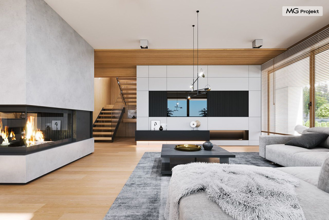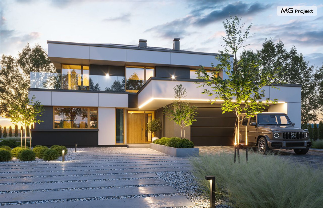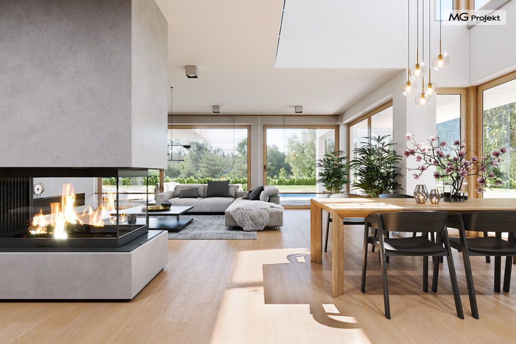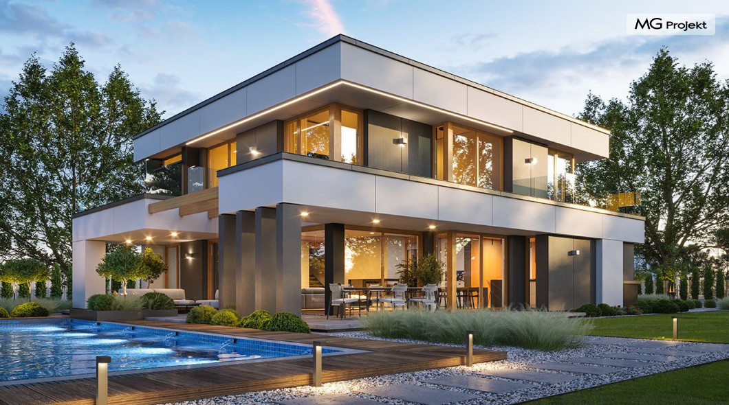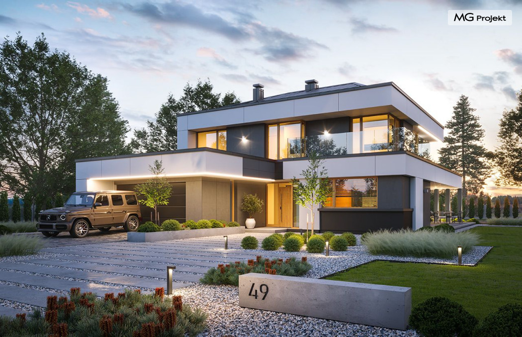 Projekt domu Willa Floryda 8 to kolejny projekt reprezentacyjnego domu piętrowego z serii „Willa Floryda”. Dom został zaprojektowany jako przestronna miejska willa, zbudowana na planie zbliżonym do kwadratu, z wystającą do przodu częścią garażową, dzięki czemu zmieści na węższej parceli - nawet o szerokości 21 metrów. Budynek łączy w sobie zwartą prostopadłościenną bryłę, komfortowe, reprezentacyjne wnętrze, oraz nowoczesną atrakcyjną architekturę z ciekawymi detalami. Willa Floryda 8 jest mniejszym budynkiem od podstawowych wariantów „Floryd”. Ma mniejszą powierzchnię, mniej rozciągnięty rzut, dzięki czemu budynek jest też mniej kosztowny. Układ funkcjonalny domu zbliżony jest do cieszącego się popularnością domu Willa Floryda 3, jednak zaproponowaliśmy tutaj zupełnie inną formę architektoniczną budynku. Podstawowy język detali został zachowany, jak podział fasad na poziome pasy, duże ilości przeszkleń, balkony i tarasy piętra, czy zwieńczenie budynku czterospadowym dachem z szerokim gzymsowaniem. Dodatkowo wprowadziliśmy kolejne architektoniczne smaczki. Przede wszystkim od strony ogrodu dodane zostały piękne zadaszenia części salonu, z przerwą tworzącą półzamknięte wewnętrzne patio, dające mieszkańcom przytulność i intymność. Przedłużenie sufitów parteru w podcieniach okalających tarasy, oraz szerokie przeszklenia między częścią dzienną, a tarasem wywołują efekt zatarcia granicy między wnętrzem domu a przestrzenią na zewnątrz. Wnętrze domu zaaranżowano łącząc poszczególne fragmenty przestrzeni dziennej ze sobą w taki sposób, aby pomieszczenia były duże, a równocześnie przytulne i odpowiednio wyskalowane. Pod względem układu funkcjonalnego wnętrza, dom podzielono na cześć dzienną i techniczno-garażową na parterze, oraz cześć z sypialniami na piętrze. Do budynku wchodzimy szerokim wejściem, z drzwiami z bocznym naświetlem, do wygodnego przedsionka z szatnią. Następnie przechodzimy do otwartego holu, oddzielonego od salonu dwustronnym ozdobnym kominkiem będącym centralnym akcentem całej przestrzeni dziennej. Na część dzienną składają się pomieszczenia salonu – z szeroką ścianą tv i dużym oknem, jadalnia z pustką sufitu i antresolą, oraz obszerna kuchnia z wyspą i spiżarnią. Dodatkowe pomieszczenia parteru to pokój-gabinet, łazienka, oraz garaż z kotłownią. Na piętrze znalazły się 4 sypialnie, w tym apartament master łazienką,garderobą i tarasem, oraz dwie dodatkowe łazienki. Wnętrze można oczywiście dowolnie modelować dostosowując do potrzeb konkretnej rodziny. Budynek zaprojektowano jako energooszczędny, z dobrymi izolacjami i nowoczesnymi instalacjami. Dom łączy w sobie nowoczesny wygląd z prostą konstrukcją i zwartą bryłą, dzięki czemu nie będzie trudny w budowie i powinien być niedrogi w późniejszej eksploatacji. Willa Floryda 8 to propozycja dla Inwestorów planujących budowę wyjątkowego domu dla siebie - wygodnej reprezentacyjnej willi o nowoczesnym stylu. Budynek będzie atrakcyjną oprawą i scenografią codziennego życia, podkreślającą dobry gust jego użytkowników. Dom stawiając Inwestorom wysoko poprzeczkę podczas budowy, odwdzięczy się ciesząc oko i karmiąc codziennie zmysły właścicieli, przyciągając jednocześnie spojrzenia sąsiadów i przechodniów. Willa Floryda 8 do dom dla Inwestorów chcących wyrazić siebie i zaznaczyć swoje przywiązanie do dobrego smaku i jakościowej architektury. Zapraszamy !