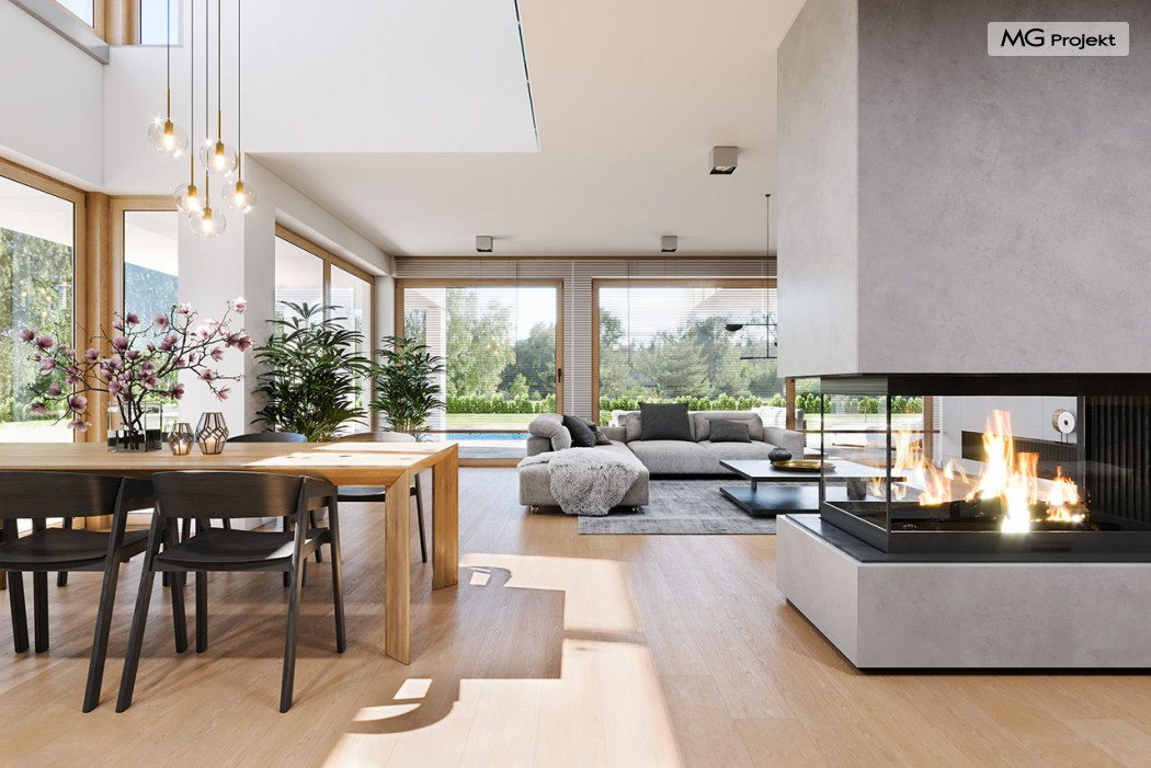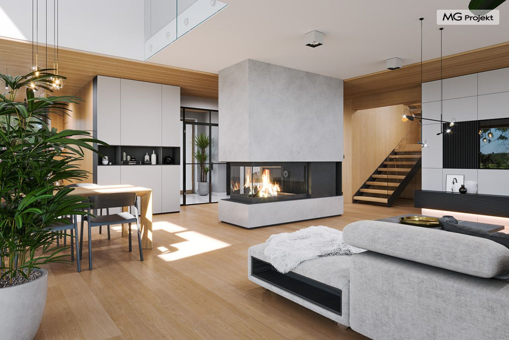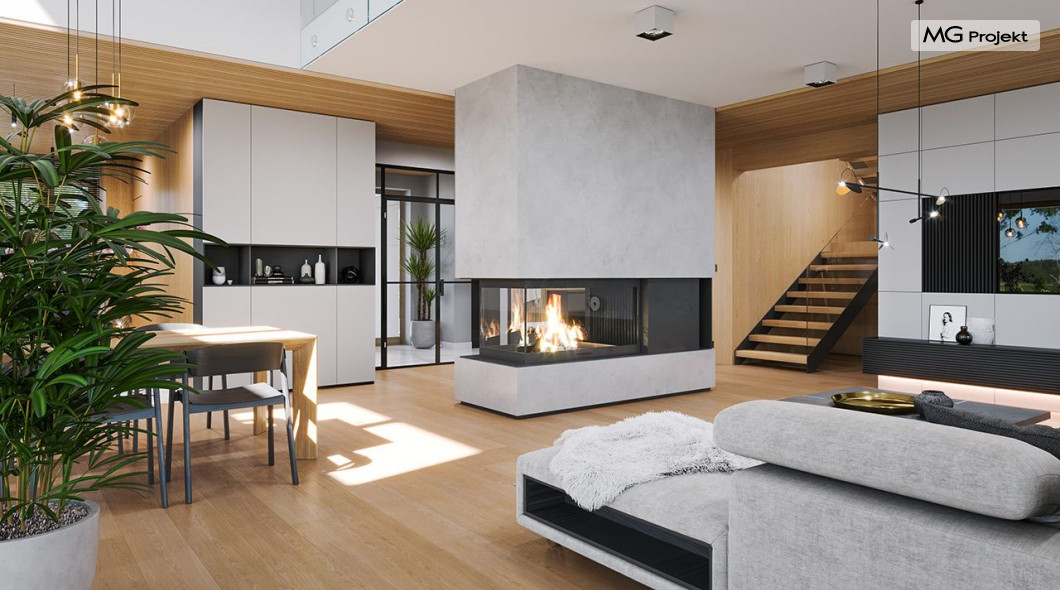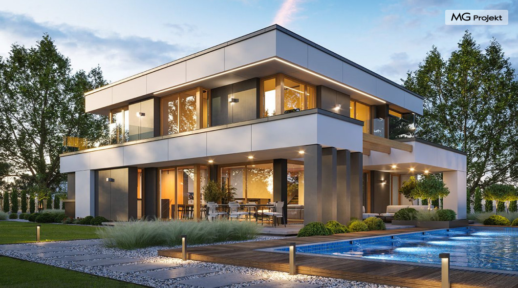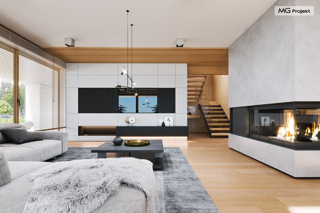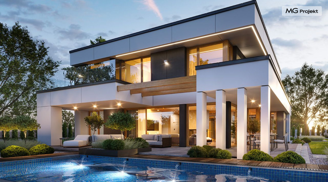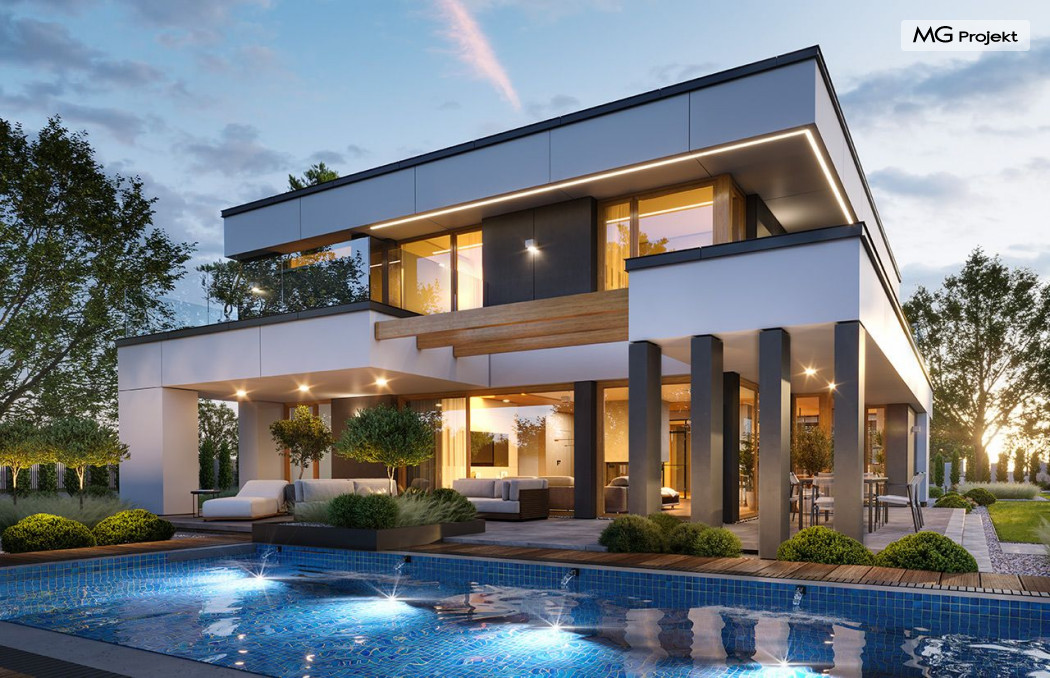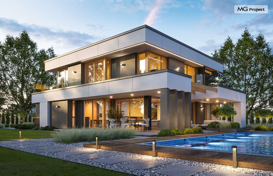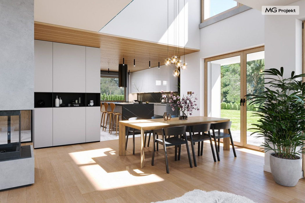 Projekt domu Willa Floryda 8 to kolejny projekt reprezentacyjnego domu piętrowego z serii „Willa Floryda”. Dom został zaprojektowany jako przestronna miejska willa, zbudowana na planie zbliżonym do kwadratu, z wystającą do przodu częścią garażową, dzięki czemu zmieści na węższej parceli - nawet o szerokości 21 metrów. Budynek łączy w sobie zwartą prostopadłościenną bryłę, komfortowe, reprezentacyjne wnętrze, oraz nowoczesną atrakcyjną architekturę z ciekawymi detalami. Willa Floryda 8 jest mniejszym budynkiem od podstawowych wariantów „Floryd”. Ma mniejszą powierzchnię, mniej rozciągnięty rzut, dzięki czemu budynek jest też mniej kosztowny. Układ funkcjonalny domu zbliżony jest do cieszącego się popularnością domu Willa Floryda 3, jednak zaproponowaliśmy tutaj zupełnie inną formę architektoniczną budynku. Podstawowy język detali został zachowany, jak podział fasad na poziome pasy, duże ilości przeszkleń, balkony i tarasy piętra, czy zwieńczenie budynku czterospadowym dachem z szerokim gzymsowaniem. Dodatkowo wprowadziliśmy kolejne architektoniczne smaczki. Przede wszystkim od strony ogrodu dodane zostały piękne zadaszenia części salonu, z przerwą tworzącą półzamknięte wewnętrzne patio, dające mieszkańcom przytulność i intymność. Przedłużenie sufitów parteru w podcieniach okalających tarasy, oraz szerokie przeszklenia między częścią dzienną, a tarasem wywołują efekt zatarcia granicy między wnętrzem domu a przestrzenią na zewnątrz. Wnętrze domu zaaranżowano łącząc poszczególne fragmenty przestrzeni dziennej ze sobą w taki sposób, aby pomieszczenia były duże, a równocześnie przytulne i odpowiednio wyskalowane. Pod względem układu funkcjonalnego wnętrza, dom podzielono na cześć dzienną i techniczno-garażową na parterze, oraz cześć z sypialniami na piętrze. Do budynku wchodzimy szerokim wejściem, z drzwiami z bocznym naświetlem, do wygodnego przedsionka z szatnią. Następnie przechodzimy do otwartego holu, oddzielonego od salonu dwustronnym ozdobnym kominkiem będącym centralnym akcentem całej przestrzeni dziennej. Na część dzienną składają się pomieszczenia salonu – z szeroką ścianą tv i dużym oknem, jadalnia z pustką sufitu i antresolą, oraz obszerna kuchnia z wyspą i spiżarnią. Dodatkowe pomieszczenia parteru to pokój-gabinet, łazienka, oraz garaż z kotłownią. Na piętrze znalazły się 4 sypialnie, w tym apartament master łazienką,garderobą i tarasem, oraz dwie dodatkowe łazienki. Wnętrze można oczywiście dowolnie modelować dostosowując do potrzeb konkretnej rodziny. Budynek zaprojektowano jako energooszczędny, z dobrymi izolacjami i nowoczesnymi instalacjami. Dom łączy w sobie nowoczesny wygląd z prostą konstrukcją i zwartą bryłą, dzięki czemu nie będzie trudny w budowie i powinien być niedrogi w późniejszej eksploatacji. Willa Floryda 8 to propozycja dla Inwestorów planujących budowę wyjątkowego domu dla siebie - wygodnej reprezentacyjnej willi o nowoczesnym stylu. Budynek będzie atrakcyjną oprawą i scenografią codziennego życia, podkreślającą dobry gust jego użytkowników. Dom stawiając Inwestorom wysoko poprzeczkę podczas budowy, odwdzięczy się ciesząc oko i karmiąc codziennie zmysły właścicieli, przyciągając jednocześnie spojrzenia sąsiadów i przechodniów. Willa Floryda 8 do dom dla Inwestorów chcących wyrazić siebie i zaznaczyć swoje przywiązanie do dobrego smaku i jakościowej architektury. Zapraszamy !