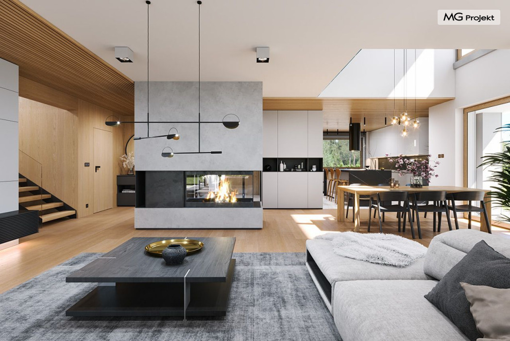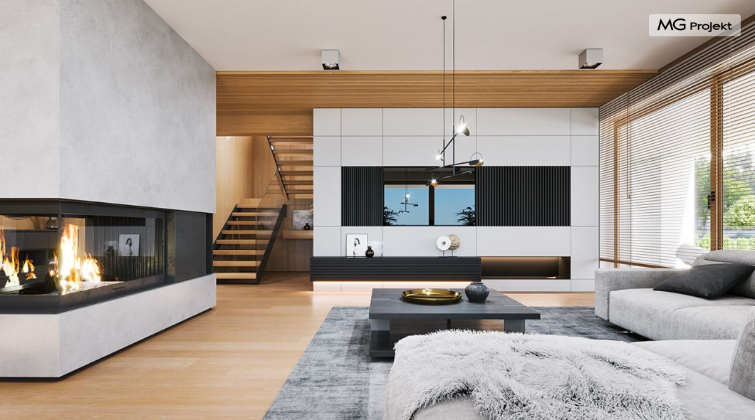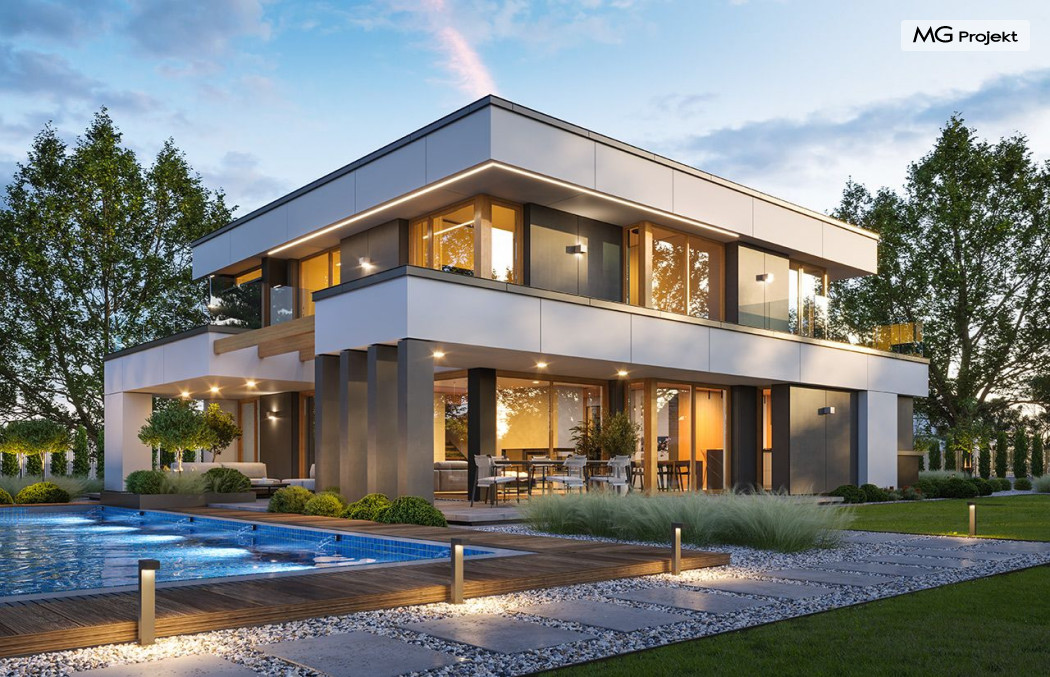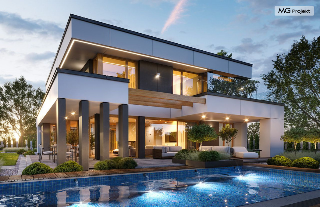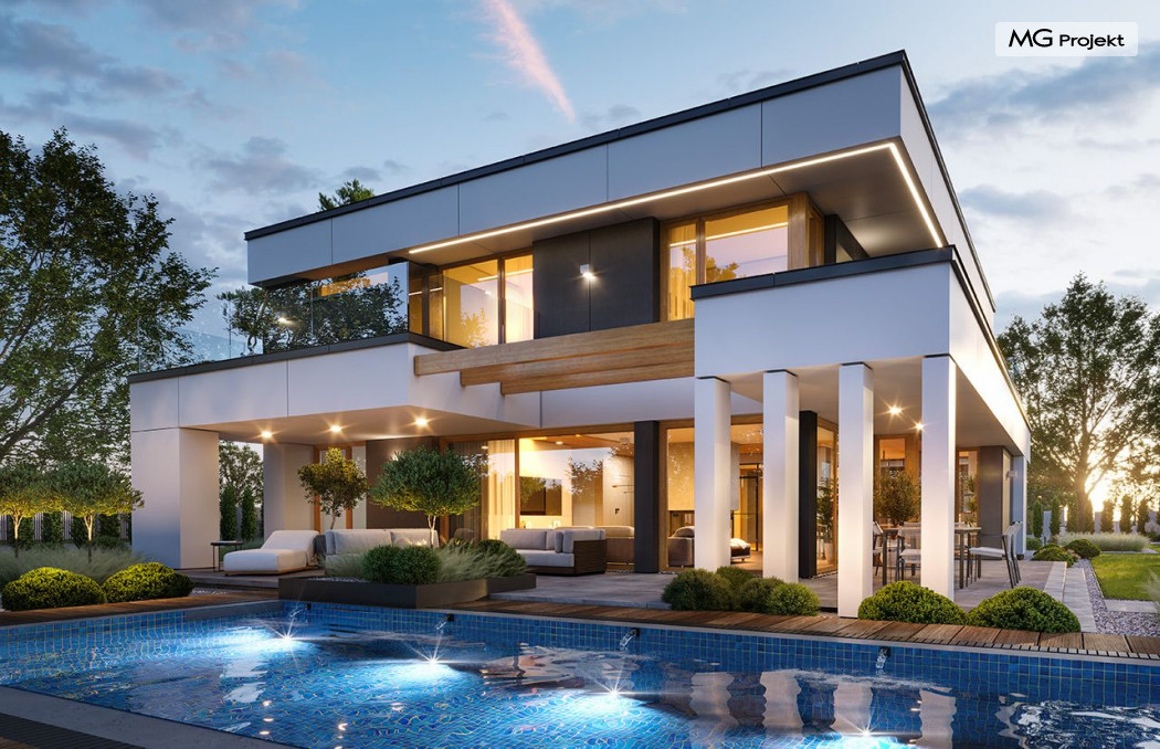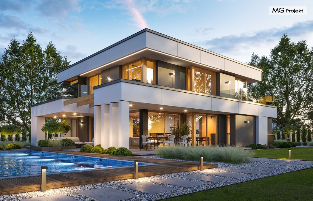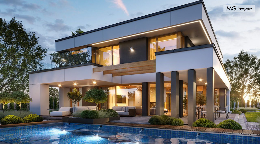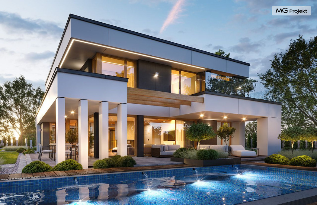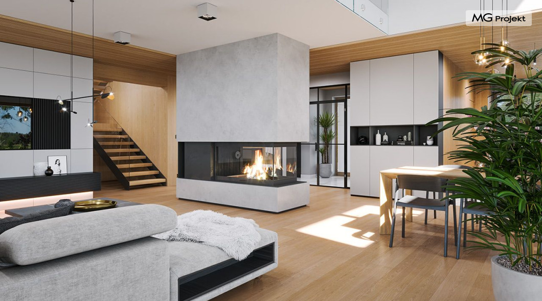 Projekt domu Willa Floryda 8 to kolejny projekt reprezentacyjnego domu piętrowego z serii „Willa Floryda”. Dom został zaprojektowany jako przestronna miejska willa, zbudowana na planie zbliżonym do kwadratu, z wystającą do przodu częścią garażową, dzięki czemu zmieści na węższej parceli - nawet o szerokości 21 metrów. Budynek łączy w sobie zwartą prostopadłościenną bryłę, komfortowe, reprezentacyjne wnętrze, oraz nowoczesną atrakcyjną architekturę z ciekawymi detalami. Willa Floryda 8 jest mniejszym budynkiem od podstawowych wariantów „Floryd”. Ma mniejszą powierzchnię, mniej rozciągnięty rzut, dzięki czemu budynek jest też mniej kosztowny. Układ funkcjonalny domu zbliżony jest do cieszącego się popularnością domu Willa Floryda 3, jednak zaproponowaliśmy tutaj zupełnie inną formę architektoniczną budynku. Podstawowy język detali został zachowany, jak podział fasad na poziome pasy, duże ilości przeszkleń, balkony i tarasy piętra, czy zwieńczenie budynku czterospadowym dachem z szerokim gzymsowaniem. Dodatkowo wprowadziliśmy kolejne architektoniczne smaczki. Przede wszystkim od strony ogrodu dodane zostały piękne zadaszenia części salonu, z przerwą tworzącą półzamknięte wewnętrzne patio, dające mieszkańcom przytulność i intymność. Przedłużenie sufitów parteru w podcieniach okalających tarasy, oraz szerokie przeszklenia między częścią dzienną, a tarasem wywołują efekt zatarcia granicy między wnętrzem domu a przestrzenią na zewnątrz. Wnętrze domu zaaranżowano łącząc poszczególne fragmenty przestrzeni dziennej ze sobą w taki sposób, aby pomieszczenia były duże, a równocześnie przytulne i odpowiednio wyskalowane. Pod względem układu funkcjonalnego wnętrza, dom podzielono na cześć dzienną i techniczno-garażową na parterze, oraz cześć z sypialniami na piętrze. Do budynku wchodzimy szerokim wejściem, z drzwiami z bocznym naświetlem, do wygodnego przedsionka z szatnią. Następnie przechodzimy do otwartego holu, oddzielonego od salonu dwustronnym ozdobnym kominkiem będącym centralnym akcentem całej przestrzeni dziennej. Na część dzienną składają się pomieszczenia salonu – z szeroką ścianą tv i dużym oknem, jadalnia z pustką sufitu i antresolą, oraz obszerna kuchnia z wyspą i spiżarnią. Dodatkowe pomieszczenia parteru to pokój-gabinet, łazienka, oraz garaż z kotłownią. Na piętrze znalazły się 4 sypialnie, w tym apartament master łazienką,garderobą i tarasem, oraz dwie dodatkowe łazienki. Wnętrze można oczywiście dowolnie modelować dostosowując do potrzeb konkretnej rodziny. Budynek zaprojektowano jako energooszczędny, z dobrymi izolacjami i nowoczesnymi instalacjami. Dom łączy w sobie nowoczesny wygląd z prostą konstrukcją i zwartą bryłą, dzięki czemu nie będzie trudny w budowie i powinien być niedrogi w późniejszej eksploatacji. Willa Floryda 8 to propozycja dla Inwestorów planujących budowę wyjątkowego domu dla siebie - wygodnej reprezentacyjnej willi o nowoczesnym stylu. Budynek będzie atrakcyjną oprawą i scenografią codziennego życia, podkreślającą dobry gust jego użytkowników. Dom stawiając Inwestorom wysoko poprzeczkę podczas budowy, odwdzięczy się ciesząc oko i karmiąc codziennie zmysły właścicieli, przyciągając jednocześnie spojrzenia sąsiadów i przechodniów. Willa Floryda 8 do dom dla Inwestorów chcących wyrazić siebie i zaznaczyć swoje przywiązanie do dobrego smaku i jakościowej architektury. Zapraszamy !