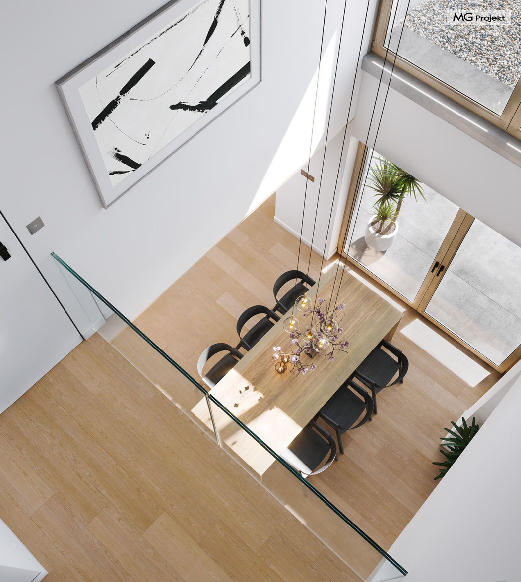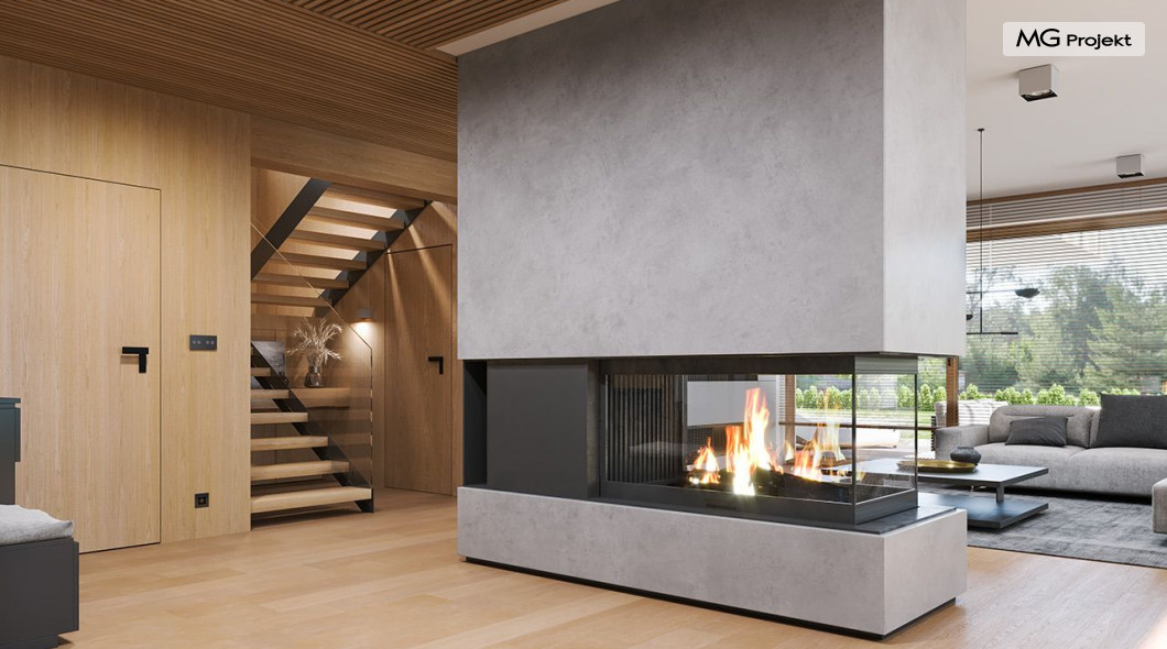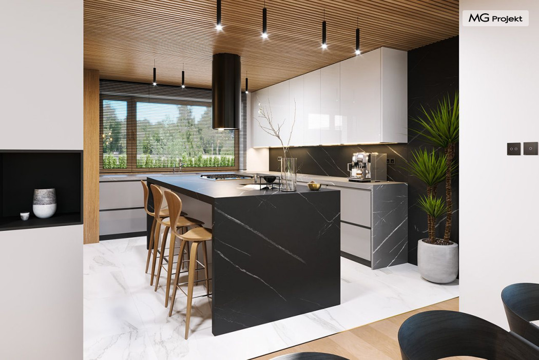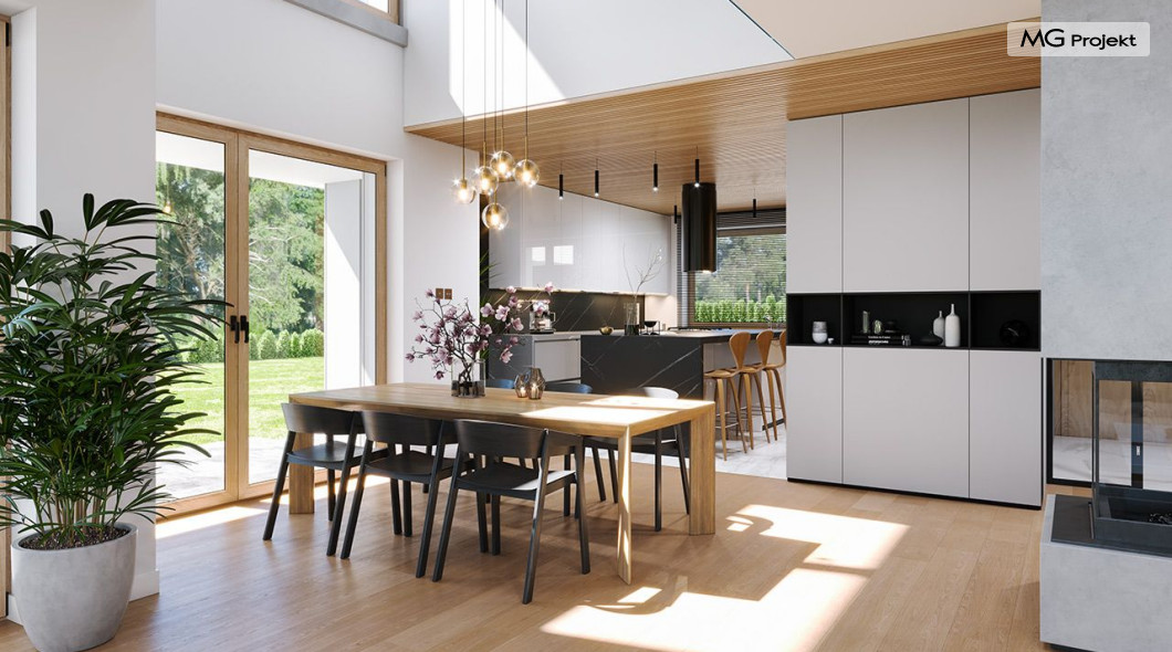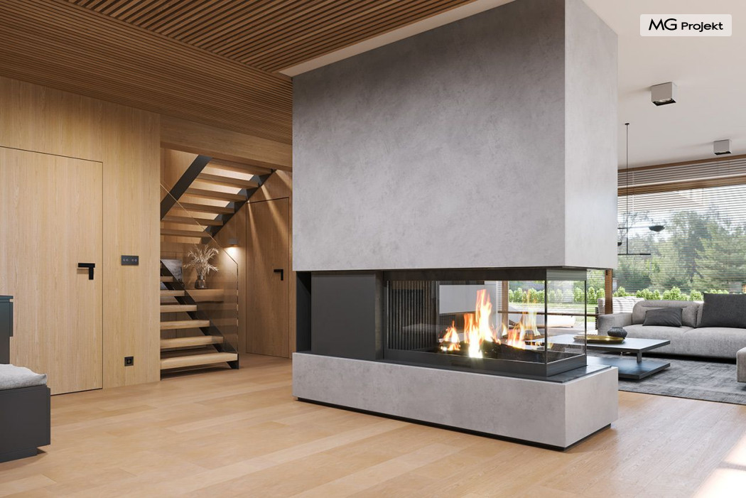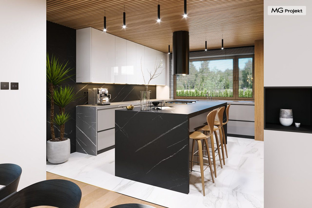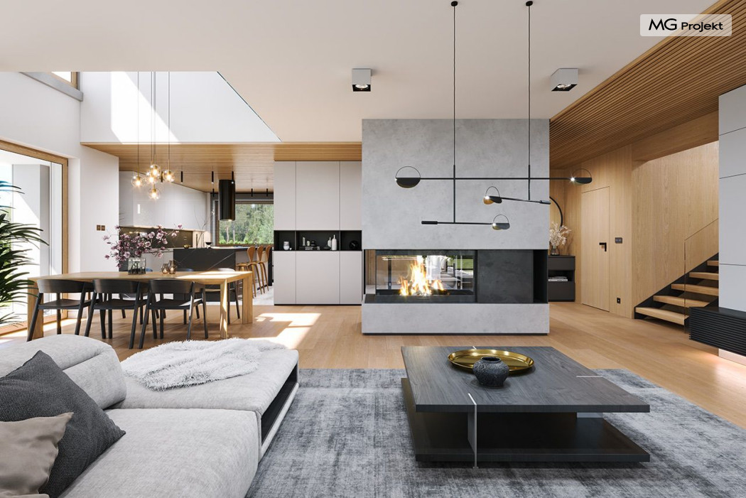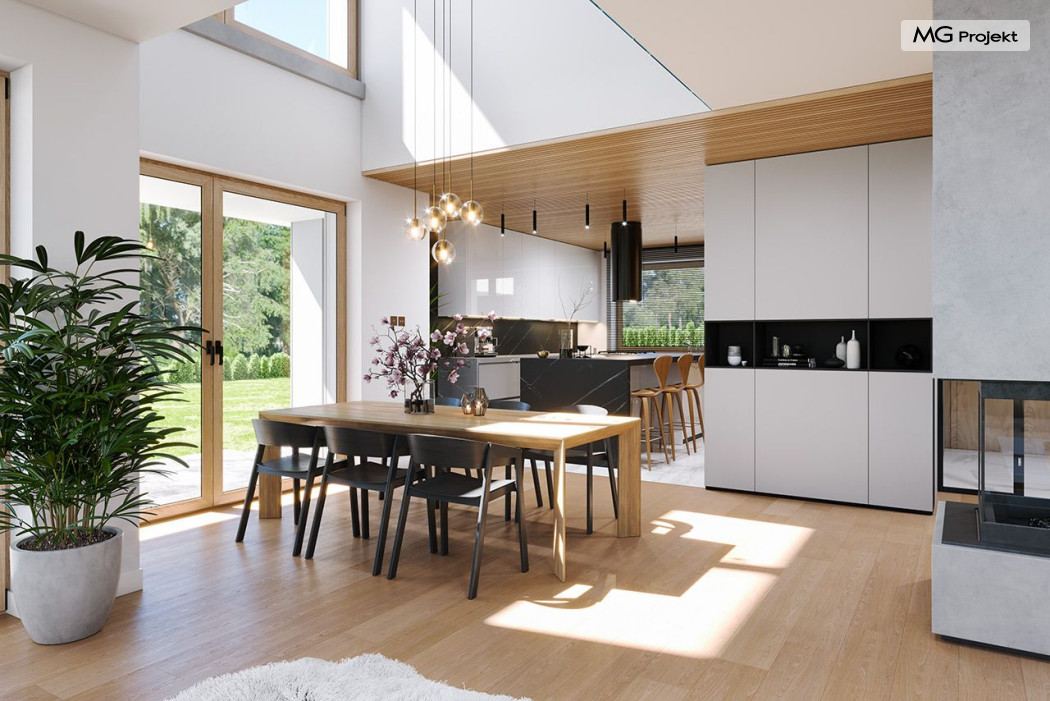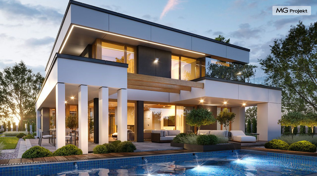 Projekt domu Willa Floryda 8 to kolejny projekt reprezentacyjnego domu piętrowego z serii „Willa Floryda”. Dom został zaprojektowany jako przestronna miejska willa, zbudowana na planie zbliżonym do kwadratu, z wystającą do przodu częścią garażową, dzięki czemu zmieści na węższej parceli - nawet o szerokości 21 metrów. Budynek łączy w sobie zwartą prostopadłościenną bryłę, komfortowe, reprezentacyjne wnętrze, oraz nowoczesną atrakcyjną architekturę z ciekawymi detalami. Willa Floryda 8 jest mniejszym budynkiem od podstawowych wariantów „Floryd”. Ma mniejszą powierzchnię, mniej rozciągnięty rzut, dzięki czemu budynek jest też mniej kosztowny. Układ funkcjonalny domu zbliżony jest do cieszącego się popularnością domu Willa Floryda 3, jednak zaproponowaliśmy tutaj zupełnie inną formę architektoniczną budynku. Podstawowy język detali został zachowany, jak podział fasad na poziome pasy, duże ilości przeszkleń, balkony i tarasy piętra, czy zwieńczenie budynku czterospadowym dachem z szerokim gzymsowaniem. Dodatkowo wprowadziliśmy kolejne architektoniczne smaczki. Przede wszystkim od strony ogrodu dodane zostały piękne zadaszenia części salonu, z przerwą tworzącą półzamknięte wewnętrzne patio, dające mieszkańcom przytulność i intymność. Przedłużenie sufitów parteru w podcieniach okalających tarasy, oraz szerokie przeszklenia między częścią dzienną, a tarasem wywołują efekt zatarcia granicy między wnętrzem domu a przestrzenią na zewnątrz. Wnętrze domu zaaranżowano łącząc poszczególne fragmenty przestrzeni dziennej ze sobą w taki sposób, aby pomieszczenia były duże, a równocześnie przytulne i odpowiednio wyskalowane. Pod względem układu funkcjonalnego wnętrza, dom podzielono na cześć dzienną i techniczno-garażową na parterze, oraz cześć z sypialniami na piętrze. Do budynku wchodzimy szerokim wejściem, z drzwiami z bocznym naświetlem, do wygodnego przedsionka z szatnią. Następnie przechodzimy do otwartego holu, oddzielonego od salonu dwustronnym ozdobnym kominkiem będącym centralnym akcentem całej przestrzeni dziennej. Na część dzienną składają się pomieszczenia salonu – z szeroką ścianą tv i dużym oknem, jadalnia z pustką sufitu i antresolą, oraz obszerna kuchnia z wyspą i spiżarnią. Dodatkowe pomieszczenia parteru to pokój-gabinet, łazienka, oraz garaż z kotłownią. Na piętrze znalazły się 4 sypialnie, w tym apartament master łazienką,garderobą i tarasem, oraz dwie dodatkowe łazienki. Wnętrze można oczywiście dowolnie modelować dostosowując do potrzeb konkretnej rodziny. Budynek zaprojektowano jako energooszczędny, z dobrymi izolacjami i nowoczesnymi instalacjami. Dom łączy w sobie nowoczesny wygląd z prostą konstrukcją i zwartą bryłą, dzięki czemu nie będzie trudny w budowie i powinien być niedrogi w późniejszej eksploatacji. Willa Floryda 8 to propozycja dla Inwestorów planujących budowę wyjątkowego domu dla siebie - wygodnej reprezentacyjnej willi o nowoczesnym stylu. Budynek będzie atrakcyjną oprawą i scenografią codziennego życia, podkreślającą dobry gust jego użytkowników. Dom stawiając Inwestorom wysoko poprzeczkę podczas budowy, odwdzięczy się ciesząc oko i karmiąc codziennie zmysły właścicieli, przyciągając jednocześnie spojrzenia sąsiadów i przechodniów. Willa Floryda 8 do dom dla Inwestorów chcących wyrazić siebie i zaznaczyć swoje przywiązanie do dobrego smaku i jakościowej architektury. Zapraszamy !