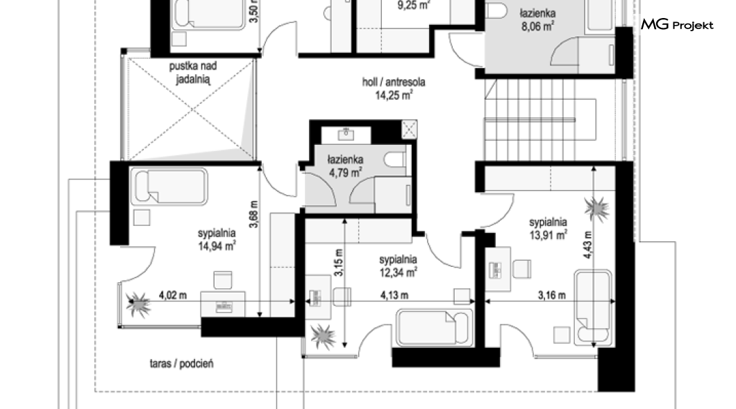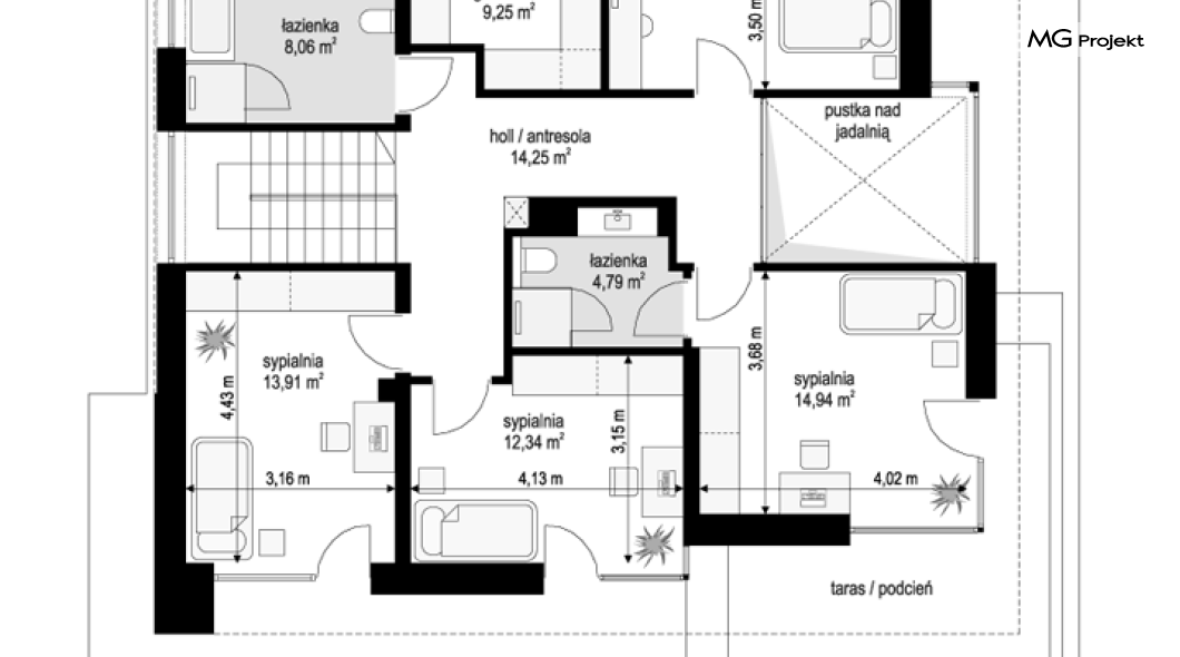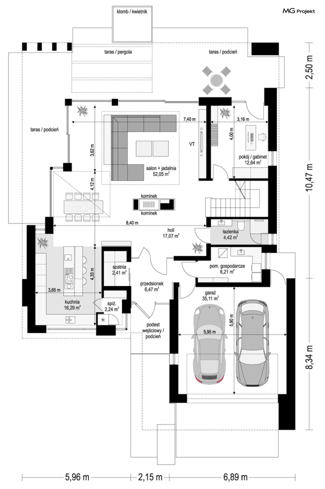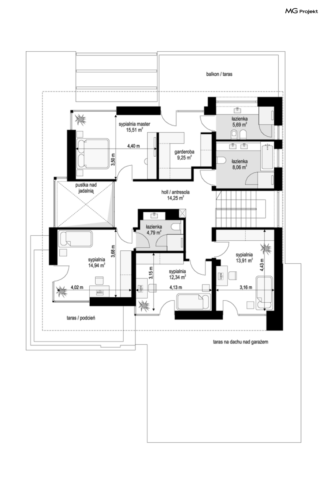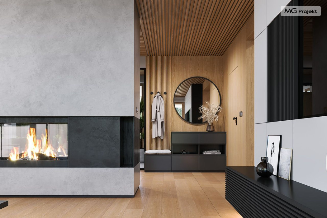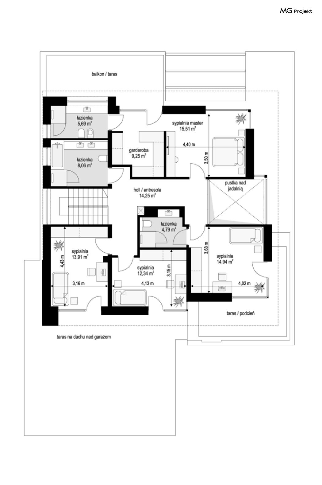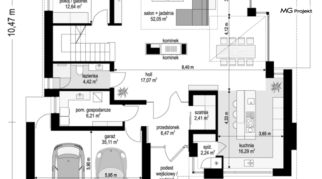Projekt domu Willa Floryda 8 to kolejny projekt reprezentacyjnego domu piętrowego z serii „Willa Floryda”. Dom został zaprojektowany jako przestronna miejska willa, zbudowana na planie zbliżonym do kwadratu, z wystającą do przodu częścią garażową, dzięki czemu zmieści na węższej parceli - nawet o szerokości 21 metrów. Budynek łączy w sobie zwartą prostopadłościenną bryłę, komfortowe, reprezentacyjne wnętrze, oraz nowoczesną atrakcyjną architekturę z ciekawymi detalami. Willa Floryda 8 jest mniejszym budynkiem od podstawowych wariantów „Floryd”. Ma mniejszą powierzchnię, mniej rozciągnięty rzut, dzięki czemu budynek jest też mniej kosztowny. Układ funkcjonalny domu zbliżony jest do cieszącego się popularnością domu Willa Floryda 3, jednak zaproponowaliśmy tutaj zupełnie inną formę architektoniczną budynku. Podstawowy język detali został zachowany, jak podział fasad na poziome pasy, duże ilości przeszkleń, balkony i tarasy piętra, czy zwieńczenie budynku czterospadowym dachem z szerokim gzymsowaniem. Dodatkowo wprowadziliśmy kolejne architektoniczne smaczki. Przede wszystkim od strony ogrodu dodane zostały piękne zadaszenia części salonu, z przerwą tworzącą półzamknięte wewnętrzne patio, dające mieszkańcom przytulność i intymność. Przedłużenie sufitów parteru w podcieniach okalających tarasy, oraz szerokie przeszklenia między częścią dzienną, a tarasem wywołują efekt zatarcia granicy między wnętrzem domu a przestrzenią na zewnątrz. Wnętrze domu zaaranżowano łącząc poszczególne fragmenty przestrzeni dziennej ze sobą w taki sposób, aby pomieszczenia były duże, a równocześnie przytulne i odpowiednio wyskalowane. Pod względem układu funkcjonalnego wnętrza, dom podzielono na cześć dzienną i techniczno-garażową na parterze, oraz cześć z sypialniami na piętrze. Do budynku wchodzimy szerokim wejściem, z drzwiami z bocznym naświetlem, do wygodnego przedsionka z szatnią. Następnie przechodzimy do otwartego holu, oddzielonego od salonu dwustronnym ozdobnym kominkiem będącym centralnym akcentem całej przestrzeni dziennej. Na część dzienną składają się pomieszczenia salonu – z szeroką ścianą tv i dużym oknem, jadalnia z pustką sufitu i antresolą, oraz obszerna kuchnia z wyspą i spiżarnią. Dodatkowe pomieszczenia parteru to pokój-gabinet, łazienka, oraz garaż z kotłownią. Na piętrze znalazły się 4 sypialnie, w tym apartament master łazienką,garderobą i tarasem, oraz dwie dodatkowe łazienki. Wnętrze można oczywiście dowolnie modelować dostosowując do potrzeb konkretnej rodziny. Budynek zaprojektowano jako energooszczędny, z dobrymi izolacjami i nowoczesnymi instalacjami. Dom łączy w sobie nowoczesny wygląd z prostą konstrukcją i zwartą bryłą, dzięki czemu nie będzie trudny w budowie i powinien być niedrogi w późniejszej eksploatacji. Willa Floryda 8 to propozycja dla Inwestorów planujących budowę wyjątkowego domu dla siebie - wygodnej reprezentacyjnej willi o nowoczesnym stylu. Budynek będzie atrakcyjną oprawą i scenografią codziennego życia, podkreślającą dobry gust jego użytkowników. Dom stawiając Inwestorom wysoko poprzeczkę podczas budowy, odwdzięczy się ciesząc oko i karmiąc codziennie zmysły właścicieli, przyciągając jednocześnie spojrzenia sąsiadów i przechodniów. Willa Floryda 8 do dom dla Inwestorów chcących wyrazić siebie i zaznaczyć swoje przywiązanie do dobrego smaku i jakościowej architektury. Zapraszamy !