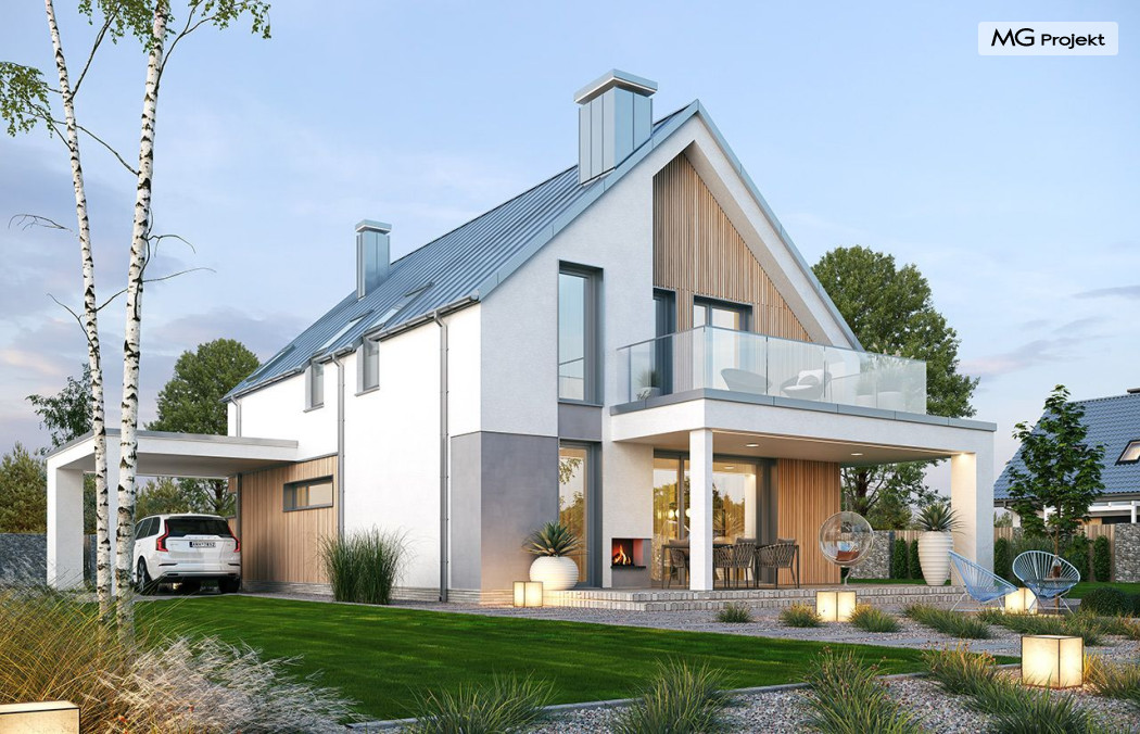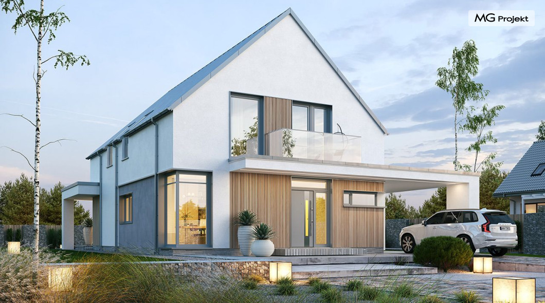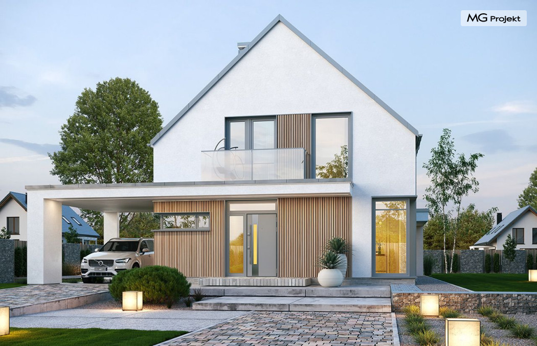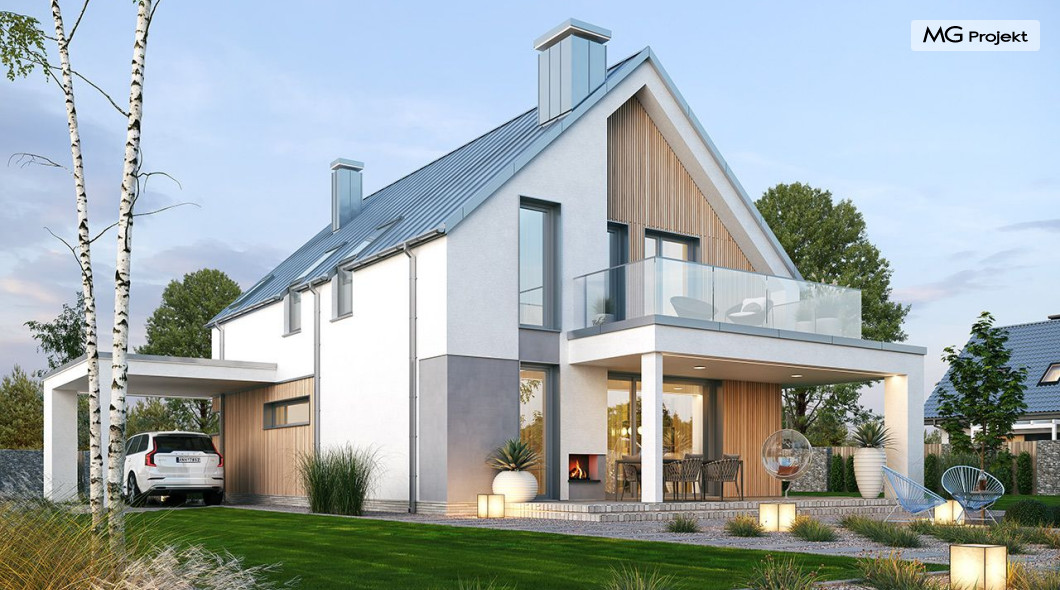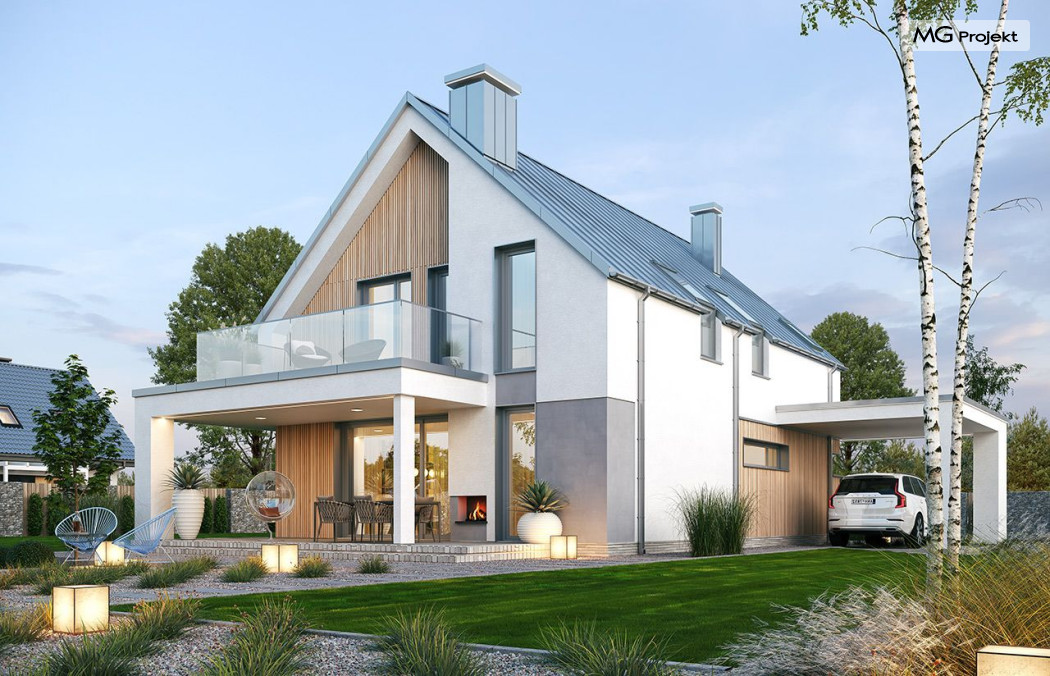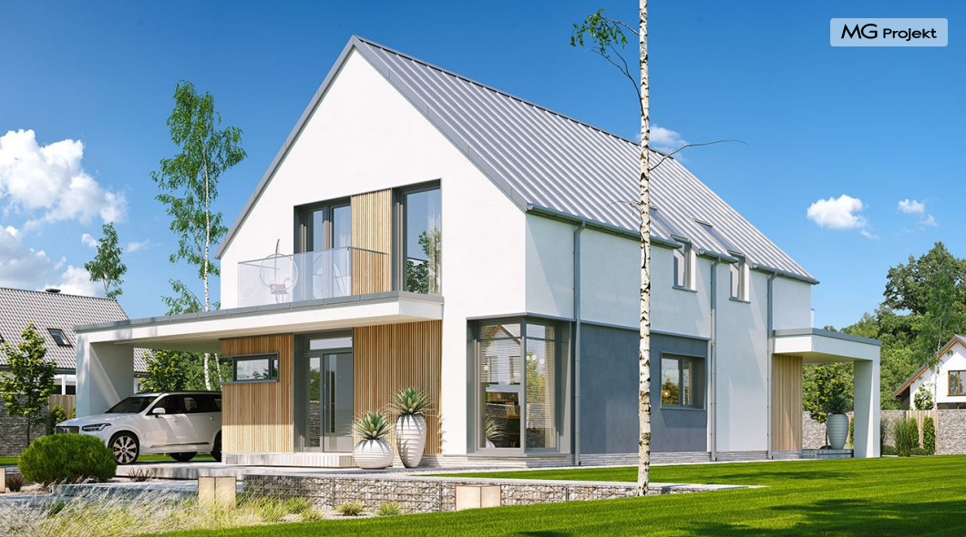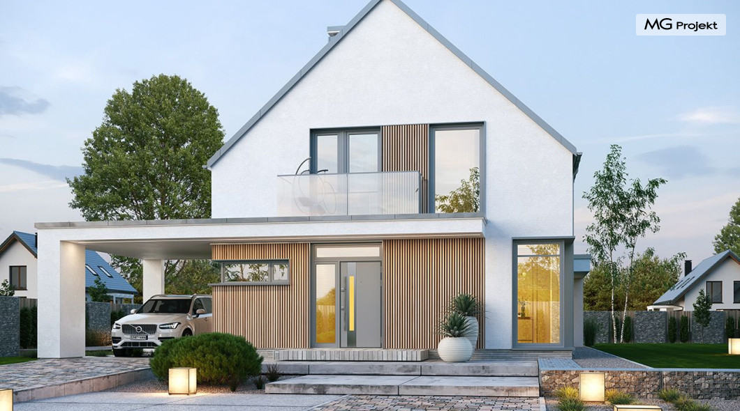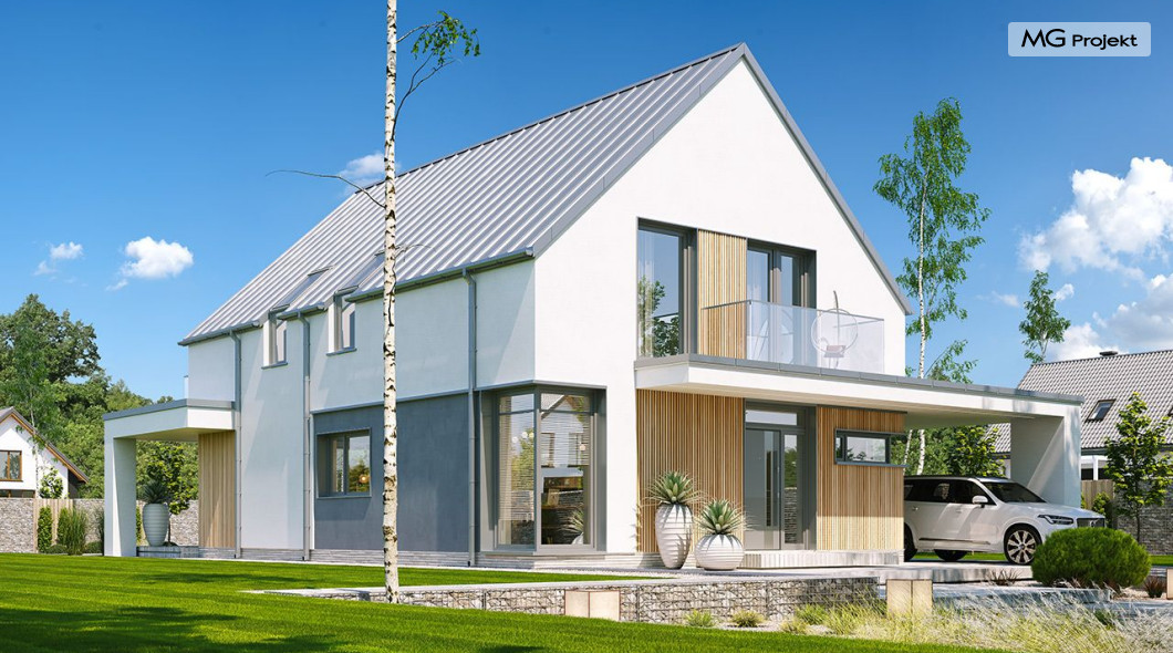 Projekt domu Miejski 3 to projekt domu jednorodzinnego parterowego z poddaszem użytkowym z serii projektów ”Miejski” z naszej pracowni. Budynek na planie prostokąta, przykryty dwuspadowym dachem bez okapów, o bardzo prostej sylwetce, nowoczesnej architekturze i stylistyce „domu-stodoły” - jednak z podniesionymi ścianami kolankowymi, dla zapewnienia maksymalnego wykorzystania powierzchni poddasza użytkowego budynku. Zewnętrzny design budynku to połączenie prostoty, czystości formy i ciekawych architektonicznych detali i smaczków. Elewacje domu podzielono na kontrastujące ze sobą kolorystycznie pola białych tynkowanych ścian, ścian wykończonych szarym tynkiem i fragmentów w pionowej okładzinie drewnianej rombus. Ciekawa kompozycja okien przełamuje monotonię prostopadłościennej bryły. Całość wzbogacają frontowe i ogrodowe zadaszenia, kryjące wiatę garażową, daszek nad podestem wejściowym, oraz zadaszenie części tarasu od strony ogrodowej. Dzięki zachowaniu właściwych proporcji bryły, podziałom elewacji, budynek przyciąga wzrok i ma w sobie coś interesującego – wyróżniającego go spośród wielu podobnych domów z poddaszem. Wnętrze Miejskiego 3 zaprojektowano dzieląc je na część dzienną na parterze i sypialnie na poddaszu. Do domu wchodzimy wygodnym przedsionkiem z szafami do holu i części dziennej. W środkowej części rzutu znajdują się wygodne schody na poddasze widoczne pokoju dziennego. Salon podzielony jest na cześć wypoczynkową - z kanapami, ścianą TV, oraz szerokim przeszkleniem na taras i ogród z wyeksponowanym ozdobnym kominkiem, oraz na jadalnię z dużym stołem i wyjściem na taras przesuwnymi drzwiami HS. Do częściowo otwartej kuchni dostajemy się z holu lub jadalni. Na parterze znajduje się także dodatkowy pokój, łazienka i kotłownia. Na poddaszu zaprojektowane zostały trzy bardzo ładne sypialnie i ogólna łazienka. Dodatkowo sypialnia master posiada własną drugą łazienkę i garderobę. Wnętrze można oczywiście aranżować w dowolny sposób – według koncepcji właścicieli. Nad poddaszem znajduje się sporych rozmiarów stryszek, który można wykorzystać jako magazyn domowych „przydasiów”. W budynku celowo nie przewidziano garażu, wychodząc z założenia, że szkoda jest powierzchni domu na „salon” dla samochodu. Natomiast zaprojektowana została wygodna zadaszona wiata, z daszkiem prowadzącym wprost do drzwi wejściowych domu. Budynek zaprojektowano jako energooszczędny, z dobrymi izolacjami i nowoczesnymi instalacjami. Dom ma prostą konstrukcję i zwartą bryłę, dzięki czemu będzie łatwy w budowie i niedrogi w późniejszej eksploatacji. Miejski 3 to propozycja dla Inwestorów myślących o budowie domu o nowoczesnej architekturze, bezkompromisowym designie. Domu na wskroś praktycznego i funkcjonalnego, który przez wiele lat będzie wymagał minimalnej obsługi, a tego będzie oryginalny, ciekawy architektonicznie i ponadczasowy. Zapraszamy do zapoznania się ze wszystkimi domkami z tej serii: https://www.mgprojekt.com.pl/miejski, https://www.mgprojekt.com.pl/miejski-2, https://www.mgprojekt.com.pl/miejski-3, https://www.mgprojekt.com.pl/miejski-4