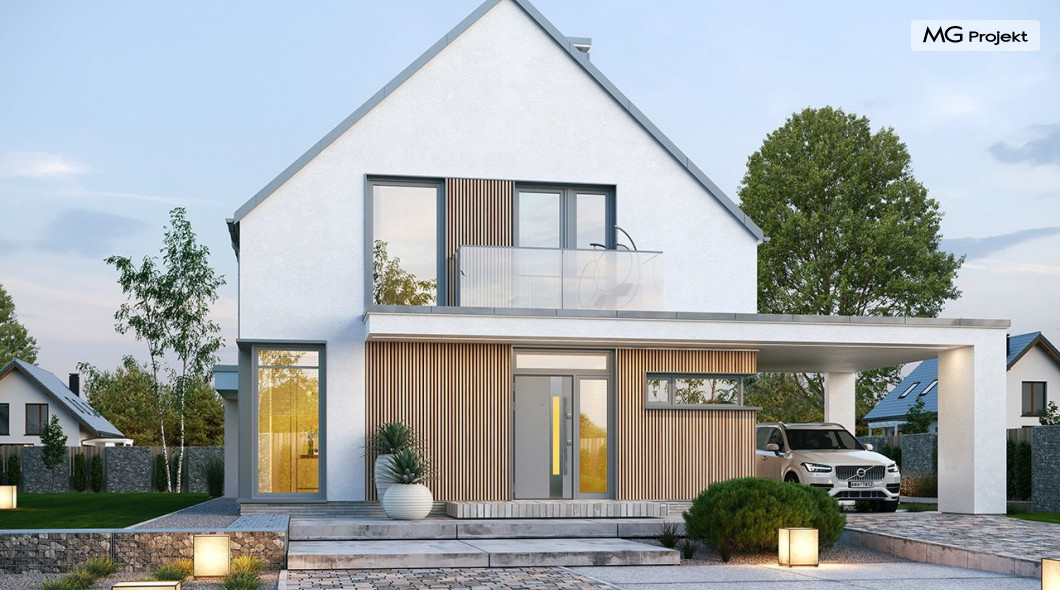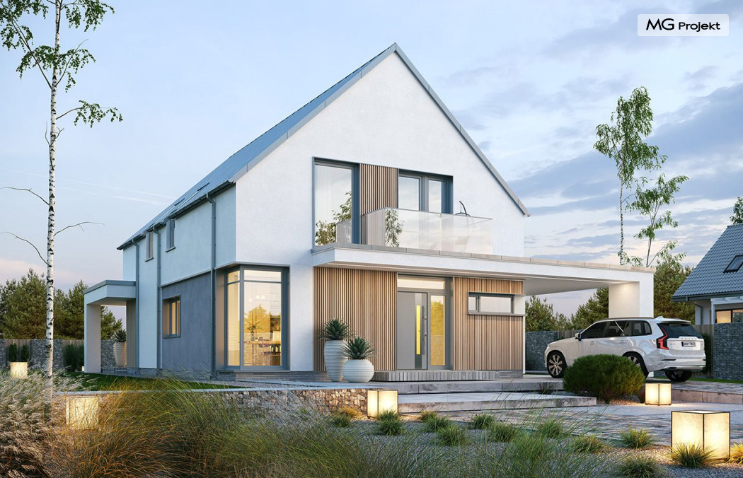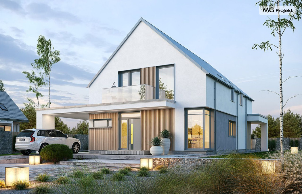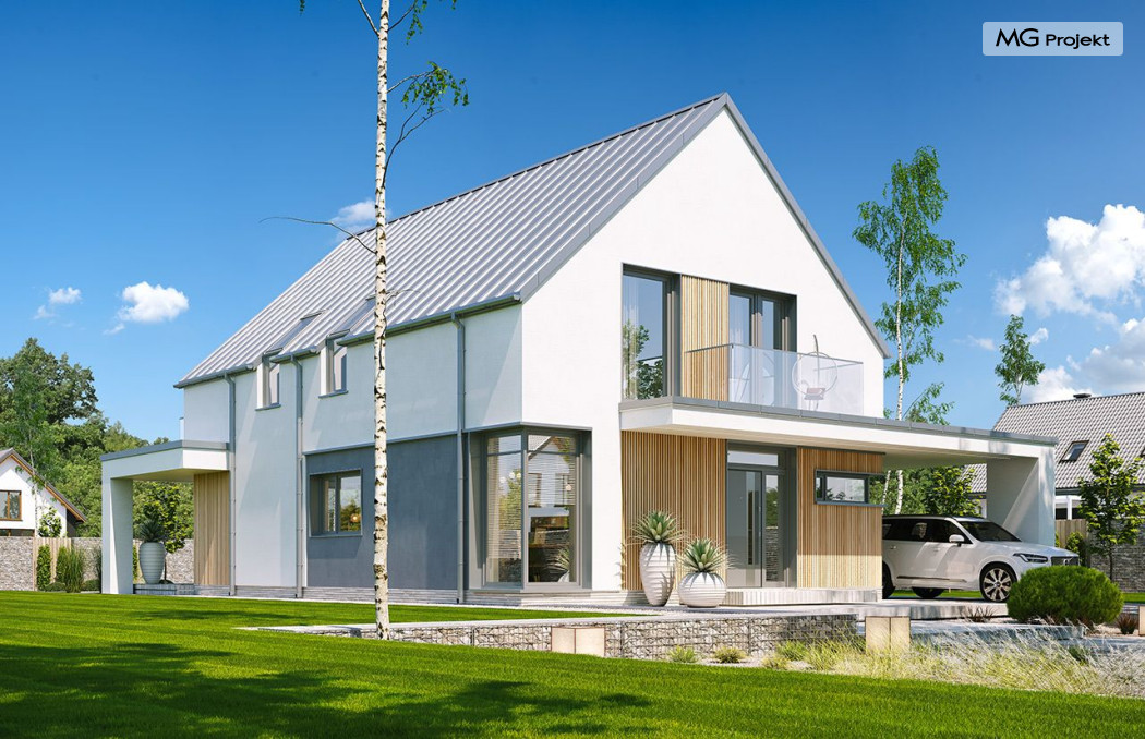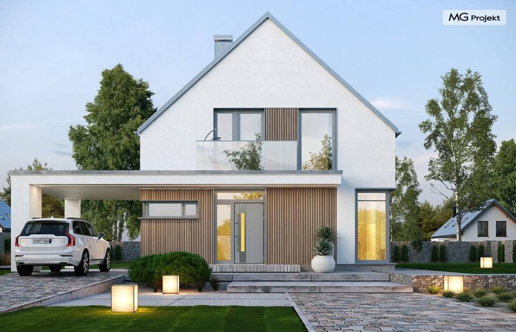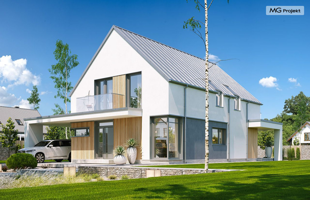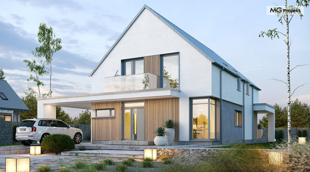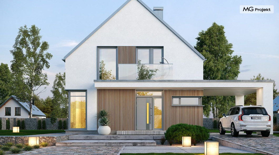 Projekt domu Miejski 3 to projekt domu jednorodzinnego parterowego z poddaszem użytkowym z serii projektów ”Miejski” z naszej pracowni. Budynek na planie prostokąta, przykryty dwuspadowym dachem bez okapów, o bardzo prostej sylwetce, nowoczesnej architekturze i stylistyce „domu-stodoły” - jednak z podniesionymi ścianami kolankowymi, dla zapewnienia maksymalnego wykorzystania powierzchni poddasza użytkowego budynku. Zewnętrzny design budynku to połączenie prostoty, czystości formy i ciekawych architektonicznych detali i smaczków. Elewacje domu podzielono na kontrastujące ze sobą kolorystycznie pola białych tynkowanych ścian, ścian wykończonych szarym tynkiem i fragmentów w pionowej okładzinie drewnianej rombus. Ciekawa kompozycja okien przełamuje monotonię prostopadłościennej bryły. Całość wzbogacają frontowe i ogrodowe zadaszenia, kryjące wiatę garażową, daszek nad podestem wejściowym, oraz zadaszenie części tarasu od strony ogrodowej. Dzięki zachowaniu właściwych proporcji bryły, podziałom elewacji, budynek przyciąga wzrok i ma w sobie coś interesującego – wyróżniającego go spośród wielu podobnych domów z poddaszem. Wnętrze Miejskiego 3 zaprojektowano dzieląc je na część dzienną na parterze i sypialnie na poddaszu. Do domu wchodzimy wygodnym przedsionkiem z szafami do holu i części dziennej. W środkowej części rzutu znajdują się wygodne schody na poddasze widoczne pokoju dziennego. Salon podzielony jest na cześć wypoczynkową - z kanapami, ścianą TV, oraz szerokim przeszkleniem na taras i ogród z wyeksponowanym ozdobnym kominkiem, oraz na jadalnię z dużym stołem i wyjściem na taras przesuwnymi drzwiami HS. Do częściowo otwartej kuchni dostajemy się z holu lub jadalni. Na parterze znajduje się także dodatkowy pokój, łazienka i kotłownia. Na poddaszu zaprojektowane zostały trzy bardzo ładne sypialnie i ogólna łazienka. Dodatkowo sypialnia master posiada własną drugą łazienkę i garderobę. Wnętrze można oczywiście aranżować w dowolny sposób – według koncepcji właścicieli. Nad poddaszem znajduje się sporych rozmiarów stryszek, który można wykorzystać jako magazyn domowych „przydasiów”. W budynku celowo nie przewidziano garażu, wychodząc z założenia, że szkoda jest powierzchni domu na „salon” dla samochodu. Natomiast zaprojektowana została wygodna zadaszona wiata, z daszkiem prowadzącym wprost do drzwi wejściowych domu. Budynek zaprojektowano jako energooszczędny, z dobrymi izolacjami i nowoczesnymi instalacjami. Dom ma prostą konstrukcję i zwartą bryłę, dzięki czemu będzie łatwy w budowie i niedrogi w późniejszej eksploatacji. Miejski 3 to propozycja dla Inwestorów myślących o budowie domu o nowoczesnej architekturze, bezkompromisowym designie. Domu na wskroś praktycznego i funkcjonalnego, który przez wiele lat będzie wymagał minimalnej obsługi, a tego będzie oryginalny, ciekawy architektonicznie i ponadczasowy. Zapraszamy do zapoznania się ze wszystkimi domkami z tej serii: https://www.mgprojekt.com.pl/miejski, https://www.mgprojekt.com.pl/miejski-2, https://www.mgprojekt.com.pl/miejski-3, https://www.mgprojekt.com.pl/miejski-4