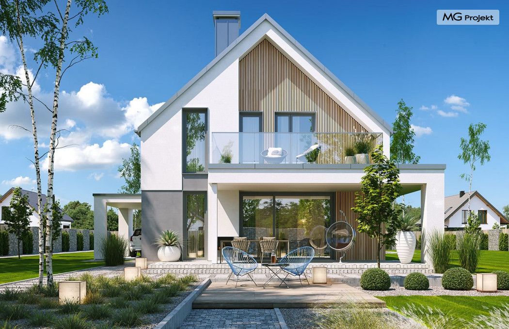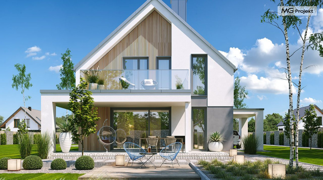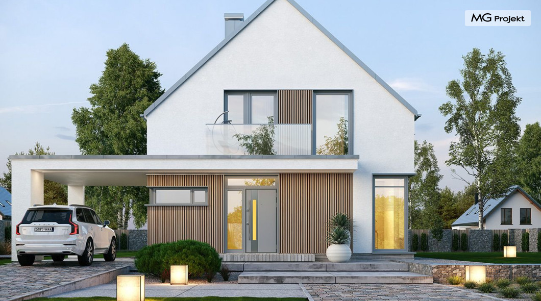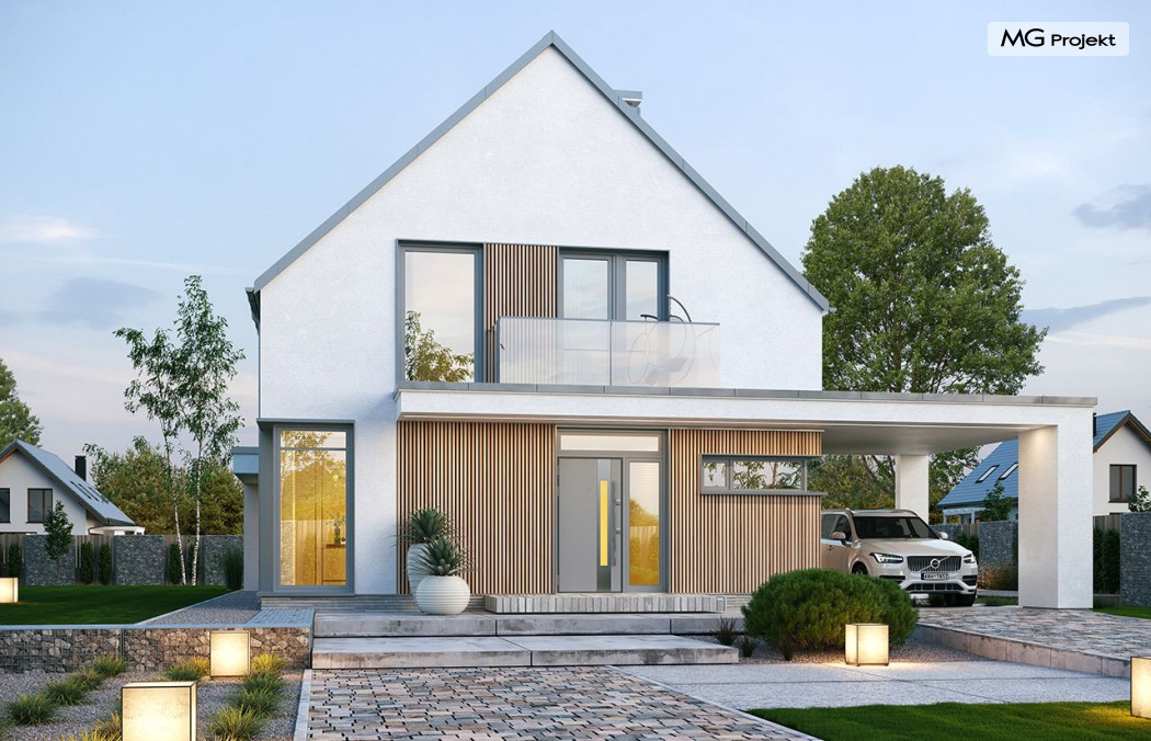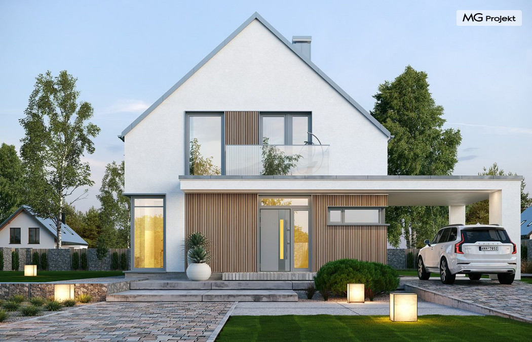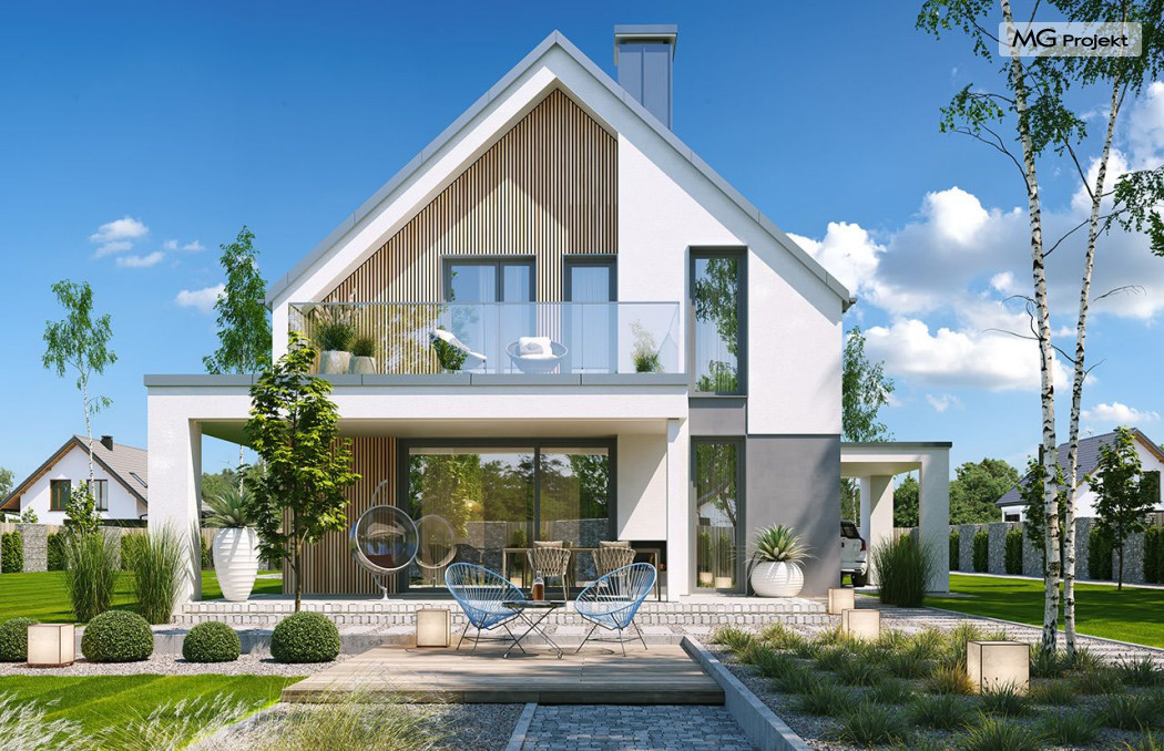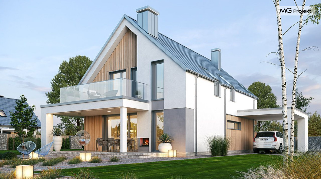 Projekt domu Miejski 3 to projekt domu jednorodzinnego parterowego z poddaszem użytkowym z serii projektów ”Miejski” z naszej pracowni. Budynek na planie prostokąta, przykryty dwuspadowym dachem bez okapów, o bardzo prostej sylwetce, nowoczesnej architekturze i stylistyce „domu-stodoły” - jednak z podniesionymi ścianami kolankowymi, dla zapewnienia maksymalnego wykorzystania powierzchni poddasza użytkowego budynku. Zewnętrzny design budynku to połączenie prostoty, czystości formy i ciekawych architektonicznych detali i smaczków. Elewacje domu podzielono na kontrastujące ze sobą kolorystycznie pola białych tynkowanych ścian, ścian wykończonych szarym tynkiem i fragmentów w pionowej okładzinie drewnianej rombus. Ciekawa kompozycja okien przełamuje monotonię prostopadłościennej bryły. Całość wzbogacają frontowe i ogrodowe zadaszenia, kryjące wiatę garażową, daszek nad podestem wejściowym, oraz zadaszenie części tarasu od strony ogrodowej. Dzięki zachowaniu właściwych proporcji bryły, podziałom elewacji, budynek przyciąga wzrok i ma w sobie coś interesującego – wyróżniającego go spośród wielu podobnych domów z poddaszem. Wnętrze Miejskiego 3 zaprojektowano dzieląc je na część dzienną na parterze i sypialnie na poddaszu. Do domu wchodzimy wygodnym przedsionkiem z szafami do holu i części dziennej. W środkowej części rzutu znajdują się wygodne schody na poddasze widoczne pokoju dziennego. Salon podzielony jest na cześć wypoczynkową - z kanapami, ścianą TV, oraz szerokim przeszkleniem na taras i ogród z wyeksponowanym ozdobnym kominkiem, oraz na jadalnię z dużym stołem i wyjściem na taras przesuwnymi drzwiami HS. Do częściowo otwartej kuchni dostajemy się z holu lub jadalni. Na parterze znajduje się także dodatkowy pokój, łazienka i kotłownia. Na poddaszu zaprojektowane zostały trzy bardzo ładne sypialnie i ogólna łazienka. Dodatkowo sypialnia master posiada własną drugą łazienkę i garderobę. Wnętrze można oczywiście aranżować w dowolny sposób – według koncepcji właścicieli. Nad poddaszem znajduje się sporych rozmiarów stryszek, który można wykorzystać jako magazyn domowych „przydasiów”. W budynku celowo nie przewidziano garażu, wychodząc z założenia, że szkoda jest powierzchni domu na „salon” dla samochodu. Natomiast zaprojektowana została wygodna zadaszona wiata, z daszkiem prowadzącym wprost do drzwi wejściowych domu. Budynek zaprojektowano jako energooszczędny, z dobrymi izolacjami i nowoczesnymi instalacjami. Dom ma prostą konstrukcję i zwartą bryłę, dzięki czemu będzie łatwy w budowie i niedrogi w późniejszej eksploatacji. Miejski 3 to propozycja dla Inwestorów myślących o budowie domu o nowoczesnej architekturze, bezkompromisowym designie. Domu na wskroś praktycznego i funkcjonalnego, który przez wiele lat będzie wymagał minimalnej obsługi, a tego będzie oryginalny, ciekawy architektonicznie i ponadczasowy. Zapraszamy do zapoznania się ze wszystkimi domkami z tej serii: https://www.mgprojekt.com.pl/miejski, https://www.mgprojekt.com.pl/miejski-2, https://www.mgprojekt.com.pl/miejski-3, https://www.mgprojekt.com.pl/miejski-4