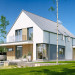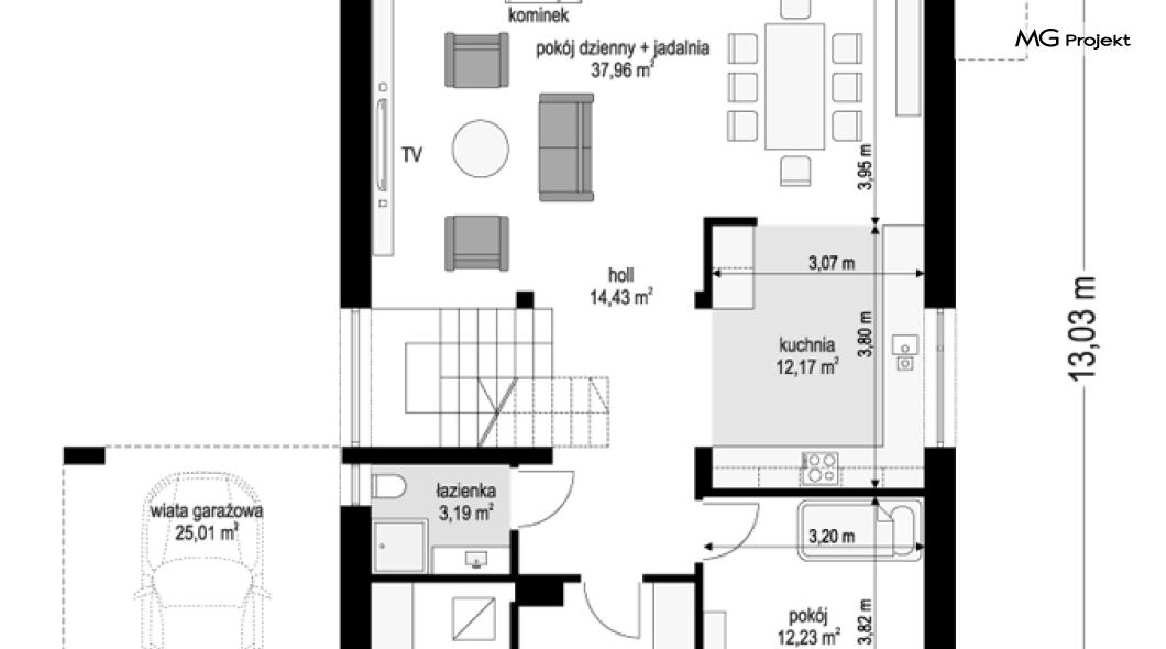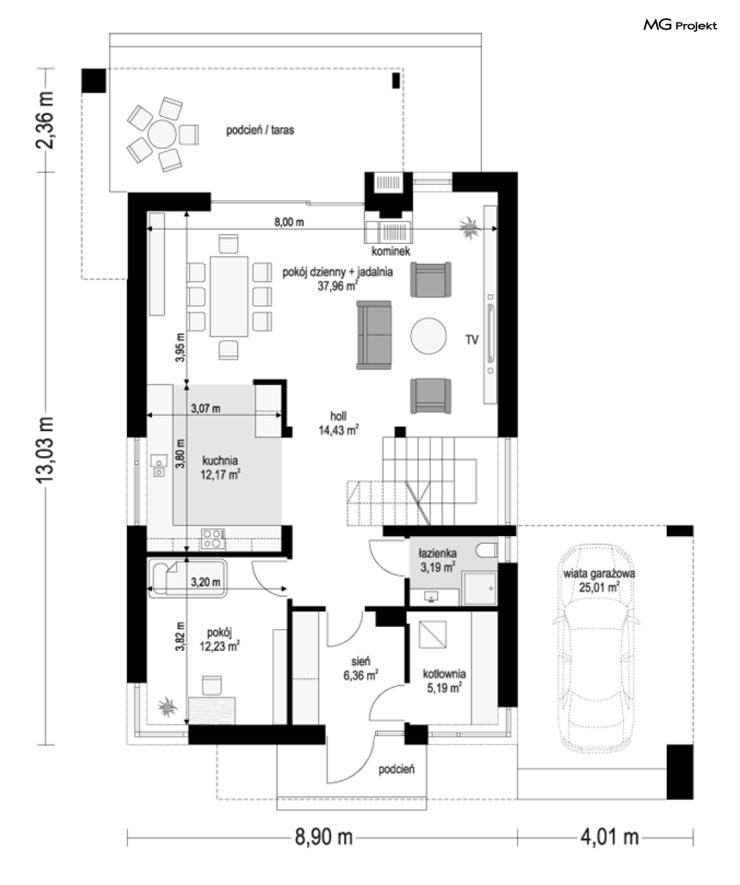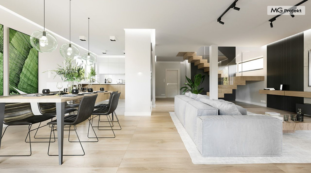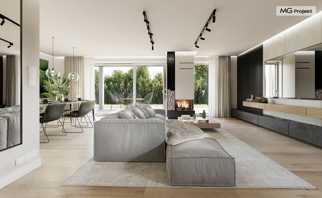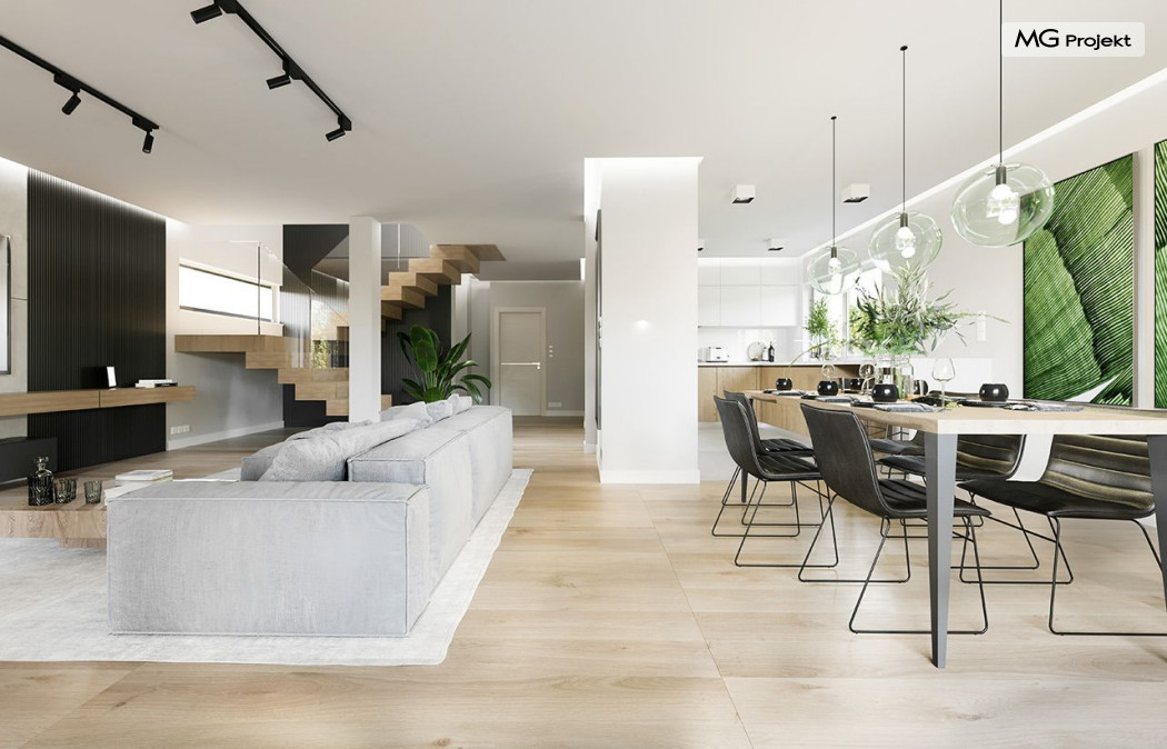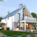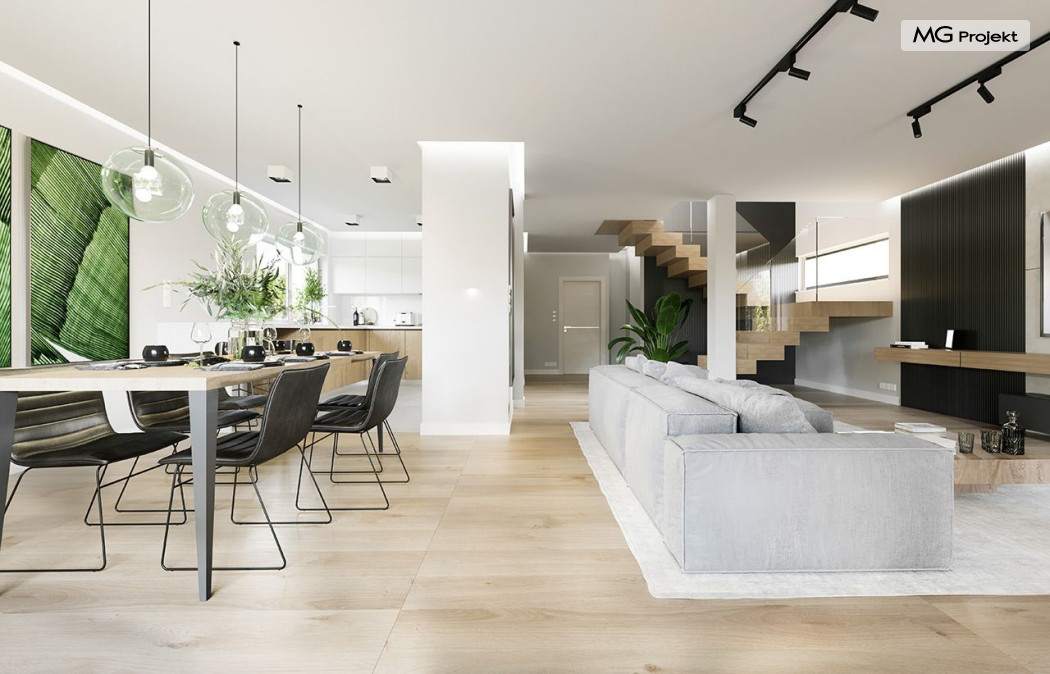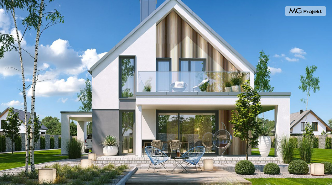 Projekt domu Miejski 3 to projekt domu jednorodzinnego parterowego z poddaszem użytkowym z serii projektów ”Miejski” z naszej pracowni. Budynek na planie prostokąta, przykryty dwuspadowym dachem bez okapów, o bardzo prostej sylwetce, nowoczesnej architekturze i stylistyce „domu-stodoły” - jednak z podniesionymi ścianami kolankowymi, dla zapewnienia maksymalnego wykorzystania powierzchni poddasza użytkowego budynku. Zewnętrzny design budynku to połączenie prostoty, czystości formy i ciekawych architektonicznych detali i smaczków. Elewacje domu podzielono na kontrastujące ze sobą kolorystycznie pola białych tynkowanych ścian, ścian wykończonych szarym tynkiem i fragmentów w pionowej okładzinie drewnianej rombus. Ciekawa kompozycja okien przełamuje monotonię prostopadłościennej bryły. Całość wzbogacają frontowe i ogrodowe zadaszenia, kryjące wiatę garażową, daszek nad podestem wejściowym, oraz zadaszenie części tarasu od strony ogrodowej. Dzięki zachowaniu właściwych proporcji bryły, podziałom elewacji, budynek przyciąga wzrok i ma w sobie coś interesującego – wyróżniającego go spośród wielu podobnych domów z poddaszem. Wnętrze Miejskiego 3 zaprojektowano dzieląc je na część dzienną na parterze i sypialnie na poddaszu. Do domu wchodzimy wygodnym przedsionkiem z szafami do holu i części dziennej. W środkowej części rzutu znajdują się wygodne schody na poddasze widoczne pokoju dziennego. Salon podzielony jest na cześć wypoczynkową - z kanapami, ścianą TV, oraz szerokim przeszkleniem na taras i ogród z wyeksponowanym ozdobnym kominkiem, oraz na jadalnię z dużym stołem i wyjściem na taras przesuwnymi drzwiami HS. Do częściowo otwartej kuchni dostajemy się z holu lub jadalni. Na parterze znajduje się także dodatkowy pokój, łazienka i kotłownia. Na poddaszu zaprojektowane zostały trzy bardzo ładne sypialnie i ogólna łazienka. Dodatkowo sypialnia master posiada własną drugą łazienkę i garderobę. Wnętrze można oczywiście aranżować w dowolny sposób – według koncepcji właścicieli. Nad poddaszem znajduje się sporych rozmiarów stryszek, który można wykorzystać jako magazyn domowych „przydasiów”. W budynku celowo nie przewidziano garażu, wychodząc z założenia, że szkoda jest powierzchni domu na „salon” dla samochodu. Natomiast zaprojektowana została wygodna zadaszona wiata, z daszkiem prowadzącym wprost do drzwi wejściowych domu. Budynek zaprojektowano jako energooszczędny, z dobrymi izolacjami i nowoczesnymi instalacjami. Dom ma prostą konstrukcję i zwartą bryłę, dzięki czemu będzie łatwy w budowie i niedrogi w późniejszej eksploatacji. Miejski 3 to propozycja dla Inwestorów myślących o budowie domu o nowoczesnej architekturze, bezkompromisowym designie. Domu na wskroś praktycznego i funkcjonalnego, który przez wiele lat będzie wymagał minimalnej obsługi, a tego będzie oryginalny, ciekawy architektonicznie i ponadczasowy. Zapraszamy do zapoznania się ze wszystkimi domkami z tej serii: https://www.mgprojekt.com.pl/miejski, https://www.mgprojekt.com.pl/miejski-2, https://www.mgprojekt.com.pl/miejski-3, https://www.mgprojekt.com.pl/miejski-4