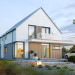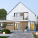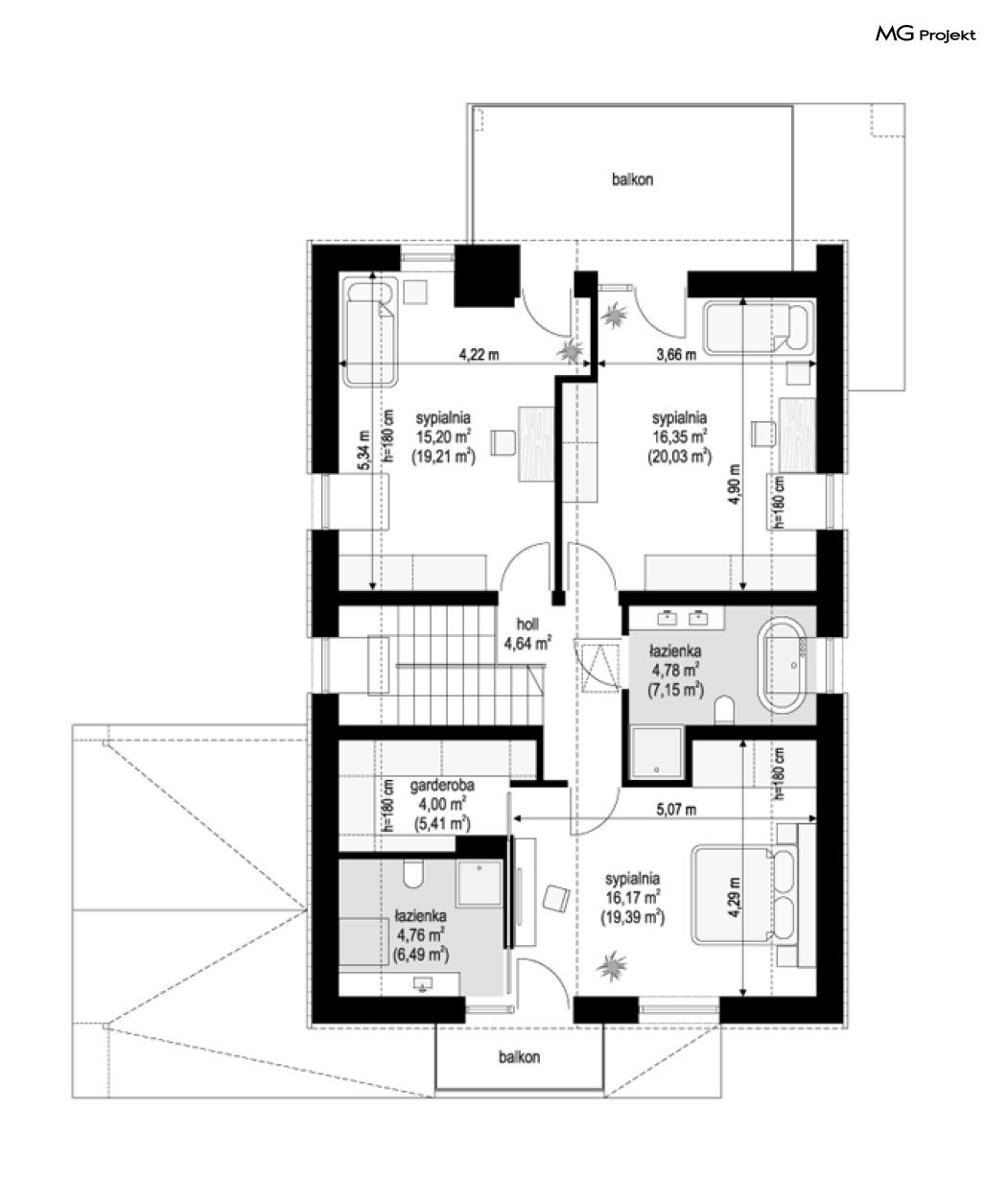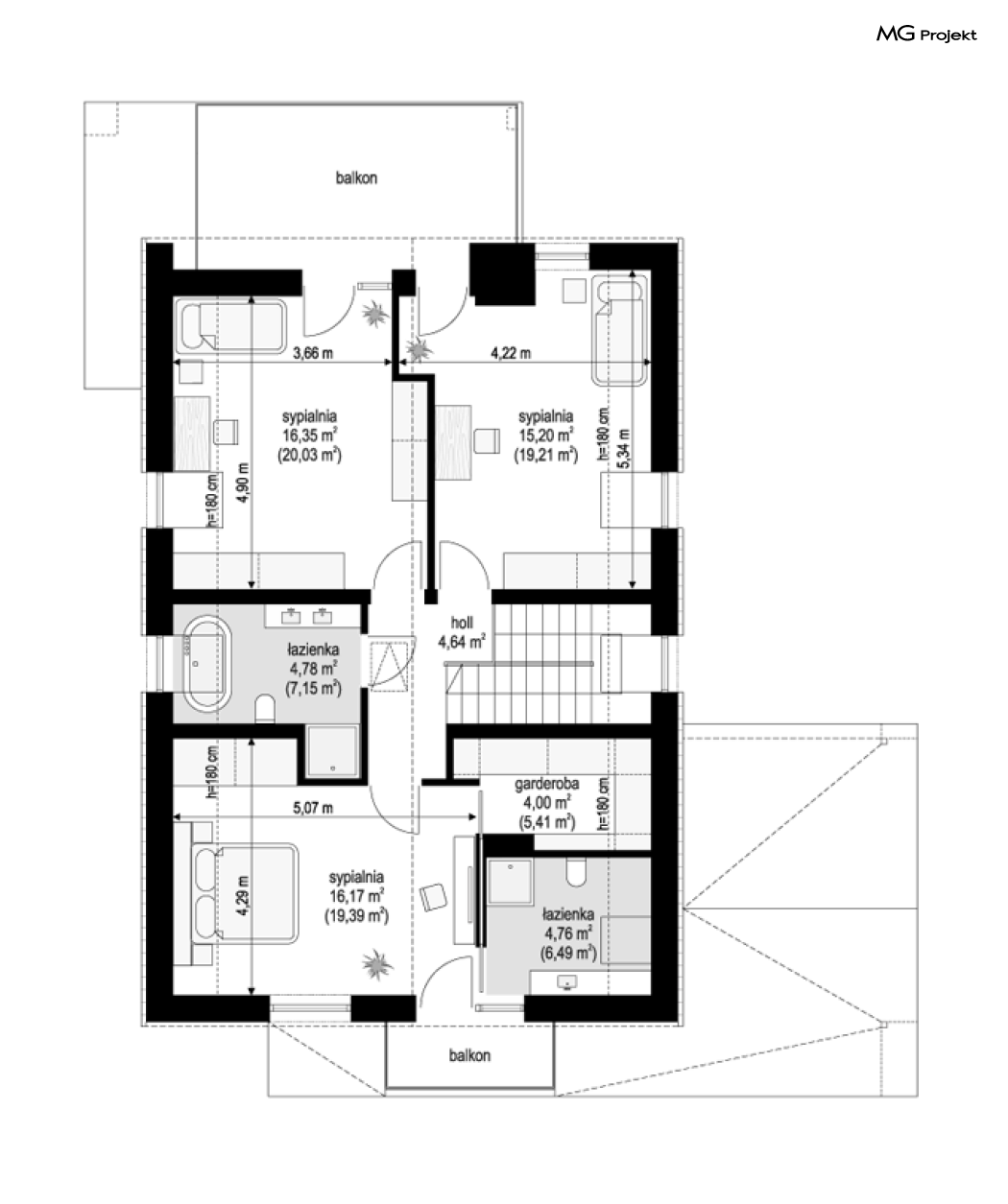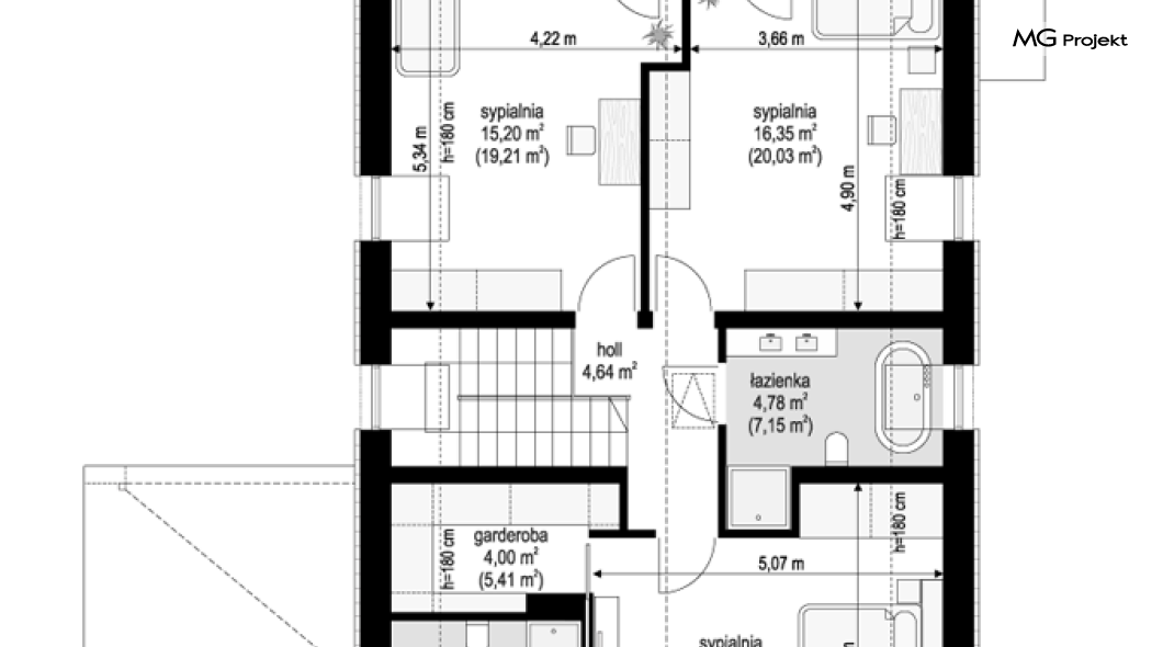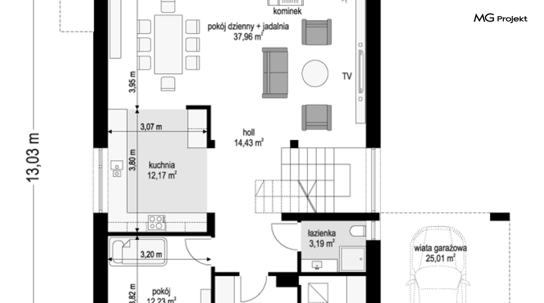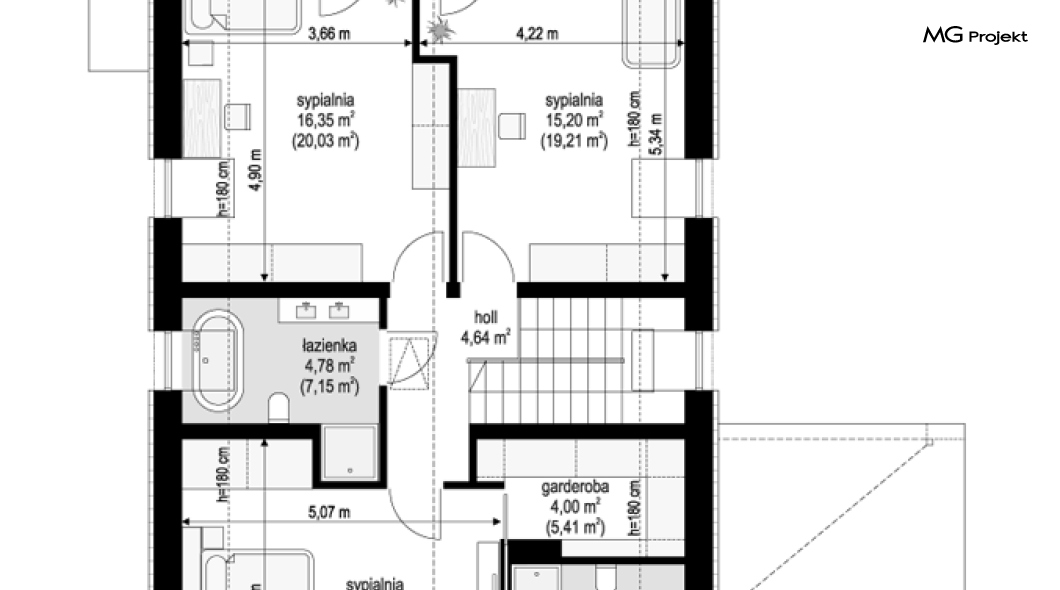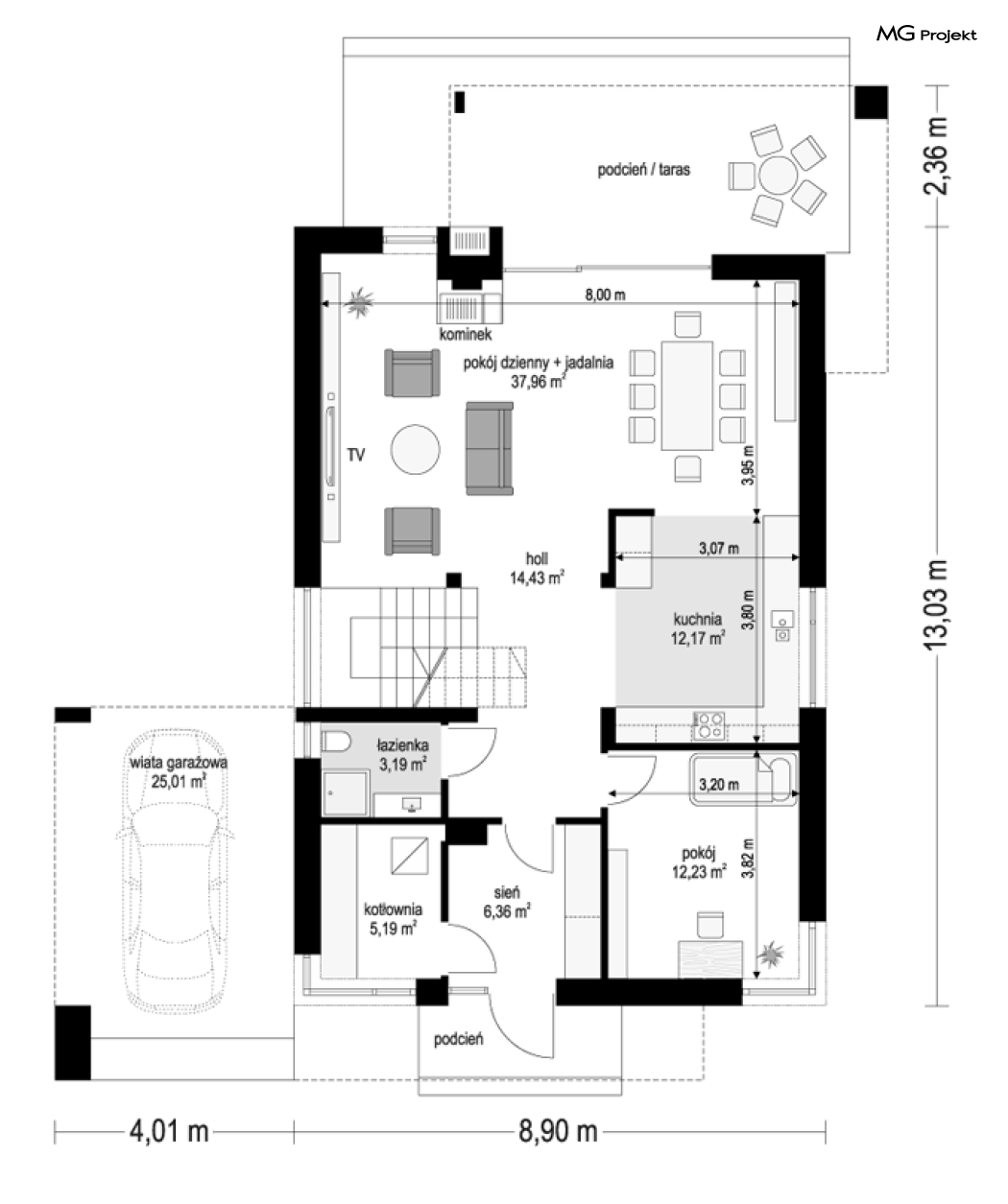 Projekt domu Miejski 3 to projekt domu jednorodzinnego parterowego z poddaszem użytkowym z serii projektów ”Miejski” z naszej pracowni. Budynek na planie prostokąta, przykryty dwuspadowym dachem bez okapów, o bardzo prostej sylwetce, nowoczesnej architekturze i stylistyce „domu-stodoły” - jednak z podniesionymi ścianami kolankowymi, dla zapewnienia maksymalnego wykorzystania powierzchni poddasza użytkowego budynku. Zewnętrzny design budynku to połączenie prostoty, czystości formy i ciekawych architektonicznych detali i smaczków. Elewacje domu podzielono na kontrastujące ze sobą kolorystycznie pola białych tynkowanych ścian, ścian wykończonych szarym tynkiem i fragmentów w pionowej okładzinie drewnianej rombus. Ciekawa kompozycja okien przełamuje monotonię prostopadłościennej bryły. Całość wzbogacają frontowe i ogrodowe zadaszenia, kryjące wiatę garażową, daszek nad podestem wejściowym, oraz zadaszenie części tarasu od strony ogrodowej. Dzięki zachowaniu właściwych proporcji bryły, podziałom elewacji, budynek przyciąga wzrok i ma w sobie coś interesującego – wyróżniającego go spośród wielu podobnych domów z poddaszem. Wnętrze Miejskiego 3 zaprojektowano dzieląc je na część dzienną na parterze i sypialnie na poddaszu. Do domu wchodzimy wygodnym przedsionkiem z szafami do holu i części dziennej. W środkowej części rzutu znajdują się wygodne schody na poddasze widoczne pokoju dziennego. Salon podzielony jest na cześć wypoczynkową - z kanapami, ścianą TV, oraz szerokim przeszkleniem na taras i ogród z wyeksponowanym ozdobnym kominkiem, oraz na jadalnię z dużym stołem i wyjściem na taras przesuwnymi drzwiami HS. Do częściowo otwartej kuchni dostajemy się z holu lub jadalni. Na parterze znajduje się także dodatkowy pokój, łazienka i kotłownia. Na poddaszu zaprojektowane zostały trzy bardzo ładne sypialnie i ogólna łazienka. Dodatkowo sypialnia master posiada własną drugą łazienkę i garderobę. Wnętrze można oczywiście aranżować w dowolny sposób – według koncepcji właścicieli. Nad poddaszem znajduje się sporych rozmiarów stryszek, który można wykorzystać jako magazyn domowych „przydasiów”. W budynku celowo nie przewidziano garażu, wychodząc z założenia, że szkoda jest powierzchni domu na „salon” dla samochodu. Natomiast zaprojektowana została wygodna zadaszona wiata, z daszkiem prowadzącym wprost do drzwi wejściowych domu. Budynek zaprojektowano jako energooszczędny, z dobrymi izolacjami i nowoczesnymi instalacjami. Dom ma prostą konstrukcję i zwartą bryłę, dzięki czemu będzie łatwy w budowie i niedrogi w późniejszej eksploatacji. Miejski 3 to propozycja dla Inwestorów myślących o budowie domu o nowoczesnej architekturze, bezkompromisowym designie. Domu na wskroś praktycznego i funkcjonalnego, który przez wiele lat będzie wymagał minimalnej obsługi, a tego będzie oryginalny, ciekawy architektonicznie i ponadczasowy. Zapraszamy do zapoznania się ze wszystkimi domkami z tej serii: https://www.mgprojekt.com.pl/miejski, https://www.mgprojekt.com.pl/miejski-2, https://www.mgprojekt.com.pl/miejski-3, https://www.mgprojekt.com.pl/miejski-4