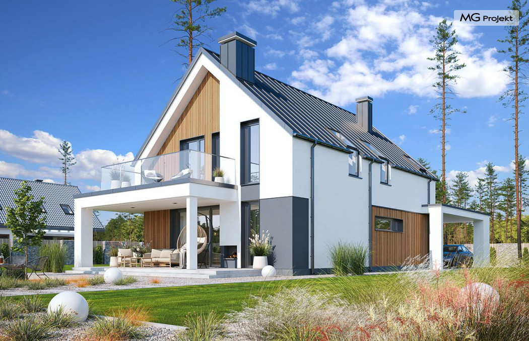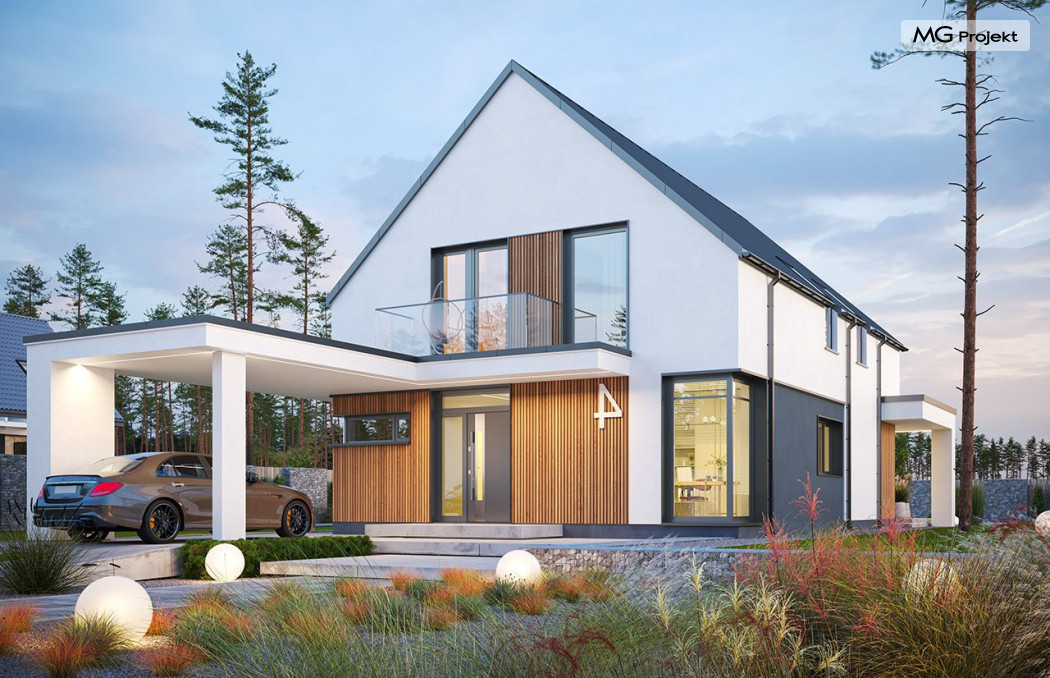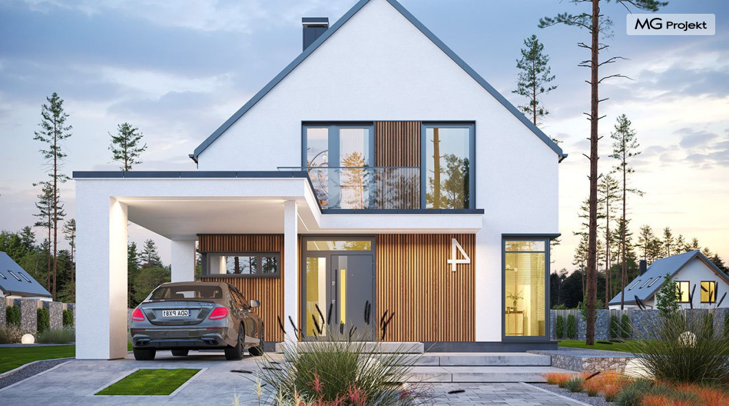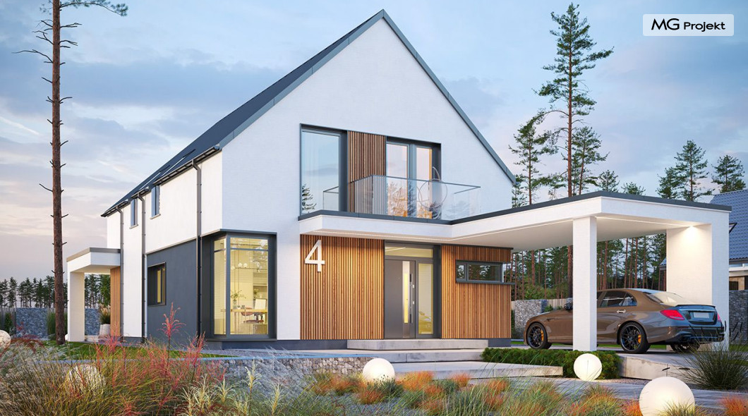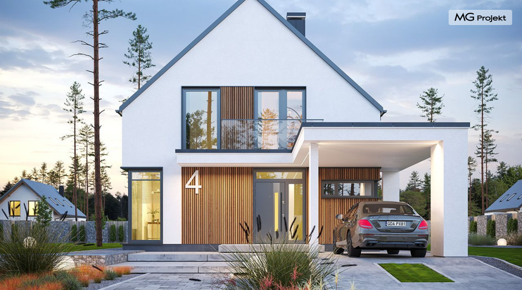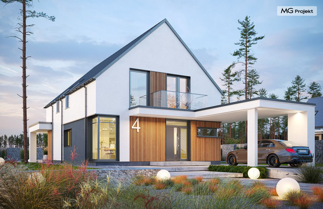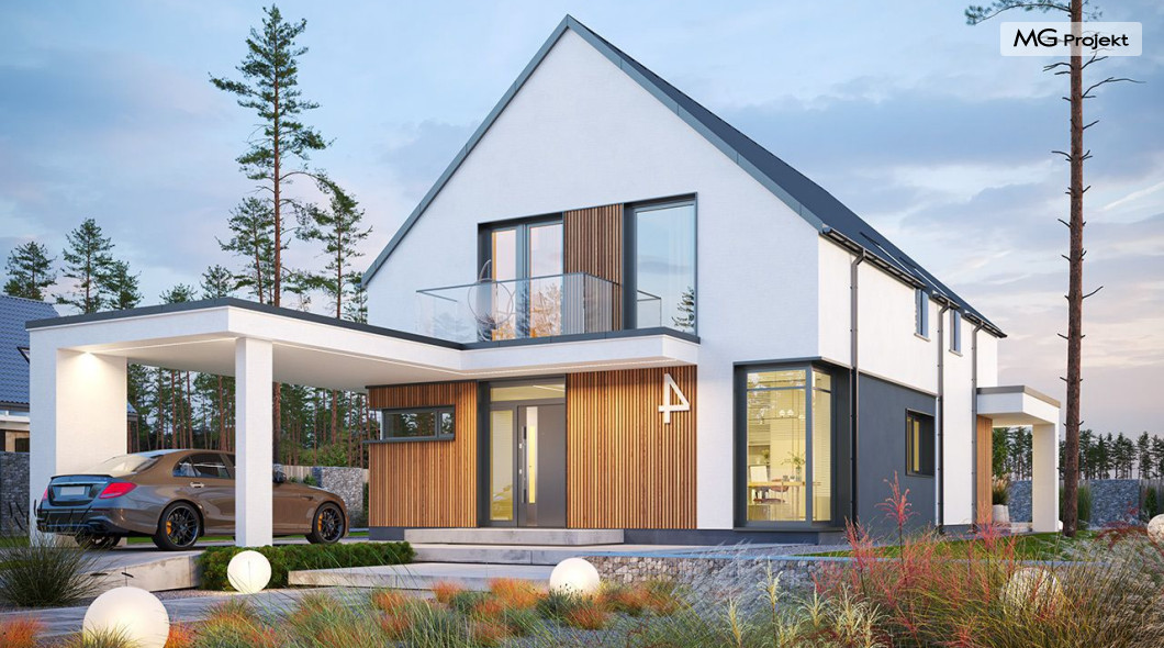 Projekt domu Miejski 4 to projekt z serii projektów ”Miejski” z naszej pracowni. Budynek jednorodzinny parterowy z poddaszem użytkowym zaprojektowany na planie prostokąta, o smukłej sylwetce, nadający się doskonale na wąską parcelę. Dom przykryty jest dwuspadowym dachem bez okapów, o prostej bryle i nowoczesnej architekturze w modnej stylistyce „domu-stodoły”. Dach domu zawieszono dość wysoko na podniesionych ścianach kolankowych, dla zapewnienia maksymalnego wykorzystania powierzchni poddasza użytkowego. Zewnętrzny design domu to połączenie prostoty, czystości formy i ciekawych architektonicznych detali i smaczków. Elewacje podzielono na kontrastujące kolorystycznie pola białych tynkowanych ścian, ścian wykończonych ciemnoszarym tynkiem i fragmentów w pionowej okładzinie drewnianej rombus. Obróbki blacharskie, glify otworów okiennych i ramy okien utrzymano w antracytowym kolorze. Całość kolorystyki domu daje ciekawą, elegancką, czystą architekturę zewnętrzną budynku. Ciekawa kompozycja okien przełamuje monotonię prostopadłościennej bryły. Frontowe i ogrodowe zadaszenia, kryjące wiatę garażową, daszek nad podestem wejściowym, oraz zadaszenie części tarasu od strony ogrodowej, dodatkowo wzbogacają bryłę. Dzięki zachowaniu właściwych proporcji, podziałom elewacji, budynek przyciąga wzrok i ma w sobie coś interesującego – wyróżniającego go spośród wielu podobnych domów z poddaszem. Wnętrze Miejskiego 4 podzielono na część dzienną na parterze i sypialnie na poddaszu. Do domu wchodzimy przez duży przedsionek z szafami do holu i części dziennej. Z holu dostępne są wygodne schody na poddasze użytkowe, widoczne częściowo z pokoju dziennego. Salon podzielony jest na cześć wypoczynkową - z kanapami, ścianą TV, szerokim oknem ogrodowym, ozdobnym kominkiem, oraz jadalnię z dużym stołem i wyjściem na taras przesuwnymi drzwiami. Do przestronnej kuchni dostajemy się z holu lub jadalni. Na parterze zaprojektowano też dodatkowy pokój, łazienkę i kotłownię. Poddasze domu to trzy ładne sypialnie i łazienka. Sypialnia master posiada dodatkowo własną drugą łazienkę i garderobę. Wnętrze można dowolnie aranżować – według koncepcji właścicieli. Nad poddaszem znajduje się sporych rozmiarów strych, do wykorzystania jako domowy magazyn. W budynku nie przewidziano garażu, wychodząc z założenia, że szkoda jest powierzchni domu na „salon” dla samochodu. Natomiast zaprojektowana została zadaszona wiata na samochód, z daszkiem prowadzącym wprost do drzwi wejściowych domu. Budynek zaprojektowano jako energooszczędny, z dobrymi izolacjami i nowoczesnymi instalacjami. Dom ma prostą konstrukcję i zwartą bryłę, dzięki czemu będzie łatwy w budowie i niedrogi w późniejszej eksploatacji. Miejski 4 to bardzo dobra propozycja dla Inwestorów planujących budowę energooszczędnego nowoczesnego domu jednorodzinnego, o nieprzesadzonej skali, jednocześnie funkcjonalnego, o atrakcyjnym przyciągającym wzrok wyglądzie. Domu na wskroś praktycznego, który przez wiele lat będzie wymagał minimalnej obsługi, a tego będzie oryginalny, ciekawy architektonicznie i ponadczasowy. Zapraszamy do zapoznania się ze wszystkimi domkami z tej serii: https://www.mgprojekt.com.pl/miejski, https://www.mgprojekt.com.pl/miejski-2, https://www.mgprojekt.com.pl/miejski-3, https://www.mgprojekt.com.pl/miejski-4