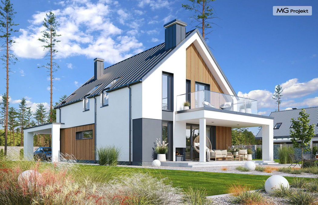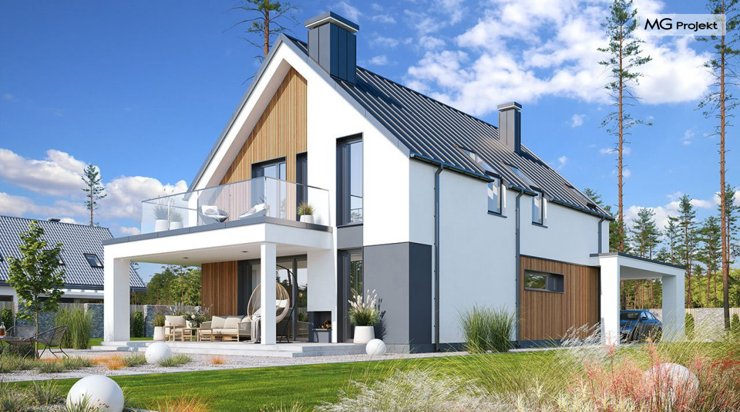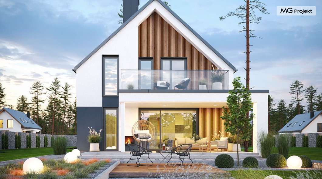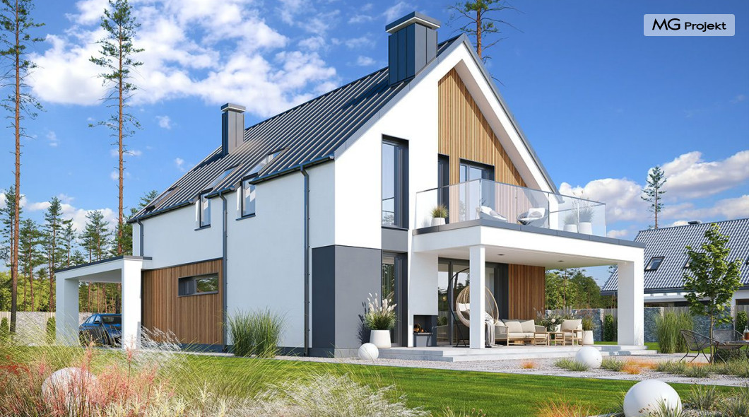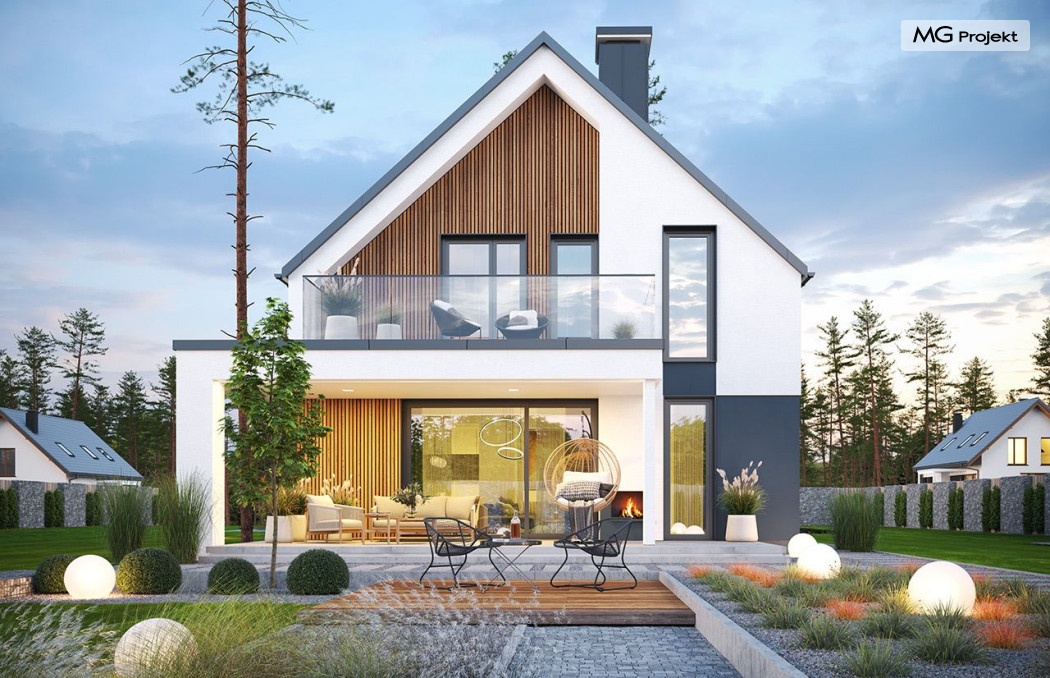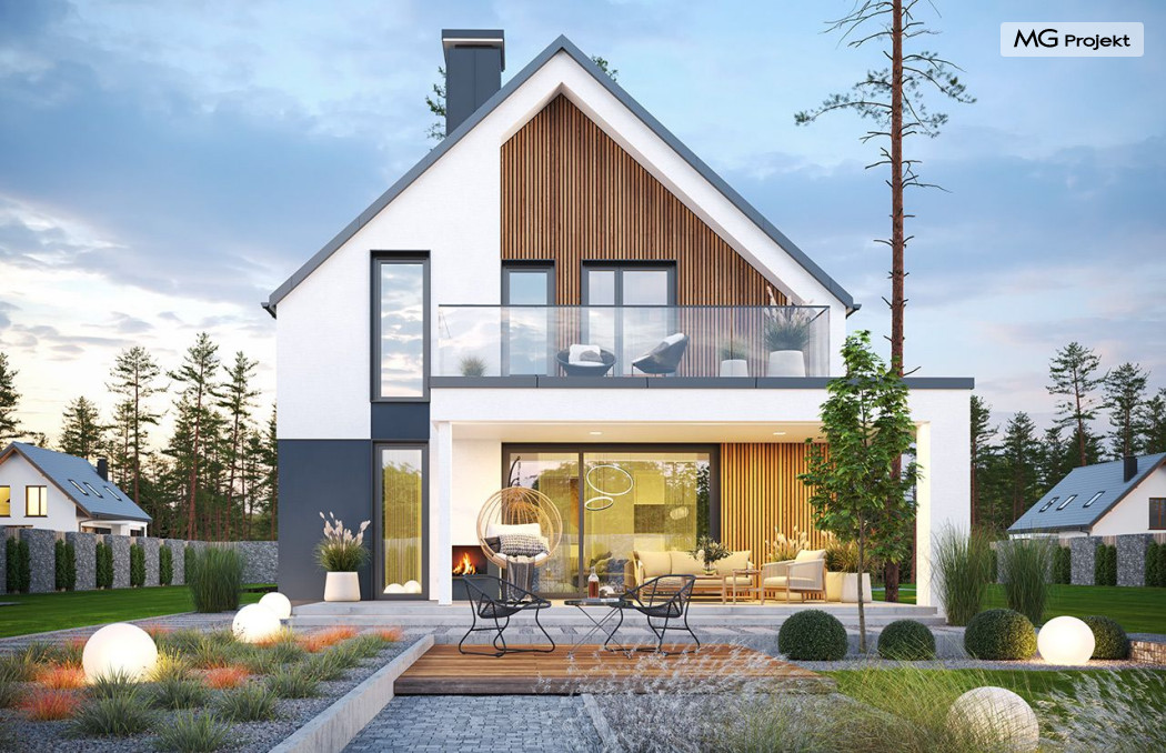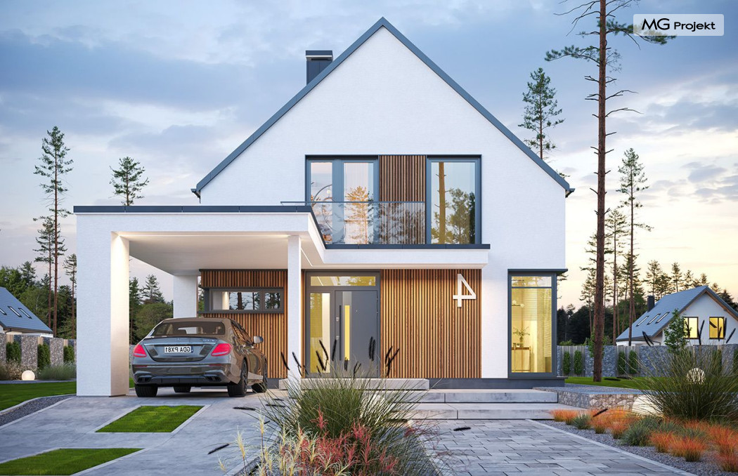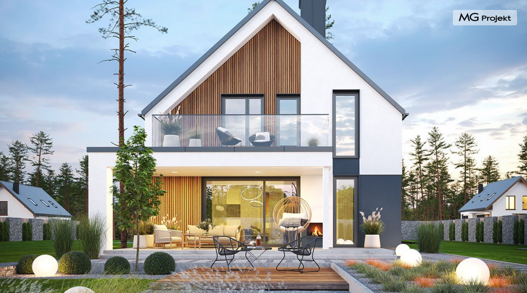 Projekt domu Miejski 4 to projekt z serii projektów ”Miejski” z naszej pracowni. Budynek jednorodzinny parterowy z poddaszem użytkowym zaprojektowany na planie prostokąta, o smukłej sylwetce, nadający się doskonale na wąską parcelę. Dom przykryty jest dwuspadowym dachem bez okapów, o prostej bryle i nowoczesnej architekturze w modnej stylistyce „domu-stodoły”. Dach domu zawieszono dość wysoko na podniesionych ścianach kolankowych, dla zapewnienia maksymalnego wykorzystania powierzchni poddasza użytkowego. Zewnętrzny design domu to połączenie prostoty, czystości formy i ciekawych architektonicznych detali i smaczków. Elewacje podzielono na kontrastujące kolorystycznie pola białych tynkowanych ścian, ścian wykończonych ciemnoszarym tynkiem i fragmentów w pionowej okładzinie drewnianej rombus. Obróbki blacharskie, glify otworów okiennych i ramy okien utrzymano w antracytowym kolorze. Całość kolorystyki domu daje ciekawą, elegancką, czystą architekturę zewnętrzną budynku. Ciekawa kompozycja okien przełamuje monotonię prostopadłościennej bryły. Frontowe i ogrodowe zadaszenia, kryjące wiatę garażową, daszek nad podestem wejściowym, oraz zadaszenie części tarasu od strony ogrodowej, dodatkowo wzbogacają bryłę. Dzięki zachowaniu właściwych proporcji, podziałom elewacji, budynek przyciąga wzrok i ma w sobie coś interesującego – wyróżniającego go spośród wielu podobnych domów z poddaszem. Wnętrze Miejskiego 4 podzielono na część dzienną na parterze i sypialnie na poddaszu. Do domu wchodzimy przez duży przedsionek z szafami do holu i części dziennej. Z holu dostępne są wygodne schody na poddasze użytkowe, widoczne częściowo z pokoju dziennego. Salon podzielony jest na cześć wypoczynkową - z kanapami, ścianą TV, szerokim oknem ogrodowym, ozdobnym kominkiem, oraz jadalnię z dużym stołem i wyjściem na taras przesuwnymi drzwiami. Do przestronnej kuchni dostajemy się z holu lub jadalni. Na parterze zaprojektowano też dodatkowy pokój, łazienkę i kotłownię. Poddasze domu to trzy ładne sypialnie i łazienka. Sypialnia master posiada dodatkowo własną drugą łazienkę i garderobę. Wnętrze można dowolnie aranżować – według koncepcji właścicieli. Nad poddaszem znajduje się sporych rozmiarów strych, do wykorzystania jako domowy magazyn. W budynku nie przewidziano garażu, wychodząc z założenia, że szkoda jest powierzchni domu na „salon” dla samochodu. Natomiast zaprojektowana została zadaszona wiata na samochód, z daszkiem prowadzącym wprost do drzwi wejściowych domu. Budynek zaprojektowano jako energooszczędny, z dobrymi izolacjami i nowoczesnymi instalacjami. Dom ma prostą konstrukcję i zwartą bryłę, dzięki czemu będzie łatwy w budowie i niedrogi w późniejszej eksploatacji. Miejski 4 to bardzo dobra propozycja dla Inwestorów planujących budowę energooszczędnego nowoczesnego domu jednorodzinnego, o nieprzesadzonej skali, jednocześnie funkcjonalnego, o atrakcyjnym przyciągającym wzrok wyglądzie. Domu na wskroś praktycznego, który przez wiele lat będzie wymagał minimalnej obsługi, a tego będzie oryginalny, ciekawy architektonicznie i ponadczasowy. Zapraszamy do zapoznania się ze wszystkimi domkami z tej serii: https://www.mgprojekt.com.pl/miejski, https://www.mgprojekt.com.pl/miejski-2, https://www.mgprojekt.com.pl/miejski-3, https://www.mgprojekt.com.pl/miejski-4