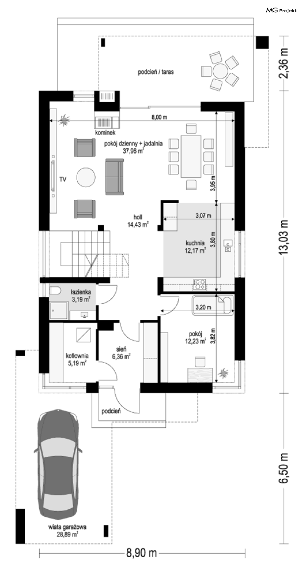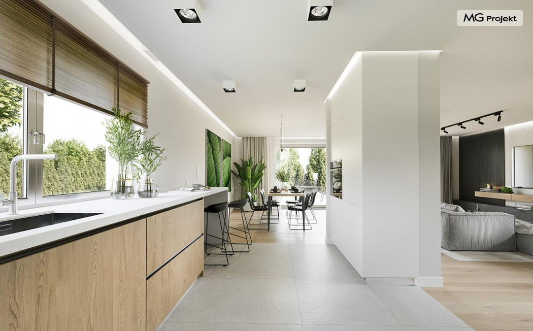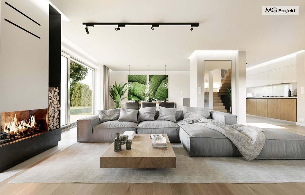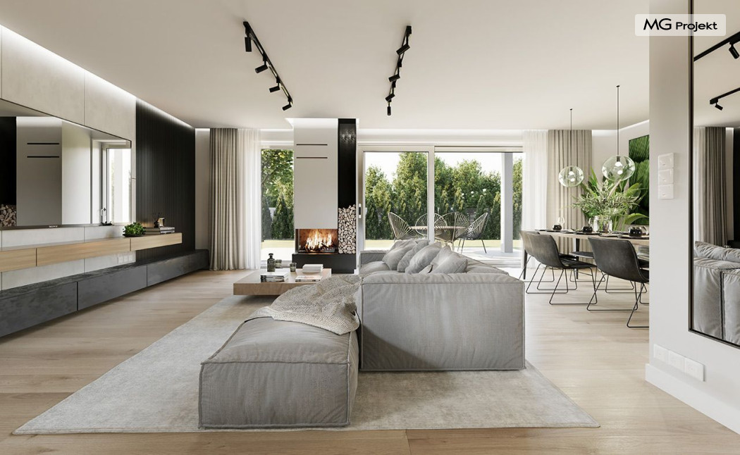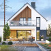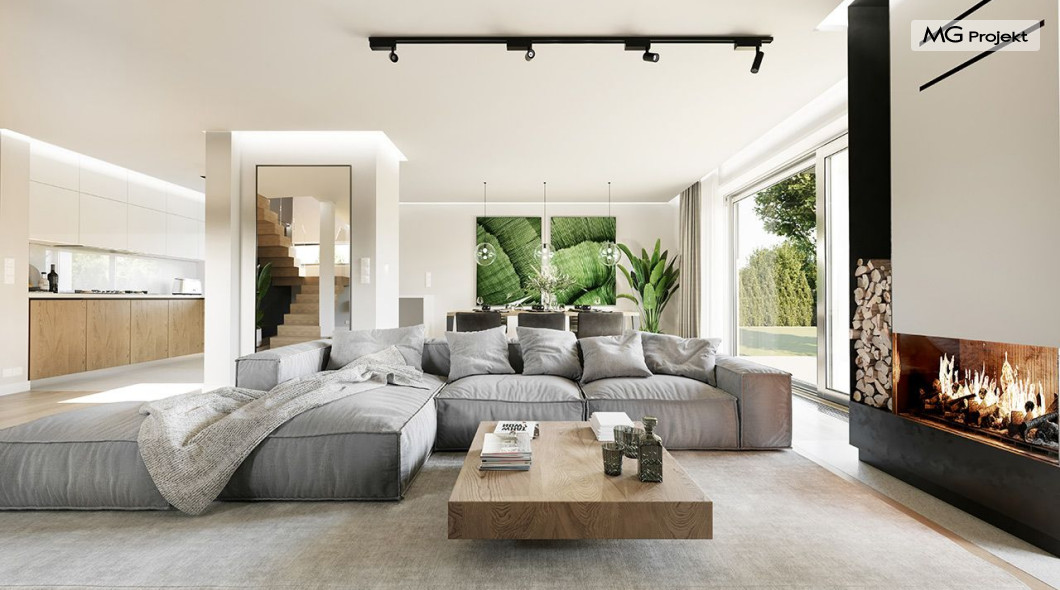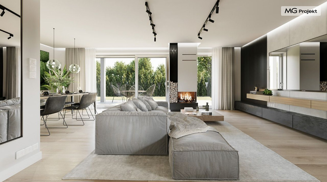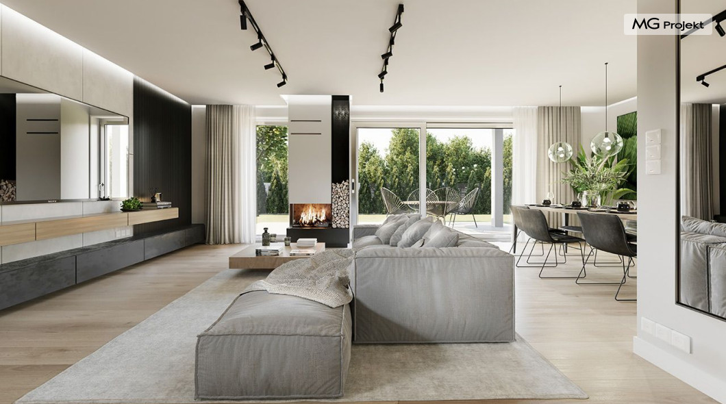 Projekt domu Miejski 4 to projekt z serii projektów ”Miejski” z naszej pracowni. Budynek jednorodzinny parterowy z poddaszem użytkowym zaprojektowany na planie prostokąta, o smukłej sylwetce, nadający się doskonale na wąską parcelę. Dom przykryty jest dwuspadowym dachem bez okapów, o prostej bryle i nowoczesnej architekturze w modnej stylistyce „domu-stodoły”. Dach domu zawieszono dość wysoko na podniesionych ścianach kolankowych, dla zapewnienia maksymalnego wykorzystania powierzchni poddasza użytkowego. Zewnętrzny design domu to połączenie prostoty, czystości formy i ciekawych architektonicznych detali i smaczków. Elewacje podzielono na kontrastujące kolorystycznie pola białych tynkowanych ścian, ścian wykończonych ciemnoszarym tynkiem i fragmentów w pionowej okładzinie drewnianej rombus. Obróbki blacharskie, glify otworów okiennych i ramy okien utrzymano w antracytowym kolorze. Całość kolorystyki domu daje ciekawą, elegancką, czystą architekturę zewnętrzną budynku. Ciekawa kompozycja okien przełamuje monotonię prostopadłościennej bryły. Frontowe i ogrodowe zadaszenia, kryjące wiatę garażową, daszek nad podestem wejściowym, oraz zadaszenie części tarasu od strony ogrodowej, dodatkowo wzbogacają bryłę. Dzięki zachowaniu właściwych proporcji, podziałom elewacji, budynek przyciąga wzrok i ma w sobie coś interesującego – wyróżniającego go spośród wielu podobnych domów z poddaszem. Wnętrze Miejskiego 4 podzielono na część dzienną na parterze i sypialnie na poddaszu. Do domu wchodzimy przez duży przedsionek z szafami do holu i części dziennej. Z holu dostępne są wygodne schody na poddasze użytkowe, widoczne częściowo z pokoju dziennego. Salon podzielony jest na cześć wypoczynkową - z kanapami, ścianą TV, szerokim oknem ogrodowym, ozdobnym kominkiem, oraz jadalnię z dużym stołem i wyjściem na taras przesuwnymi drzwiami. Do przestronnej kuchni dostajemy się z holu lub jadalni. Na parterze zaprojektowano też dodatkowy pokój, łazienkę i kotłownię. Poddasze domu to trzy ładne sypialnie i łazienka. Sypialnia master posiada dodatkowo własną drugą łazienkę i garderobę. Wnętrze można dowolnie aranżować – według koncepcji właścicieli. Nad poddaszem znajduje się sporych rozmiarów strych, do wykorzystania jako domowy magazyn. W budynku nie przewidziano garażu, wychodząc z założenia, że szkoda jest powierzchni domu na „salon” dla samochodu. Natomiast zaprojektowana została zadaszona wiata na samochód, z daszkiem prowadzącym wprost do drzwi wejściowych domu. Budynek zaprojektowano jako energooszczędny, z dobrymi izolacjami i nowoczesnymi instalacjami. Dom ma prostą konstrukcję i zwartą bryłę, dzięki czemu będzie łatwy w budowie i niedrogi w późniejszej eksploatacji. Miejski 4 to bardzo dobra propozycja dla Inwestorów planujących budowę energooszczędnego nowoczesnego domu jednorodzinnego, o nieprzesadzonej skali, jednocześnie funkcjonalnego, o atrakcyjnym przyciągającym wzrok wyglądzie. Domu na wskroś praktycznego, który przez wiele lat będzie wymagał minimalnej obsługi, a tego będzie oryginalny, ciekawy architektonicznie i ponadczasowy. Zapraszamy do zapoznania się ze wszystkimi domkami z tej serii: https://www.mgprojekt.com.pl/miejski, https://www.mgprojekt.com.pl/miejski-2, https://www.mgprojekt.com.pl/miejski-3, https://www.mgprojekt.com.pl/miejski-4
