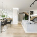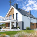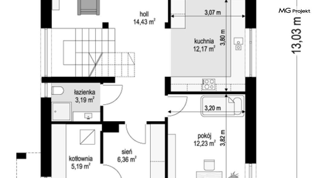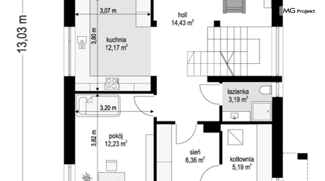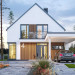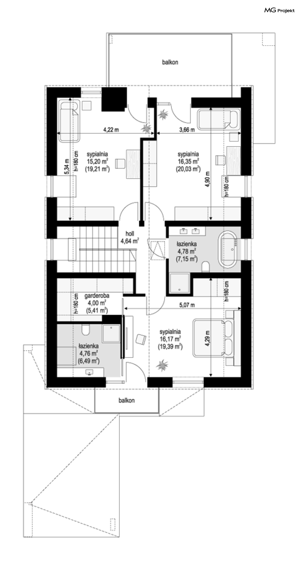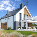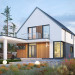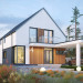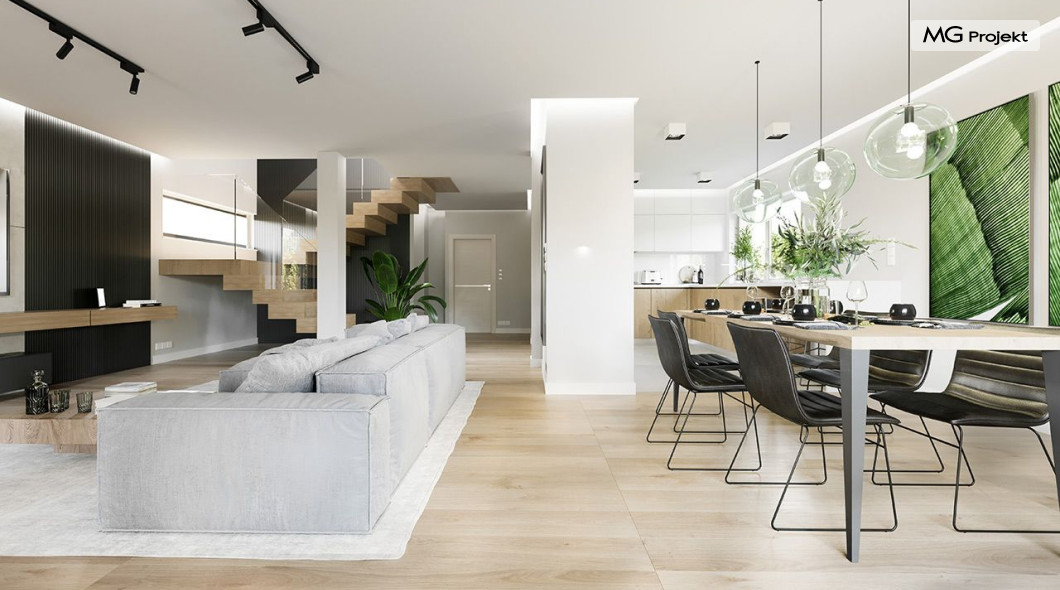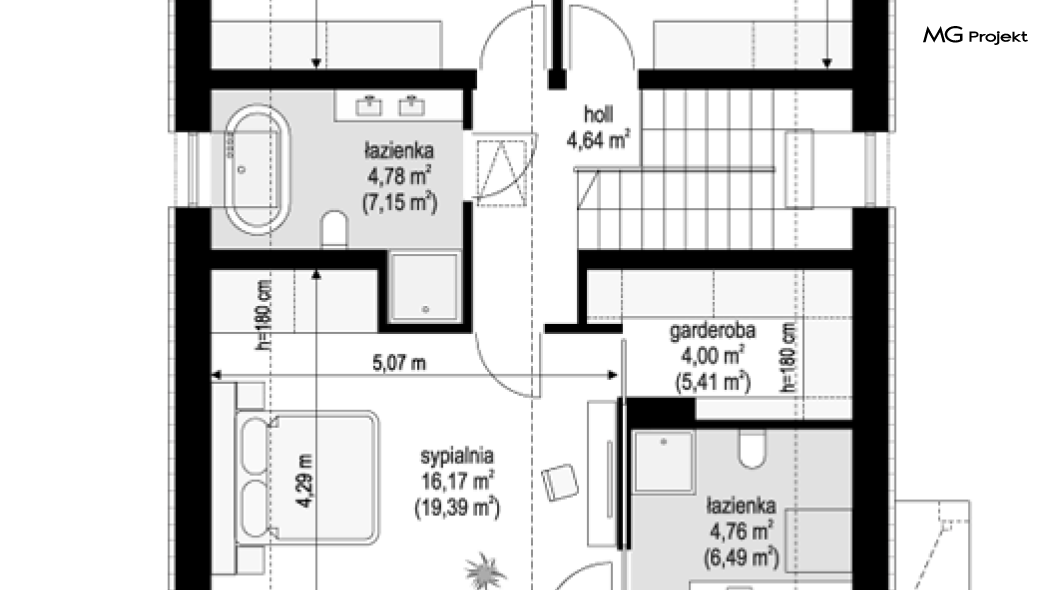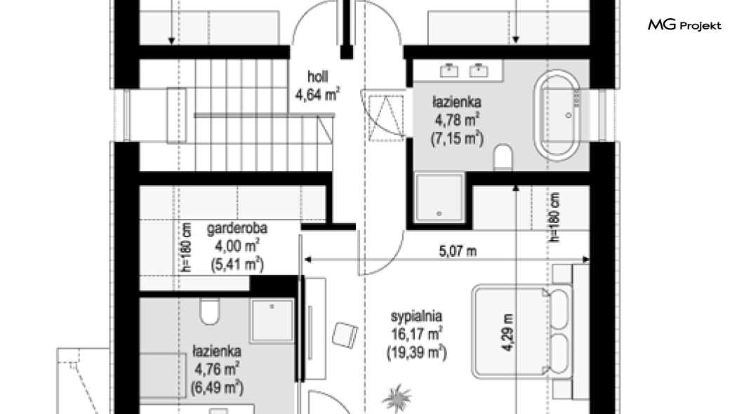 Projekt domu Miejski 4 to projekt z serii projektów ”Miejski” z naszej pracowni. Budynek jednorodzinny parterowy z poddaszem użytkowym zaprojektowany na planie prostokąta, o smukłej sylwetce, nadający się doskonale na wąską parcelę. Dom przykryty jest dwuspadowym dachem bez okapów, o prostej bryle i nowoczesnej architekturze w modnej stylistyce „domu-stodoły”. Dach domu zawieszono dość wysoko na podniesionych ścianach kolankowych, dla zapewnienia maksymalnego wykorzystania powierzchni poddasza użytkowego. Zewnętrzny design domu to połączenie prostoty, czystości formy i ciekawych architektonicznych detali i smaczków. Elewacje podzielono na kontrastujące kolorystycznie pola białych tynkowanych ścian, ścian wykończonych ciemnoszarym tynkiem i fragmentów w pionowej okładzinie drewnianej rombus. Obróbki blacharskie, glify otworów okiennych i ramy okien utrzymano w antracytowym kolorze. Całość kolorystyki domu daje ciekawą, elegancką, czystą architekturę zewnętrzną budynku. Ciekawa kompozycja okien przełamuje monotonię prostopadłościennej bryły. Frontowe i ogrodowe zadaszenia, kryjące wiatę garażową, daszek nad podestem wejściowym, oraz zadaszenie części tarasu od strony ogrodowej, dodatkowo wzbogacają bryłę. Dzięki zachowaniu właściwych proporcji, podziałom elewacji, budynek przyciąga wzrok i ma w sobie coś interesującego – wyróżniającego go spośród wielu podobnych domów z poddaszem. Wnętrze Miejskiego 4 podzielono na część dzienną na parterze i sypialnie na poddaszu. Do domu wchodzimy przez duży przedsionek z szafami do holu i części dziennej. Z holu dostępne są wygodne schody na poddasze użytkowe, widoczne częściowo z pokoju dziennego. Salon podzielony jest na cześć wypoczynkową - z kanapami, ścianą TV, szerokim oknem ogrodowym, ozdobnym kominkiem, oraz jadalnię z dużym stołem i wyjściem na taras przesuwnymi drzwiami. Do przestronnej kuchni dostajemy się z holu lub jadalni. Na parterze zaprojektowano też dodatkowy pokój, łazienkę i kotłownię. Poddasze domu to trzy ładne sypialnie i łazienka. Sypialnia master posiada dodatkowo własną drugą łazienkę i garderobę. Wnętrze można dowolnie aranżować – według koncepcji właścicieli. Nad poddaszem znajduje się sporych rozmiarów strych, do wykorzystania jako domowy magazyn. W budynku nie przewidziano garażu, wychodząc z założenia, że szkoda jest powierzchni domu na „salon” dla samochodu. Natomiast zaprojektowana została zadaszona wiata na samochód, z daszkiem prowadzącym wprost do drzwi wejściowych domu. Budynek zaprojektowano jako energooszczędny, z dobrymi izolacjami i nowoczesnymi instalacjami. Dom ma prostą konstrukcję i zwartą bryłę, dzięki czemu będzie łatwy w budowie i niedrogi w późniejszej eksploatacji. Miejski 4 to bardzo dobra propozycja dla Inwestorów planujących budowę energooszczędnego nowoczesnego domu jednorodzinnego, o nieprzesadzonej skali, jednocześnie funkcjonalnego, o atrakcyjnym przyciągającym wzrok wyglądzie. Domu na wskroś praktycznego, który przez wiele lat będzie wymagał minimalnej obsługi, a tego będzie oryginalny, ciekawy architektonicznie i ponadczasowy. Zapraszamy do zapoznania się ze wszystkimi domkami z tej serii: https://www.mgprojekt.com.pl/miejski, https://www.mgprojekt.com.pl/miejski-2, https://www.mgprojekt.com.pl/miejski-3, https://www.mgprojekt.com.pl/miejski-4