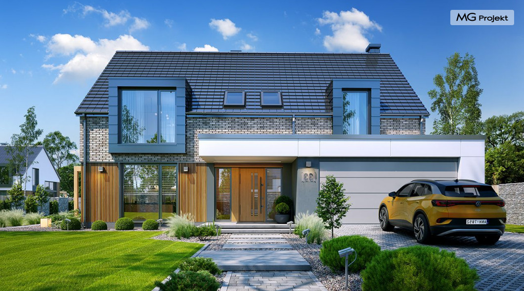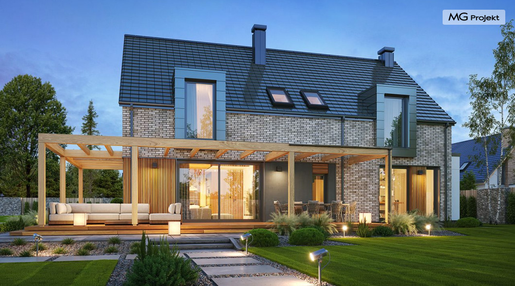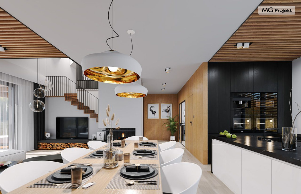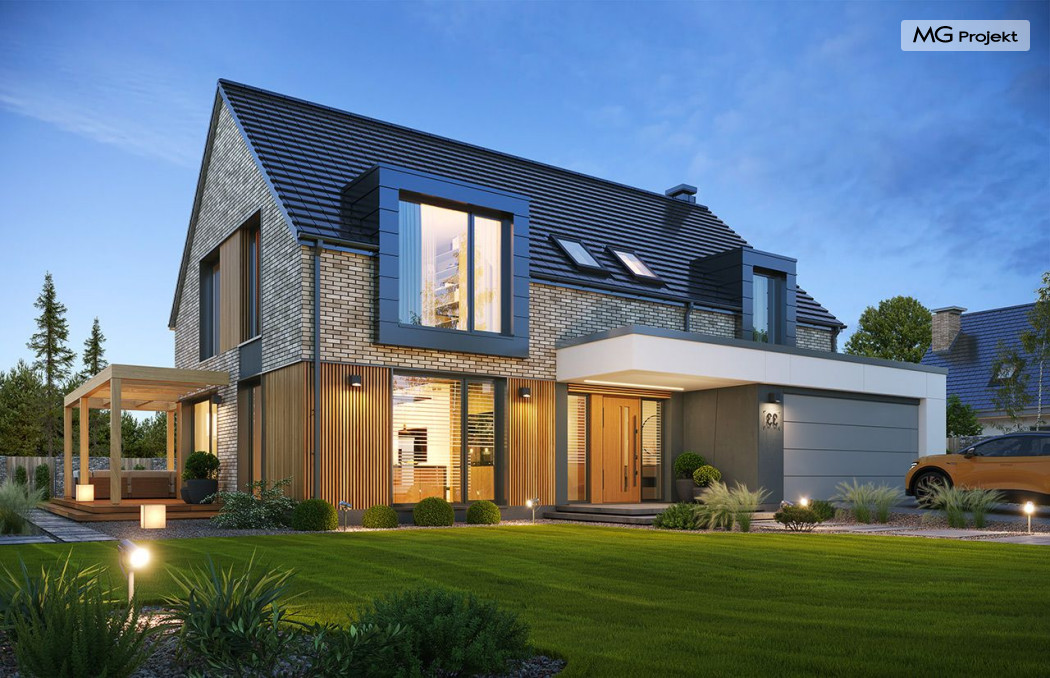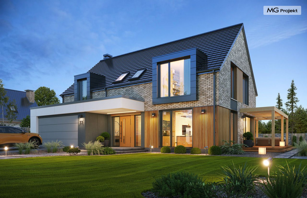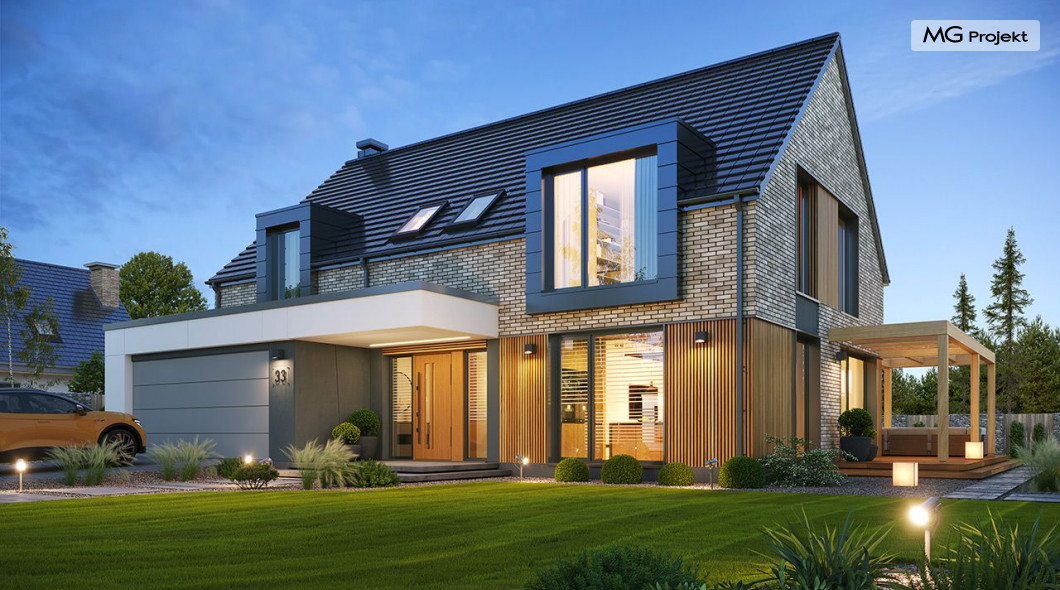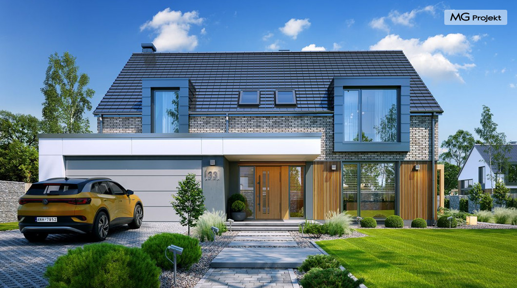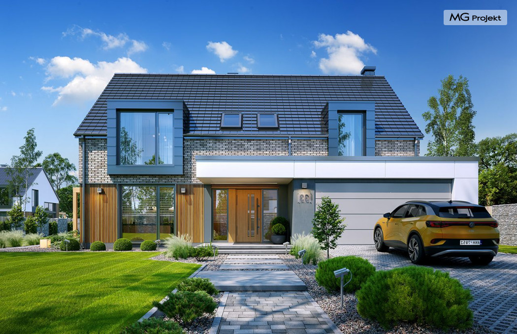 Projekt domu Bolero to projekt domu jednorodzinnego - z naszej serii taneczno-imprezowych domów (Mambo, Lambada, Makarena, Party, Biba, Tango, Salsa, Rumba). Bolero to propozycja praktycznego, funkcjonalnego domu jednorodzinnego, parterowego z poddaszem użytkowym, o nowoczesnej architekturze, w popularnej stylistyce domu-stodoły. Budynek wyróżnia zwarta bryła, nowoczesne detale architektoniczne i funkcjonalne wnętrze. Prostokątny plan, z wbudowanym częściowo garażem przykryto dwuspadowym symetrycznym dachem z wysoką ścianą kolankową poddasza. Sylwetkę domu urozmaicono kubicznymi lukarnami poddasza, a całą fasadę podzielono na poziome pasy wykończone kontrastującymi materiałami. Propozycja elewacji to miks płytki klinkierowej, z fragmentami wykończenia drewnem, oraz tynku. Całość kompozycji zwieńcza dach pokryty płaską dachówką. Oczywiście to jedna z możliwych opcji wykończenia domu od zewnątrz – wszystko zależy od inwencji, wyobraźni i preferencji przyszłych właścicieli. Elewację frontową podkreśla reprezentacyjne wejście z szerokimi drzwiami z naświetlami bocznymi, piękne duże okno kuchni z wyspą, oraz lukarny poddasza z dużymi przeszkleniami. Od strony ogrodowej dom ma spokojniejszą bardziej jednorodną fasadę, z dużymi narożnymi przeszkleniami części dziennej i dodaną pergolą zadaszającą taras ogrodowy. Wnętrze domu zaskakuje poczuciem przestrzeni, niełatwym do uzyskania w 150-metrowym domu. Poczucie przestronności części dziennej potęgują duże przeszklenia salonu na taras, oraz pustka nad salonem i schodami, łącząca pokój dzienny z antresolą na poddaszu. Wnętrze jest bardzo nowoczesne. Przykładem może tu być niebanalna kuchnia z dużą wyspą i oryginalnym baletem roboczym przy oknie. Na parterze prócz salonu zaprojektowano dodatkowy pokój z łazienką, oraz garaż z pomieszczeniem technicznym. Na poddaszu przewidziano cztery pokoje z dwiema łazienkami, w tym apartament master z własną łazienką i garderobą. Wnętrze można dowolnie kształtować, ale bez problemu zmieści się tutaj 4-6cioosobowa rodzina. Budynek zaprojektowano jako energooszczędny, z dobrymi izolacjami i nowoczesnymi instalacjami. Dom ma prostą konstrukcję i zwartą bryłę, dzięki czemu będzie łatwy w budowie i niedrogi w późniejszej eksploatacji. Bolero to propozycja dla Inwestorów pragnących zbudować nowoczesny, nietuzinkowy i ciekawy architektonicznie dom o nieprzesadzonej wielkości. Dom dla Inwestorów chcących połączyć tradycyjną funkcjonalność z ciekawymi designerskimi detalami. Zapraszamy do zapoznania się z całą serią "roztańczonych domów": https://www.mgprojekt.com.pl/makarena, https://www.mgprojekt.com.pl/bolero, https://www.mgprojekt.com.pl/lambada, https://www.mgprojekt.com.pl/party, https://www.mgprojekt.com.pl/party-2, https://www.mgprojekt.com.pl/biba, https://www.mgprojekt.com.pl/tango, https://www.mgprojekt.com.pl/salsa, https://www.mgprojekt.com.pl/rumba, https://www.mgprojekt.com.pl/mambo.