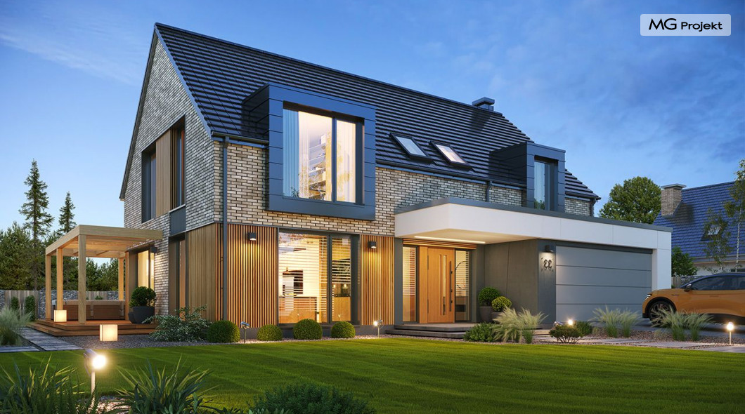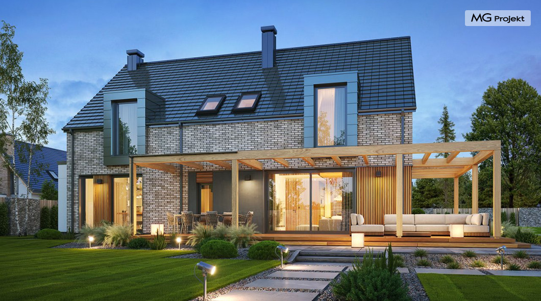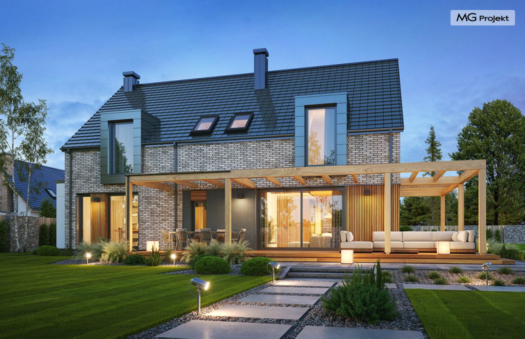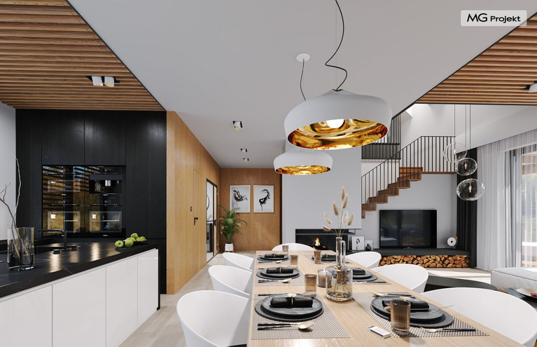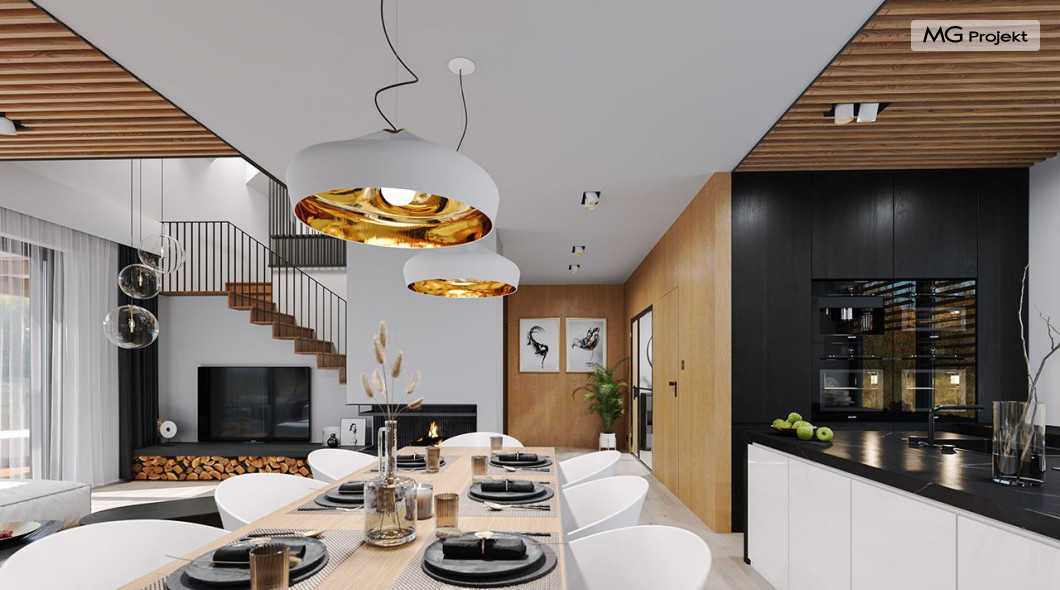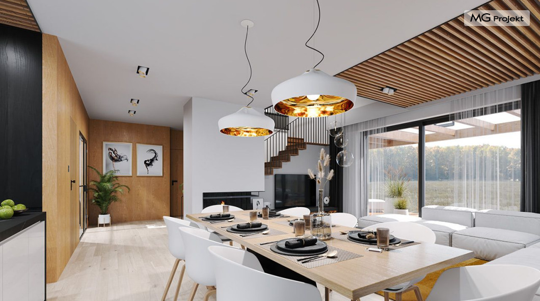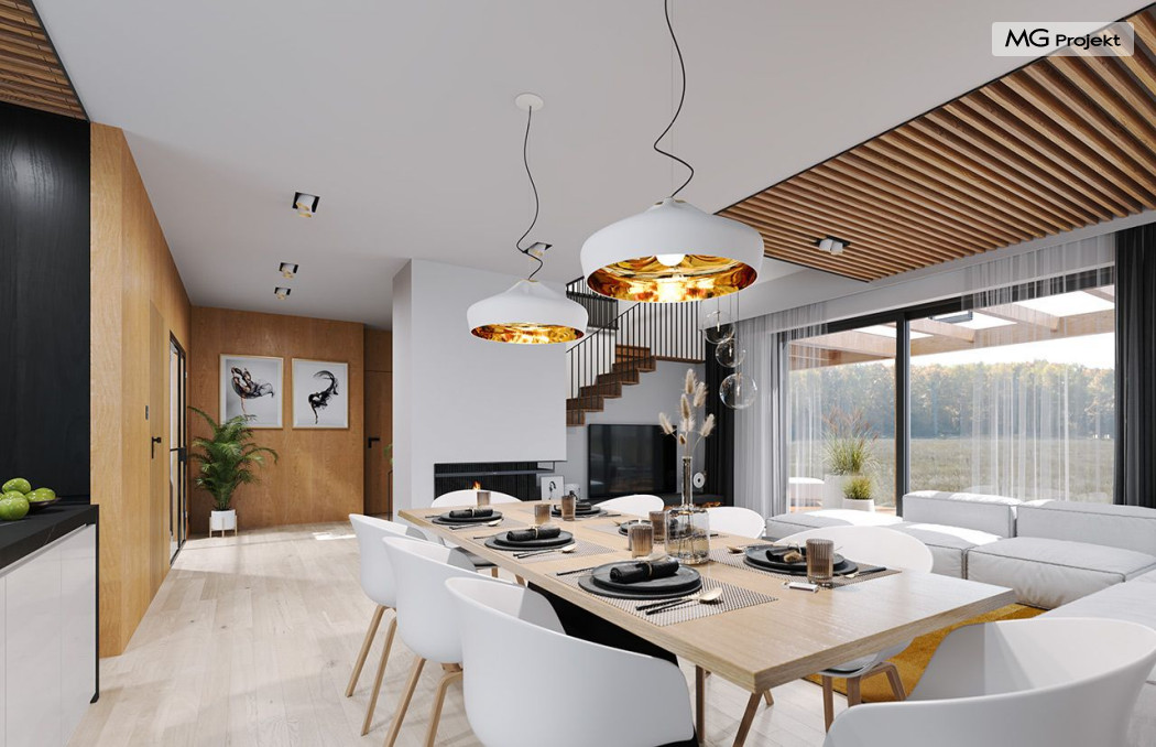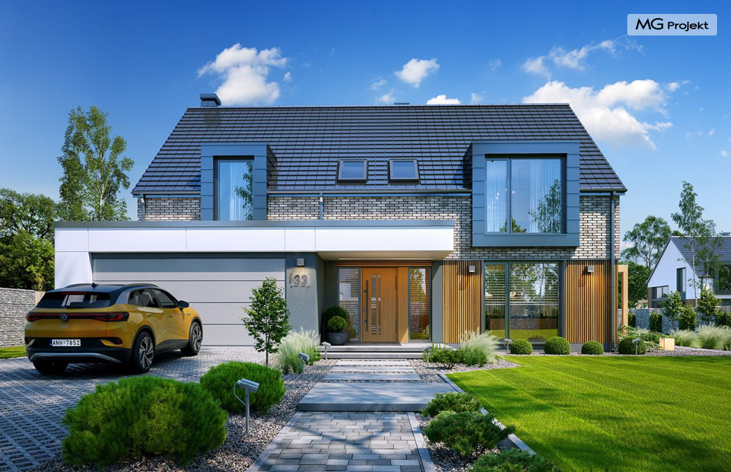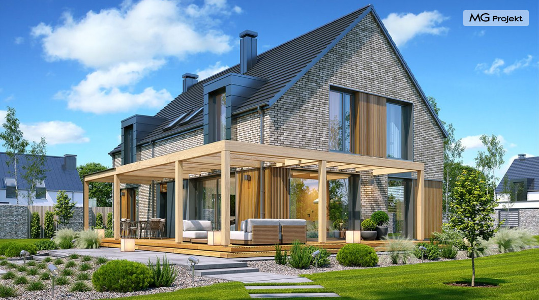 Projekt domu Bolero to projekt domu jednorodzinnego - z naszej serii taneczno-imprezowych domów (Mambo, Lambada, Makarena, Party, Biba, Tango, Salsa, Rumba). Bolero to propozycja praktycznego, funkcjonalnego domu jednorodzinnego, parterowego z poddaszem użytkowym, o nowoczesnej architekturze, w popularnej stylistyce domu-stodoły. Budynek wyróżnia zwarta bryła, nowoczesne detale architektoniczne i funkcjonalne wnętrze. Prostokątny plan, z wbudowanym częściowo garażem przykryto dwuspadowym symetrycznym dachem z wysoką ścianą kolankową poddasza. Sylwetkę domu urozmaicono kubicznymi lukarnami poddasza, a całą fasadę podzielono na poziome pasy wykończone kontrastującymi materiałami. Propozycja elewacji to miks płytki klinkierowej, z fragmentami wykończenia drewnem, oraz tynku. Całość kompozycji zwieńcza dach pokryty płaską dachówką. Oczywiście to jedna z możliwych opcji wykończenia domu od zewnątrz – wszystko zależy od inwencji, wyobraźni i preferencji przyszłych właścicieli. Elewację frontową podkreśla reprezentacyjne wejście z szerokimi drzwiami z naświetlami bocznymi, piękne duże okno kuchni z wyspą, oraz lukarny poddasza z dużymi przeszkleniami. Od strony ogrodowej dom ma spokojniejszą bardziej jednorodną fasadę, z dużymi narożnymi przeszkleniami części dziennej i dodaną pergolą zadaszającą taras ogrodowy. Wnętrze domu zaskakuje poczuciem przestrzeni, niełatwym do uzyskania w 150-metrowym domu. Poczucie przestronności części dziennej potęgują duże przeszklenia salonu na taras, oraz pustka nad salonem i schodami, łącząca pokój dzienny z antresolą na poddaszu. Wnętrze jest bardzo nowoczesne. Przykładem może tu być niebanalna kuchnia z dużą wyspą i oryginalnym baletem roboczym przy oknie. Na parterze prócz salonu zaprojektowano dodatkowy pokój z łazienką, oraz garaż z pomieszczeniem technicznym. Na poddaszu przewidziano cztery pokoje z dwiema łazienkami, w tym apartament master z własną łazienką i garderobą. Wnętrze można dowolnie kształtować, ale bez problemu zmieści się tutaj 4-6cioosobowa rodzina. Budynek zaprojektowano jako energooszczędny, z dobrymi izolacjami i nowoczesnymi instalacjami. Dom ma prostą konstrukcję i zwartą bryłę, dzięki czemu będzie łatwy w budowie i niedrogi w późniejszej eksploatacji. Bolero to propozycja dla Inwestorów pragnących zbudować nowoczesny, nietuzinkowy i ciekawy architektonicznie dom o nieprzesadzonej wielkości. Dom dla Inwestorów chcących połączyć tradycyjną funkcjonalność z ciekawymi designerskimi detalami. Zapraszamy do zapoznania się z całą serią "roztańczonych domów": https://www.mgprojekt.com.pl/makarena, https://www.mgprojekt.com.pl/bolero, https://www.mgprojekt.com.pl/lambada, https://www.mgprojekt.com.pl/party, https://www.mgprojekt.com.pl/party-2, https://www.mgprojekt.com.pl/biba, https://www.mgprojekt.com.pl/tango, https://www.mgprojekt.com.pl/salsa, https://www.mgprojekt.com.pl/rumba, https://www.mgprojekt.com.pl/mambo.